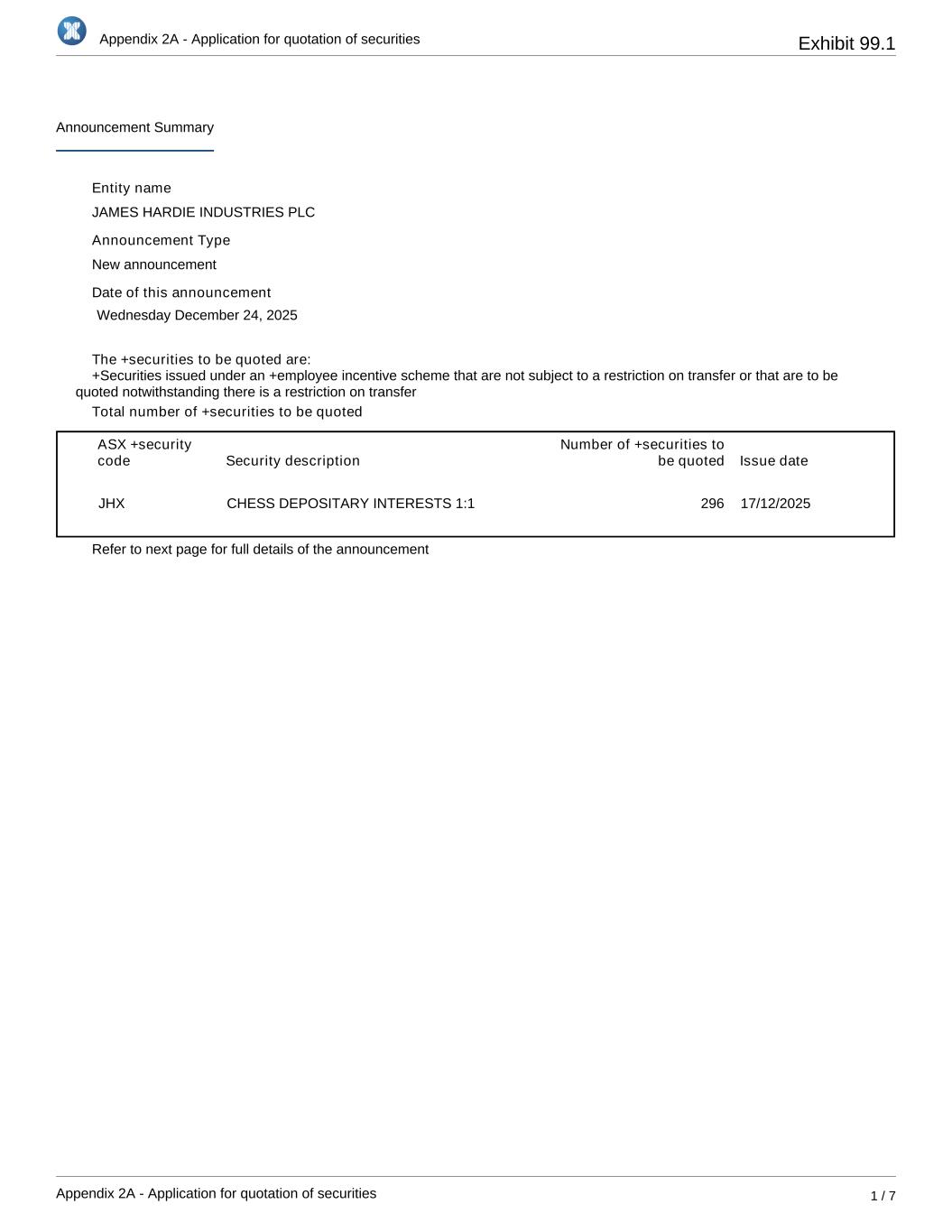 Appendix 2A - Application for quotation of securities Appendix 2A - Application for quotation of securities 1 / 7 Announcement Summary Entity name JAMES HARDIE INDUSTRIES PLC Announcement Type New announcement Date of this announcement Wednesday December 24, 2025 The +securities to be quoted are: Total number of +securities to be quoted ASX +security code Security description Number of +securities to be quoted Issue date JHX CHESS DEPOSITARY INTERESTS 1:1 296 17/12/2025 Refer to next page for full details of the announcement +Securities issued under an +employee incentive scheme that are not subject to a restriction on transfer or that are to be quoted notwithstanding there is a restriction on transfer