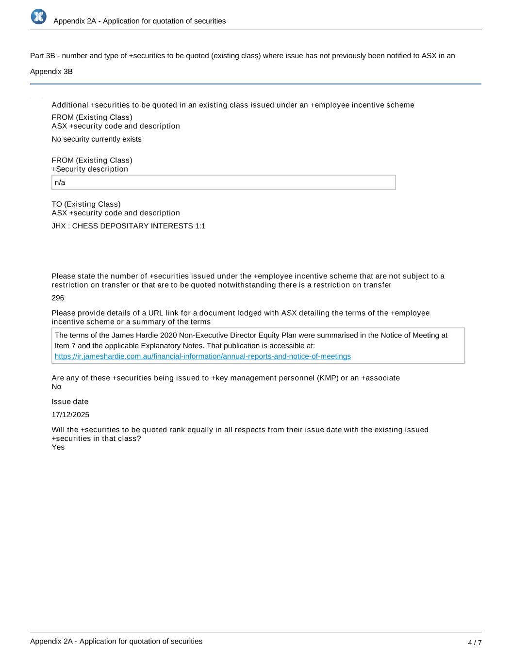 Appendix 2A - Application for quotation of securities Appendix 2A - Application for quotation of securities 4 / 7 Part 3B - number and type of +securities to be quoted (existing class) where issue has not previously been notified to ASX in an Appendix 3B Additional +securities to be quoted in an existing class issued under an +employee incentive scheme FROM (Existing Class) ASX +security code and description No security currently exists FROM (Existing Class) +Security description n/a TO (Existing Class) ASX +security code and description JHX : CHESS DEPOSITARY INTERESTS 1:1 Please state the number of +securities issued under the +employee incentive scheme that are not subject to a restriction on transfer or that are to be quoted notwithstanding there is a restriction on transfer 296 Please provide details of a URL link for a document lodged with ASX detailing the terms of the +employee incentive scheme or a summary of the terms The terms of the James Hardie 2020 Non-Executive Director Equity Plan were summarised in the Notice of Meeting at Item 7 and the applicable Explanatory Notes. That publication is accessible at: https://ir.jameshardie.com.au/financial-information/annual-reports-and-notice-of-meetings Are any of these +securities being issued to +key management personnel (KMP) or an +associate Issue date 17/12/2025 Will the +securities to be quoted rank equally in all respects from their issue date with the existing issued +securities in that class? Yes No
