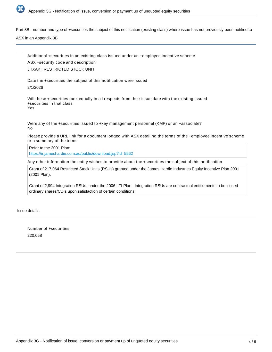 Appendix 3G - Notification of issue, conversion or payment up of unquoted equity securities Appendix 3G - Notification of issue, conversion or payment up of unquoted equity securities 4 / 6 Part 3B - number and type of +securities the subject of this notification (existing class) where issue has not previously been notified to ASX in an Appendix 3B Additional +securities in an existing class issued under an +employee incentive scheme ASX +security code and description JHXAK : RESTRICTED STOCK UNIT Date the +securities the subject of this notification were issued 2/1/2026 Will these +securities rank equally in all respects from their issue date with the existing issued +securities in that class Were any of the +securities issued to +key management personnel (KMP) or an +associate? Please provide a URL link for a document lodged with ASX detailing the terms of the +employee incentive scheme or a summary of the terms Refer to the 2001 Plan: https://ir.jameshardie.com.au/public/download.jsp?id=5562 Any other information the entity wishes to provide about the +securities the subject of this notification Grant of 217,064 Restricted Stock Units (RSUs) granted under the James Hardie Industries Equity Incentive Plan 2001 (2001 Plan). Grant of 2,994 Integration RSUs, under the 2006 LTI Plan. Integration RSUs are contractual entitlements to be issued ordinary shares/CDIs upon satisfaction of certain conditions. Issue details Number of +securities 220,058 No Yes