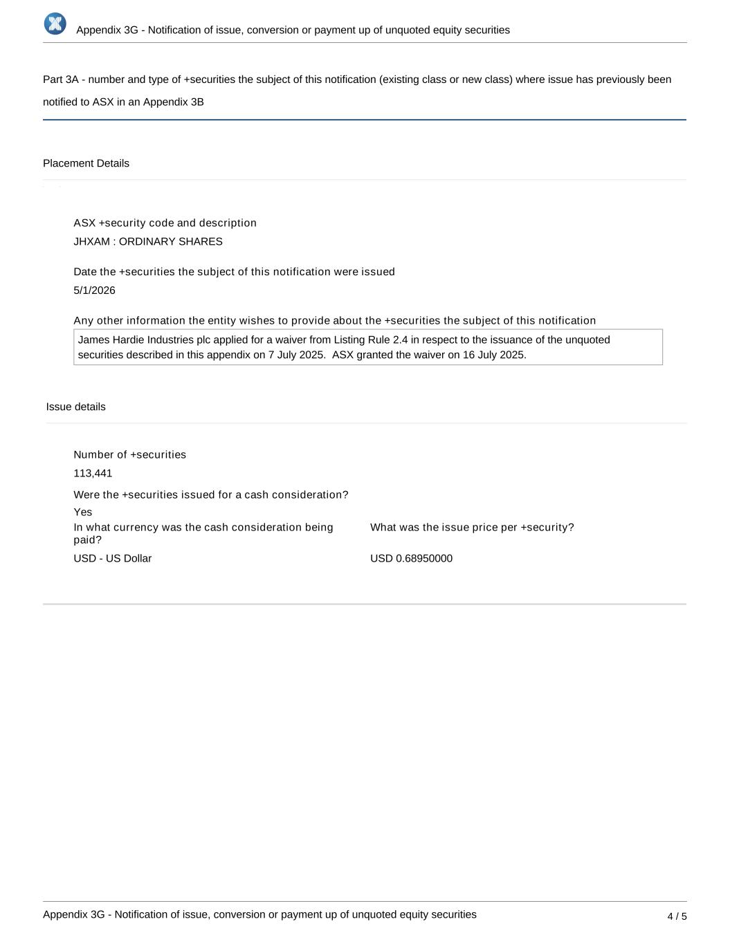 Appendix 3G - Notification of issue, conversion or payment up of unquoted equity securities Appendix 3G - Notification of issue, conversion or payment up of unquoted equity securities 4 / 5 Part 3A - number and type of +securities the subject of this notification (existing class or new class) where issue has previously been notified to ASX in an Appendix 3B Placement Details ASX +security code and description JHXAM : ORDINARY SHARES Date the +securities the subject of this notification were issued 5/1/2026 Any other information the entity wishes to provide about the +securities the subject of this notification James Hardie Industries plc applied for a waiver from Listing Rule 2.4 in respect to the issuance of the unquoted securities described in this appendix on 7 July 2025. ASX granted the waiver on 16 July 2025. Issue details Number of +securities 113,441 Were the +securities issued for a cash consideration? In what currency was the cash consideration being paid? USD - US Dollar What was the issue price per +security? USD 0.68950000 Yes
