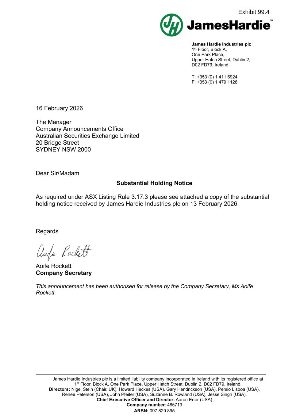 James Hardie Industries plc 1st Floor, Block A, One Park Place, Upper Hatch Street, Dublin 2, D02 FD79, Ireland T: +353 (0) 1 411 6924 F: +353 (0) 1 479 1128 James Hardie Industries plc is a limited liability company incorporated in Ireland with its registered office at 1st Floor, Block A, One Park Place, Upper Hatch Street, Dublin 2, D02 FD79, Ireland. Directors: Nigel Stein (Chair, UK), Howard Heckes (USA), Gary Hendrickson (USA), Persio Lisboa (USA), Renee Peterson (USA), John Pfeifer (USA), Suzanne B. Rowland (USA), Jesse Singh (USA). Chief Executive Officer and Director: Aaron Erter (USA) Company number: 485719 ARBN: 097 829 895 16 February 2026 The Manager Company Announcements Office Australian Securities Exchange Limited 20 Bridge Street SYDNEY NSW 2000 Dear Sir/Madam Substantial Holding Notice As required under ASX Listing Rule 3.17.3 please see attached a copy of the substantial holding notice received by James Hardie Industries plc on 13 February 2026. Regards Aoife Rockett Company Secretary This announcement has been authorised for release by the Company Secretary, Ms Aoife Rockett.