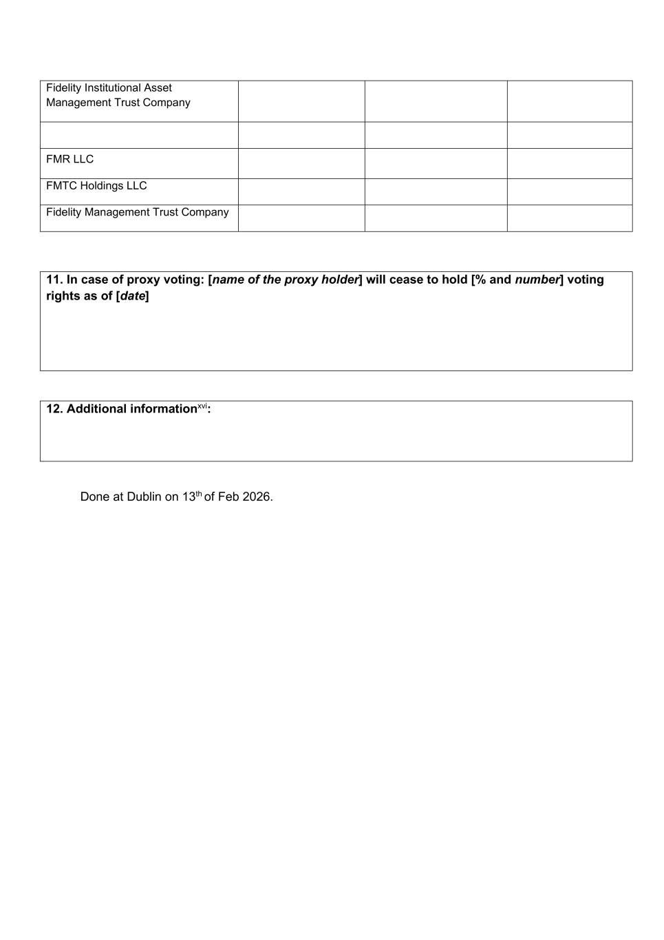 Fidelity Institutional Asset Management Trust Company FMR LLC FMTC Holdings LLC Fidelity Management Trust Company 11. In case of proxy voting: [name of the proxy holder] will cease to hold [% and number] voting rights as of [date] 12. Additional informationxvi: Done at Dublin on 13th of Feb 2026.