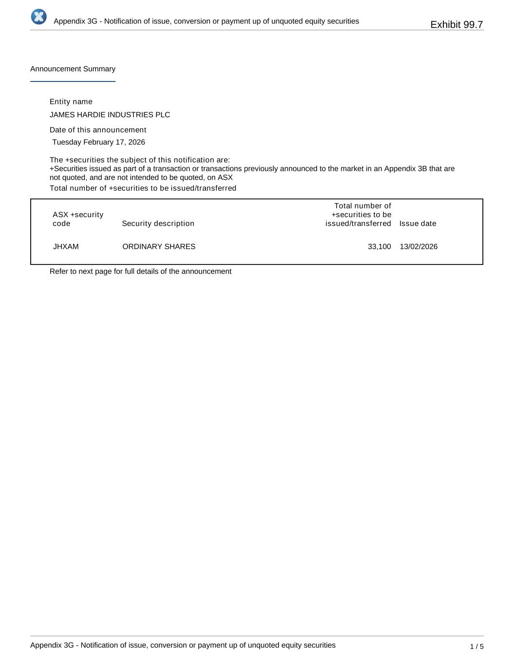 Appendix 3G - Notification of issue, conversion or payment up of unquoted equity securities Appendix 3G - Notification of issue, conversion or payment up of unquoted equity securities 1 / 5 Announcement Summary Entity name JAMES HARDIE INDUSTRIES PLC Date of this announcement Tuesday February 17, 2026 The +securities the subject of this notification are: Total number of +securities to be issued/transferred ASX +security code Security description Total number of +securities to be issued/transferred Issue date JHXAM ORDINARY SHARES 33,100 13/02/2026 Refer to next page for full details of the announcement +Securities issued as part of a transaction or transactions previously announced to the market in an Appendix 3B that are not quoted, and are not intended to be quoted, on ASX