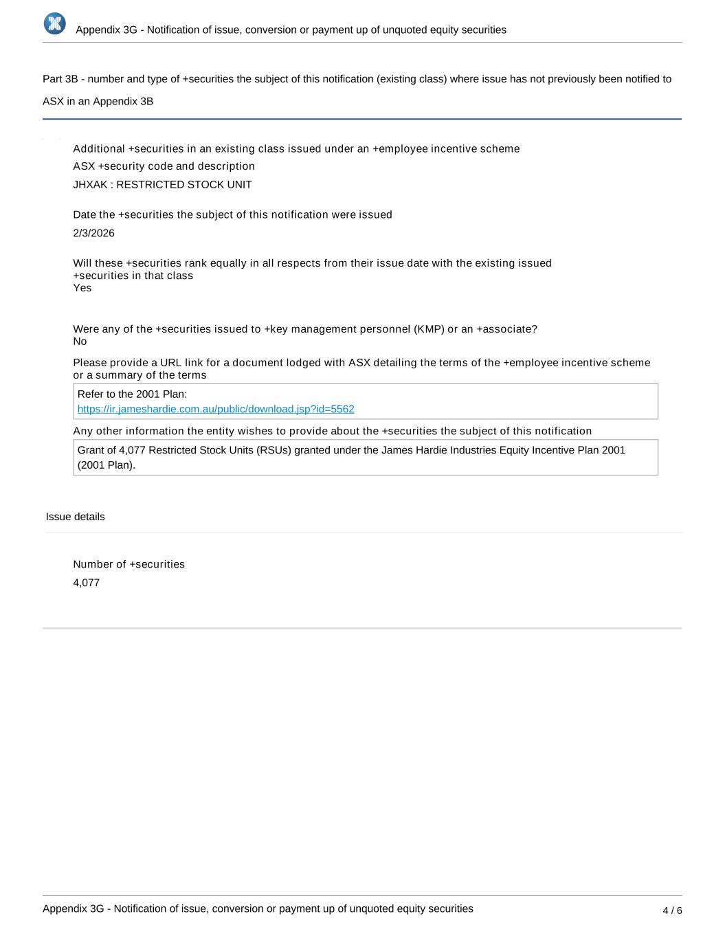 Appendix 3G - Notification of issue, conversion or payment up of unquoted equity securities Appendix 3G - Notification of issue, conversion or payment up of unquoted equity securities 4 / 6 Part 3B - number and type of +securities the subject of this notification (existing class) where issue has not previously been notified to ASX in an Appendix 3B Additional +securities in an existing class issued under an +employee incentive scheme ASX +security code and description JHXAK : RESTRICTED STOCK UNIT Date the +securities the subject of this notification were issued 2/3/2026 Will these +securities rank equally in all respects from their issue date with the existing issued +securities in that class Were any of the +securities issued to +key management personnel (KMP) or an +associate? Please provide a URL link for a document lodged with ASX detailing the terms of the +employee incentive scheme or a summary of the terms Refer to the 2001 Plan: https://ir.jameshardie.com.au/public/download.jsp?id=5562 Any other information the entity wishes to provide about the +securities the subject of this notification Grant of 4,077 Restricted Stock Units (RSUs) granted under the James Hardie Industries Equity Incentive Plan 2001 (2001 Plan). Issue details Number of +securities 4,077 No Yes