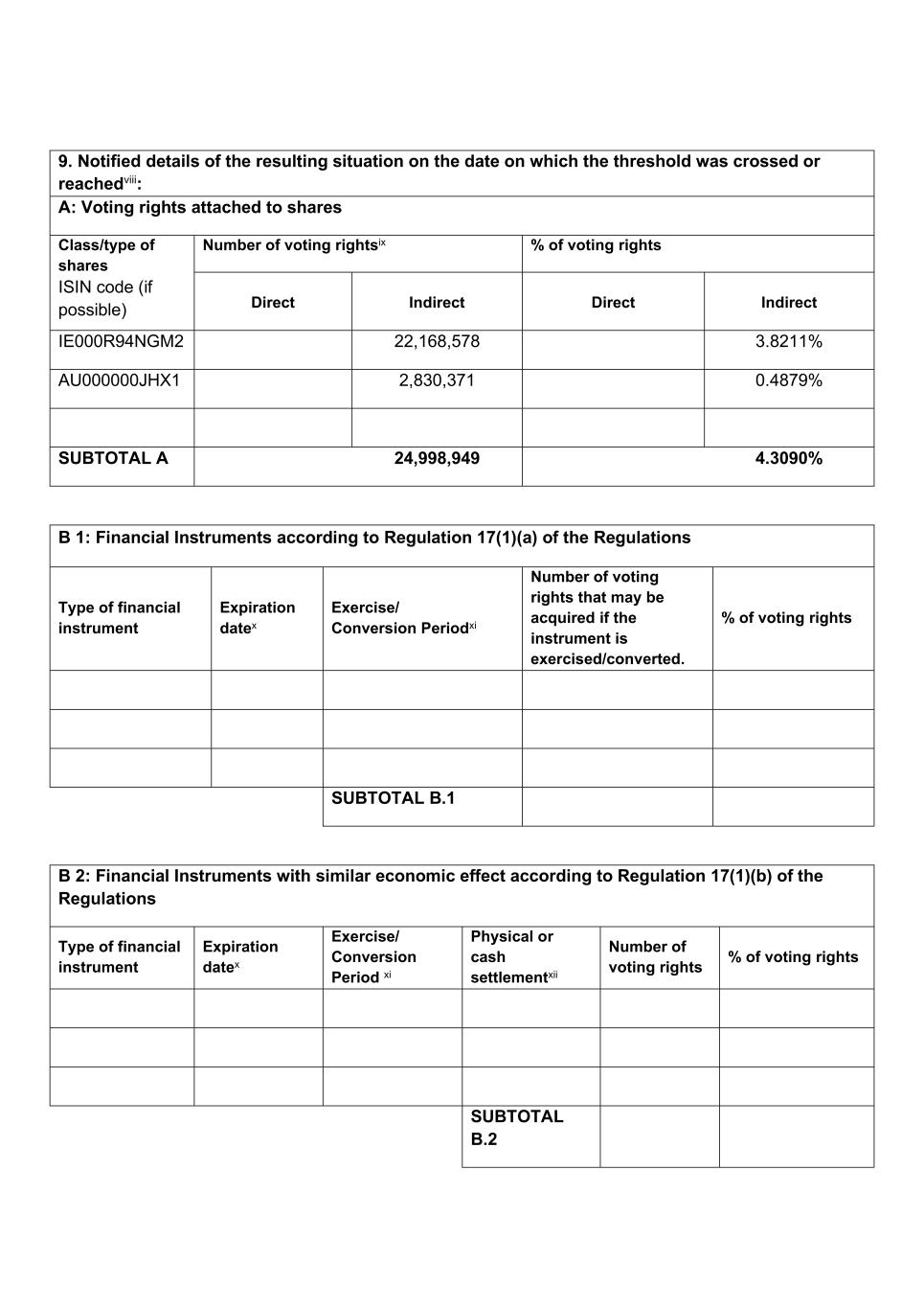 9. Notified details of the resulting situation on the date on which the threshold was crossed or reachedviii: A: Voting rights attached to shares Class/type of shares ISIN code (if possible) Number of voting rightsix % of voting rights Direct Indirect Direct Indirect IE000R94NGM2 22,168,578 3.8211% AU000000JHX1 2,830,371 0.4879% SUBTOTAL A 24,998,949 4.3090% B 1: Financial Instruments according to Regulation 17(1)(a) of the Regulations Type of financial instrument Expiration datex Exercise/ Conversion Periodxi Number of voting rights that may be acquired if the instrument is exercised/converted. % of voting rights SUBTOTAL B.1 B 2: Financial Instruments with similar economic effect according to Regulation 17(1)(b) of the Regulations Type of financial instrument Expiration datex Exercise/ Conversion Period xi Physical or cash settlementxii Number of voting rights % of voting rights SUBTOTAL B.2