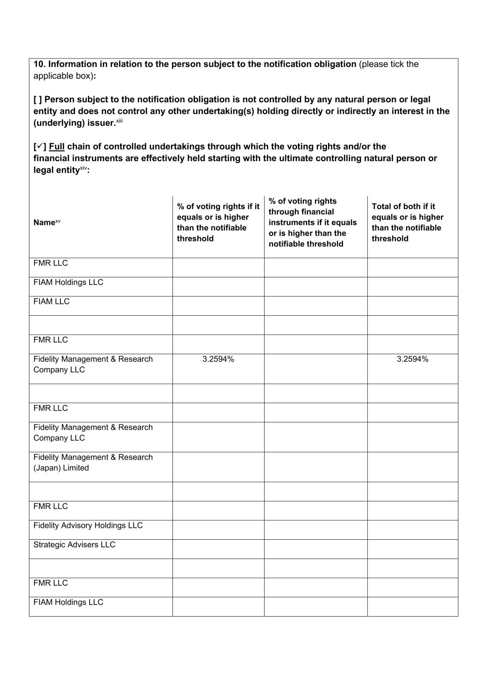 10. Information in relation to the person subject to the notification obligation (please tick the applicable box): [ ] Person subject to the notification obligation is not controlled by any natural person or legal entity and does not control any other undertaking(s) holding directly or indirectly an interest in the (underlying) issuer.xiii [] Full chain of controlled undertakings through which the voting rights and/or the financial instruments are effectively held starting with the ultimate controlling natural person or legal entityxiv: Namexv % of voting rights if it equals or is higher than the notifiable threshold % of voting rights through financial instruments if it equals or is higher than the notifiable threshold Total of both if it equals or is higher than the notifiable threshold FMR LLC FIAM Holdings LLC FIAM LLC FMR LLC Fidelity Management & Research Company LLC 3.2594% 3.2594% FMR LLC Fidelity Management & Research Company LLC Fidelity Management & Research (Japan) Limited FMR LLC Fidelity Advisory Holdings LLC Strategic Advisers LLC FMR LLC FIAM Holdings LLC