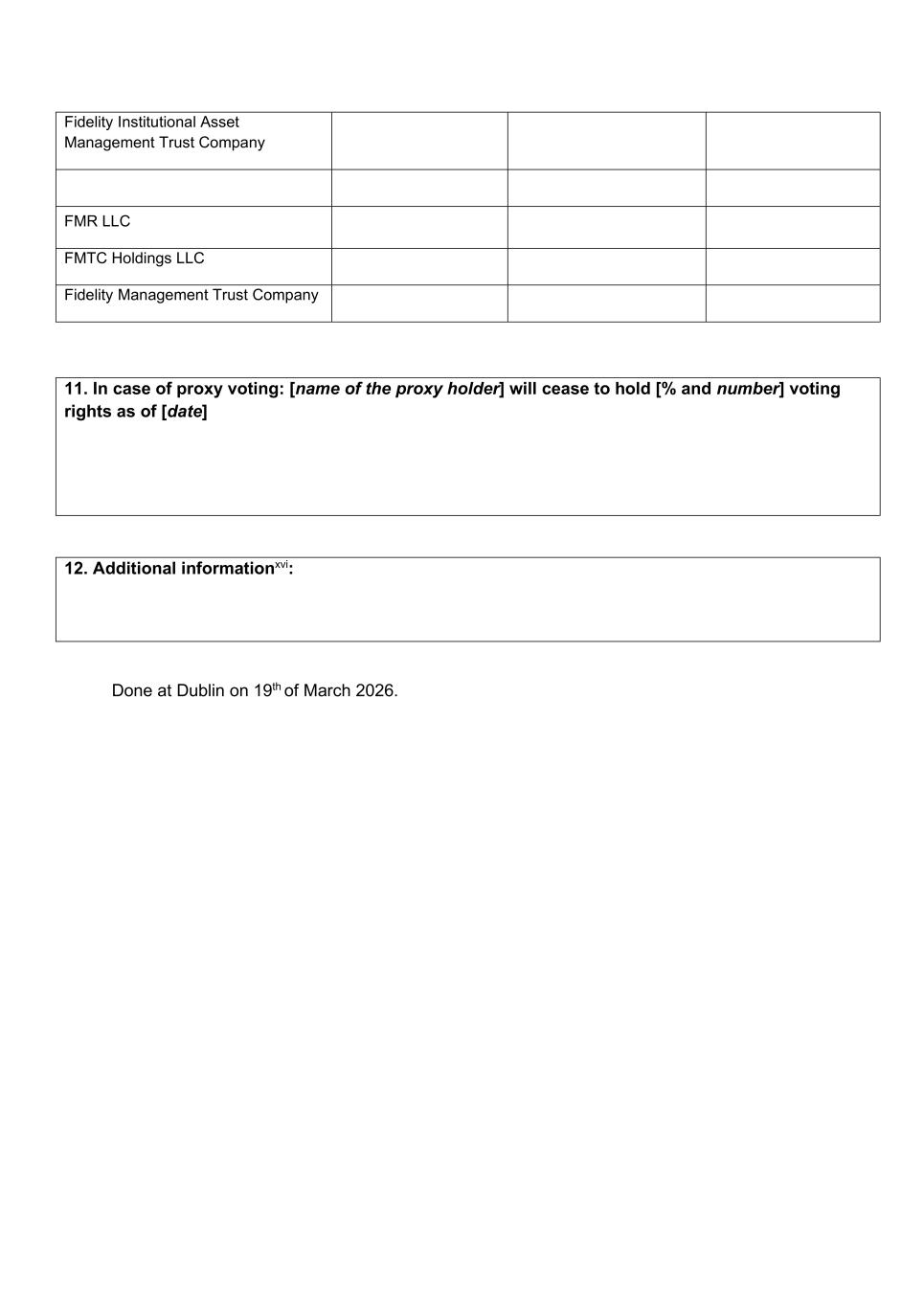 Fidelity Institutional Asset Management Trust Company FMR LLC FMTC Holdings LLC Fidelity Management Trust Company 11. In case of proxy voting: [name of the proxy holder] will cease to hold [% and number] voting rights as of [date] 12. Additional informationxvi: Done at Dublin on 19th of March 2026.