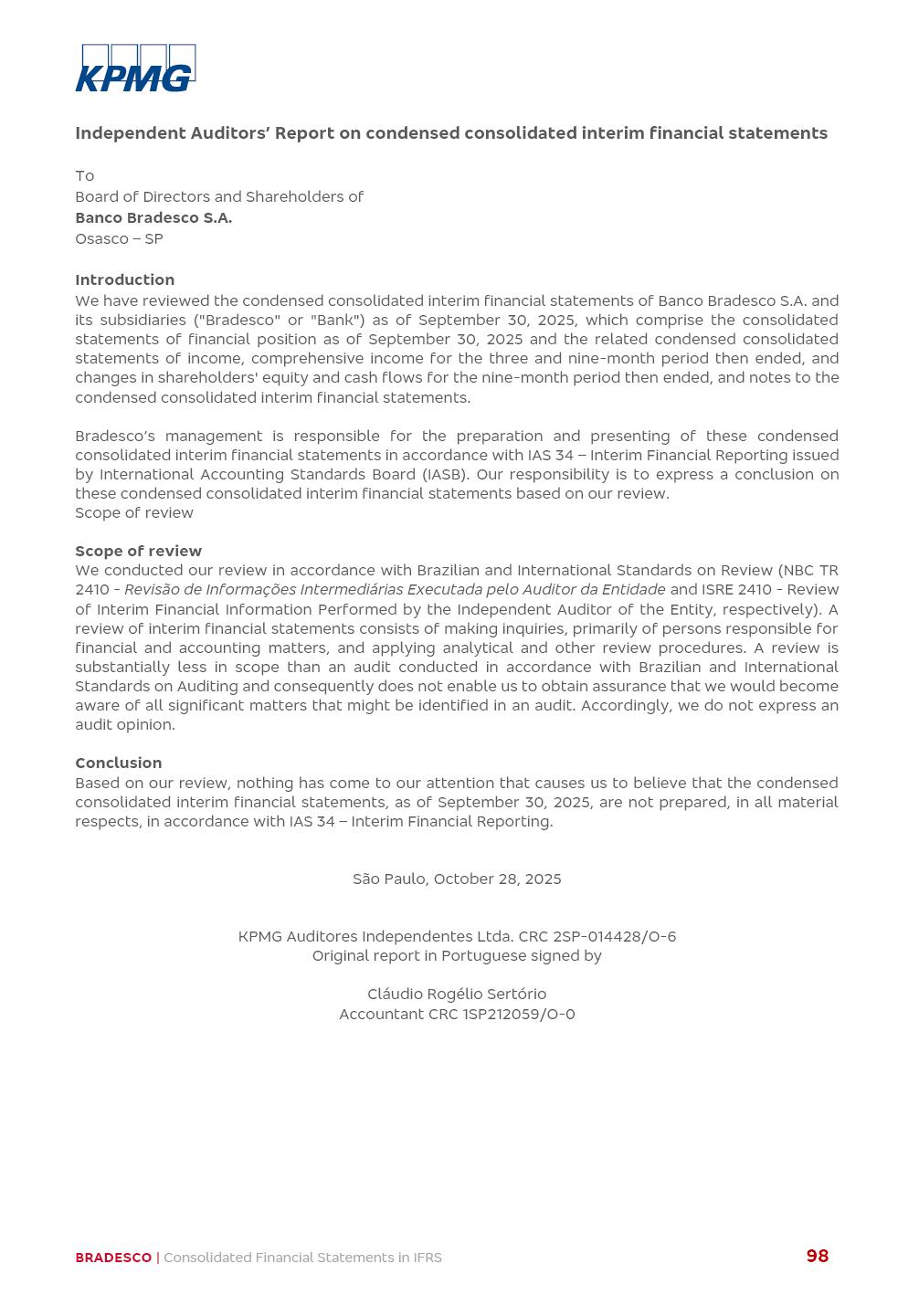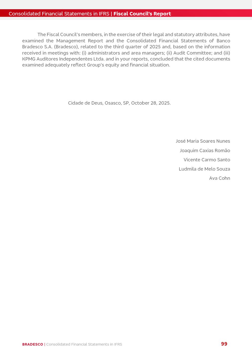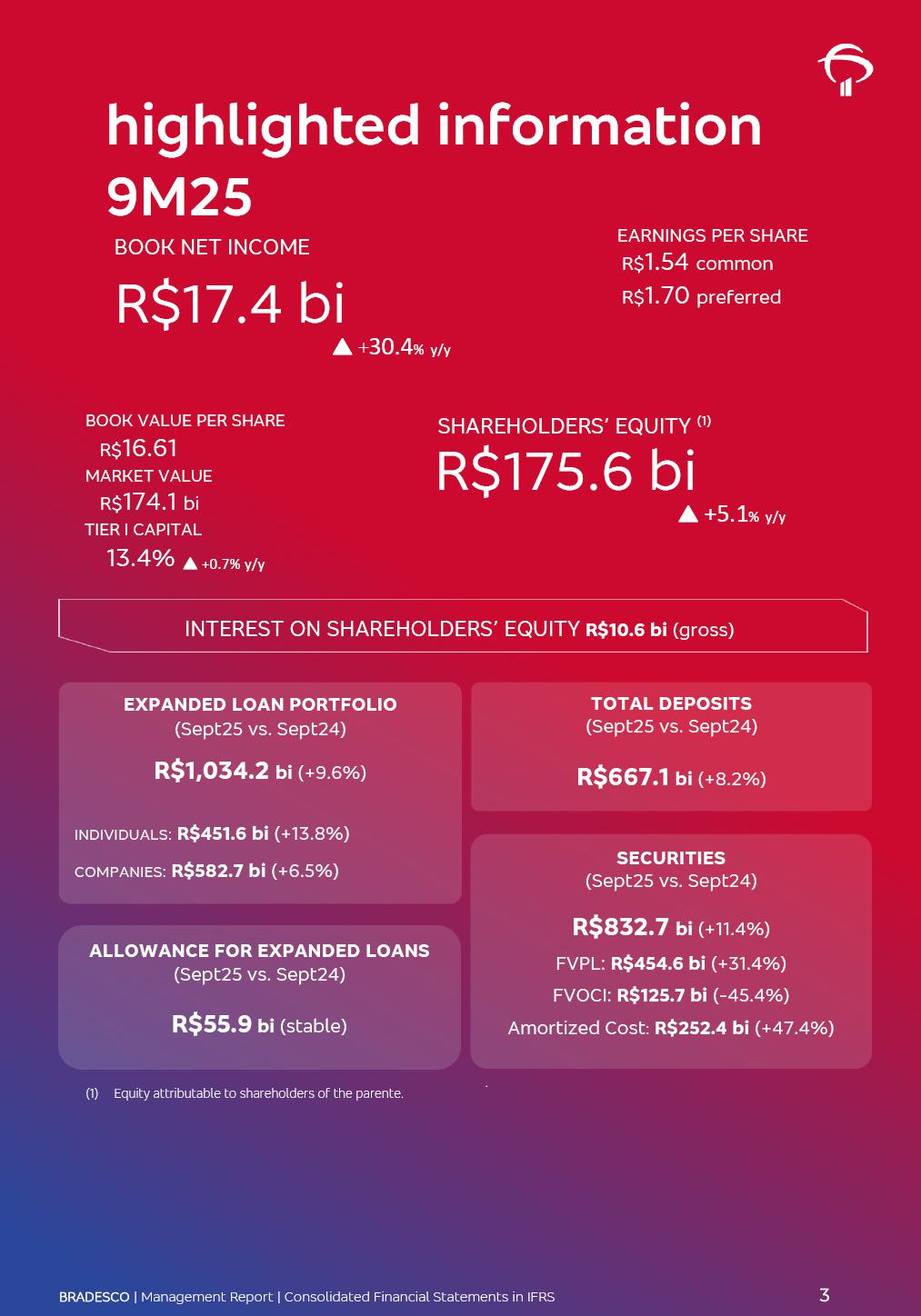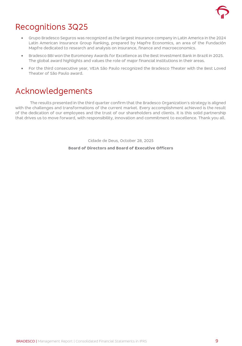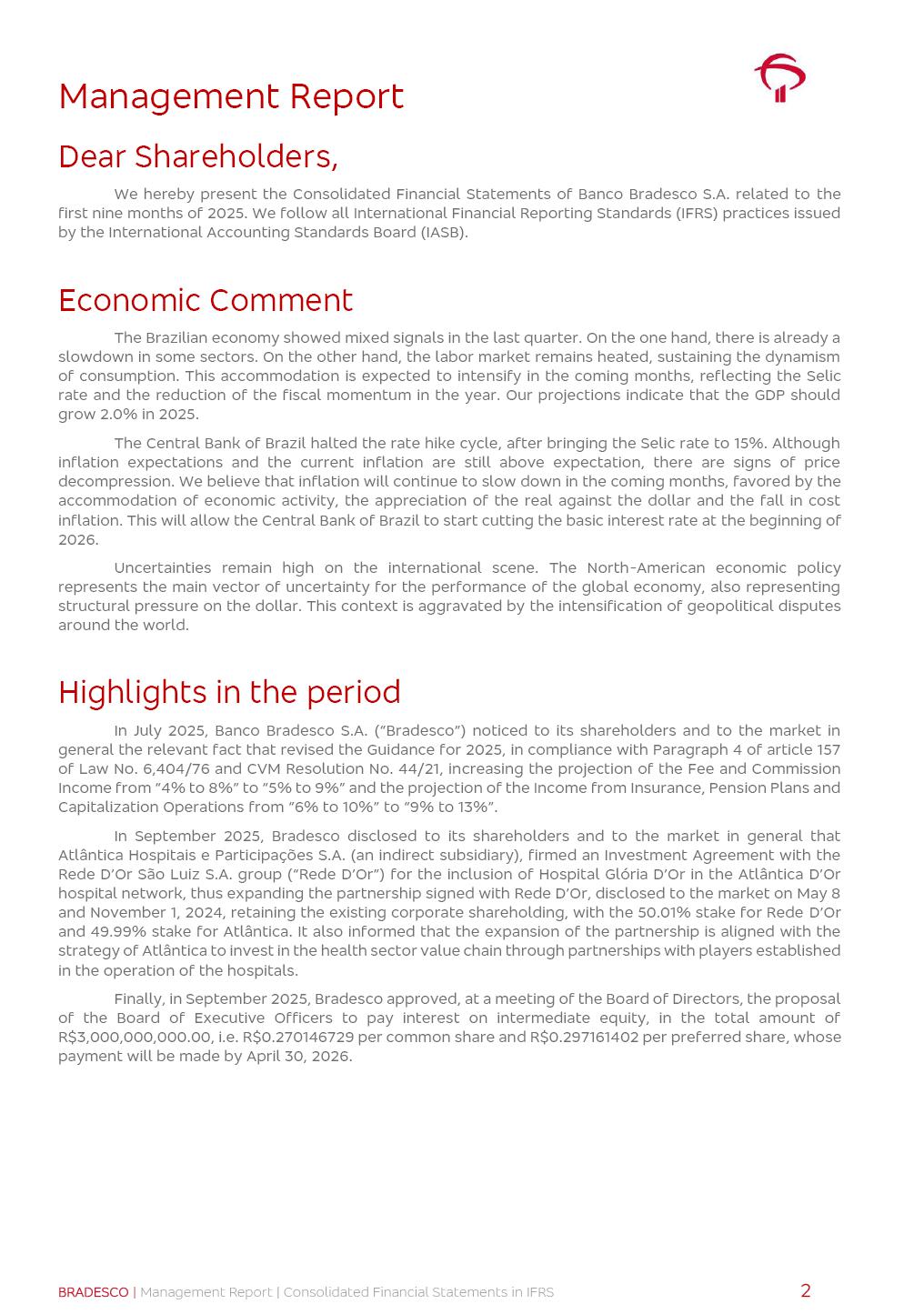 Consolidated Financial Statements 3Q25 in accordance with International Financial Reporting Standards (IFRS) issued by the International Accounting Standards Boards (IASB) Management Report BRADESCO | Management Report | Consolidated Financial Statements in IFRS 2 Dear Shareholders, We hereby present the Consolidated Financial Statements of Banco Bradesco S.A. related to the first nine months of 2025. We follow all International Financial Reporting Standards (IFRS) practices issued by the International Accounting Standards Board (IASB). Economic Comment The Brazilian economy showed mixed signals in the last quarter. On the one hand, there is already a slowdown in some sectors. On the other hand, the labor market remains heated, sustaining the dynamism of consumption. This accommodation is expected to intensify in the coming months, reflecting the Selic rate and the reduction of the fiscal momentum in the year. Our projections indicate that the GDP should grow 2.0% in 2025. The Central Bank of Brazil halted the rate hike cycle, after bringing the Selic rate to 15%. Although inflation expectations and the current inflation are still above expectation, there are signs of price decompression. We believe that inflation will continue to slow down in the coming months, favored by the accommodation of economic activity, the appreciation of the real against the dollar and the fall in cost inflation. This will allow the Central Bank of Brazil to start cutting the basic interest rate at the beginning of 2026. Uncertainties remain high on the international scene. The North-American economic policy represents the main vector of uncertainty for the performance of the global economy, also representing structural pressure on the dollar. This context is aggravated by the intensification of geopolitical disputes around the world. Highlights in the period In July 2025, Banco Bradesco S.A. (“Bradesco”) noticed to its shareholders and to the market in general the relevant fact that revised the Guidance for 2025, in compliance with Paragraph 4 of article 157 of Law No. 6,404/76 and CVM Resolution No. 44/21, increasing the projection of the Fee and Commission Income from “4% to 8%” to “5% to 9%” and the projection of the Income from Insurance, Pension Plans and Capitalization Operations from “6% to 10%” to “9% to 13%”. In September 2025, Bradesco disclosed to its shareholders and to the market in general that Atlântica Hospitais e Participações S.A. (an indirect subsidiary), firmed an Investment Agreement with the Rede D’Or São Luiz S.A. group (“Rede D’Or”) for the inclusion of Hospital Glória D’Or in the Atlântica D’Or hospital network, thus expanding the partnership signed with Rede D’Or, disclosed to the market on May 8 and November 1, 2024, retaining the existing corporate shareholding, with the 50.01% stake for Rede D’Or and 49.99% stake for Atlântica. It also informed that the expansion of the partnership is aligned with the strategy of Atlântica to invest in the health sector value chain through partnerships with players established in the operation of the hospitals. Finally, in September 2025, Bradesco approved, at a meeting of the Board of Directors, the proposal of the Board of Executive Officers to pay interest on intermediate equity, in the total amount of R$3,000,000,000.00, i.e. R$0.270146729 per common share and R$0.297161402 per preferred share, whose payment will be made by April 30, 2026. BRADESCO | Management Report | Consolidated Financial Statements in IFRS 3 . highlighted information 9M25 TOTAL DEPOSITS (Sept25 vs. Sept24) R$667.1 bi (+8.2%) R$17.4 bi R$175.6 bi +5.1% y/y EARNINGS PER SHARE BOOK VALUE PER SHARE BOOK NET INCOME R$1.54 common R$1.70 preferred R$16.61 SHAREHOLDERS’ EQUITY (1) MARKET VALUE TIER I CAPITAL R$174.1 bi 13.4% SECURITIES (Sept25 vs. Sept24) R$832.7 bi (+11.4%) FVPL: R$454.6 bi (+31.4%) FVOCI: R$125.7 bi (-45.4%) Amortized Cost: R$252.4 bi (+47.4%) EXPANDED LOAN PORTFOLIO (Sept25 vs. Sept24) R$1,034.2 bi (+9.6%) INDIVIDUALS: R$451.6 bi (+13.8%) COMPANIES: R$582.7 bi (+6.5%) ALLOWANCE FOR EXPANDED LOANS (Sept25 vs. Sept24) R$55.9 bi (stable) INTEREST ON SHAREHOLDERS’ EQUITY R$10.6 bi (gross) +30.4% y/y (1) Equity attributable to shareholders of the parente. +0.7% y/y BRADESCO | Management Report | Consolidated Financial Statements in IFRS 4 Technology and innovation Bradesco’s digital transformation continues at an accelerated pace, consolidating technology as a strategic pillar to generate value for clients and the business. Guided by the Customer-centricity pillars, AI First, Business Acceleration and Efficiency, we continue to develop customized, secure and efficient digital solutions, anticipating data and behavior-based needs. The Bridge platform, which democratizes the use of generative AI for developers and business areas, continues to expand use cases with simplified integration and scalability, re-leveraging already built services. This evolution allows innovative solutions to reach the market faster, reinforcing our positioning in artificial intelligence. We are going beyond the AI First concept, we want to be technologically AI Ready and advance in the ambition to become an AI Powered bank, with practical applications that increase productivity, hyperpersonalization of experiences, with robust governance, security, risk monitoring and client engagement. Artificial intelligence has also been consolidated as a driver of productivity and experience. BIA Clientes with Generative AI is already available for 100% of the clients, with 87% resolution in the chat and integration in journeys like Pix Inteligente (Smart Pix) on WhatsApp. BIA Corporativa supports 100% of employees, with more than 2 million interactions supporting the search for content and responses. BIA Tech drives the development cycle with 64% more efficiency in writing stories, +80 thousand stories evaluated with GenAI, thousands of automatic code 