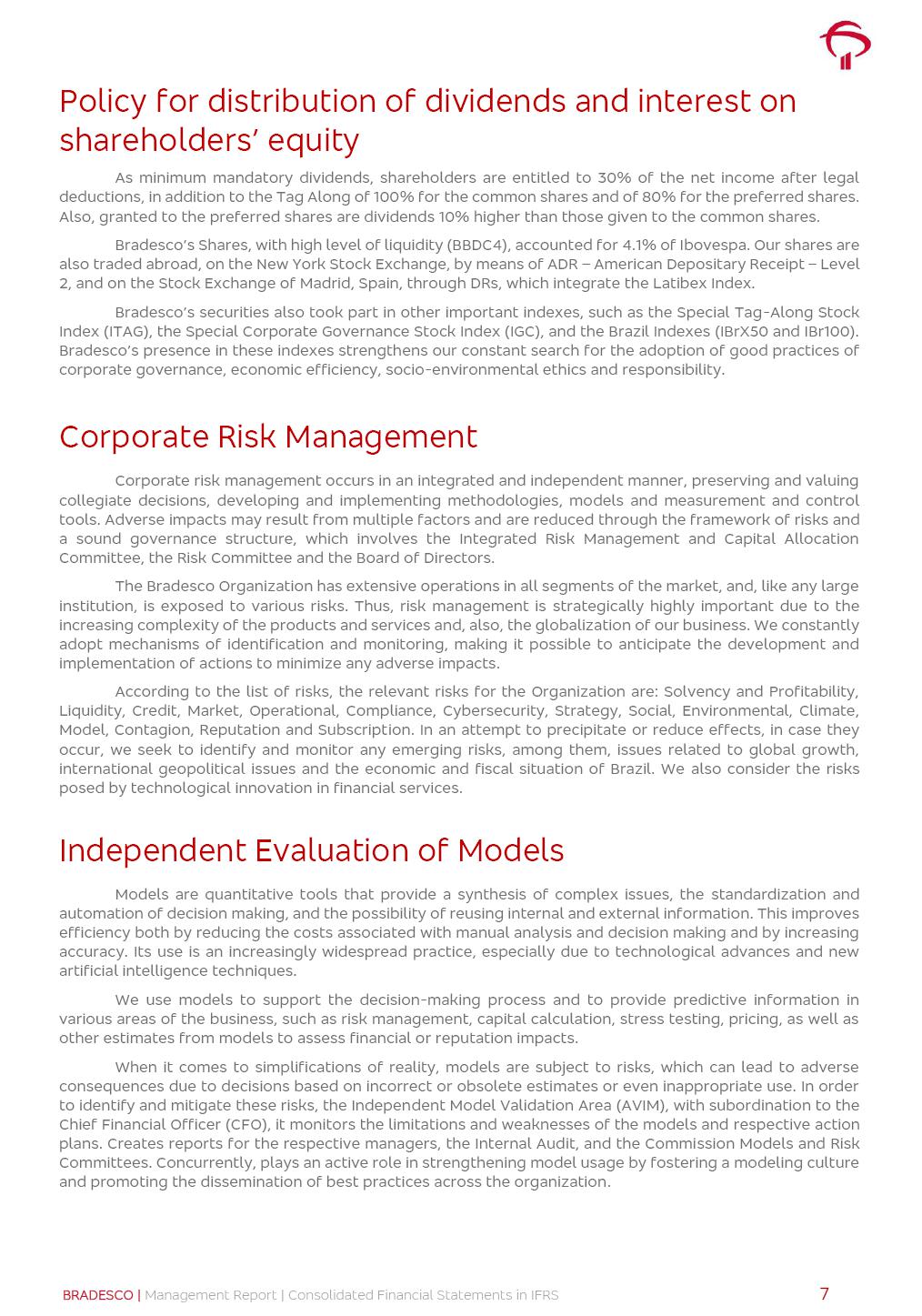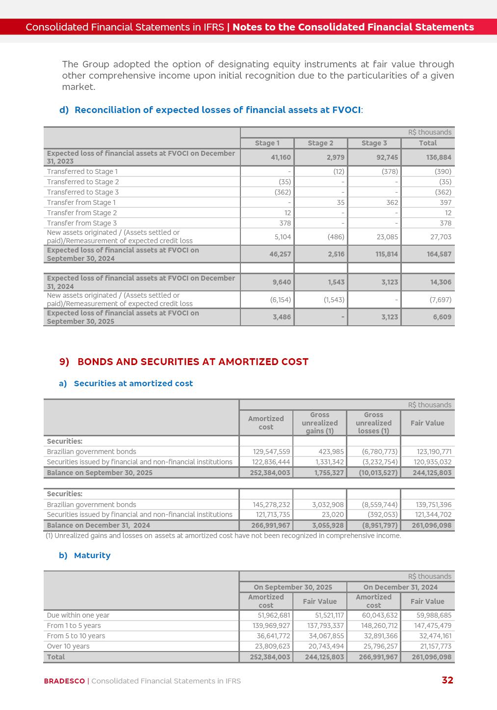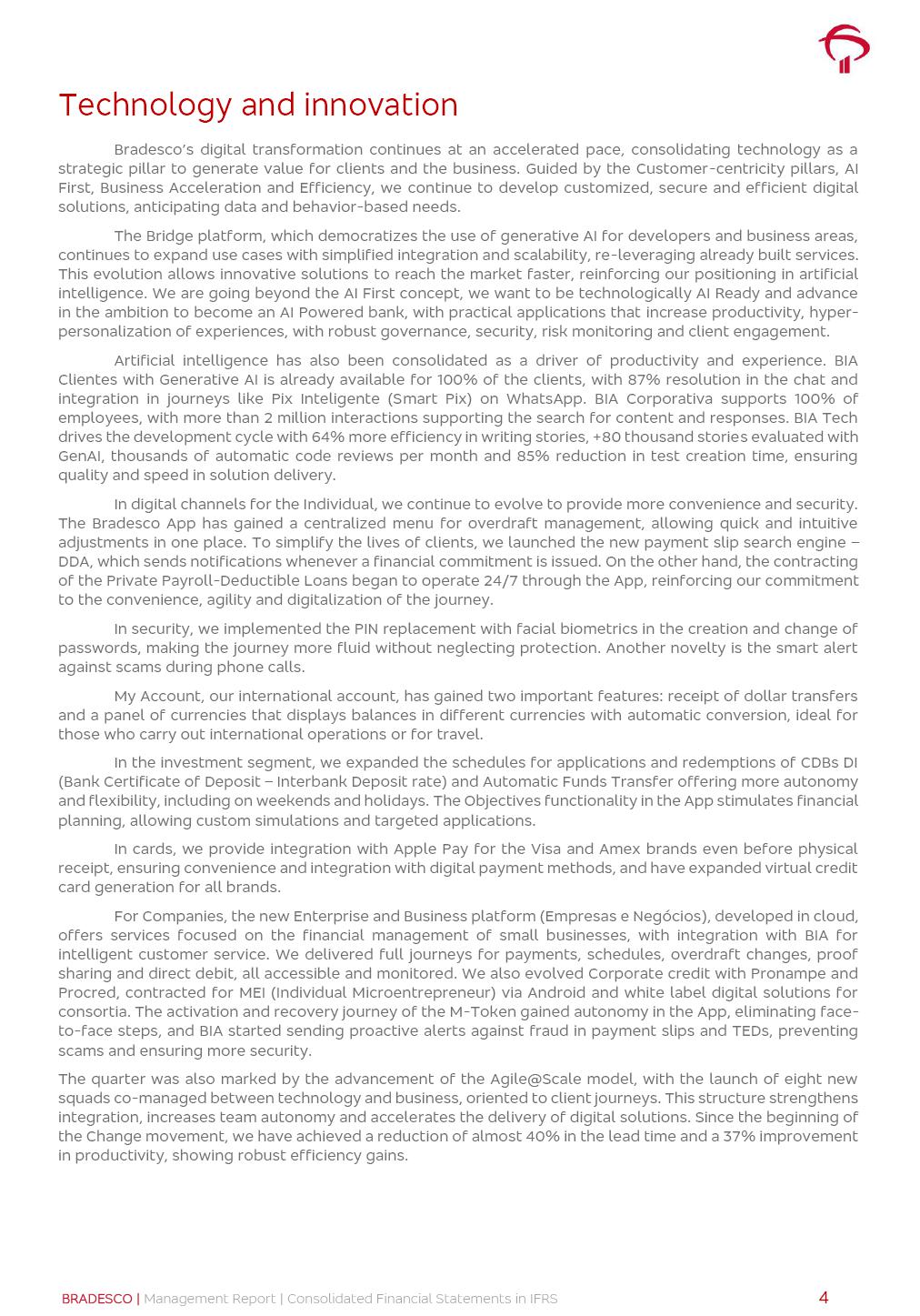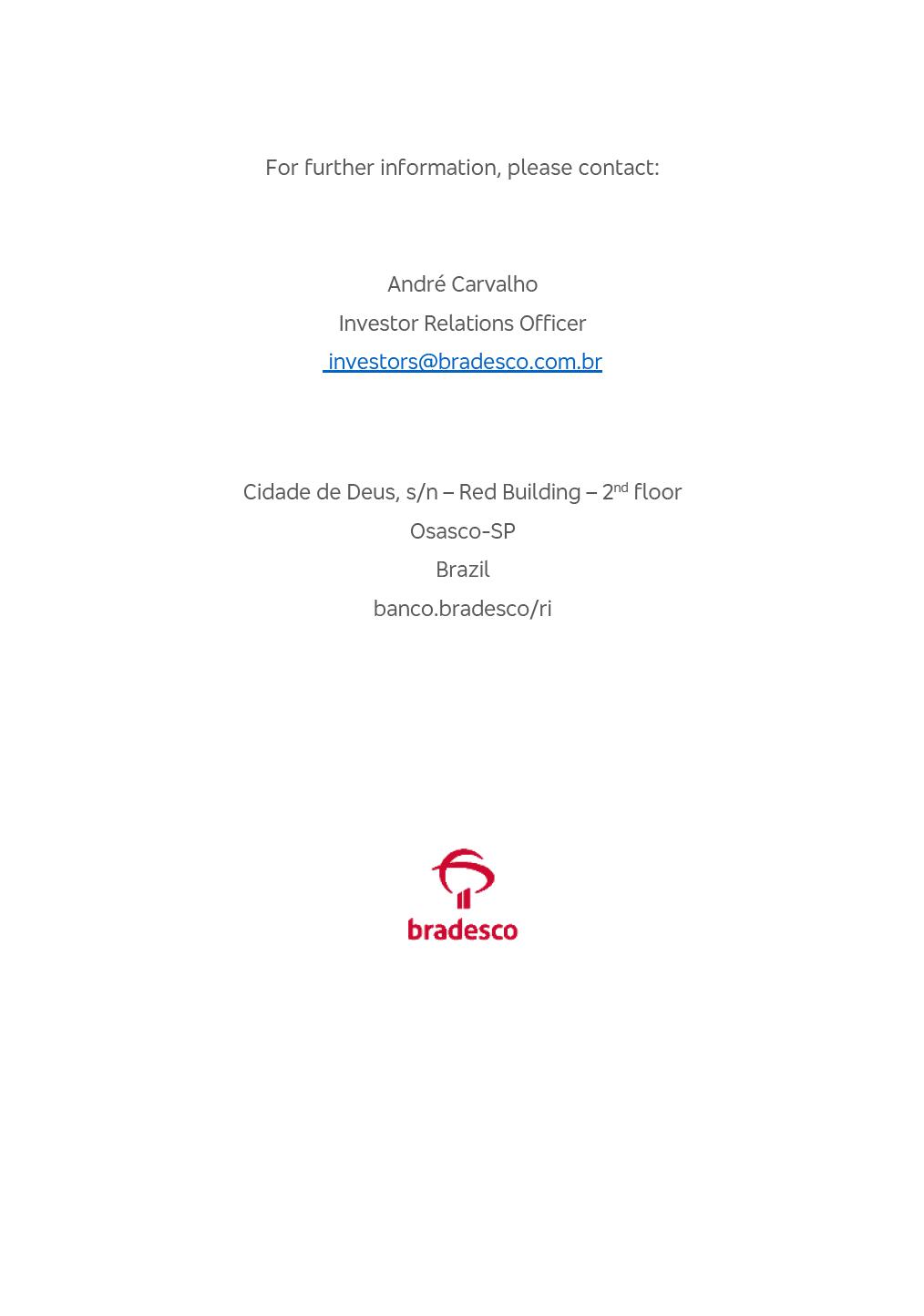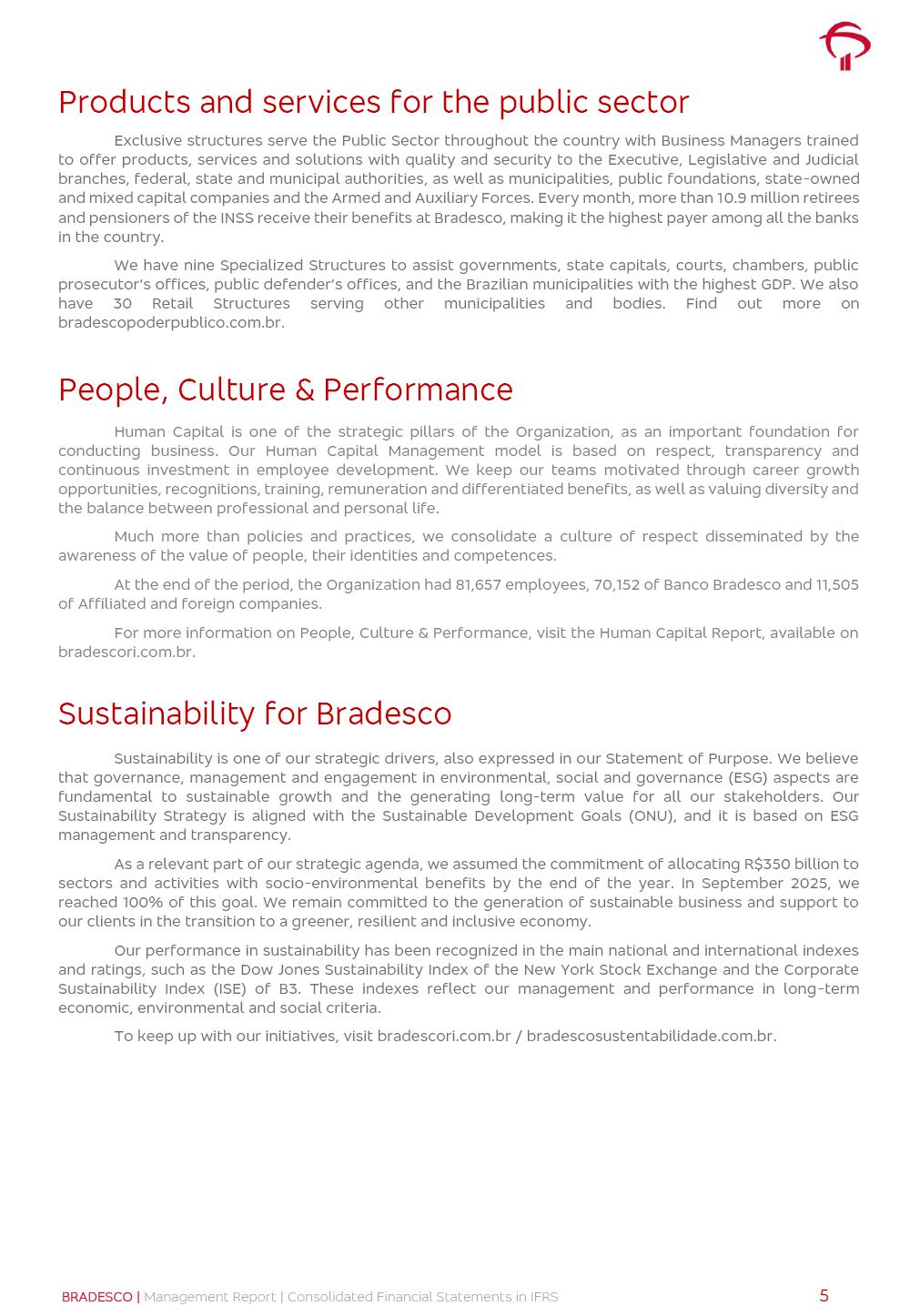 Consolidated Financial Statements 3Q25 in accordance with International Financial Reporting Standards (IFRS) issued by the International Accounting Standards Boards (IASB) Management Report BRADESCO | Management Report | Consolidated Financial Statements in IFRS 2 Dear Shareholders, We hereby present the Consolidated Financial Statements of Banco Bradesco S.A. related to the first nine months of 2025. We follow all International Financial Reporting Standards (IFRS) practices issued by the International Accounting Standards Board (IASB). Economic Comment The Brazilian economy showed mixed signals in the last quarter. On the one hand, there is already a slowdown in some sectors. On the other hand, the labor market remains heated, sustaining the dynamism of consumption. This accommodation is expected to intensify in the coming months, reflecting the Selic rate and the reduction of the fiscal momentum in the year. Our projections indicate that the GDP should grow 2.0% in 2025. The Central Bank of Brazil halted the rate hike cycle, after bringing the Selic rate to 15%. Although inflation expectations and the current inflation are still above expectation, there are signs of price decompression. We believe that inflation will continue to slow down in the coming months, favored by the accommodation of economic activity, the appreciation of the real against the dollar and the fall in cost inflation. This will allow the Central Bank of Brazil to start cutting the basic interest rate at the beginning of 2026. Uncertainties remain high on the international scene. The North-American economic policy represents the main vector of uncertainty for the performance of the global economy, also representing structural pressure on the dollar. This context is aggravated by the intensification of geopolitical disputes around the world. Highlights in the period In July 2025, Banco Bradesco S.A. (“Bradesco”) noticed to its shareholders and to the market in general the relevant fact that revised the Guidance for 2025, in compliance with Paragraph 4 of article 157 of Law No. 6,404/76 and CVM Resolution No. 44/21, increasing the projection of the Fee and Commission Income from “4% to 8%” to “5% to 9%” and the projection of the Income from Insurance, Pension Plans and Capitalization Operations from “6% to 10%” to “9% to 13%”. In September 2025, Bradesco disclosed to its shareholders and to the market in general that Atlântica Hospitais e Participações S.A. (an indirect subsidiary), firmed an Investment Agreement with the Rede D’Or São Luiz S.A. group (“Rede D’Or”) for the inclusion of Hospital Glória D’Or in the Atlântica D’Or hospital network, thus expanding the partnership signed with Rede D’Or, disclosed to the market on May 8 and November 1, 2024, retaining the existing corporate shareholding, with the 50.01% stake for Rede D’Or and 49.99% stake for Atlântica. It also informed that the expansion of the partnership is aligned with the strategy of Atlântica to invest in the health sector value chain through partnerships with players established in the operation of the hospitals. Finally, in September 2025, Bradesco approved, at a meeting of the Board of Directors, the proposal of the Board of Executive Officers to pay interest on intermediate equity, in the total amount of R$3,000,000,000.00, i.e. R$0.270146729 per common share and R$0.297161402 per preferred share, whose payment will be made by April 30, 2026. BRADESCO | Management Report | Consolidated Financial Statements in IFRS 3 . highlighted information 9M25 TOTAL DEPOSITS (Sept25 vs. Sept24) R$667.1 bi (+8.2%) R$17.4 bi R$175.6 bi +5.1% y/y EARNINGS PER SHARE BOOK VALUE PER SHARE BOOK NET INCOME R$1.54 common R$1.70 preferred R$16.61 SHAREHOLDERS’ EQUITY (1) MARKET VALUE TIER I CAPITAL R$174.1 bi 13.4% SECURITIES (Sept25 vs. Sept24) R$832.7 bi (+11.4%) FVPL: R$454.6 bi (+31.4%) FVOCI: R$125.7 bi (-45.4%) Amortized Cost: R$252.4 bi (+47.4%) EXPANDED LOAN PORTFOLIO (Sept25 vs. Sept24) R$1,034.2 bi (+9.6%) INDIVIDUALS: R$451.6 bi (+13.8%) COMPANIES: R$582.7 bi (+6.5%) ALLOWANCE FOR EXPANDED LOANS (Sept25 vs. Sept24) R$55.9 bi (stable) INTEREST ON SHAREHOLDERS’ EQUITY R$10.6 bi (gross) +30.4% y/y (1) Equity attributable to shareholders of the parente. +0.7% y/y BRADESCO | Management Report | Consolidated Financial Statements in IFRS 4 Technology and innovation Bradesco’s digital transformation continues at an accelerated pace, consolidating technology as a strategic pillar to generate value for clients and the business. Guided by the Customer-centricity pillars, AI First, Business Acceleration and Efficiency, we continue to develop customized, secure and efficient digital solutions, anticipating data and behavior-based needs. The Bridge platform, which democratizes the use of generative AI for developers and business areas, continues to expand use cases with simplified integration and scalability, re-leveraging already built services. This evolution allows innovative solutions to reach the market faster, reinforcing our positioning in artificial intelligence. We are going beyond the AI First concept, we want to be technologically AI Ready and advance in the ambition to become an AI Powered bank, with practical applications that increase productivity, hyperpersonalization of experiences, with robust governance, security, risk monitoring and client engagement. Artificial intelligence has also been consolidated as a driver of productivity and experience. BIA Clientes with Generative AI is already available for 100% of the clients, with 87% resolution in the chat and integration in journeys like Pix Inteligente (Smart Pix) on WhatsApp. BIA Corporativa supports 100% of employees, with more than 2 million interactions supporting the search for content and responses. BIA Tech drives the development cycle with 64% more efficiency in writing stories, +80 thousand stories evaluated with GenAI, thousands of automatic code 