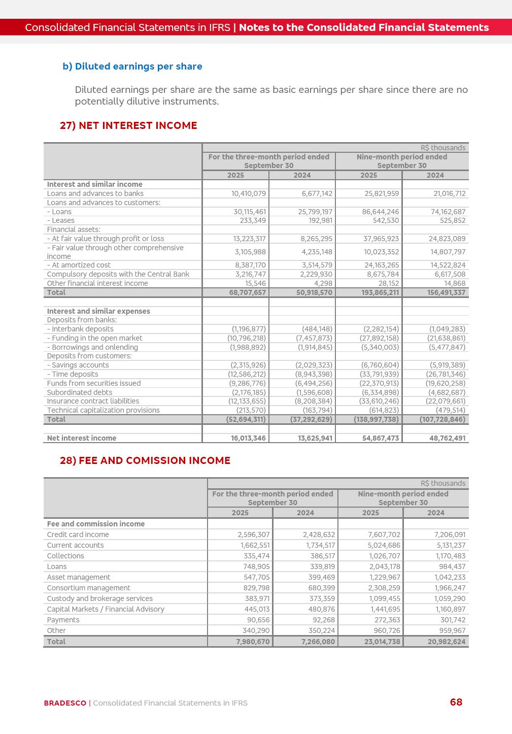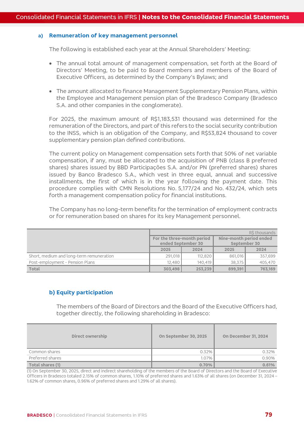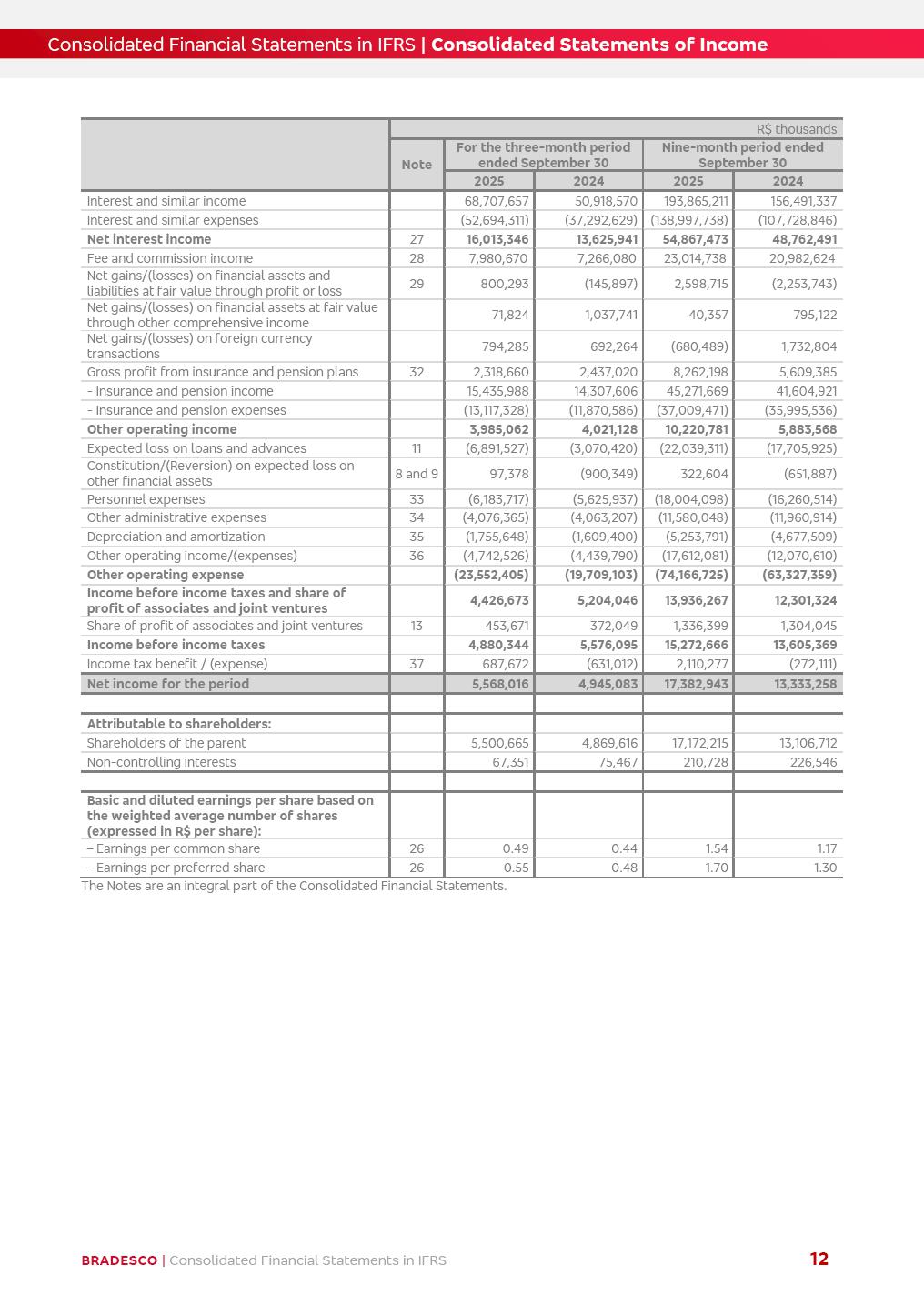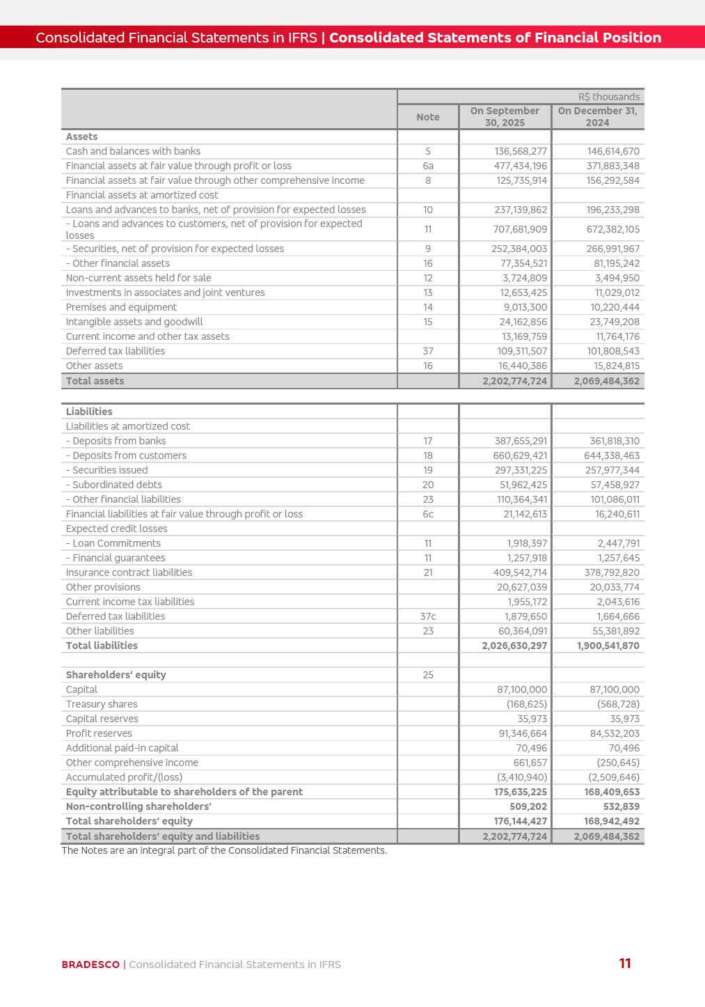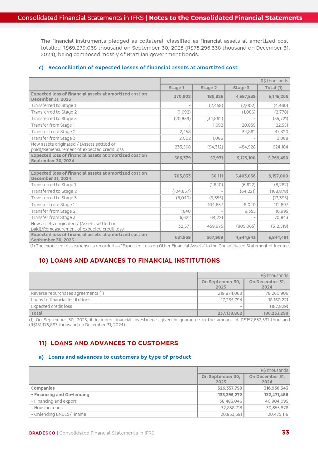 Consolidated Financial Statements 3Q25 in accordance with International Financial Reporting Standards (IFRS) issued by the International Accounting Standards Boards (IASB) Management Report BRADESCO | Management Report | Consolidated Financial Statements in IFRS 2 Dear Shareholders, We hereby present the Consolidated Financial Statements of Banco Bradesco S.A. related to the first nine months of 2025. We follow all International Financial Reporting Standards (IFRS) practices issued by the International Accounting Standards Board (IASB). Economic Comment The Brazilian economy showed mixed signals in the last quarter. On the one hand, there is already a slowdown in some sectors. On the other hand, the labor market remains heated, sustaining the dynamism of consumption. This accommodation is expected to intensify in the coming months, reflecting the Selic rate and the reduction of the fiscal momentum in the year. Our projections indicate that the GDP should grow 2.0% in 2025. The Central Bank of Brazil halted the rate hike cycle, after bringing the Selic rate to 15%. Although inflation expectations and the current inflation are still above expectation, there are signs of price decompression. We believe that inflation will continue to slow down in the coming months, favored by the accommodation of economic activity, the appreciation of the real against the dollar and the fall in cost inflation. This will allow the Central Bank of Brazil to start cutting the basic interest rate at the beginning of 2026. Uncertainties remain high on the international scene. The North-American economic policy represents the main vector of uncertainty for the performance of the global economy, also representing structural pressure on the dollar. This context is aggravated by the intensification of geopolitical disputes around the world. Highlights in the period In July 2025, Banco Bradesco S.A. (“Bradesco”) noticed to its shareholders and to the market in general the relevant fact that revised the Guidance for 2025, in compliance with Paragraph 4 of article 157 of Law No. 6,404/76 and CVM Resolution No. 44/21, increasing the projection of the Fee and Commission Income from “4% to 8%” to “5% to 9%” and the projection of the Income from Insurance, Pension Plans and Capitalization Operations from “6% to 10%” to “9% to 13%”. In September 2025, Bradesco disclosed to its shareholders and to the market in general that Atlântica Hospitais e Participações S.A. (an indirect subsidiary), firmed an Investment Agreement with the Rede D’Or São Luiz S.A. group (“Rede D’Or”) for the inclusion of Hospital Glória D’Or in the Atlântica D’Or hospital network, thus expanding the partnership signed with Rede D’Or, disclosed to the market on May 8 and November 1, 2024, retaining the existing corporate shareholding, with the 50.01% stake for Rede D’Or and 49.99% stake for Atlântica. It also informed that the expansion of the partnership is aligned with the strategy of Atlântica to invest in the health sector value chain through partnerships with players established in the operation of the hospitals. Finally, in September 2025, Bradesco approved, at a meeting of the Board of Directors, the proposal of the Board of Executive Officers to pay interest on intermediate equity, in the total amount of R$3,000,000,000.00, i.e. R$0.270146729 per common share and R$0.297161402 per preferred share, whose payment will be made by April 30, 2026. BRADESCO | Management Report | Consolidated Financial Statements in IFRS 3 . highlighted information 9M25 TOTAL DEPOSITS (Sept25 vs. Sept24) R$667.1 bi (+8.2%) R$17.4 bi R$175.6 bi +5.1% y/y EARNINGS PER SHARE BOOK VALUE PER SHARE BOOK NET INCOME R$1.54 common R$1.70 preferred R$16.61 SHAREHOLDERS’ EQUITY (1) MARKET VALUE TIER I CAPITAL R$174.1 bi 13.4% SECURITIES (Sept25 vs. Sept24) R$832.7 bi (+11.4%) FVPL: R$454.6 bi (+31.4%) FVOCI: R$125.7 bi (-45.4%) Amortized Cost: R$252.4 bi (+47.4%) EXPANDED LOAN PORTFOLIO (Sept25 vs. Sept24) R$1,034.2 bi (+9.6%) INDIVIDUALS: R$451.6 bi (+13.8%) COMPANIES: R$582.7 bi (+6.5%) ALLOWANCE FOR EXPANDED LOANS (Sept25 vs. Sept24) R$55.9 bi (stable) INTEREST ON SHAREHOLDERS’ EQUITY R$10.6 bi (gross) +30.4% y/y (1) Equity attributable to shareholders of the parente. +0.7% y/y BRADESCO | Management Report | Consolidated Financial Statements in IFRS 4 Technology and innovation Bradesco’s digital transformation continues at an accelerated pace, consolidating technology as a strategic pillar to generate value for clients and the business. Guided by the Customer-centricity pillars, AI First, Business Acceleration and Efficiency, we continue to develop customized, secure and efficient digital solutions, anticipating data and behavior-based needs. The Bridge platform, which democratizes the use of generative AI for developers and business areas, continues to expand use cases with simplified integration and scalability, re-leveraging already built services. This evolution allows innovative solutions to reach the market faster, reinforcing our positioning in artificial intelligence. We are going beyond the AI First concept, we want to be technologically AI Ready and advance in the ambition to become an AI Powered bank, with practical applications that increase productivity, hyperpersonalization of experiences, with robust governance, security, risk monitoring and client engagement. Artificial intelligence has also been consolidated as a driver of productivity and experience. BIA Clientes with Generative AI is already available for 100% of the clients, with 87% resolution in the chat and integration in journeys like Pix Inteligente (Smart Pix) on WhatsApp. BIA Corporativa supports 100% of employees, with more than 2 million interactions supporting the search for content and responses. BIA Tech drives the development cycle with 64% more efficiency in writing stories, +80 thousand stories evaluated with GenAI, thousands of automatic code 
