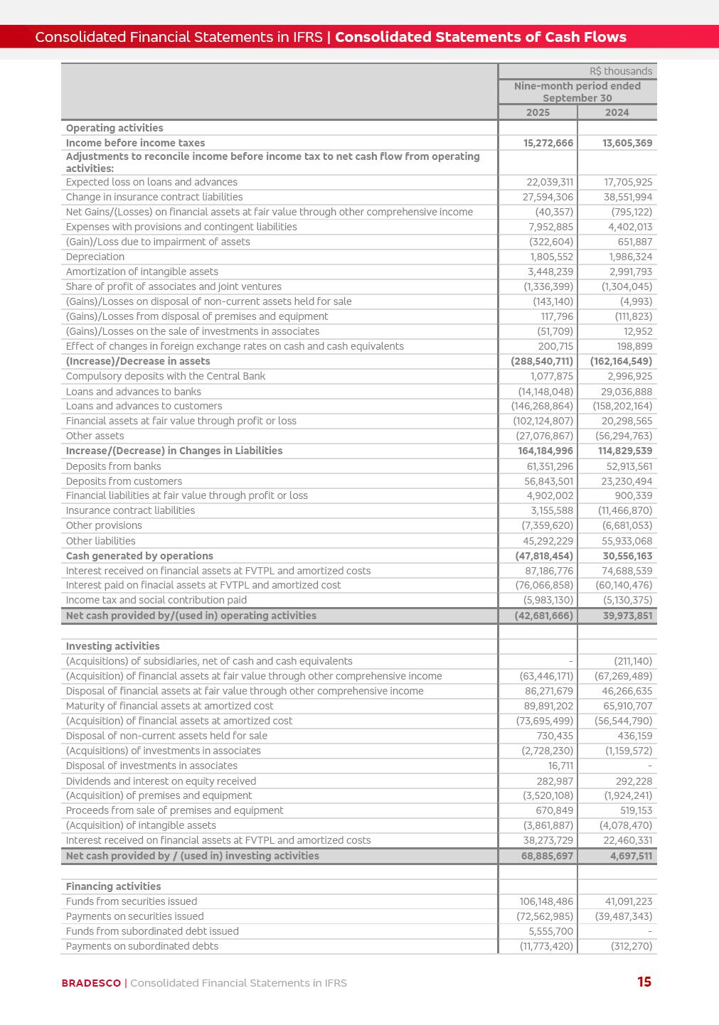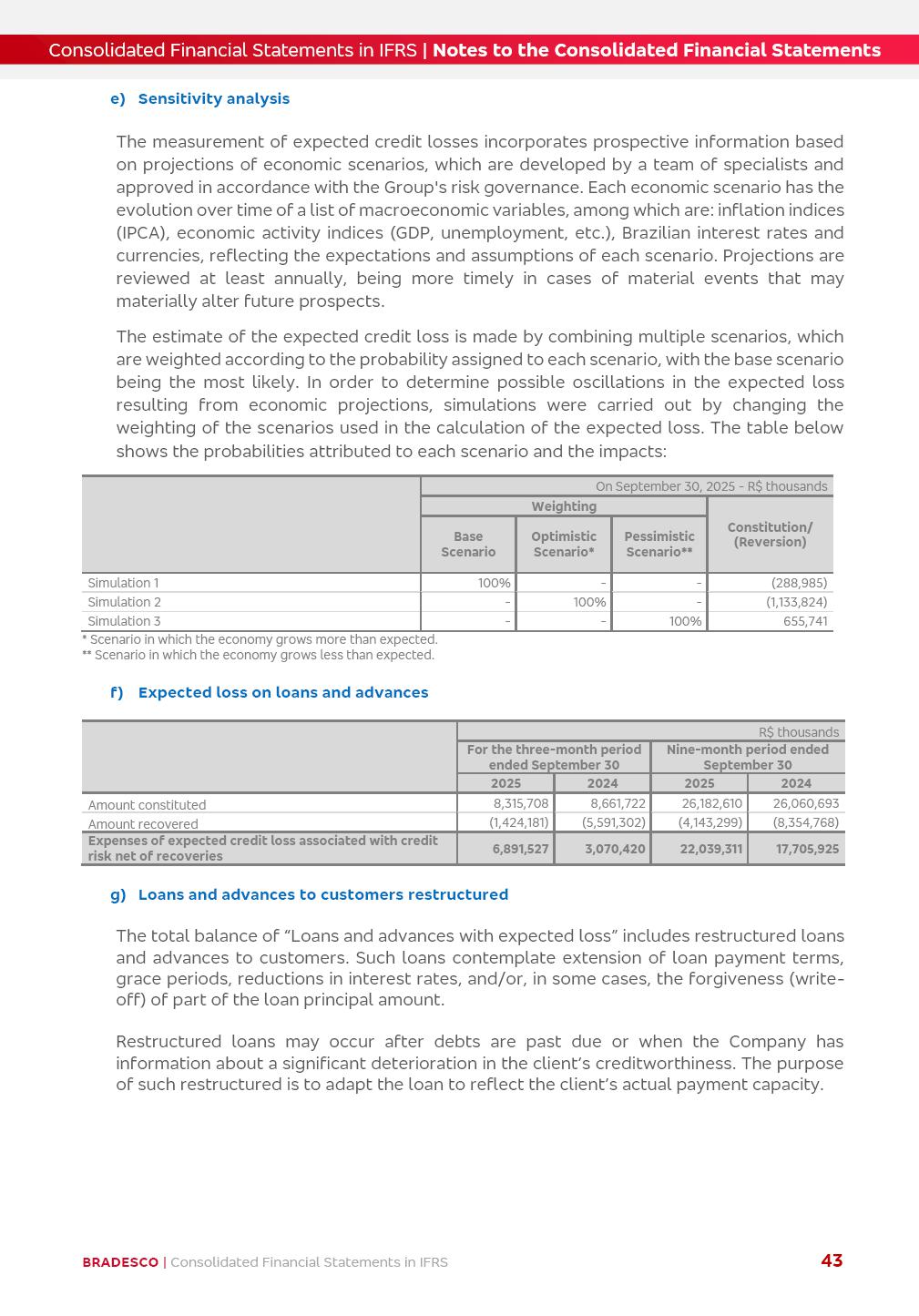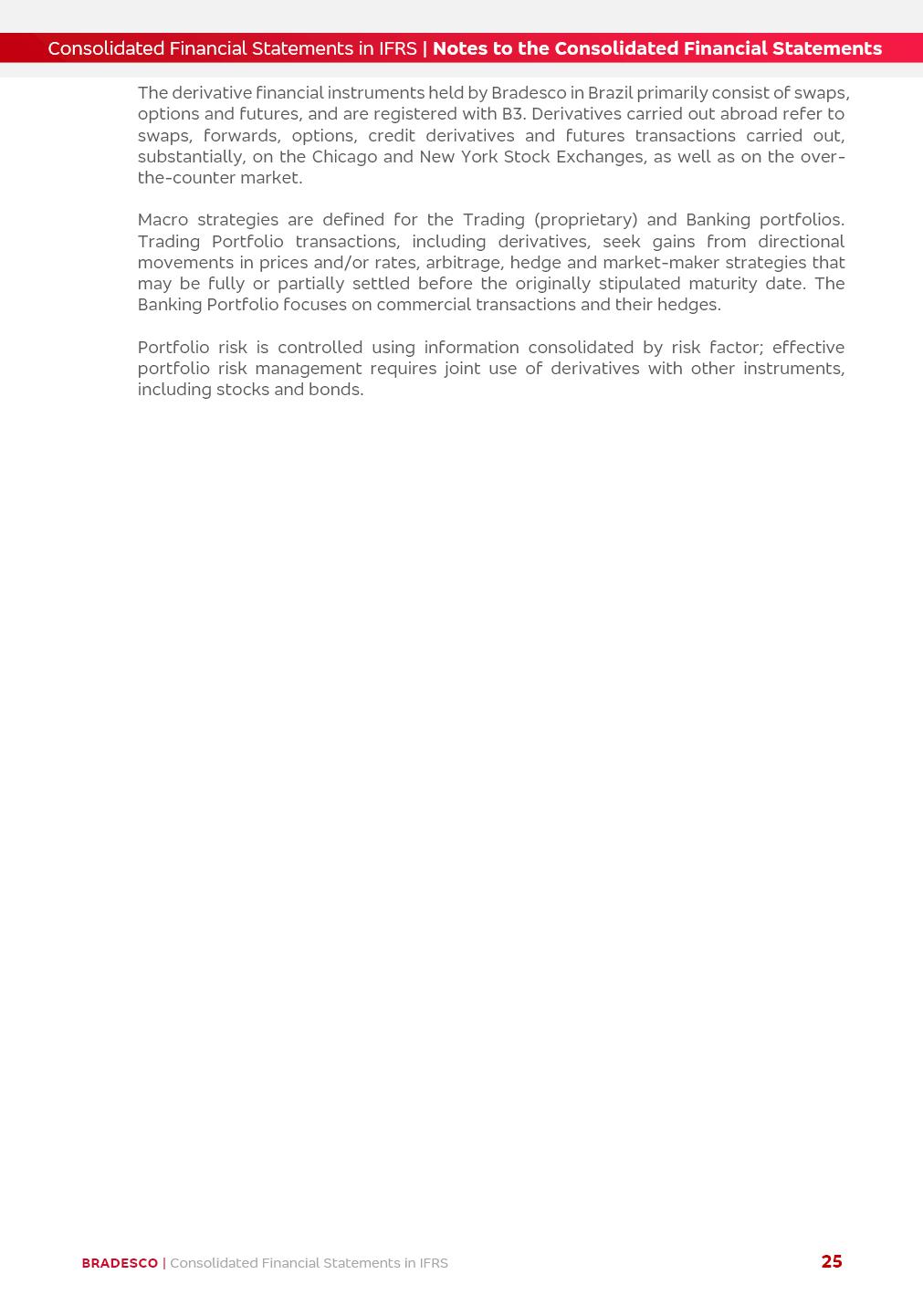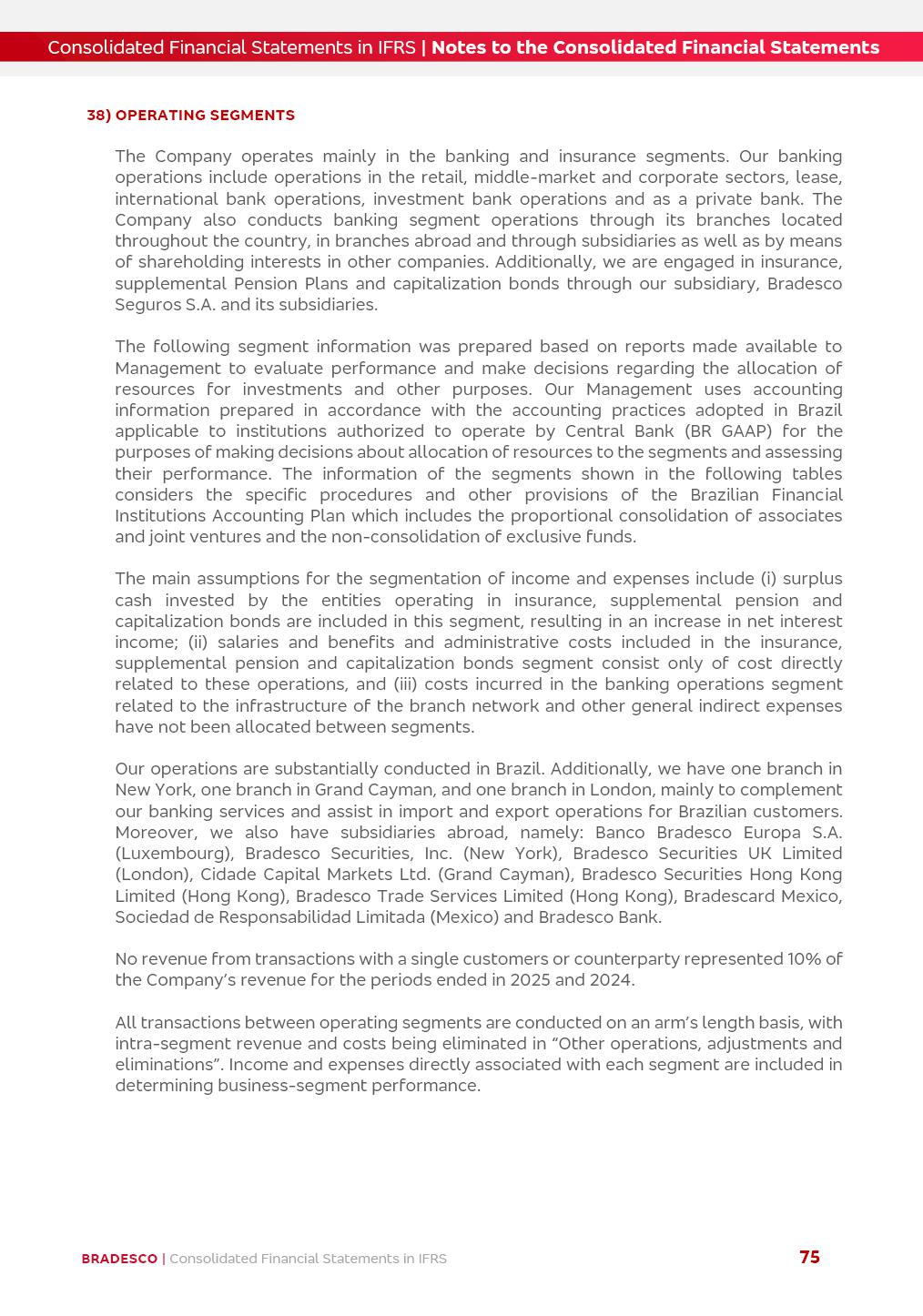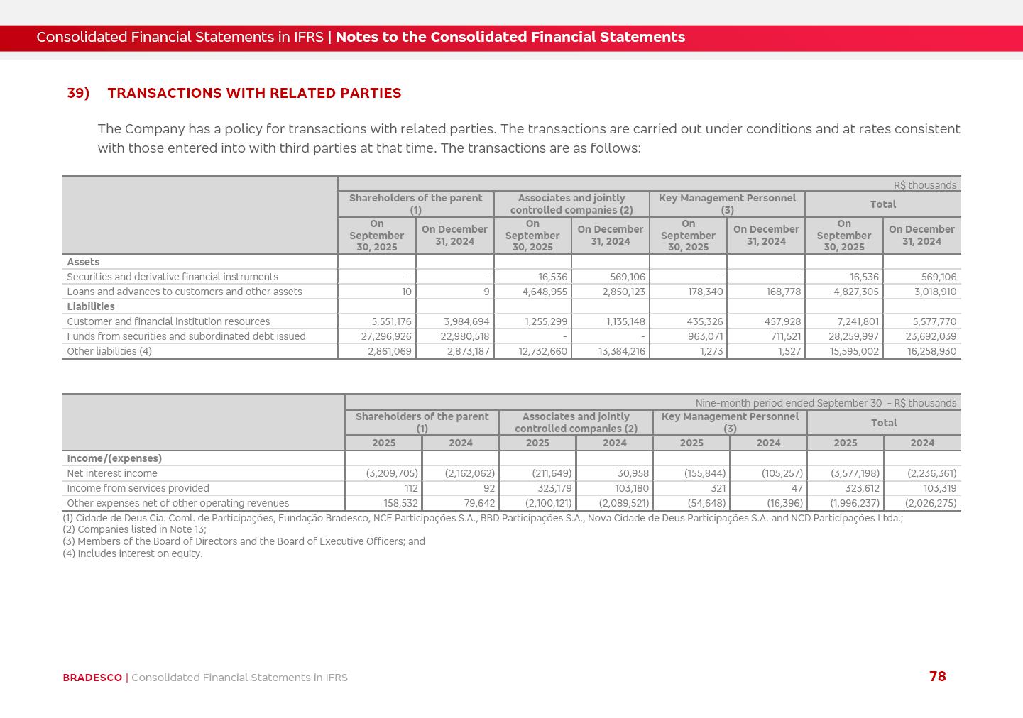Consolidated Financial Statements 3Q25 in accordance with International Financial Reporting Standards (IFRS) issued by the International Accounting Standards Boards (IASB) Management Report BRADESCO | Management Report | Consolidated Financial Statements in IFRS 2 Dear Shareholders, We hereby present the Consolidated Financial Statements of Banco Bradesco S.A. related to the first nine months of 2025. We follow all International Financial Reporting Standards (IFRS) practices issued by the International Accounting Standards Board (IASB). Economic Comment The Brazilian economy showed mixed signals in the last quarter. On the one hand, there is already a slowdown in some sectors. On the other hand, the labor market remains heated, sustaining the dynamism of consumption. This accommodation is expected to intensify in the coming months, reflecting the Selic rate and the reduction of the fiscal momentum in the year. Our projections indicate that the GDP should grow 2.0% in 2025. The Central Bank of Brazil halted the rate hike cycle, after bringing the Selic rate to 15%. Although inflation expectations and the current inflation are still above expectation, there are signs of price decompression. We believe that inflation will continue to slow down in the coming months, favored by the accommodation of economic activity, the appreciation of the real against the dollar and the fall in cost inflation. This will allow the Central Bank of Brazil to start cutting the basic interest rate at the beginning of 2026. Uncertainties remain high on the international scene. The North-American economic policy represents the main vector of uncertainty for the performance of the global economy, also representing structural pressure on the dollar. This context is aggravated by the intensification of geopolitical disputes around the world. Highlights in the period In July 2025, Banco Bradesco S.A. (“Bradesco”) noticed to its shareholders and to the market in general the relevant fact that revised the Guidance for 2025, in compliance with Paragraph 4 of article 157 of Law No. 6,404/76 and CVM Resolution No. 44/21, increasing the projection of the Fee and Commission Income from “4% to 8%” to “5% to 9%” and the projection of the Income from Insurance, Pension Plans and Capitalization Operations from “6% to 10%” to “9% to 13%”. In September 2025, Bradesco disclosed to its shareholders and to the market in general that Atlântica Hospitais e Participações S.A. (an indirect subsidiary), firmed an Investment Agreement with the Rede D’Or São Luiz S.A. group (“Rede D’Or”) for the inclusion of Hospital Glória D’Or in the Atlântica D’Or hospital network, thus expanding the partnership signed with Rede D’Or, disclosed to the market on May 8 and November 1, 2024, retaining the existing corporate shareholding, with the 50.01% stake for Rede D’Or and 49.99% stake for Atlântica. It also informed that the expansion of the partnership is aligned with the strategy of Atlântica to invest in the health sector value chain through partnerships with players established in the operation of the hospitals. Finally, in September 2025, Bradesco approved, at a meeting of the Board of Directors, the proposal of the Board of Executive Officers to pay interest on intermediate equity, in the total amount of R$3,000,000,000.00, i.e. R$0.270146729 per common share and R$0.297161402 per preferred share, whose payment will be made by April 30, 2026. BRADESCO | Management Report | Consolidated Financial Statements in IFRS 3 . highlighted information 9M25 TOTAL DEPOSITS (Sept25 vs. Sept24) R$667.1 bi (+8.2%) R$17.4 bi R$175.6 bi +5.1% y/y EARNINGS PER SHARE BOOK VALUE PER SHARE BOOK NET INCOME R$1.54 common R$1.70 preferred R$16.61 SHAREHOLDERS’ EQUITY (1) MARKET VALUE TIER I CAPITAL R$174.1 bi 13.4% SECURITIES (Sept25 vs. Sept24) R$832.7 bi (+11.4%) FVPL: R$454.6 bi (+31.4%) FVOCI: R$125.7 bi (-45.4%) Amortized Cost: R$252.4 bi (+47.4%) EXPANDED LOAN PORTFOLIO (Sept25 vs. Sept24) R$1,034.2 bi (+9.6%) INDIVIDUALS: R$451.6 bi (+13.8%) COMPANIES: R$582.7 bi (+6.5%) ALLOWANCE FOR EXPANDED LOANS (Sept25 vs. Sept24) R$55.9 bi (stable) INTEREST ON SHAREHOLDERS’ EQUITY R$10.6 bi (gross) +30.4% y/y (1) Equity attributable to shareholders of the parente. +0.7% y/y BRADESCO | Management Report | Consolidated Financial Statements in IFRS 4 Technology and innovation Bradesco’s digital transformation continues at an accelerated pace, consolidating technology as a strategic pillar to generate value for clients and the business. Guided by the Customer-centricity pillars, AI First, Business Acceleration and Efficiency, we continue to develop customized, secure and efficient digital solutions, anticipating data and behavior-based needs. The Bridge platform, which democratizes the use of generative AI for developers and business areas, continues to expand use cases with simplified integration and scalability, re-leveraging already built services. This evolution allows innovative solutions to reach the market faster, reinforcing our positioning in artificial intelligence. We are going beyond the AI First concept, we want to be technologically AI Ready and advance in the ambition to become an AI Powered bank, with practical applications that increase productivity, hyperpersonalization of experiences, with robust governance, security, risk monitoring and client engagement. Artificial intelligence has also been consolidated as a driver of productivity and experience. BIA Clientes with Generative AI is already available for 100% of the clients, with 87% resolution in the chat and integration in journeys like Pix Inteligente (Smart Pix) on WhatsApp. BIA Corporativa supports 100% of employees, with more than 2 million interactions supporting the search for content and responses. BIA Tech drives the development cycle with 64% more efficiency in writing stories, +80 thousand stories evaluated with GenAI, thousands of automatic code 