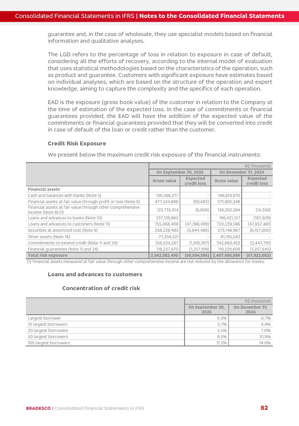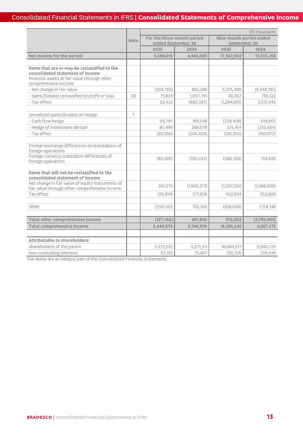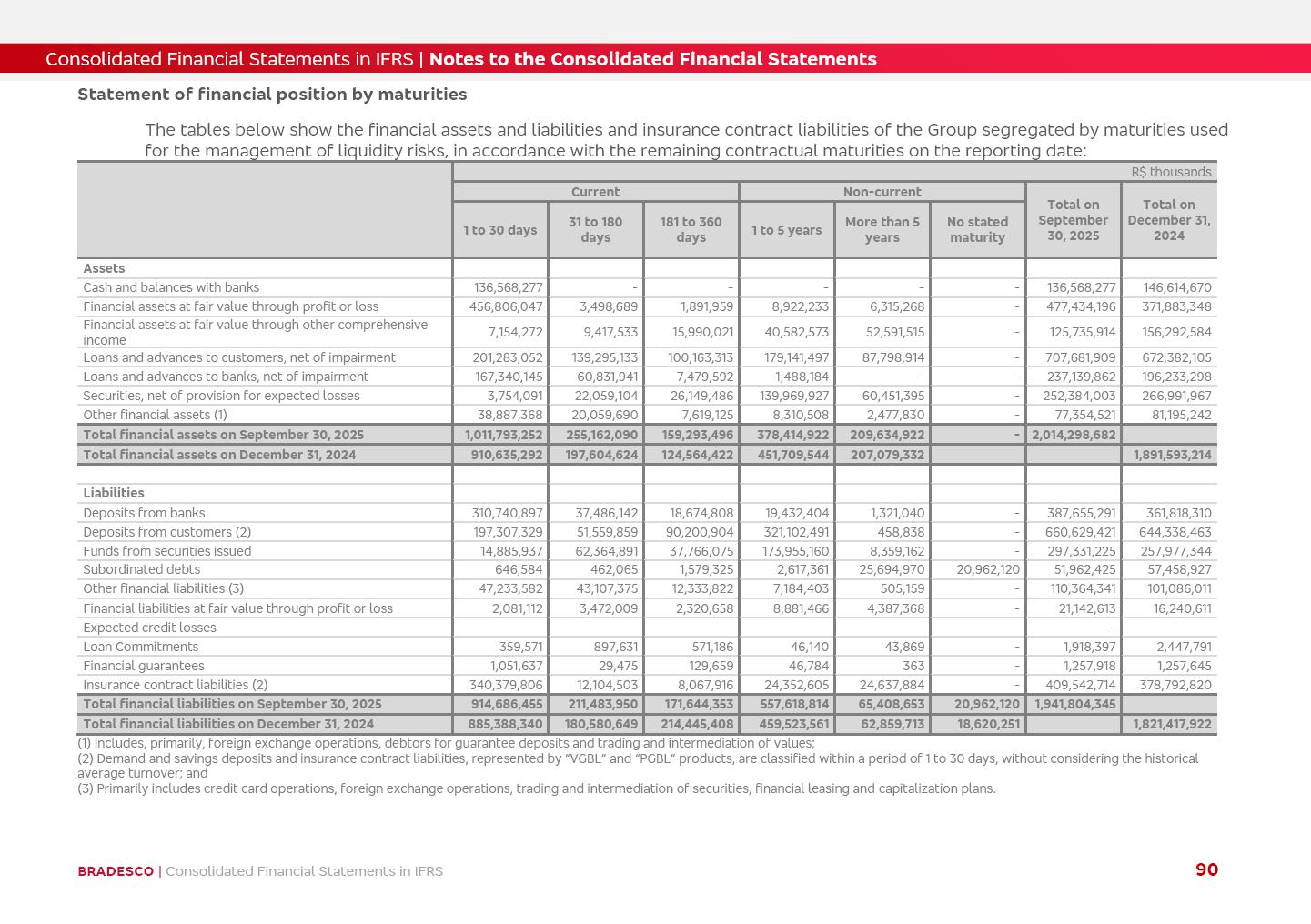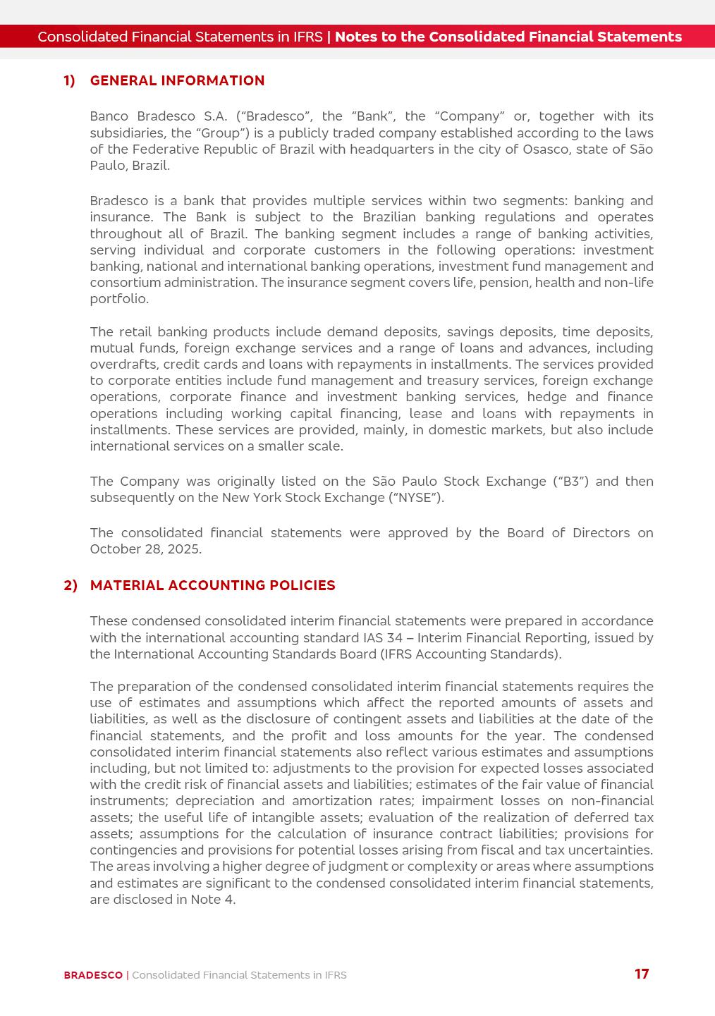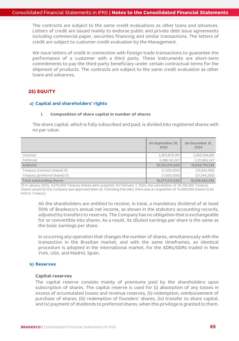 Consolidated Financial Statements 3Q25 in accordance with International Financial Reporting Standards (IFRS) issued by the International Accounting Standards Boards (IASB) Management Report BRADESCO | Management Report | Consolidated Financial Statements in IFRS 2 Dear Shareholders, We hereby present the Consolidated Financial Statements of Banco Bradesco S.A. related to the first nine months of 2025. We follow all International Financial Reporting Standards (IFRS) practices issued by the International Accounting Standards Board (IASB). Economic Comment The Brazilian economy showed mixed signals in the last quarter. On the one hand, there is already a slowdown in some sectors. On the other hand, the labor market remains heated, sustaining the dynamism of consumption. This accommodation is expected to intensify in the coming months, reflecting the Selic rate and the reduction of the fiscal momentum in the year. Our projections indicate that the GDP should grow 2.0% in 2025. The Central Bank of Brazil halted the rate hike cycle, after bringing the Selic rate to 15%. Although inflation expectations and the current inflation are still above expectation, there are signs of price decompression. We believe that inflation will continue to slow down in the coming months, favored by the accommodation of economic activity, the appreciation of the real against the dollar and the fall in cost inflation. This will allow the Central Bank of Brazil to start cutting the basic interest rate at the beginning of 2026. Uncertainties remain high on the international scene. The North-American economic policy represents the main vector of uncertainty for the performance of the global economy, also representing structural pressure on the dollar. This context is aggravated by the intensification of geopolitical disputes around the world. Highlights in the period In July 2025, Banco Bradesco S.A. (“Bradesco”) noticed to its shareholders and to the market in general the relevant fact that revised the Guidance for 2025, in compliance with Paragraph 4 of article 157 of Law No. 6,404/76 and CVM Resolution No. 44/21, increasing the projection of the Fee and Commission Income from “4% to 8%” to “5% to 9%” and the projection of the Income from Insurance, Pension Plans and Capitalization Operations from “6% to 10%” to “9% to 13%”. In September 2025, Bradesco disclosed to its shareholders and to the market in general that Atlântica Hospitais e Participações S.A. (an indirect subsidiary), firmed an Investment Agreement with the Rede D’Or São Luiz S.A. group (“Rede D’Or”) for the inclusion of Hospital Glória D’Or in the Atlântica D’Or hospital network, thus expanding the partnership signed with Rede D’Or, disclosed to the market on May 8 and November 1, 2024, retaining the existing corporate shareholding, with the 50.01% stake for Rede D’Or and 49.99% stake for Atlântica. It also informed that the expansion of the partnership is aligned with the strategy of Atlântica to invest in the health sector value chain through partnerships with players established in the operation of the hospitals. Finally, in September 2025, Bradesco approved, at a meeting of the Board of Directors, the proposal of the Board of Executive Officers to pay interest on intermediate equity, in the total amount of R$3,000,000,000.00, i.e. R$0.270146729 per common share and R$0.297161402 per preferred share, whose payment will be made by April 30, 2026. BRADESCO | Management Report | Consolidated Financial Statements in IFRS 3 . highlighted information 9M25 TOTAL DEPOSITS (Sept25 vs. Sept24) R$667.1 bi (+8.2%) R$17.4 bi R$175.6 bi +5.1% y/y EARNINGS PER SHARE BOOK VALUE PER SHARE BOOK NET INCOME R$1.54 common R$1.70 preferred R$16.61 SHAREHOLDERS’ EQUITY (1) MARKET VALUE TIER I CAPITAL R$174.1 bi 13.4% SECURITIES (Sept25 vs. Sept24) R$832.7 bi (+11.4%) FVPL: R$454.6 bi (+31.4%) FVOCI: R$125.7 bi (-45.4%) Amortized Cost: R$252.4 bi (+47.4%) EXPANDED LOAN PORTFOLIO (Sept25 vs. Sept24) R$1,034.2 bi (+9.6%) INDIVIDUALS: R$451.6 bi (+13.8%) COMPANIES: R$582.7 bi (+6.5%) ALLOWANCE FOR EXPANDED LOANS (Sept25 vs. Sept24) R$55.9 bi (stable) INTEREST ON SHAREHOLDERS’ EQUITY R$10.6 bi (gross) +30.4% y/y (1) Equity attributable to shareholders of the parente. +0.7% y/y BRADESCO | Management Report | Consolidated Financial Statements in IFRS 4 Technology and innovation Bradesco’s digital transformation continues at an accelerated pace, consolidating technology as a strategic pillar to generate value for clients and the business. Guided by the Customer-centricity pillars, AI First, Business Acceleration and Efficiency, we continue to develop customized, secure and efficient digital solutions, anticipating data and behavior-based needs. The Bridge platform, which democratizes the use of generative AI for developers and business areas, continues to expand use cases with simplified integration and scalability, re-leveraging already built services. This evolution allows innovative solutions to reach the market faster, reinforcing our positioning in artificial intelligence. We are going beyond the AI First concept, we want to be technologically AI Ready and advance in the ambition to become an AI Powered bank, with practical applications that increase productivity, hyperpersonalization of experiences, with robust governance, security, risk monitoring and client engagement. Artificial intelligence has also been consolidated as a driver of productivity and experience. BIA Clientes with Generative AI is already available for 100% of the clients, with 87% resolution in the chat and integration in journeys like Pix Inteligente (Smart Pix) on WhatsApp. BIA Corporativa supports 100% of employees, with more than 2 million interactions supporting the search for content and responses. BIA Tech drives the development cycle with 64% more efficiency in writing stories, +80 thousand stories evaluated with GenAI, thousands of automatic code 