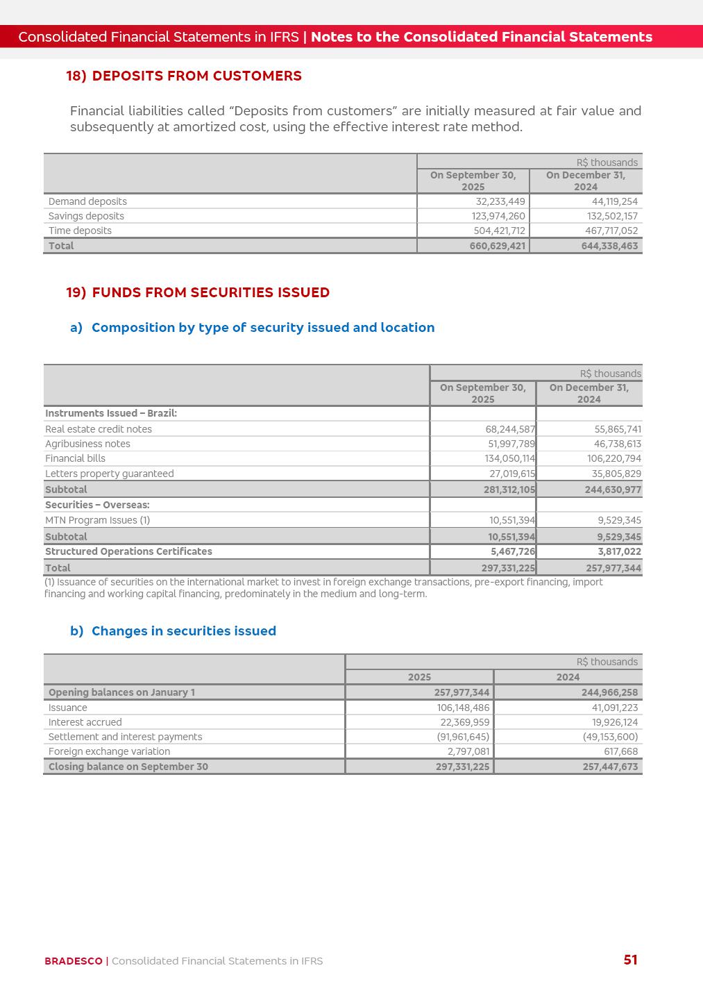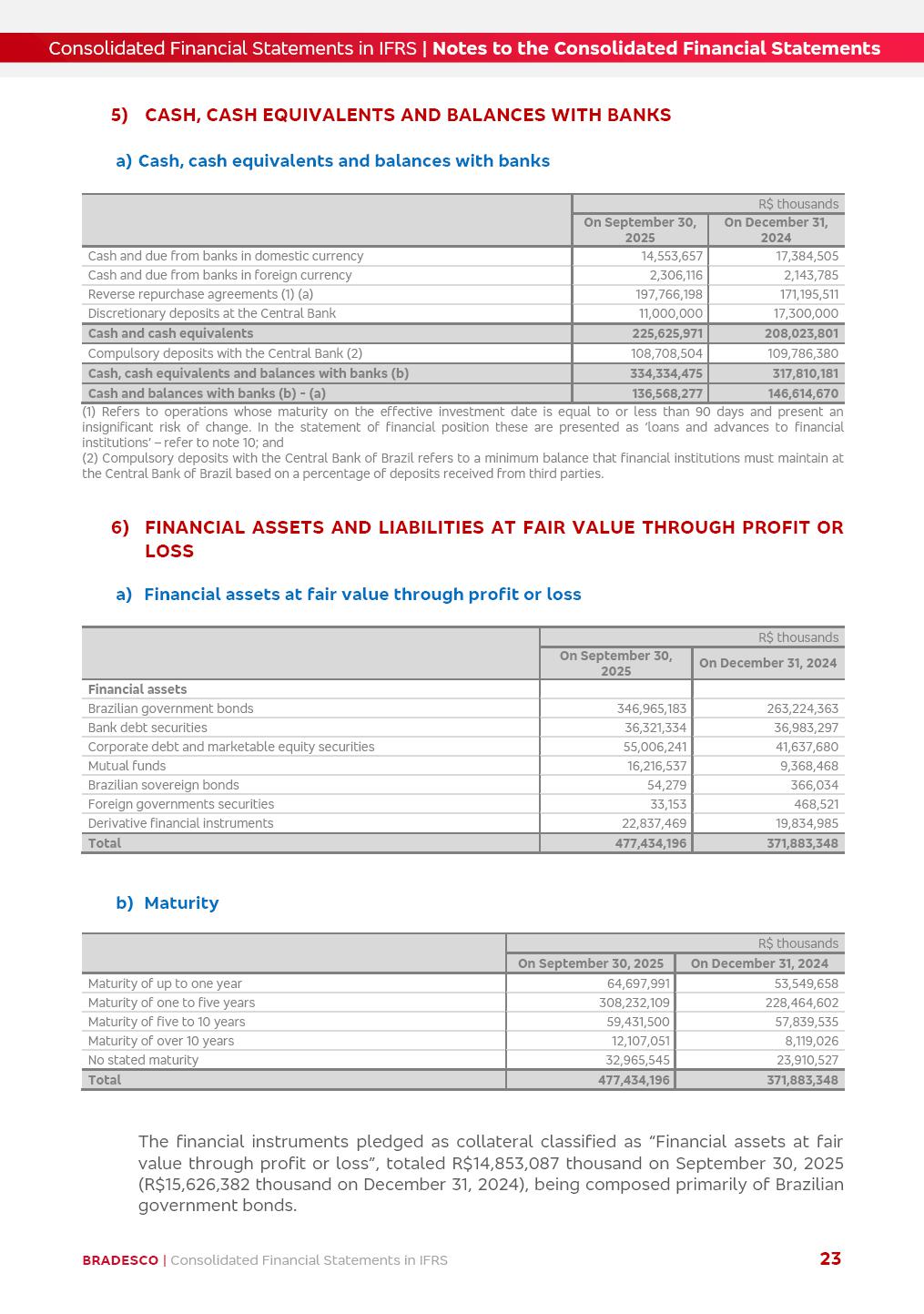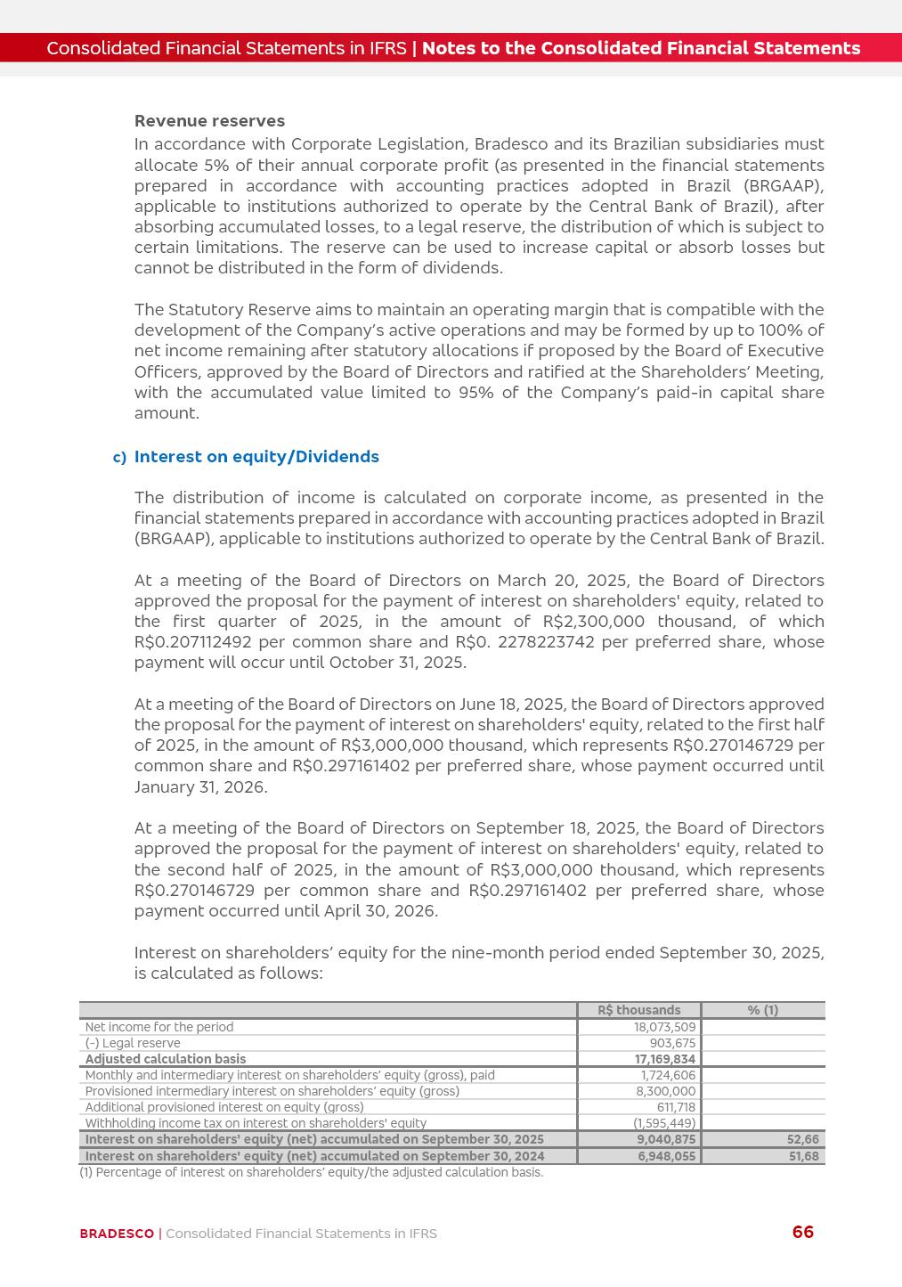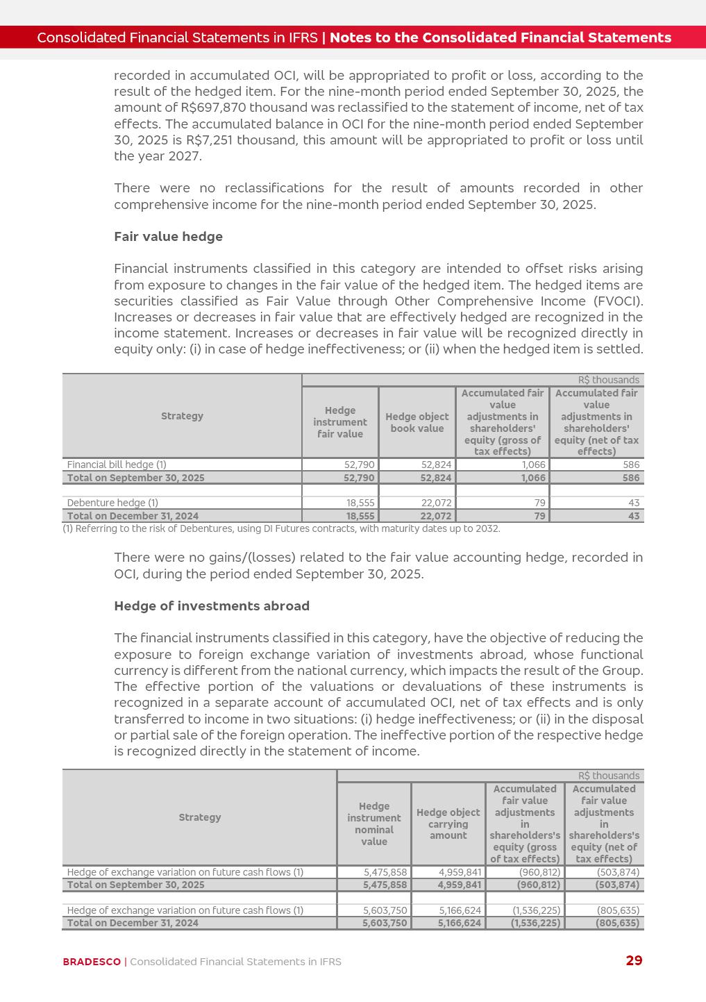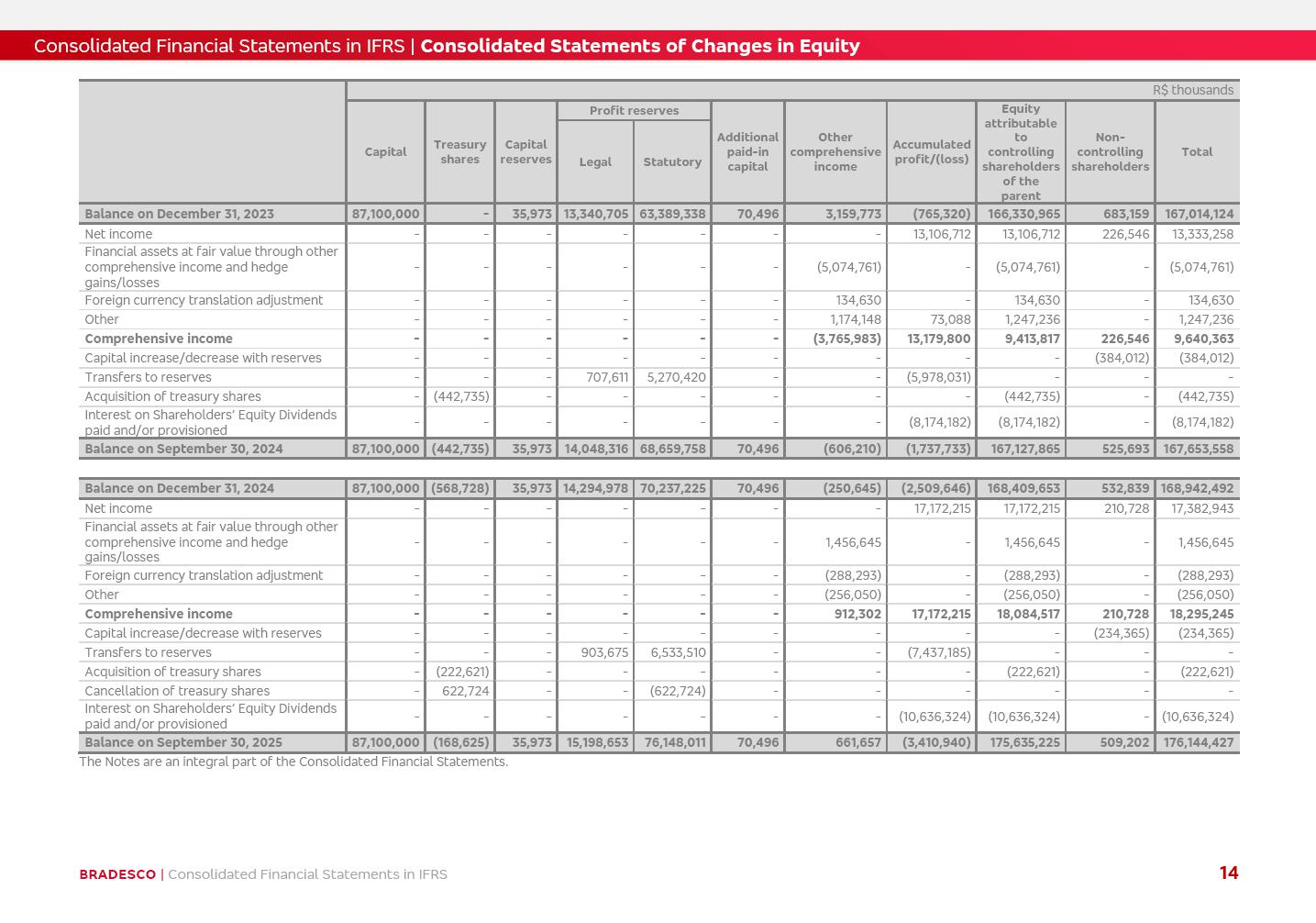 Consolidated Financial Statements 3Q25 in accordance with International Financial Reporting Standards (IFRS) issued by the International Accounting Standards Boards (IASB) Management Report BRADESCO | Management Report | Consolidated Financial Statements in IFRS 2 Dear Shareholders, We hereby present the Consolidated Financial Statements of Banco Bradesco S.A. related to the first nine months of 2025. We follow all International Financial Reporting Standards (IFRS) practices issued by the International Accounting Standards Board (IASB). Economic Comment The Brazilian economy showed mixed signals in the last quarter. On the one hand, there is already a slowdown in some sectors. On the other hand, the labor market remains heated, sustaining the dynamism of consumption. This accommodation is expected to intensify in the coming months, reflecting the Selic rate and the reduction of the fiscal momentum in the year. Our projections indicate that the GDP should grow 2.0% in 2025. The Central Bank of Brazil halted the rate hike cycle, after bringing the Selic rate to 15%. Although inflation expectations and the current inflation are still above expectation, there are signs of price decompression. We believe that inflation will continue to slow down in the coming months, favored by the accommodation of economic activity, the appreciation of the real against the dollar and the fall in cost inflation. This will allow the Central Bank of Brazil to start cutting the basic interest rate at the beginning of 2026. Uncertainties remain high on the international scene. The North-American economic policy represents the main vector of uncertainty for the performance of the global economy, also representing structural pressure on the dollar. This context is aggravated by the intensification of geopolitical disputes around the world. Highlights in the period In July 2025, Banco Bradesco S.A. (“Bradesco”) noticed to its shareholders and to the market in general the relevant fact that revised the Guidance for 2025, in compliance with Paragraph 4 of article 157 of Law No. 6,404/76 and CVM Resolution No. 44/21, increasing the projection of the Fee and Commission Income from “4% to 8%” to “5% to 9%” and the projection of the Income from Insurance, Pension Plans and Capitalization Operations from “6% to 10%” to “9% to 13%”. In September 2025, Bradesco disclosed to its shareholders and to the market in general that Atlântica Hospitais e Participações S.A. (an indirect subsidiary), firmed an Investment Agreement with the Rede D’Or São Luiz S.A. group (“Rede D’Or”) for the inclusion of Hospital Glória D’Or in the Atlântica D’Or hospital network, thus expanding the partnership signed with Rede D’Or, disclosed to the market on May 8 and November 1, 2024, retaining the existing corporate shareholding, with the 50.01% stake for Rede D’Or and 49.99% stake for Atlântica. It also informed that the expansion of the partnership is aligned with the strategy of Atlântica to invest in the health sector value chain through partnerships with players established in the operation of the hospitals. Finally, in September 2025, Bradesco approved, at a meeting of the Board of Directors, the proposal of the Board of Executive Officers to pay interest on intermediate equity, in the total amount of R$3,000,000,000.00, i.e. R$0.270146729 per common share and R$0.297161402 per preferred share, whose payment will be made by April 30, 2026. BRADESCO | Management Report | Consolidated Financial Statements in IFRS 3 . highlighted information 9M25 TOTAL DEPOSITS (Sept25 vs. Sept24) R$667.1 bi (+8.2%) R$17.4 bi R$175.6 bi +5.1% y/y EARNINGS PER SHARE BOOK VALUE PER SHARE BOOK NET INCOME R$1.54 common R$1.70 preferred R$16.61 SHAREHOLDERS’ EQUITY (1) MARKET VALUE TIER I CAPITAL R$174.1 bi 13.4% SECURITIES (Sept25 vs. Sept24) R$832.7 bi (+11.4%) FVPL: R$454.6 bi (+31.4%) FVOCI: R$125.7 bi (-45.4%) Amortized Cost: R$252.4 bi (+47.4%) EXPANDED LOAN PORTFOLIO (Sept25 vs. Sept24) R$1,034.2 bi (+9.6%) INDIVIDUALS: R$451.6 bi (+13.8%) COMPANIES: R$582.7 bi (+6.5%) ALLOWANCE FOR EXPANDED LOANS (Sept25 vs. Sept24) R$55.9 bi (stable) INTEREST ON SHAREHOLDERS’ EQUITY R$10.6 bi (gross) +30.4% y/y (1) Equity attributable to shareholders of the parente. +0.7% y/y BRADESCO | Management Report | Consolidated Financial Statements in IFRS 4 Technology and innovation Bradesco’s digital transformation continues at an accelerated pace, consolidating technology as a strategic pillar to generate value for clients and the business. Guided by the Customer-centricity pillars, AI First, Business Acceleration and Efficiency, we continue to develop customized, secure and efficient digital solutions, anticipating data and behavior-based needs. The Bridge platform, which democratizes the use of generative AI for developers and business areas, continues to expand use cases with simplified integration and scalability, re-leveraging already built services. This evolution allows innovative solutions to reach the market faster, reinforcing our positioning in artificial intelligence. We are going beyond the AI First concept, we want to be technologically AI Ready and advance in the ambition to become an AI Powered bank, with practical applications that increase productivity, hyperpersonalization of experiences, with robust governance, security, risk monitoring and client engagement. Artificial intelligence has also been consolidated as a driver of productivity and experience. BIA Clientes with Generative AI is already available for 100% of the clients, with 87% resolution in the chat and integration in journeys like Pix Inteligente (Smart Pix) on WhatsApp. BIA Corporativa supports 100% of employees, with more than 2 million interactions supporting the search for content and responses. BIA Tech drives the development cycle with 64% more efficiency in writing stories, +80 thousand stories evaluated with GenAI, thousands of automatic code 