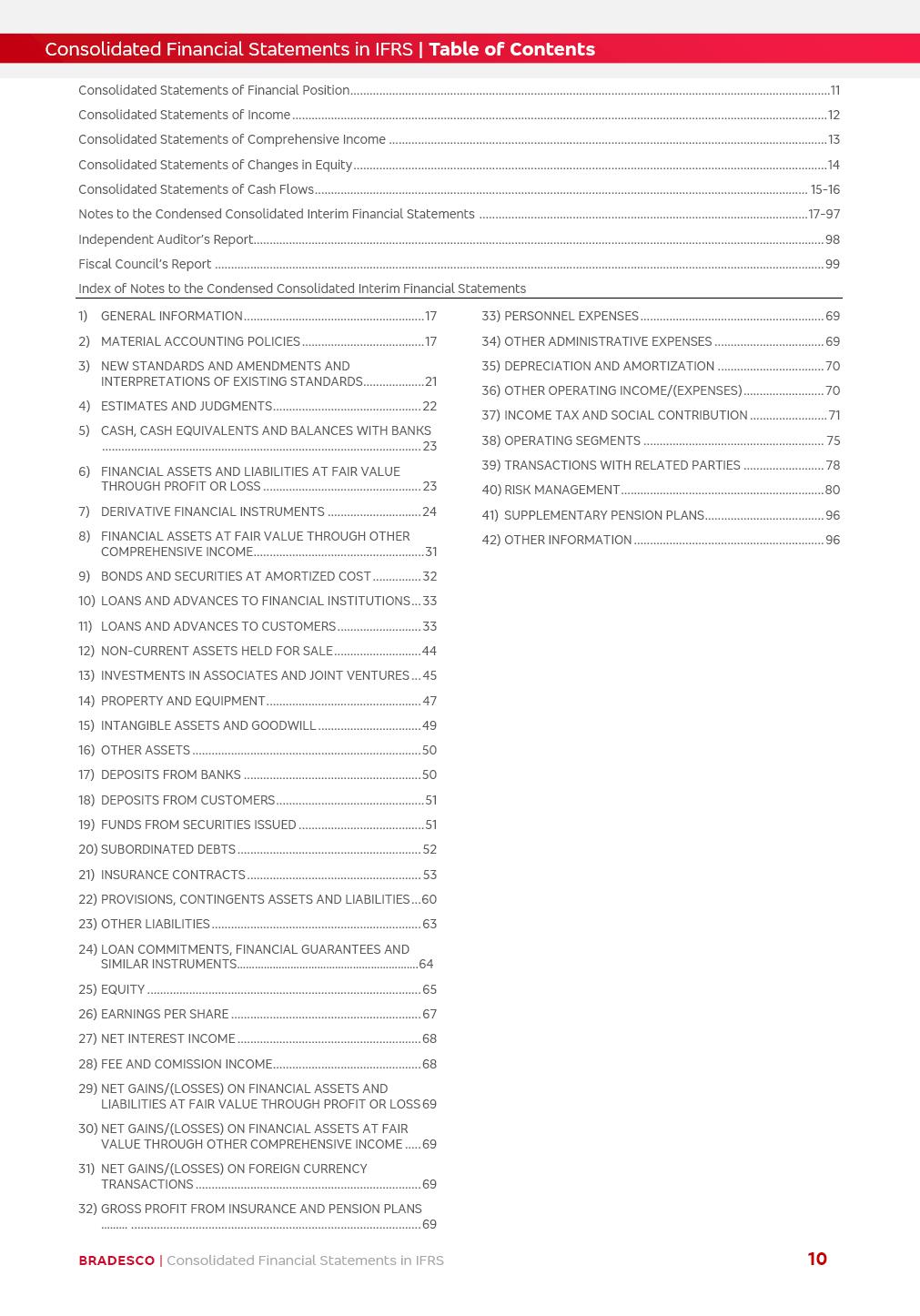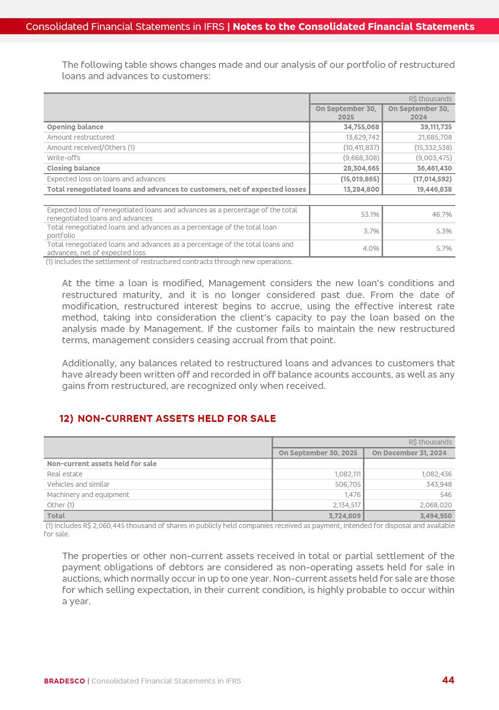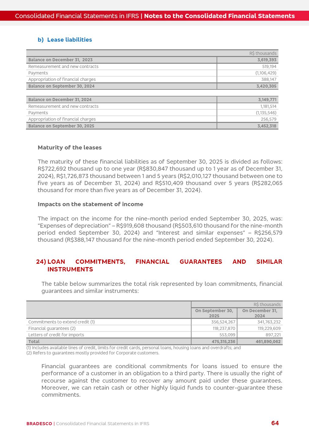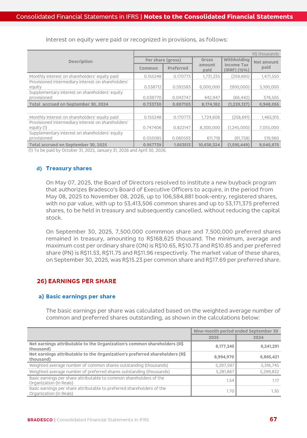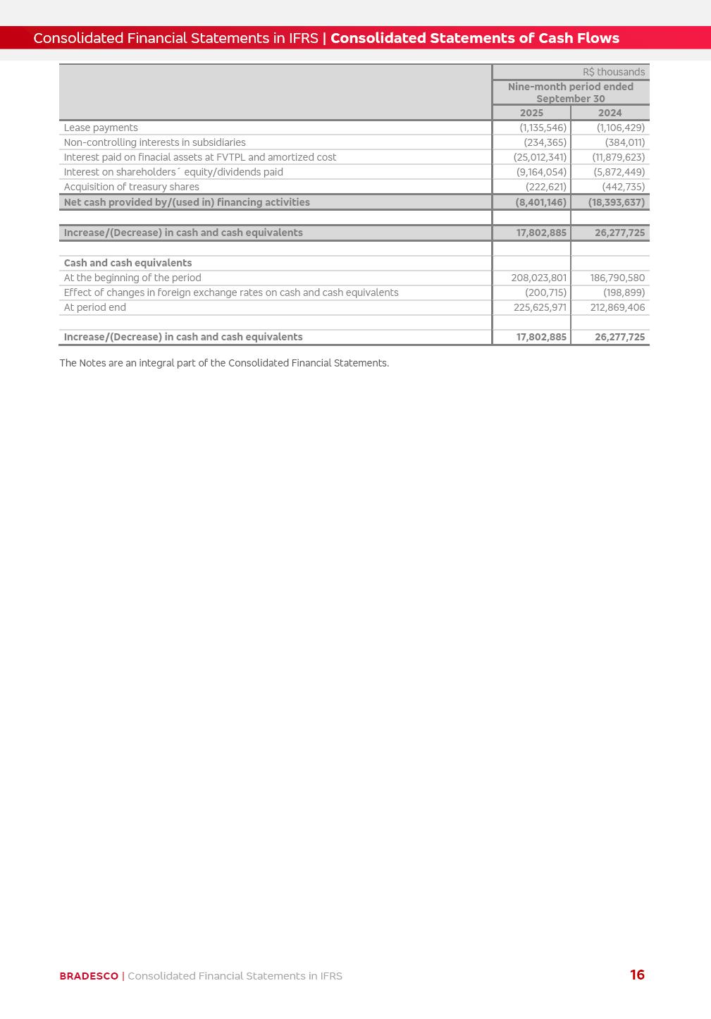 Consolidated Financial Statements 3Q25 in accordance with International Financial Reporting Standards (IFRS) issued by the International Accounting Standards Boards (IASB) Management Report BRADESCO | Management Report | Consolidated Financial Statements in IFRS 2 Dear Shareholders, We hereby present the Consolidated Financial Statements of Banco Bradesco S.A. related to the first nine months of 2025. We follow all International Financial Reporting Standards (IFRS) practices issued by the International Accounting Standards Board (IASB). Economic Comment The Brazilian economy showed mixed signals in the last quarter. On the one hand, there is already a slowdown in some sectors. On the other hand, the labor market remains heated, sustaining the dynamism of consumption. This accommodation is expected to intensify in the coming months, reflecting the Selic rate and the reduction of the fiscal momentum in the year. Our projections indicate that the GDP should grow 2.0% in 2025. The Central Bank of Brazil halted the rate hike cycle, after bringing the Selic rate to 15%. Although inflation expectations and the current inflation are still above expectation, there are signs of price decompression. We believe that inflation will continue to slow down in the coming months, favored by the accommodation of economic activity, the appreciation of the real against the dollar and the fall in cost inflation. This will allow the Central Bank of Brazil to start cutting the basic interest rate at the beginning of 2026. Uncertainties remain high on the international scene. The North-American economic policy represents the main vector of uncertainty for the performance of the global economy, also representing structural pressure on the dollar. This context is aggravated by the intensification of geopolitical disputes around the world. Highlights in the period In July 2025, Banco Bradesco S.A. (“Bradesco”) noticed to its shareholders and to the market in general the relevant fact that revised the Guidance for 2025, in compliance with Paragraph 4 of article 157 of Law No. 6,404/76 and CVM Resolution No. 44/21, increasing the projection of the Fee and Commission Income from “4% to 8%” to “5% to 9%” and the projection of the Income from Insurance, Pension Plans and Capitalization Operations from “6% to 10%” to “9% to 13%”. In September 2025, Bradesco disclosed to its shareholders and to the market in general that Atlântica Hospitais e Participações S.A. (an indirect subsidiary), firmed an Investment Agreement with the Rede D’Or São Luiz S.A. group (“Rede D’Or”) for the inclusion of Hospital Glória D’Or in the Atlântica D’Or hospital network, thus expanding the partnership signed with Rede D’Or, disclosed to the market on May 8 and November 1, 2024, retaining the existing corporate shareholding, with the 50.01% stake for Rede D’Or and 49.99% stake for Atlântica. It also informed that the expansion of the partnership is aligned with the strategy of Atlântica to invest in the health sector value chain through partnerships with players established in the operation of the hospitals. Finally, in September 2025, Bradesco approved, at a meeting of the Board of Directors, the proposal of the Board of Executive Officers to pay interest on intermediate equity, in the total amount of R$3,000,000,000.00, i.e. R$0.270146729 per common share and R$0.297161402 per preferred share, whose payment will be made by April 30, 2026. BRADESCO | Management Report | Consolidated Financial Statements in IFRS 3 . highlighted information 9M25 TOTAL DEPOSITS (Sept25 vs. Sept24) R$667.1 bi (+8.2%) R$17.4 bi R$175.6 bi +5.1% y/y EARNINGS PER SHARE BOOK VALUE PER SHARE BOOK NET INCOME R$1.54 common R$1.70 preferred R$16.61 SHAREHOLDERS’ EQUITY (1) MARKET VALUE TIER I CAPITAL R$174.1 bi 13.4% SECURITIES (Sept25 vs. Sept24) R$832.7 bi (+11.4%) FVPL: R$454.6 bi (+31.4%) FVOCI: R$125.7 bi (-45.4%) Amortized Cost: R$252.4 bi (+47.4%) EXPANDED LOAN PORTFOLIO (Sept25 vs. Sept24) R$1,034.2 bi (+9.6%) INDIVIDUALS: R$451.6 bi (+13.8%) COMPANIES: R$582.7 bi (+6.5%) ALLOWANCE FOR EXPANDED LOANS (Sept25 vs. Sept24) R$55.9 bi (stable) INTEREST ON SHAREHOLDERS’ EQUITY R$10.6 bi (gross) +30.4% y/y (1) Equity attributable to shareholders of the parente. +0.7% y/y BRADESCO | Management Report | Consolidated Financial Statements in IFRS 4 Technology and innovation Bradesco’s digital transformation continues at an accelerated pace, consolidating technology as a strategic pillar to generate value for clients and the business. Guided by the Customer-centricity pillars, AI First, Business Acceleration and Efficiency, we continue to develop customized, secure and efficient digital solutions, anticipating data and behavior-based needs. The Bridge platform, which democratizes the use of generative AI for developers and business areas, continues to expand use cases with simplified integration and scalability, re-leveraging already built services. This evolution allows innovative solutions to reach the market faster, reinforcing our positioning in artificial intelligence. We are going beyond the AI First concept, we want to be technologically AI Ready and advance in the ambition to become an AI Powered bank, with practical applications that increase productivity, hyperpersonalization of experiences, with robust governance, security, risk monitoring and client engagement. Artificial intelligence has also been consolidated as a driver of productivity and experience. BIA Clientes with Generative AI is already available for 100% of the clients, with 87% resolution in the chat and integration in journeys like Pix Inteligente (Smart Pix) on WhatsApp. BIA Corporativa supports 100% of employees, with more than 2 million interactions supporting the search for content and responses. BIA Tech drives the development cycle with 64% more efficiency in writing stories, +80 thousand stories evaluated with GenAI, thousands of automatic code 