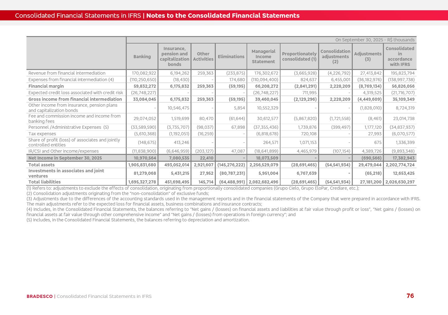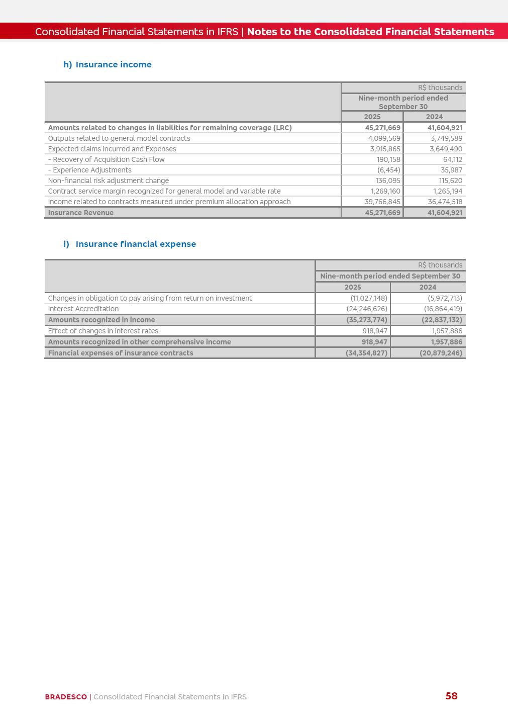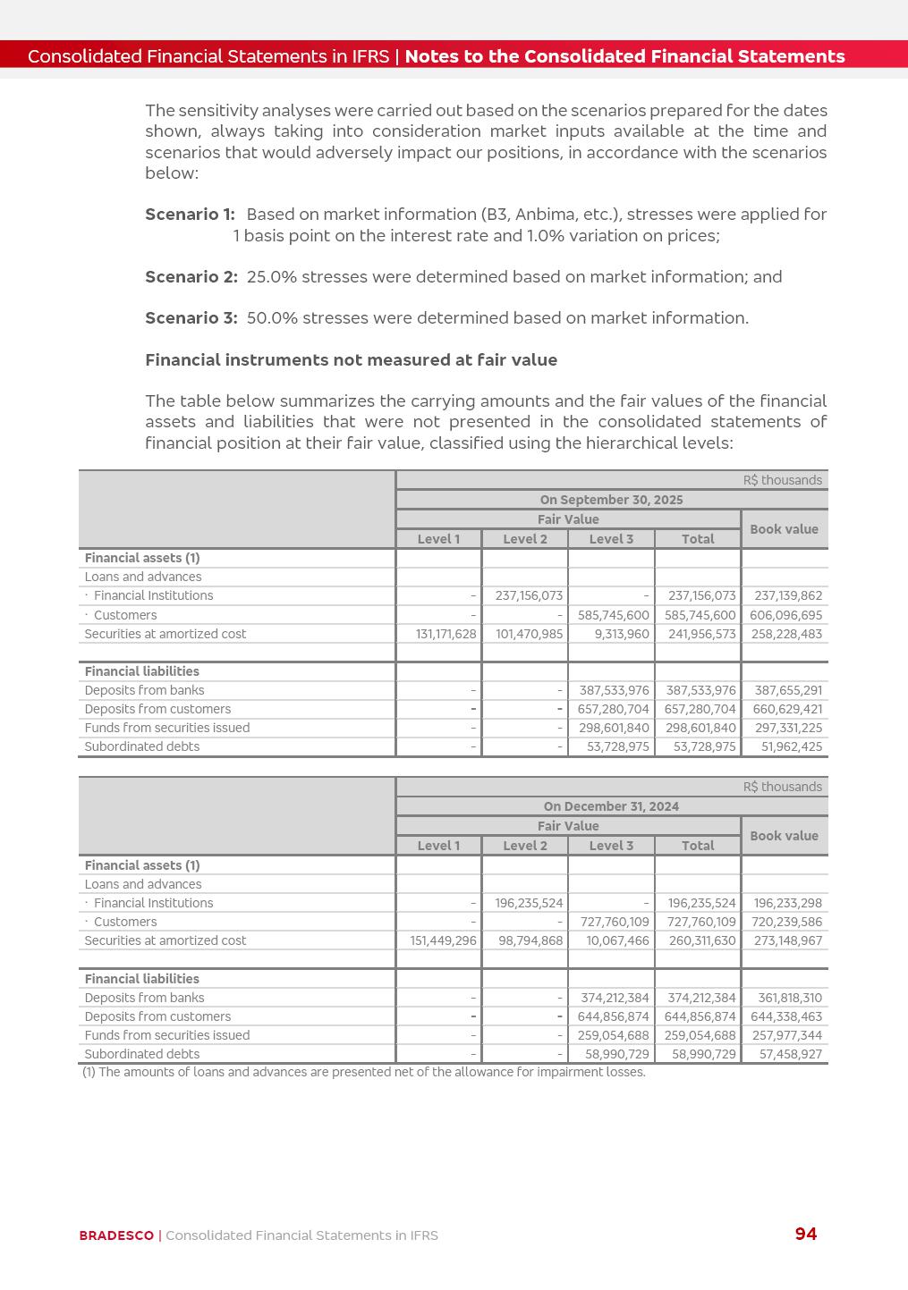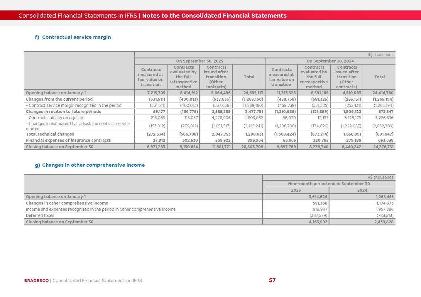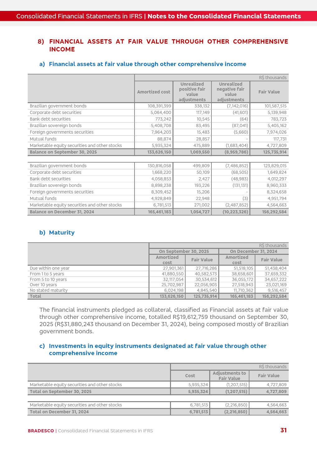 Consolidated Financial Statements 3Q25 in accordance with International Financial Reporting Standards (IFRS) issued by the International Accounting Standards Boards (IASB) Management Report BRADESCO | Management Report | Consolidated Financial Statements in IFRS 2 Dear Shareholders, We hereby present the Consolidated Financial Statements of Banco Bradesco S.A. related to the first nine months of 2025. We follow all International Financial Reporting Standards (IFRS) practices issued by the International Accounting Standards Board (IASB). Economic Comment The Brazilian economy showed mixed signals in the last quarter. On the one hand, there is already a slowdown in some sectors. On the other hand, the labor market remains heated, sustaining the dynamism of consumption. This accommodation is expected to intensify in the coming months, reflecting the Selic rate and the reduction of the fiscal momentum in the year. Our projections indicate that the GDP should grow 2.0% in 2025. The Central Bank of Brazil halted the rate hike cycle, after bringing the Selic rate to 15%. Although inflation expectations and the current inflation are still above expectation, there are signs of price decompression. We believe that inflation will continue to slow down in the coming months, favored by the accommodation of economic activity, the appreciation of the real against the dollar and the fall in cost inflation. This will allow the Central Bank of Brazil to start cutting the basic interest rate at the beginning of 2026. Uncertainties remain high on the international scene. The North-American economic policy represents the main vector of uncertainty for the performance of the global economy, also representing structural pressure on the dollar. This context is aggravated by the intensification of geopolitical disputes around the world. Highlights in the period In July 2025, Banco Bradesco S.A. (“Bradesco”) noticed to its shareholders and to the market in general the relevant fact that revised the Guidance for 2025, in compliance with Paragraph 4 of article 157 of Law No. 6,404/76 and CVM Resolution No. 44/21, increasing the projection of the Fee and Commission Income from “4% to 8%” to “5% to 9%” and the projection of the Income from Insurance, Pension Plans and Capitalization Operations from “6% to 10%” to “9% to 13%”. In September 2025, Bradesco disclosed to its shareholders and to the market in general that Atlântica Hospitais e Participações S.A. (an indirect subsidiary), firmed an Investment Agreement with the Rede D’Or São Luiz S.A. group (“Rede D’Or”) for the inclusion of Hospital Glória D’Or in the Atlântica D’Or hospital network, thus expanding the partnership signed with Rede D’Or, disclosed to the market on May 8 and November 1, 2024, retaining the existing corporate shareholding, with the 50.01% stake for Rede D’Or and 49.99% stake for Atlântica. It also informed that the expansion of the partnership is aligned with the strategy of Atlântica to invest in the health sector value chain through partnerships with players established in the operation of the hospitals. Finally, in September 2025, Bradesco approved, at a meeting of the Board of Directors, the proposal of the Board of Executive Officers to pay interest on intermediate equity, in the total amount of R$3,000,000,000.00, i.e. R$0.270146729 per common share and R$0.297161402 per preferred share, whose payment will be made by April 30, 2026. BRADESCO | Management Report | Consolidated Financial Statements in IFRS 3 . highlighted information 9M25 TOTAL DEPOSITS (Sept25 vs. Sept24) R$667.1 bi (+8.2%) R$17.4 bi R$175.6 bi +5.1% y/y EARNINGS PER SHARE BOOK VALUE PER SHARE BOOK NET INCOME R$1.54 common R$1.70 preferred R$16.61 SHAREHOLDERS’ EQUITY (1) MARKET VALUE TIER I CAPITAL R$174.1 bi 13.4% SECURITIES (Sept25 vs. Sept24) R$832.7 bi (+11.4%) FVPL: R$454.6 bi (+31.4%) FVOCI: R$125.7 bi (-45.4%) Amortized Cost: R$252.4 bi (+47.4%) EXPANDED LOAN PORTFOLIO (Sept25 vs. Sept24) R$1,034.2 bi (+9.6%) INDIVIDUALS: R$451.6 bi (+13.8%) COMPANIES: R$582.7 bi (+6.5%) ALLOWANCE FOR EXPANDED LOANS (Sept25 vs. Sept24) R$55.9 bi (stable) INTEREST ON SHAREHOLDERS’ EQUITY R$10.6 bi (gross) +30.4% y/y (1) Equity attributable to shareholders of the parente. +0.7% y/y BRADESCO | Management Report | Consolidated Financial Statements in IFRS 4 Technology and innovation Bradesco’s digital transformation continues at an accelerated pace, consolidating technology as a strategic pillar to generate value for clients and the business. Guided by the Customer-centricity pillars, AI First, Business Acceleration and Efficiency, we continue to develop customized, secure and efficient digital solutions, anticipating data and behavior-based needs. The Bridge platform, which democratizes the use of generative AI for developers and business areas, continues to expand use cases with simplified integration and scalability, re-leveraging already built services. This evolution allows innovative solutions to reach the market faster, reinforcing our positioning in artificial intelligence. We are going beyond the AI First concept, we want to be technologically AI Ready and advance in the ambition to become an AI Powered bank, with practical applications that increase productivity, hyperpersonalization of experiences, with robust governance, security, risk monitoring and client engagement. Artificial intelligence has also been consolidated as a driver of productivity and experience. BIA Clientes with Generative AI is already available for 100% of the clients, with 87% resolution in the chat and integration in journeys like Pix Inteligente (Smart Pix) on WhatsApp. BIA Corporativa supports 100% of employees, with more than 2 million interactions supporting the search for content and responses. BIA Tech drives the development cycle with 64% more efficiency in writing stories, +80 thousand stories evaluated with GenAI, thousands of automatic code 