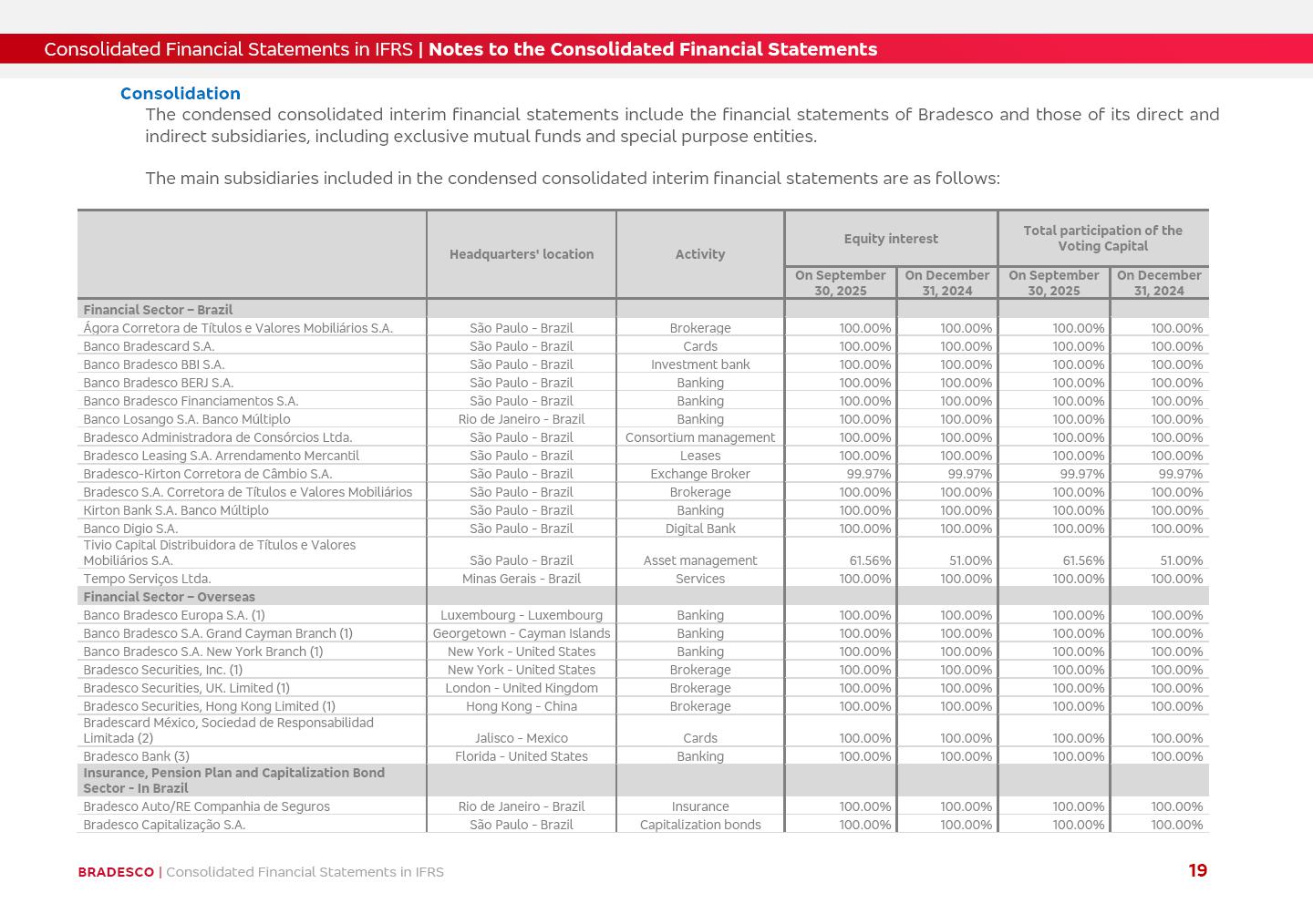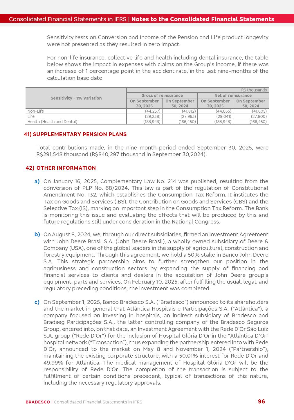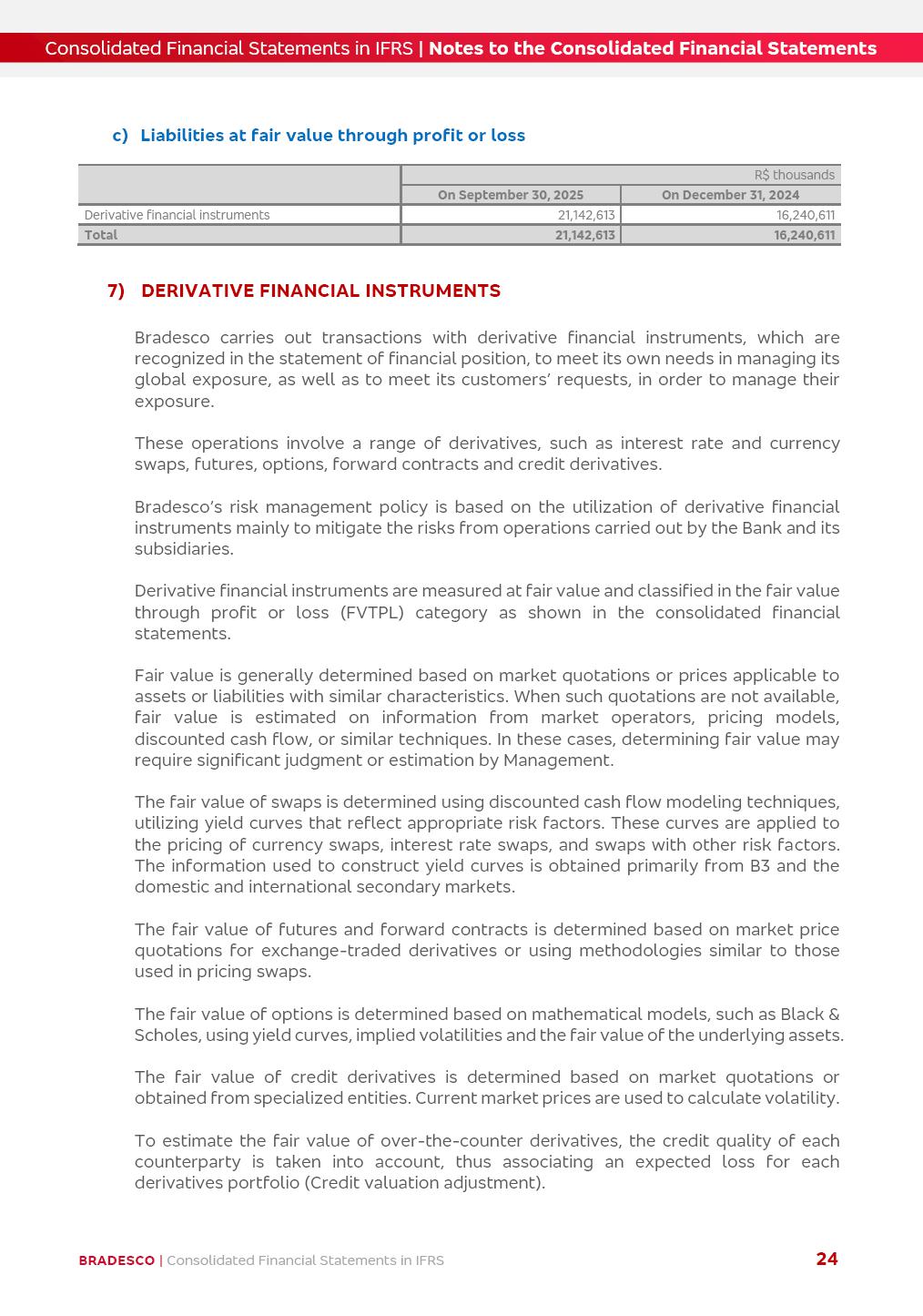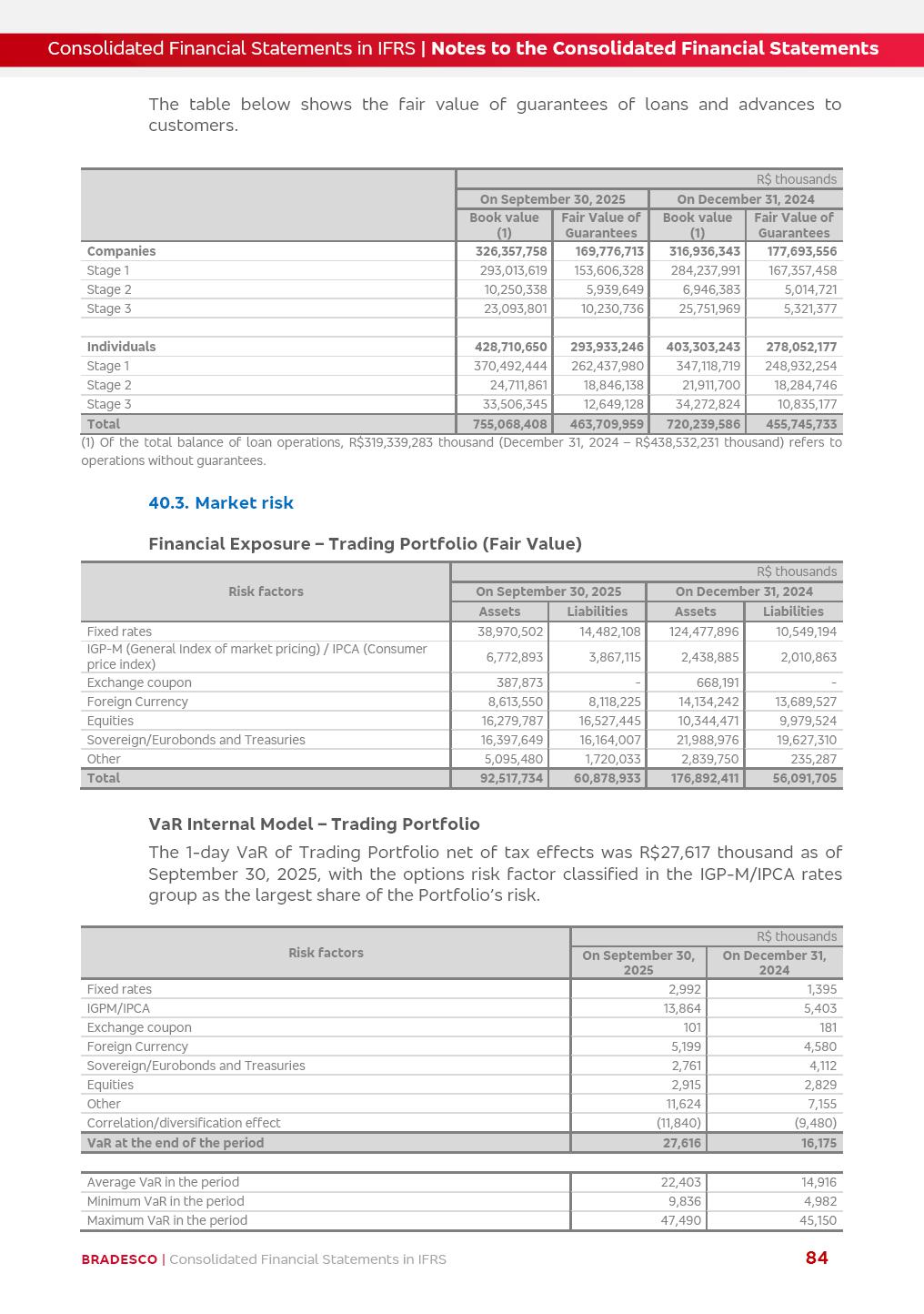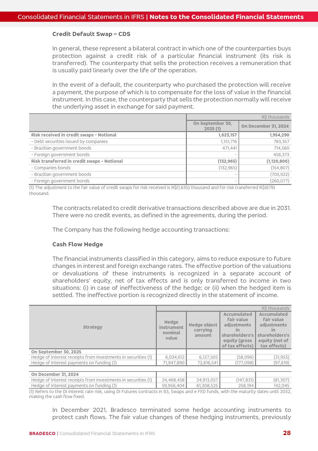 Consolidated Financial Statements 3Q25 in accordance with International Financial Reporting Standards (IFRS) issued by the International Accounting Standards Boards (IASB) Management Report BRADESCO | Management Report | Consolidated Financial Statements in IFRS 2 Dear Shareholders, We hereby present the Consolidated Financial Statements of Banco Bradesco S.A. related to the first nine months of 2025. We follow all International Financial Reporting Standards (IFRS) practices issued by the International Accounting Standards Board (IASB). Economic Comment The Brazilian economy showed mixed signals in the last quarter. On the one hand, there is already a slowdown in some sectors. On the other hand, the labor market remains heated, sustaining the dynamism of consumption. This accommodation is expected to intensify in the coming months, reflecting the Selic rate and the reduction of the fiscal momentum in the year. Our projections indicate that the GDP should grow 2.0% in 2025. The Central Bank of Brazil halted the rate hike cycle, after bringing the Selic rate to 15%. Although inflation expectations and the current inflation are still above expectation, there are signs of price decompression. We believe that inflation will continue to slow down in the coming months, favored by the accommodation of economic activity, the appreciation of the real against the dollar and the fall in cost inflation. This will allow the Central Bank of Brazil to start cutting the basic interest rate at the beginning of 2026. Uncertainties remain high on the international scene. The North-American economic policy represents the main vector of uncertainty for the performance of the global economy, also representing structural pressure on the dollar. This context is aggravated by the intensification of geopolitical disputes around the world. Highlights in the period In July 2025, Banco Bradesco S.A. (“Bradesco”) noticed to its shareholders and to the market in general the relevant fact that revised the Guidance for 2025, in compliance with Paragraph 4 of article 157 of Law No. 6,404/76 and CVM Resolution No. 44/21, increasing the projection of the Fee and Commission Income from “4% to 8%” to “5% to 9%” and the projection of the Income from Insurance, Pension Plans and Capitalization Operations from “6% to 10%” to “9% to 13%”. In September 2025, Bradesco disclosed to its shareholders and to the market in general that Atlântica Hospitais e Participações S.A. (an indirect subsidiary), firmed an Investment Agreement with the Rede D’Or São Luiz S.A. group (“Rede D’Or”) for the inclusion of Hospital Glória D’Or in the Atlântica D’Or hospital network, thus expanding the partnership signed with Rede D’Or, disclosed to the market on May 8 and November 1, 2024, retaining the existing corporate shareholding, with the 50.01% stake for Rede D’Or and 49.99% stake for Atlântica. It also informed that the expansion of the partnership is aligned with the strategy of Atlântica to invest in the health sector value chain through partnerships with players established in the operation of the hospitals. Finally, in September 2025, Bradesco approved, at a meeting of the Board of Directors, the proposal of the Board of Executive Officers to pay interest on intermediate equity, in the total amount of R$3,000,000,000.00, i.e. R$0.270146729 per common share and R$0.297161402 per preferred share, whose payment will be made by April 30, 2026. BRADESCO | Management Report | Consolidated Financial Statements in IFRS 3 . highlighted information 9M25 TOTAL DEPOSITS (Sept25 vs. Sept24) R$667.1 bi (+8.2%) R$17.4 bi R$175.6 bi +5.1% y/y EARNINGS PER SHARE BOOK VALUE PER SHARE BOOK NET INCOME R$1.54 common R$1.70 preferred R$16.61 SHAREHOLDERS’ EQUITY (1) MARKET VALUE TIER I CAPITAL R$174.1 bi 13.4% SECURITIES (Sept25 vs. Sept24) R$832.7 bi (+11.4%) FVPL: R$454.6 bi (+31.4%) FVOCI: R$125.7 bi (-45.4%) Amortized Cost: R$252.4 bi (+47.4%) EXPANDED LOAN PORTFOLIO (Sept25 vs. Sept24) R$1,034.2 bi (+9.6%) INDIVIDUALS: R$451.6 bi (+13.8%) COMPANIES: R$582.7 bi (+6.5%) ALLOWANCE FOR EXPANDED LOANS (Sept25 vs. Sept24) R$55.9 bi (stable) INTEREST ON SHAREHOLDERS’ EQUITY R$10.6 bi (gross) +30.4% y/y (1) Equity attributable to shareholders of the parente. +0.7% y/y BRADESCO | Management Report | Consolidated Financial Statements in IFRS 4 Technology and innovation Bradesco’s digital transformation continues at an accelerated pace, consolidating technology as a strategic pillar to generate value for clients and the business. Guided by the Customer-centricity pillars, AI First, Business Acceleration and Efficiency, we continue to develop customized, secure and efficient digital solutions, anticipating data and behavior-based needs. The Bridge platform, which democratizes the use of generative AI for developers and business areas, continues to expand use cases with simplified integration and scalability, re-leveraging already built services. This evolution allows innovative solutions to reach the market faster, reinforcing our positioning in artificial intelligence. We are going beyond the AI First concept, we want to be technologically AI Ready and advance in the ambition to become an AI Powered bank, with practical applications that increase productivity, hyperpersonalization of experiences, with robust governance, security, risk monitoring and client engagement. Artificial intelligence has also been consolidated as a driver of productivity and experience. BIA Clientes with Generative AI is already available for 100% of the clients, with 87% resolution in the chat and integration in journeys like Pix Inteligente (Smart Pix) on WhatsApp. BIA Corporativa supports 100% of employees, with more than 2 million interactions supporting the search for content and responses. BIA Tech drives the development cycle with 64% more efficiency in writing stories, +80 thousand stories evaluated with GenAI, thousands of automatic code 