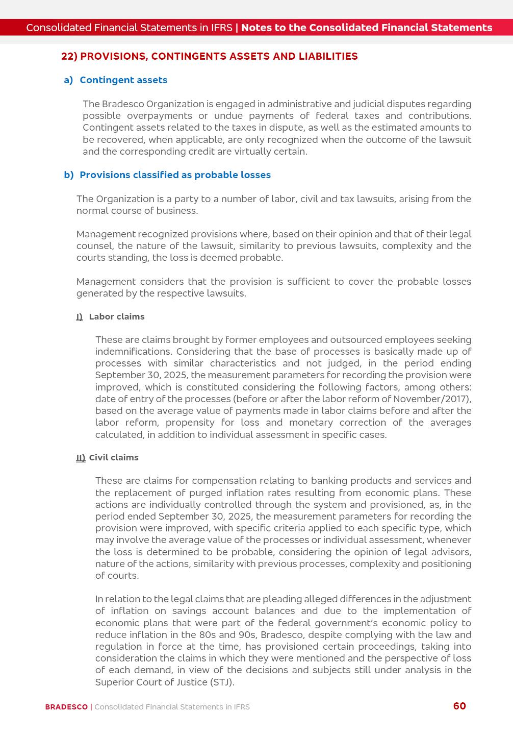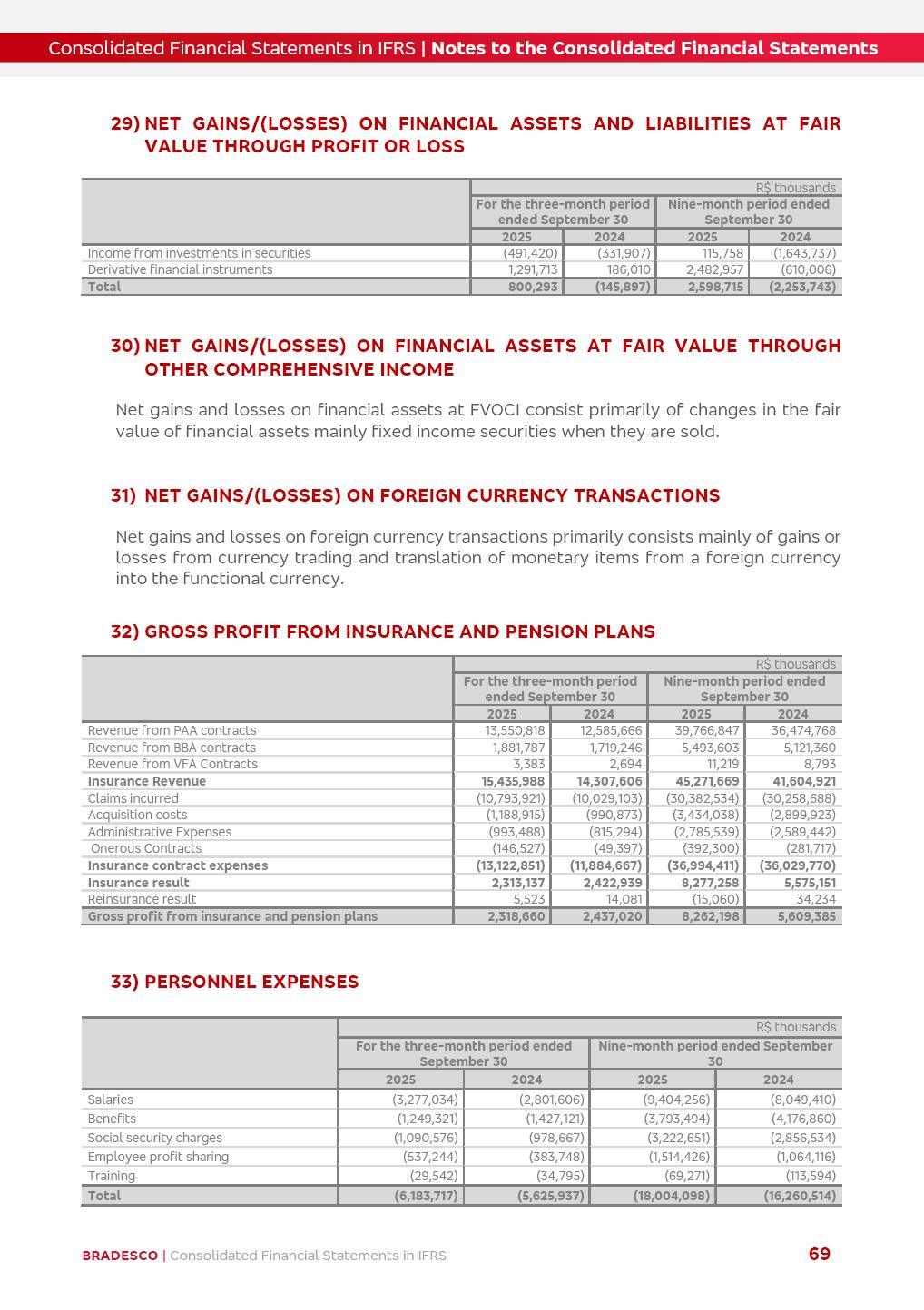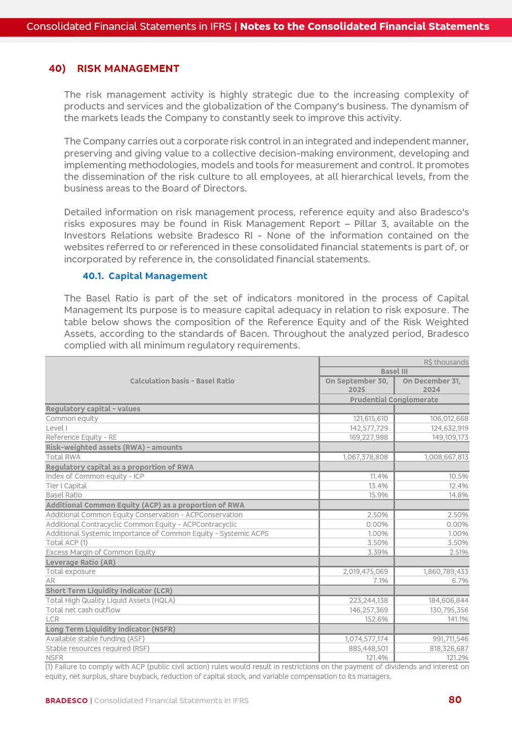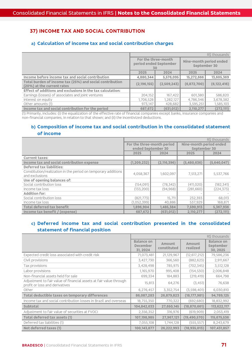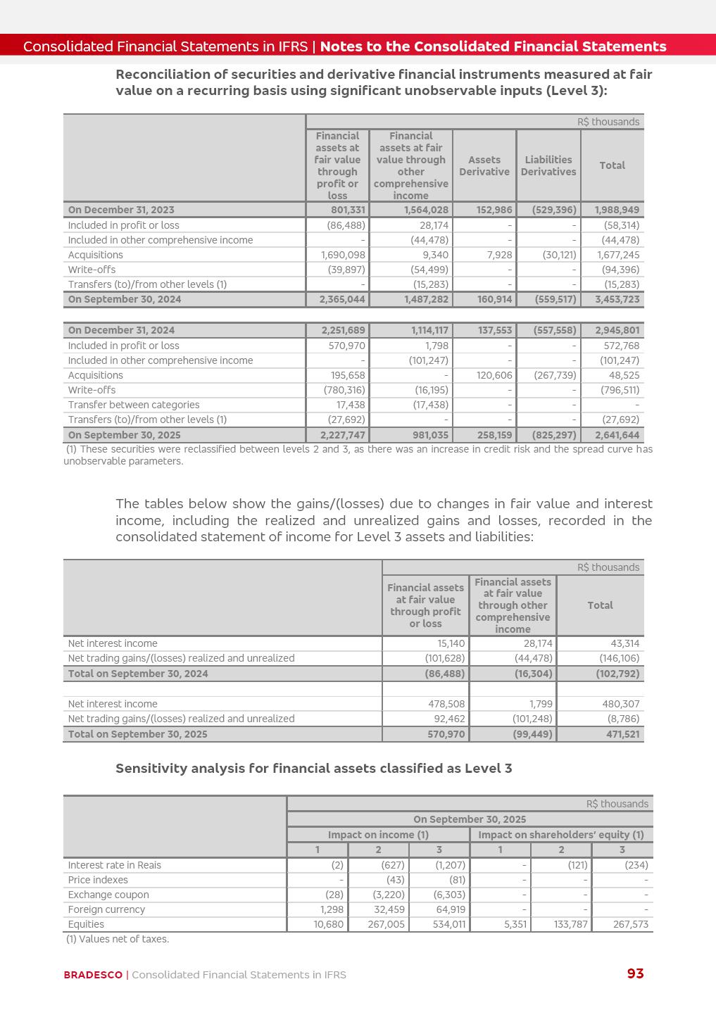 Consolidated Financial Statements 3Q25 in accordance with International Financial Reporting Standards (IFRS) issued by the International Accounting Standards Boards (IASB) Management Report BRADESCO | Management Report | Consolidated Financial Statements in IFRS 2 Dear Shareholders, We hereby present the Consolidated Financial Statements of Banco Bradesco S.A. related to the first nine months of 2025. We follow all International Financial Reporting Standards (IFRS) practices issued by the International Accounting Standards Board (IASB). Economic Comment The Brazilian economy showed mixed signals in the last quarter. On the one hand, there is already a slowdown in some sectors. On the other hand, the labor market remains heated, sustaining the dynamism of consumption. This accommodation is expected to intensify in the coming months, reflecting the Selic rate and the reduction of the fiscal momentum in the year. Our projections indicate that the GDP should grow 2.0% in 2025. The Central Bank of Brazil halted the rate hike cycle, after bringing the Selic rate to 15%. Although inflation expectations and the current inflation are still above expectation, there are signs of price decompression. We believe that inflation will continue to slow down in the coming months, favored by the accommodation of economic activity, the appreciation of the real against the dollar and the fall in cost inflation. This will allow the Central Bank of Brazil to start cutting the basic interest rate at the beginning of 2026. Uncertainties remain high on the international scene. The North-American economic policy represents the main vector of uncertainty for the performance of the global economy, also representing structural pressure on the dollar. This context is aggravated by the intensification of geopolitical disputes around the world. Highlights in the period In July 2025, Banco Bradesco S.A. (“Bradesco”) noticed to its shareholders and to the market in general the relevant fact that revised the Guidance for 2025, in compliance with Paragraph 4 of article 157 of Law No. 6,404/76 and CVM Resolution No. 44/21, increasing the projection of the Fee and Commission Income from “4% to 8%” to “5% to 9%” and the projection of the Income from Insurance, Pension Plans and Capitalization Operations from “6% to 10%” to “9% to 13%”. In September 2025, Bradesco disclosed to its shareholders and to the market in general that Atlântica Hospitais e Participações S.A. (an indirect subsidiary), firmed an Investment Agreement with the Rede D’Or São Luiz S.A. group (“Rede D’Or”) for the inclusion of Hospital Glória D’Or in the Atlântica D’Or hospital network, thus expanding the partnership signed with Rede D’Or, disclosed to the market on May 8 and November 1, 2024, retaining the existing corporate shareholding, with the 50.01% stake for Rede D’Or and 49.99% stake for Atlântica. It also informed that the expansion of the partnership is aligned with the strategy of Atlântica to invest in the health sector value chain through partnerships with players established in the operation of the hospitals. Finally, in September 2025, Bradesco approved, at a meeting of the Board of Directors, the proposal of the Board of Executive Officers to pay interest on intermediate equity, in the total amount of R$3,000,000,000.00, i.e. R$0.270146729 per common share and R$0.297161402 per preferred share, whose payment will be made by April 30, 2026. BRADESCO | Management Report | Consolidated Financial Statements in IFRS 3 . highlighted information 9M25 TOTAL DEPOSITS (Sept25 vs. Sept24) R$667.1 bi (+8.2%) R$17.4 bi R$175.6 bi +5.1% y/y EARNINGS PER SHARE BOOK VALUE PER SHARE BOOK NET INCOME R$1.54 common R$1.70 preferred R$16.61 SHAREHOLDERS’ EQUITY (1) MARKET VALUE TIER I CAPITAL R$174.1 bi 13.4% SECURITIES (Sept25 vs. Sept24) R$832.7 bi (+11.4%) FVPL: R$454.6 bi (+31.4%) FVOCI: R$125.7 bi (-45.4%) Amortized Cost: R$252.4 bi (+47.4%) EXPANDED LOAN PORTFOLIO (Sept25 vs. Sept24) R$1,034.2 bi (+9.6%) INDIVIDUALS: R$451.6 bi (+13.8%) COMPANIES: R$582.7 bi (+6.5%) ALLOWANCE FOR EXPANDED LOANS (Sept25 vs. Sept24) R$55.9 bi (stable) INTEREST ON SHAREHOLDERS’ EQUITY R$10.6 bi (gross) +30.4% y/y (1) Equity attributable to shareholders of the parente. +0.7% y/y BRADESCO | Management Report | Consolidated Financial Statements in IFRS 4 Technology and innovation Bradesco’s digital transformation continues at an accelerated pace, consolidating technology as a strategic pillar to generate value for clients and the business. Guided by the Customer-centricity pillars, AI First, Business Acceleration and Efficiency, we continue to develop customized, secure and efficient digital solutions, anticipating data and behavior-based needs. The Bridge platform, which democratizes the use of generative AI for developers and business areas, continues to expand use cases with simplified integration and scalability, re-leveraging already built services. This evolution allows innovative solutions to reach the market faster, reinforcing our positioning in artificial intelligence. We are going beyond the AI First concept, we want to be technologically AI Ready and advance in the ambition to become an AI Powered bank, with practical applications that increase productivity, hyperpersonalization of experiences, with robust governance, security, risk monitoring and client engagement. Artificial intelligence has also been consolidated as a driver of productivity and experience. BIA Clientes with Generative AI is already available for 100% of the clients, with 87% resolution in the chat and integration in journeys like Pix Inteligente (Smart Pix) on WhatsApp. BIA Corporativa supports 100% of employees, with more than 2 million interactions supporting the search for content and responses. BIA Tech drives the development cycle with 64% more efficiency in writing stories, +80 thousand stories evaluated with GenAI, thousands of automatic code 