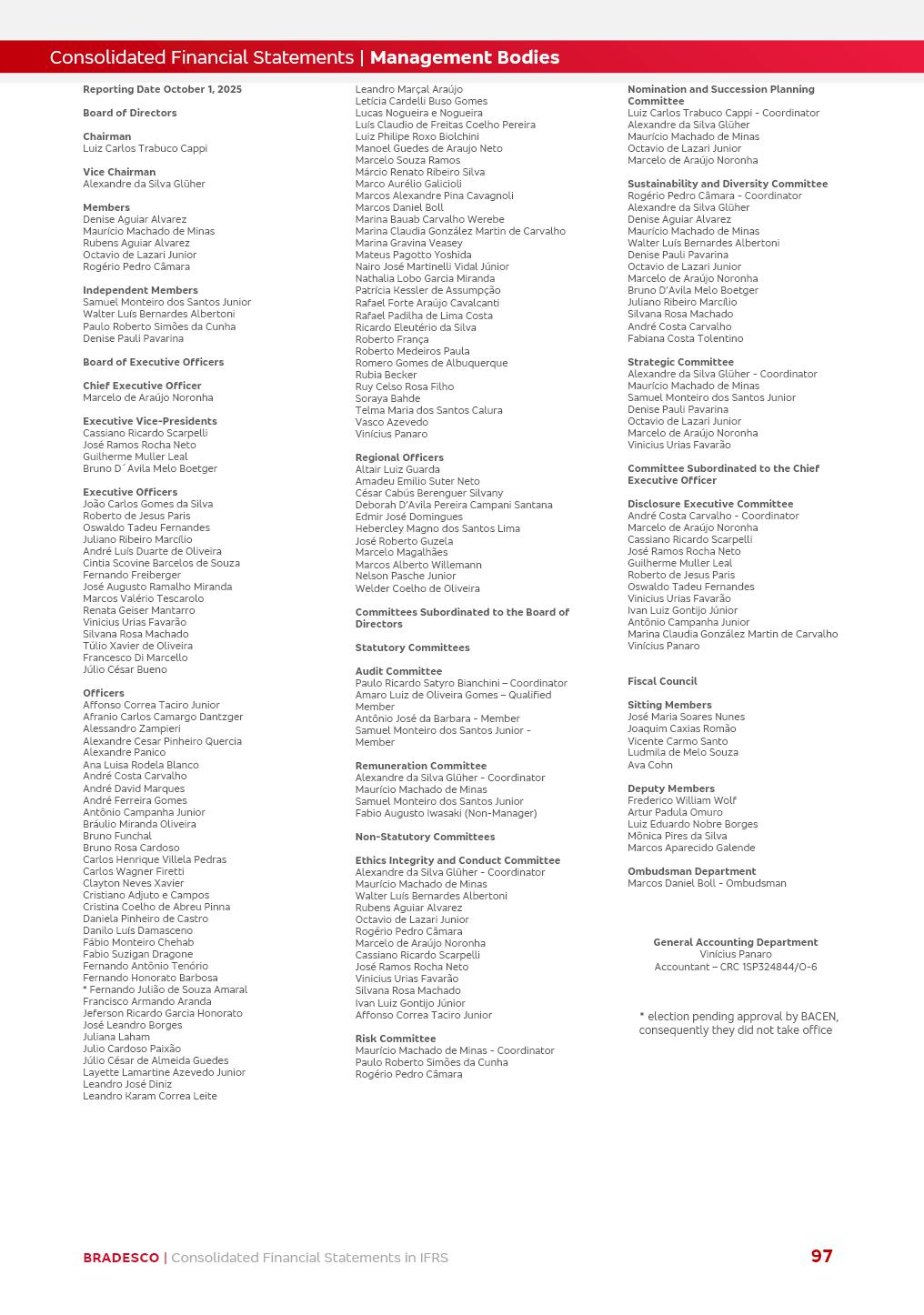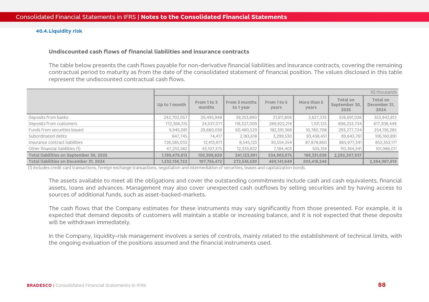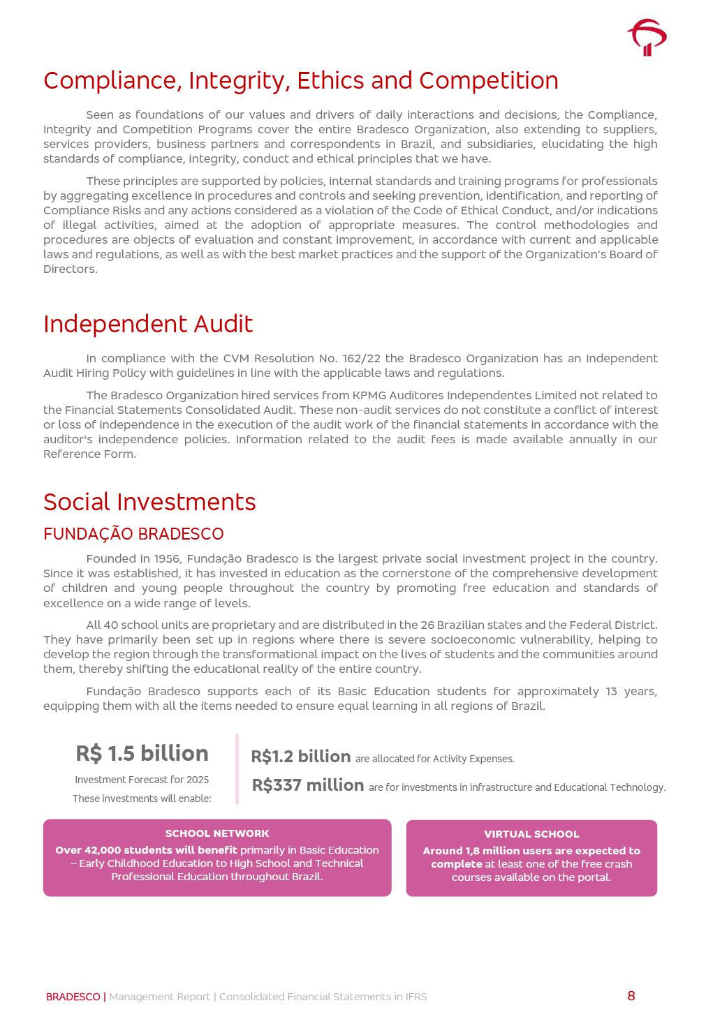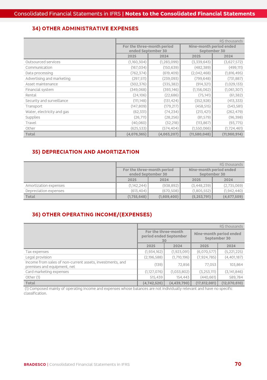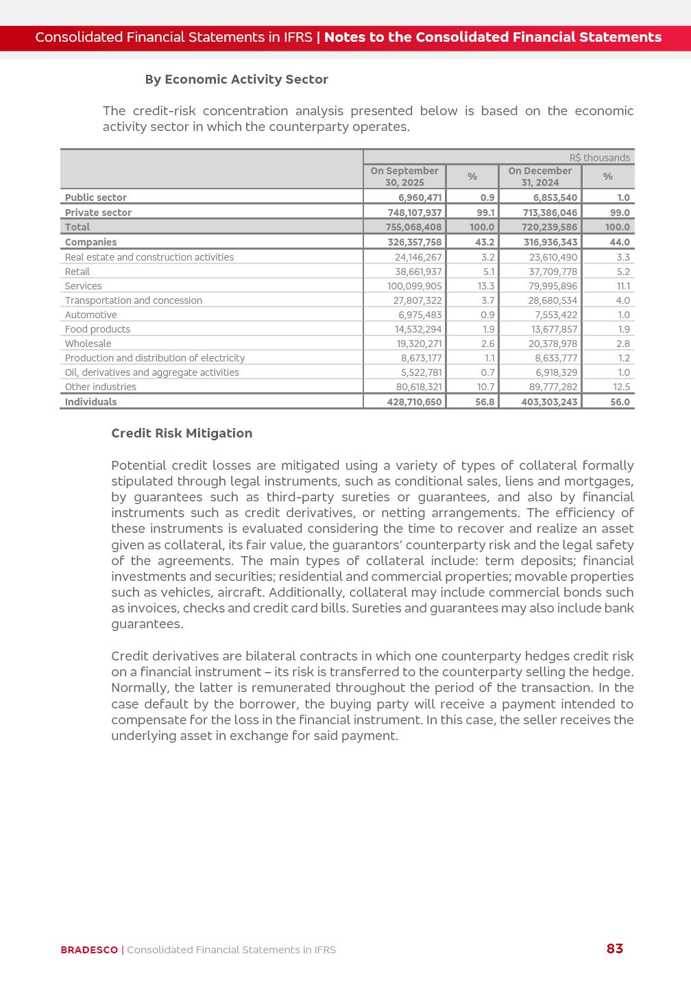 Consolidated Financial Statements 3Q25 in accordance with International Financial Reporting Standards (IFRS) issued by the International Accounting Standards Boards (IASB) Management Report BRADESCO | Management Report | Consolidated Financial Statements in IFRS 2 Dear Shareholders, We hereby present the Consolidated Financial Statements of Banco Bradesco S.A. related to the first nine months of 2025. We follow all International Financial Reporting Standards (IFRS) practices issued by the International Accounting Standards Board (IASB). Economic Comment The Brazilian economy showed mixed signals in the last quarter. On the one hand, there is already a slowdown in some sectors. On the other hand, the labor market remains heated, sustaining the dynamism of consumption. This accommodation is expected to intensify in the coming months, reflecting the Selic rate and the reduction of the fiscal momentum in the year. Our projections indicate that the GDP should grow 2.0% in 2025. The Central Bank of Brazil halted the rate hike cycle, after bringing the Selic rate to 15%. Although inflation expectations and the current inflation are still above expectation, there are signs of price decompression. We believe that inflation will continue to slow down in the coming months, favored by the accommodation of economic activity, the appreciation of the real against the dollar and the fall in cost inflation. This will allow the Central Bank of Brazil to start cutting the basic interest rate at the beginning of 2026. Uncertainties remain high on the international scene. The North-American economic policy represents the main vector of uncertainty for the performance of the global economy, also representing structural pressure on the dollar. This context is aggravated by the intensification of geopolitical disputes around the world. Highlights in the period In July 2025, Banco Bradesco S.A. (“Bradesco”) noticed to its shareholders and to the market in general the relevant fact that revised the Guidance for 2025, in compliance with Paragraph 4 of article 157 of Law No. 6,404/76 and CVM Resolution No. 44/21, increasing the projection of the Fee and Commission Income from “4% to 8%” to “5% to 9%” and the projection of the Income from Insurance, Pension Plans and Capitalization Operations from “6% to 10%” to “9% to 13%”. In September 2025, Bradesco disclosed to its shareholders and to the market in general that Atlântica Hospitais e Participações S.A. (an indirect subsidiary), firmed an Investment Agreement with the Rede D’Or São Luiz S.A. group (“Rede D’Or”) for the inclusion of Hospital Glória D’Or in the Atlântica D’Or hospital network, thus expanding the partnership signed with Rede D’Or, disclosed to the market on May 8 and November 1, 2024, retaining the existing corporate shareholding, with the 50.01% stake for Rede D’Or and 49.99% stake for Atlântica. It also informed that the expansion of the partnership is aligned with the strategy of Atlântica to invest in the health sector value chain through partnerships with players established in the operation of the hospitals. Finally, in September 2025, Bradesco approved, at a meeting of the Board of Directors, the proposal of the Board of Executive Officers to pay interest on intermediate equity, in the total amount of R$3,000,000,000.00, i.e. R$0.270146729 per common share and R$0.297161402 per preferred share, whose payment will be made by April 30, 2026. BRADESCO | Management Report | Consolidated Financial Statements in IFRS 3 . highlighted information 9M25 TOTAL DEPOSITS (Sept25 vs. Sept24) R$667.1 bi (+8.2%) R$17.4 bi R$175.6 bi +5.1% y/y EARNINGS PER SHARE BOOK VALUE PER SHARE BOOK NET INCOME R$1.54 common R$1.70 preferred R$16.61 SHAREHOLDERS’ EQUITY (1) MARKET VALUE TIER I CAPITAL R$174.1 bi 13.4% SECURITIES (Sept25 vs. Sept24) R$832.7 bi (+11.4%) FVPL: R$454.6 bi (+31.4%) FVOCI: R$125.7 bi (-45.4%) Amortized Cost: R$252.4 bi (+47.4%) EXPANDED LOAN PORTFOLIO (Sept25 vs. Sept24) R$1,034.2 bi (+9.6%) INDIVIDUALS: R$451.6 bi (+13.8%) COMPANIES: R$582.7 bi (+6.5%) ALLOWANCE FOR EXPANDED LOANS (Sept25 vs. Sept24) R$55.9 bi (stable) INTEREST ON SHAREHOLDERS’ EQUITY R$10.6 bi (gross) +30.4% y/y (1) Equity attributable to shareholders of the parente. +0.7% y/y BRADESCO | Management Report | Consolidated Financial Statements in IFRS 4 Technology and innovation Bradesco’s digital transformation continues at an accelerated pace, consolidating technology as a strategic pillar to generate value for clients and the business. Guided by the Customer-centricity pillars, AI First, Business Acceleration and Efficiency, we continue to develop customized, secure and efficient digital solutions, anticipating data and behavior-based needs. The Bridge platform, which democratizes the use of generative AI for developers and business areas, continues to expand use cases with simplified integration and scalability, re-leveraging already built services. This evolution allows innovative solutions to reach the market faster, reinforcing our positioning in artificial intelligence. We are going beyond the AI First concept, we want to be technologically AI Ready and advance in the ambition to become an AI Powered bank, with practical applications that increase productivity, hyperpersonalization of experiences, with robust governance, security, risk monitoring and client engagement. Artificial intelligence has also been consolidated as a driver of productivity and experience. BIA Clientes with Generative AI is already available for 100% of the clients, with 87% resolution in the chat and integration in journeys like Pix Inteligente (Smart Pix) on WhatsApp. BIA Corporativa supports 100% of employees, with more than 2 million interactions supporting the search for content and responses. BIA Tech drives the development cycle with 64% more efficiency in writing stories, +80 thousand stories evaluated with GenAI, thousands of automatic code 