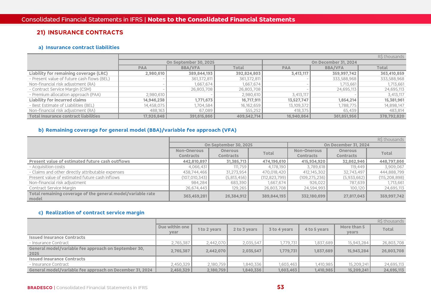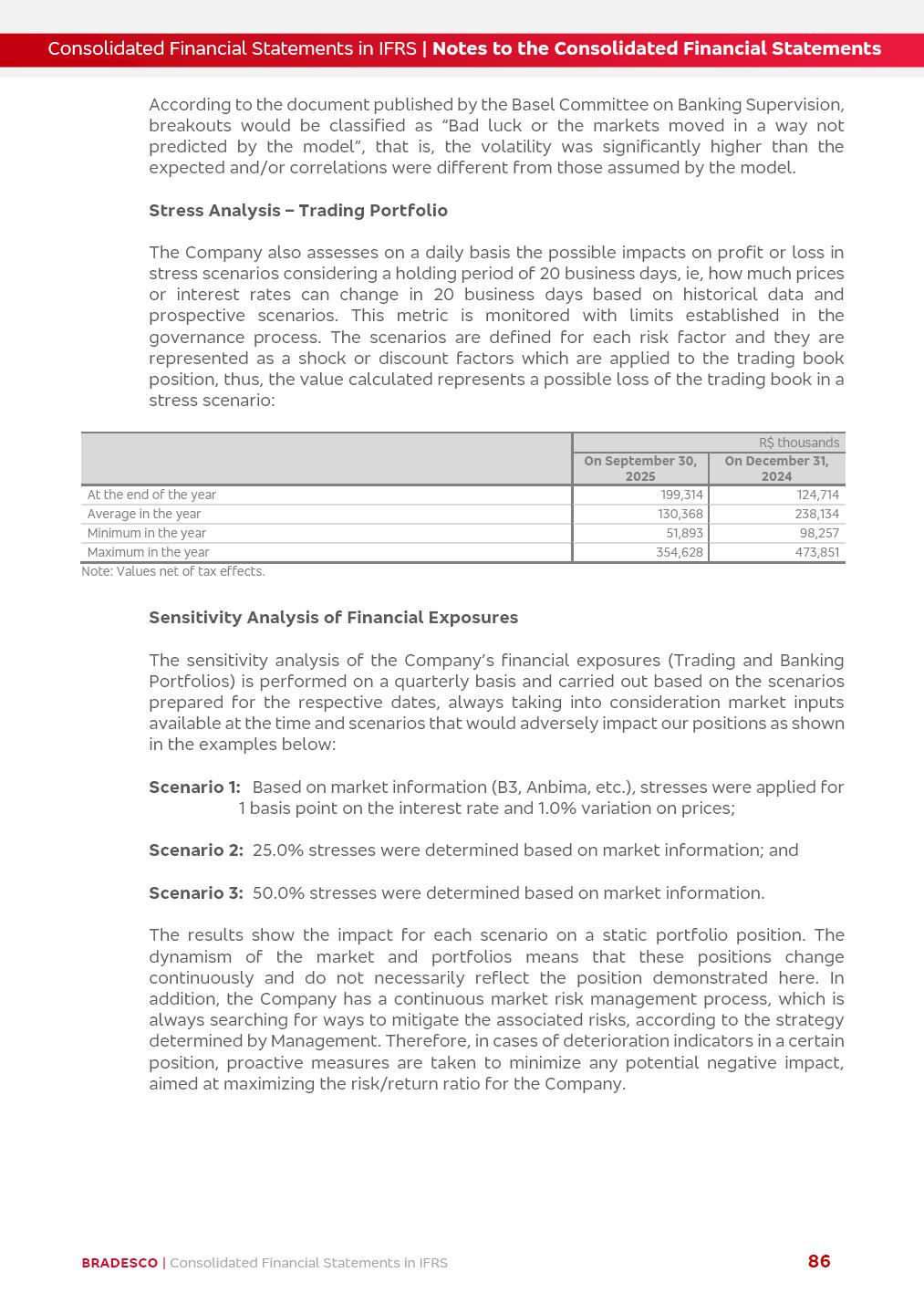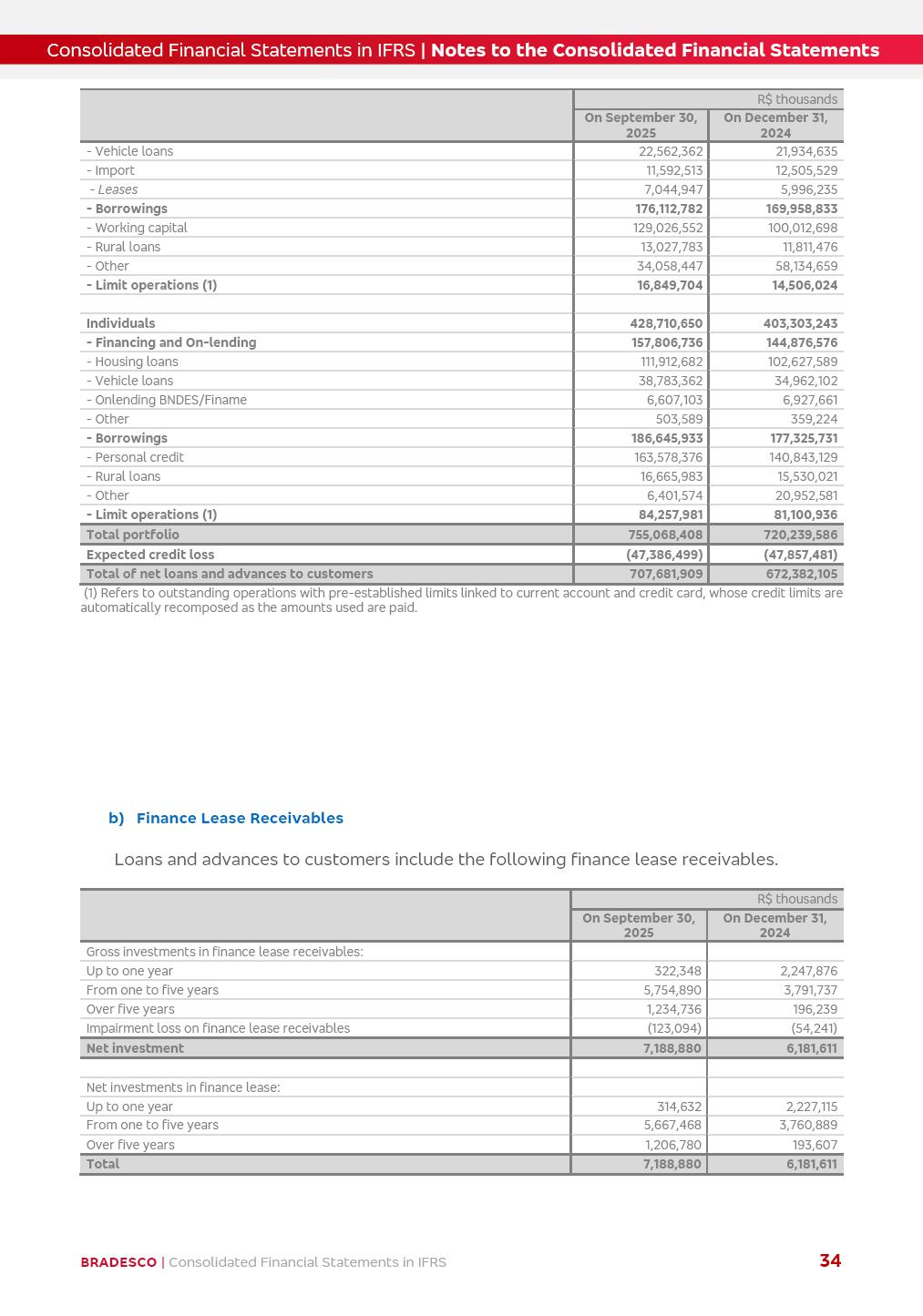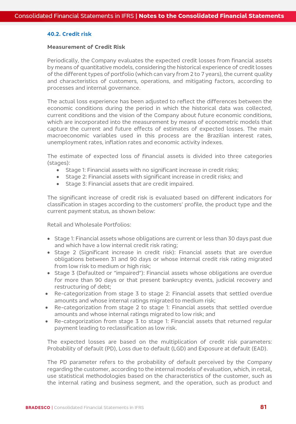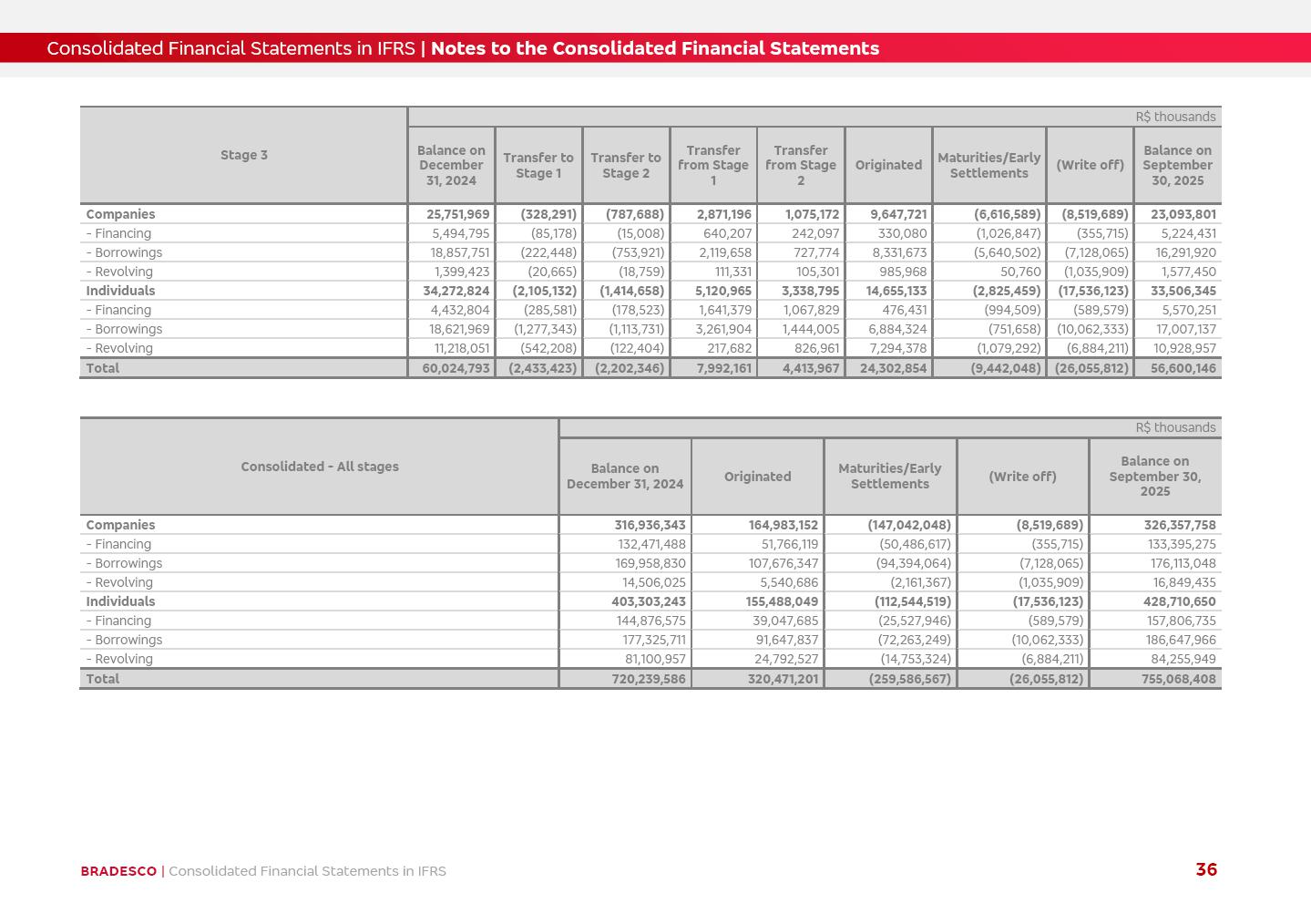 Consolidated Financial Statements 3Q25 in accordance with International Financial Reporting Standards (IFRS) issued by the International Accounting Standards Boards (IASB) Management Report BRADESCO | Management Report | Consolidated Financial Statements in IFRS 2 Dear Shareholders, We hereby present the Consolidated Financial Statements of Banco Bradesco S.A. related to the first nine months of 2025. We follow all International Financial Reporting Standards (IFRS) practices issued by the International Accounting Standards Board (IASB). Economic Comment The Brazilian economy showed mixed signals in the last quarter. On the one hand, there is already a slowdown in some sectors. On the other hand, the labor market remains heated, sustaining the dynamism of consumption. This accommodation is expected to intensify in the coming months, reflecting the Selic rate and the reduction of the fiscal momentum in the year. Our projections indicate that the GDP should grow 2.0% in 2025. The Central Bank of Brazil halted the rate hike cycle, after bringing the Selic rate to 15%. Although inflation expectations and the current inflation are still above expectation, there are signs of price decompression. We believe that inflation will continue to slow down in the coming months, favored by the accommodation of economic activity, the appreciation of the real against the dollar and the fall in cost inflation. This will allow the Central Bank of Brazil to start cutting the basic interest rate at the beginning of 2026. Uncertainties remain high on the international scene. The North-American economic policy represents the main vector of uncertainty for the performance of the global economy, also representing structural pressure on the dollar. This context is aggravated by the intensification of geopolitical disputes around the world. Highlights in the period In July 2025, Banco Bradesco S.A. (“Bradesco”) noticed to its shareholders and to the market in general the relevant fact that revised the Guidance for 2025, in compliance with Paragraph 4 of article 157 of Law No. 6,404/76 and CVM Resolution No. 44/21, increasing the projection of the Fee and Commission Income from “4% to 8%” to “5% to 9%” and the projection of the Income from Insurance, Pension Plans and Capitalization Operations from “6% to 10%” to “9% to 13%”. In September 2025, Bradesco disclosed to its shareholders and to the market in general that Atlântica Hospitais e Participações S.A. (an indirect subsidiary), firmed an Investment Agreement with the Rede D’Or São Luiz S.A. group (“Rede D’Or”) for the inclusion of Hospital Glória D’Or in the Atlântica D’Or hospital network, thus expanding the partnership signed with Rede D’Or, disclosed to the market on May 8 and November 1, 2024, retaining the existing corporate shareholding, with the 50.01% stake for Rede D’Or and 49.99% stake for Atlântica. It also informed that the expansion of the partnership is aligned with the strategy of Atlântica to invest in the health sector value chain through partnerships with players established in the operation of the hospitals. Finally, in September 2025, Bradesco approved, at a meeting of the Board of Directors, the proposal of the Board of Executive Officers to pay interest on intermediate equity, in the total amount of R$3,000,000,000.00, i.e. R$0.270146729 per common share and R$0.297161402 per preferred share, whose payment will be made by April 30, 2026. BRADESCO | Management Report | Consolidated Financial Statements in IFRS 3 . highlighted information 9M25 TOTAL DEPOSITS (Sept25 vs. Sept24) R$667.1 bi (+8.2%) R$17.4 bi R$175.6 bi +5.1% y/y EARNINGS PER SHARE BOOK VALUE PER SHARE BOOK NET INCOME R$1.54 common R$1.70 preferred R$16.61 SHAREHOLDERS’ EQUITY (1) MARKET VALUE TIER I CAPITAL R$174.1 bi 13.4% SECURITIES (Sept25 vs. Sept24) R$832.7 bi (+11.4%) FVPL: R$454.6 bi (+31.4%) FVOCI: R$125.7 bi (-45.4%) Amortized Cost: R$252.4 bi (+47.4%) EXPANDED LOAN PORTFOLIO (Sept25 vs. Sept24) R$1,034.2 bi (+9.6%) INDIVIDUALS: R$451.6 bi (+13.8%) COMPANIES: R$582.7 bi (+6.5%) ALLOWANCE FOR EXPANDED LOANS (Sept25 vs. Sept24) R$55.9 bi (stable) INTEREST ON SHAREHOLDERS’ EQUITY R$10.6 bi (gross) +30.4% y/y (1) Equity attributable to shareholders of the parente. +0.7% y/y BRADESCO | Management Report | Consolidated Financial Statements in IFRS 4 Technology and innovation Bradesco’s digital transformation continues at an accelerated pace, consolidating technology as a strategic pillar to generate value for clients and the business. Guided by the Customer-centricity pillars, AI First, Business Acceleration and Efficiency, we continue to develop customized, secure and efficient digital solutions, anticipating data and behavior-based needs. The Bridge platform, which democratizes the use of generative AI for developers and business areas, continues to expand use cases with simplified integration and scalability, re-leveraging already built services. This evolution allows innovative solutions to reach the market faster, reinforcing our positioning in artificial intelligence. We are going beyond the AI First concept, we want to be technologically AI Ready and advance in the ambition to become an AI Powered bank, with practical applications that increase productivity, hyperpersonalization of experiences, with robust governance, security, risk monitoring and client engagement. Artificial intelligence has also been consolidated as a driver of productivity and experience. BIA Clientes with Generative AI is already available for 100% of the clients, with 87% resolution in the chat and integration in journeys like Pix Inteligente (Smart Pix) on WhatsApp. BIA Corporativa supports 100% of employees, with more than 2 million interactions supporting the search for content and responses. BIA Tech drives the development cycle with 64% more efficiency in writing stories, +80 thousand stories evaluated with GenAI, thousands of automatic code 