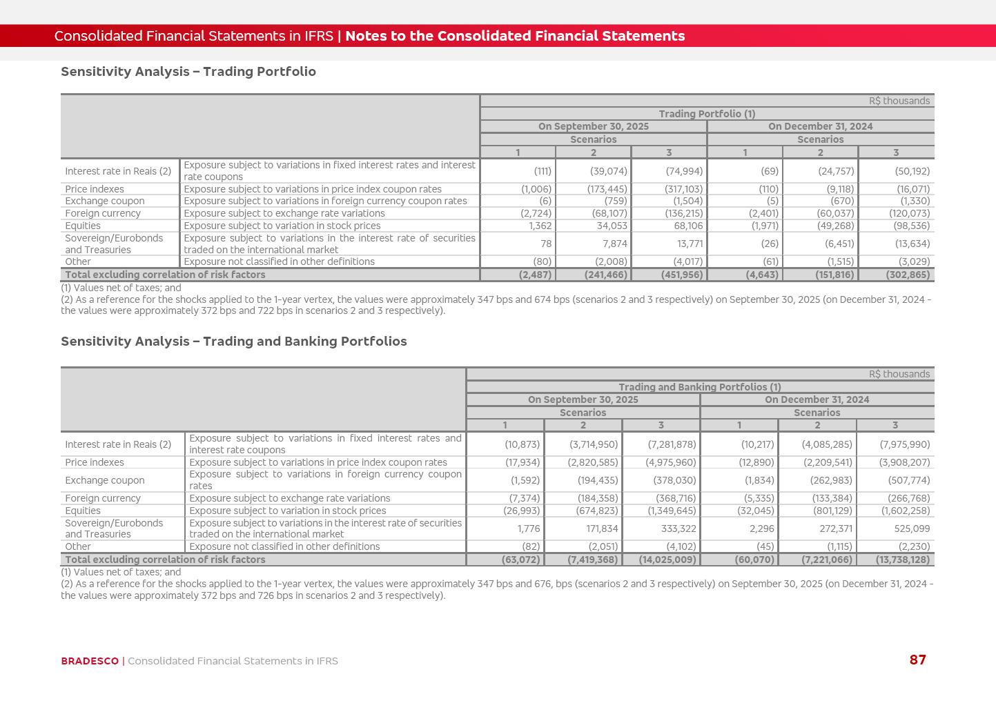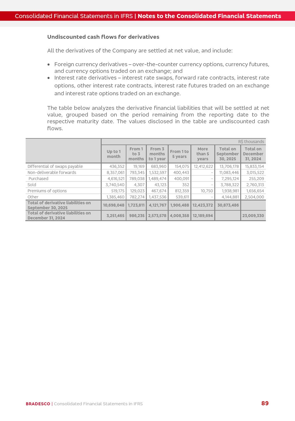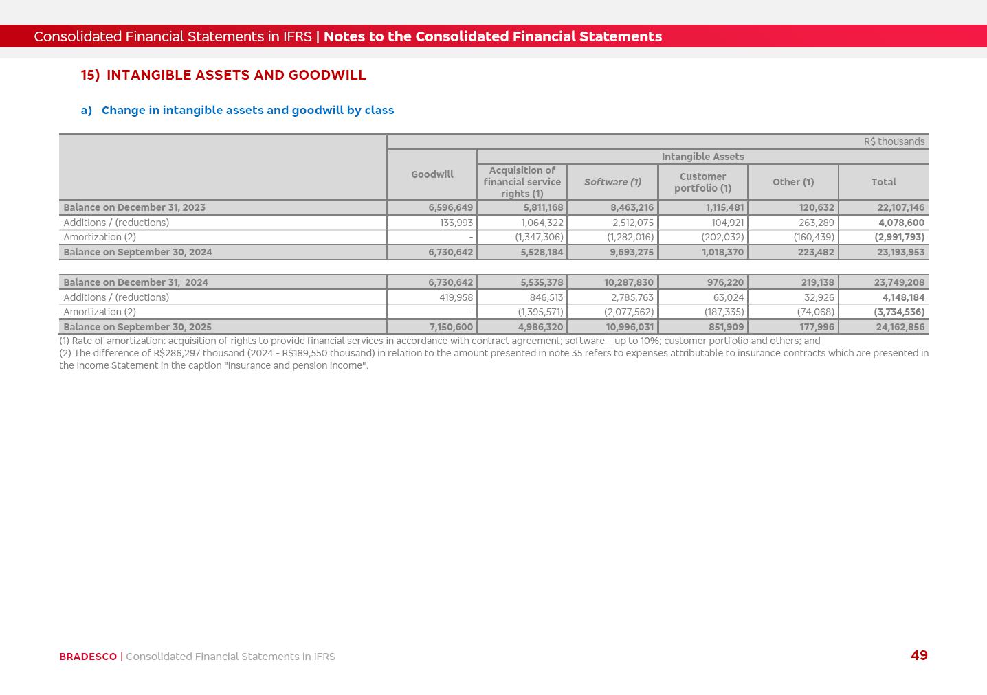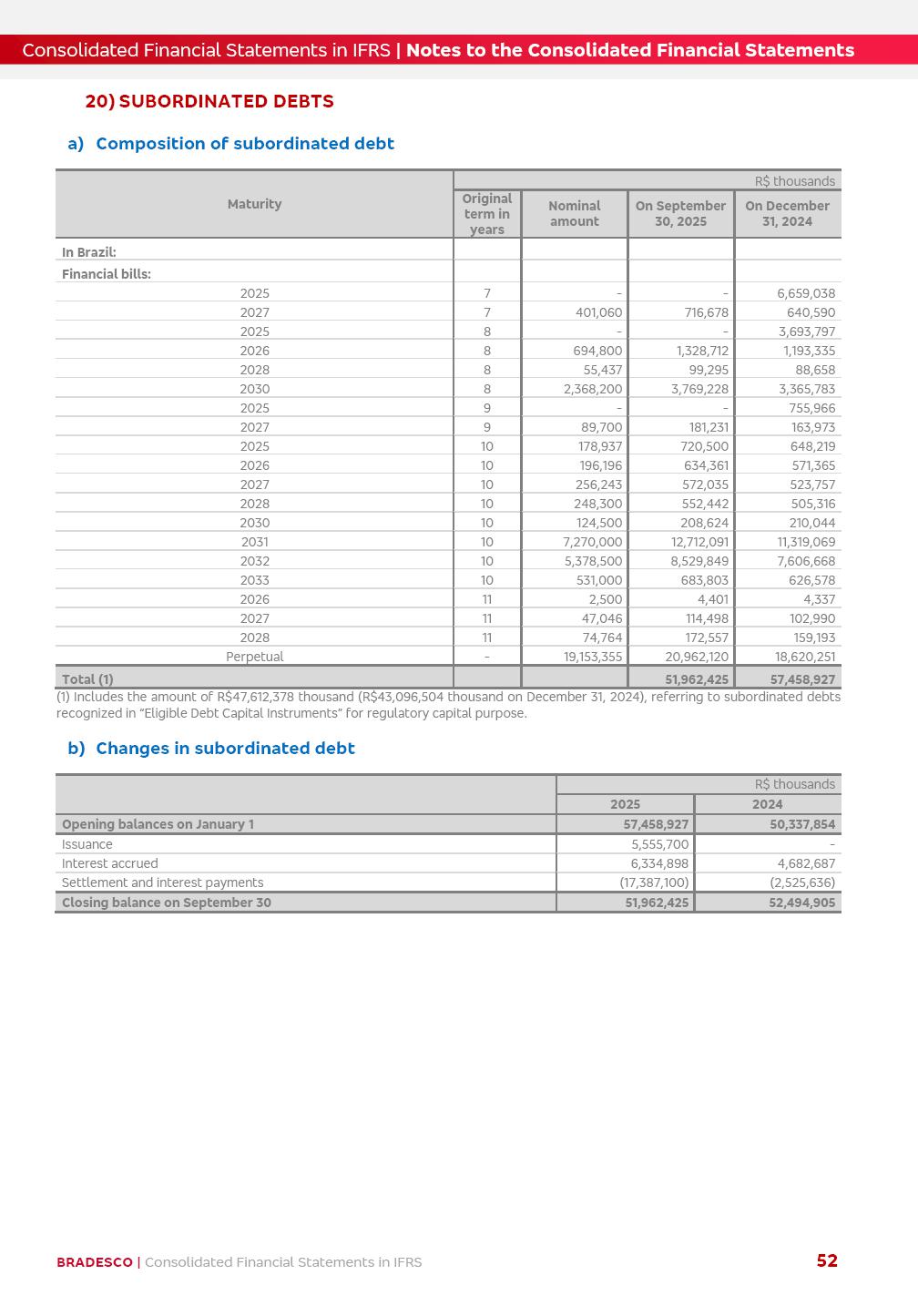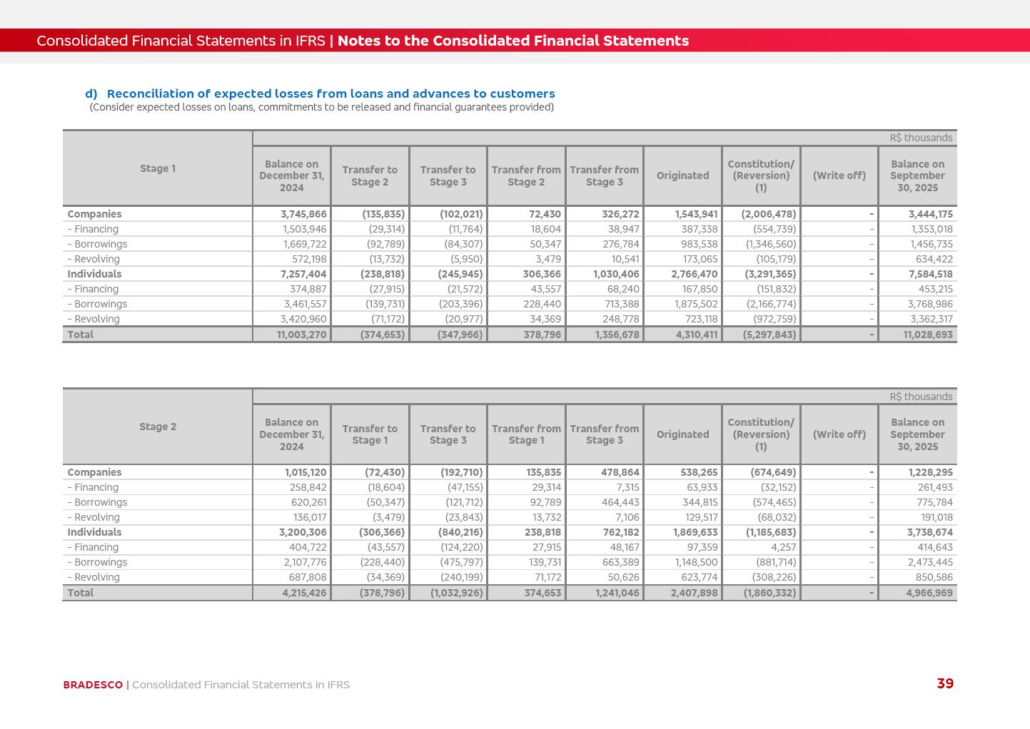 Consolidated Financial Statements 3Q25 in accordance with International Financial Reporting Standards (IFRS) issued by the International Accounting Standards Boards (IASB) Management Report BRADESCO | Management Report | Consolidated Financial Statements in IFRS 2 Dear Shareholders, We hereby present the Consolidated Financial Statements of Banco Bradesco S.A. related to the first nine months of 2025. We follow all International Financial Reporting Standards (IFRS) practices issued by the International Accounting Standards Board (IASB). Economic Comment The Brazilian economy showed mixed signals in the last quarter. On the one hand, there is already a slowdown in some sectors. On the other hand, the labor market remains heated, sustaining the dynamism of consumption. This accommodation is expected to intensify in the coming months, reflecting the Selic rate and the reduction of the fiscal momentum in the year. Our projections indicate that the GDP should grow 2.0% in 2025. The Central Bank of Brazil halted the rate hike cycle, after bringing the Selic rate to 15%. Although inflation expectations and the current inflation are still above expectation, there are signs of price decompression. We believe that inflation will continue to slow down in the coming months, favored by the accommodation of economic activity, the appreciation of the real against the dollar and the fall in cost inflation. This will allow the Central Bank of Brazil to start cutting the basic interest rate at the beginning of 2026. Uncertainties remain high on the international scene. The North-American economic policy represents the main vector of uncertainty for the performance of the global economy, also representing structural pressure on the dollar. This context is aggravated by the intensification of geopolitical disputes around the world. Highlights in the period In July 2025, Banco Bradesco S.A. (“Bradesco”) noticed to its shareholders and to the market in general the relevant fact that revised the Guidance for 2025, in compliance with Paragraph 4 of article 157 of Law No. 6,404/76 and CVM Resolution No. 44/21, increasing the projection of the Fee and Commission Income from “4% to 8%” to “5% to 9%” and the projection of the Income from Insurance, Pension Plans and Capitalization Operations from “6% to 10%” to “9% to 13%”. In September 2025, Bradesco disclosed to its shareholders and to the market in general that Atlântica Hospitais e Participações S.A. (an indirect subsidiary), firmed an Investment Agreement with the Rede D’Or São Luiz S.A. group (“Rede D’Or”) for the inclusion of Hospital Glória D’Or in the Atlântica D’Or hospital network, thus expanding the partnership signed with Rede D’Or, disclosed to the market on May 8 and November 1, 2024, retaining the existing corporate shareholding, with the 50.01% stake for Rede D’Or and 49.99% stake for Atlântica. It also informed that the expansion of the partnership is aligned with the strategy of Atlântica to invest in the health sector value chain through partnerships with players established in the operation of the hospitals. Finally, in September 2025, Bradesco approved, at a meeting of the Board of Directors, the proposal of the Board of Executive Officers to pay interest on intermediate equity, in the total amount of R$3,000,000,000.00, i.e. R$0.270146729 per common share and R$0.297161402 per preferred share, whose payment will be made by April 30, 2026. BRADESCO | Management Report | Consolidated Financial Statements in IFRS 3 . highlighted information 9M25 TOTAL DEPOSITS (Sept25 vs. Sept24) R$667.1 bi (+8.2%) R$17.4 bi R$175.6 bi +5.1% y/y EARNINGS PER SHARE BOOK VALUE PER SHARE BOOK NET INCOME R$1.54 common R$1.70 preferred R$16.61 SHAREHOLDERS’ EQUITY (1) MARKET VALUE TIER I CAPITAL R$174.1 bi 13.4% SECURITIES (Sept25 vs. Sept24) R$832.7 bi (+11.4%) FVPL: R$454.6 bi (+31.4%) FVOCI: R$125.7 bi (-45.4%) Amortized Cost: R$252.4 bi (+47.4%) EXPANDED LOAN PORTFOLIO (Sept25 vs. Sept24) R$1,034.2 bi (+9.6%) INDIVIDUALS: R$451.6 bi (+13.8%) COMPANIES: R$582.7 bi (+6.5%) ALLOWANCE FOR EXPANDED LOANS (Sept25 vs. Sept24) R$55.9 bi (stable) INTEREST ON SHAREHOLDERS’ EQUITY R$10.6 bi (gross) +30.4% y/y (1) Equity attributable to shareholders of the parente. +0.7% y/y BRADESCO | Management Report | Consolidated Financial Statements in IFRS 4 Technology and innovation Bradesco’s digital transformation continues at an accelerated pace, consolidating technology as a strategic pillar to generate value for clients and the business. Guided by the Customer-centricity pillars, AI First, Business Acceleration and Efficiency, we continue to develop customized, secure and efficient digital solutions, anticipating data and behavior-based needs. The Bridge platform, which democratizes the use of generative AI for developers and business areas, continues to expand use cases with simplified integration and scalability, re-leveraging already built services. This evolution allows innovative solutions to reach the market faster, reinforcing our positioning in artificial intelligence. We are going beyond the AI First concept, we want to be technologically AI Ready and advance in the ambition to become an AI Powered bank, with practical applications that increase productivity, hyperpersonalization of experiences, with robust governance, security, risk monitoring and client engagement. Artificial intelligence has also been consolidated as a driver of productivity and experience. BIA Clientes with Generative AI is already available for 100% of the clients, with 87% resolution in the chat and integration in journeys like Pix Inteligente (Smart Pix) on WhatsApp. BIA Corporativa supports 100% of employees, with more than 2 million interactions supporting the search for content and responses. BIA Tech drives the development cycle with 64% more efficiency in writing stories, +80 thousand stories evaluated with GenAI, thousands of automatic code 