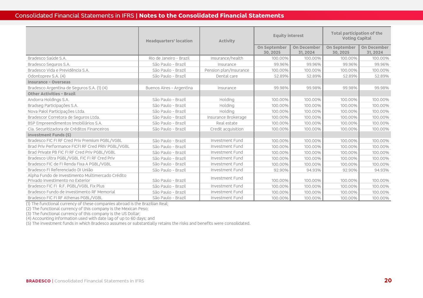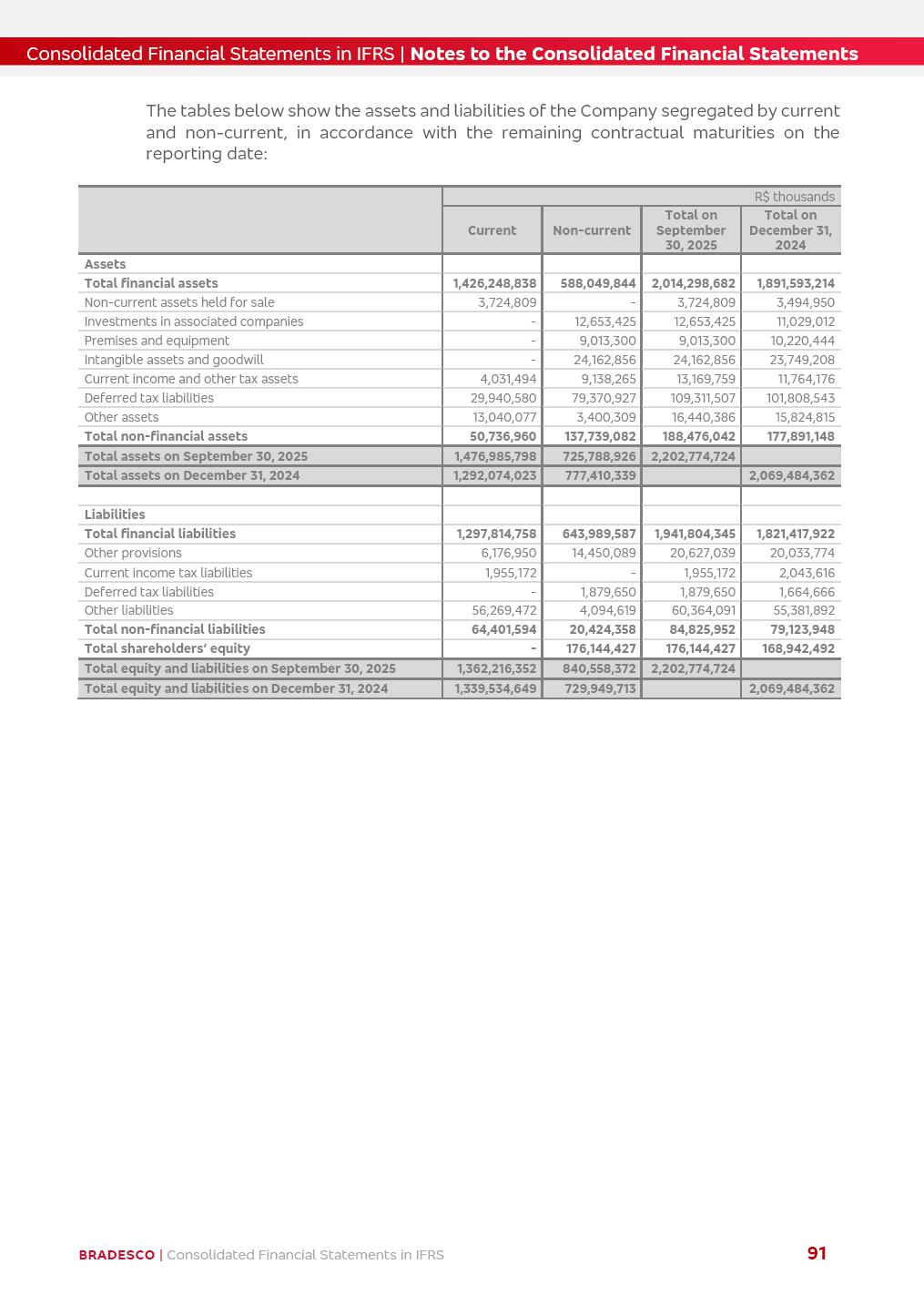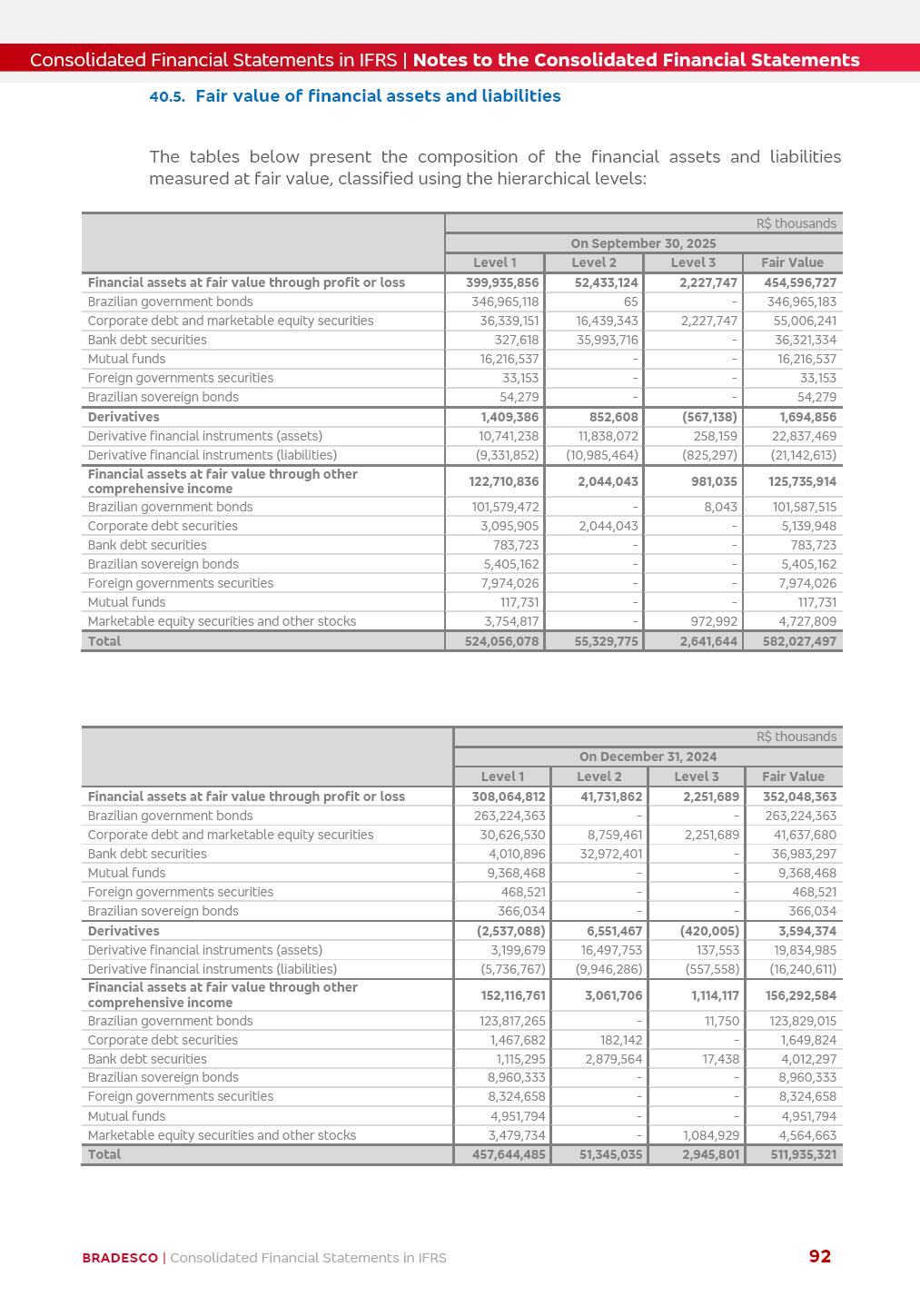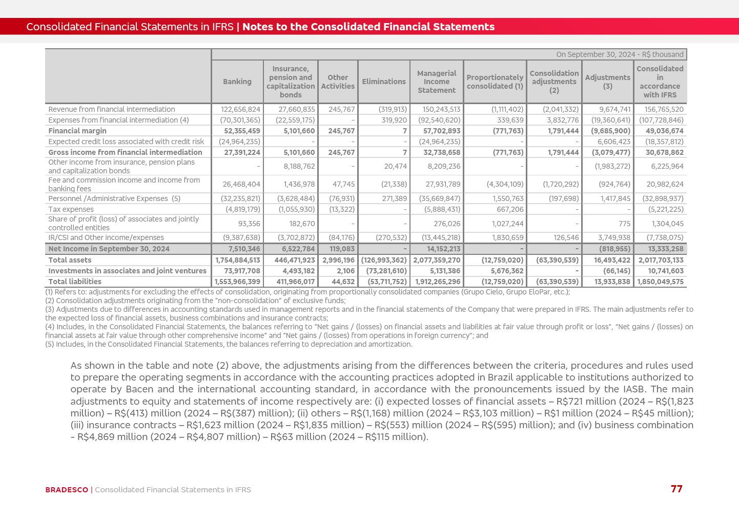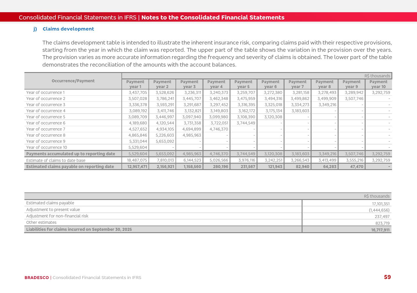 Consolidated Financial Statements 3Q25 in accordance with International Financial Reporting Standards (IFRS) issued by the International Accounting Standards Boards (IASB) Management Report BRADESCO | Management Report | Consolidated Financial Statements in IFRS 2 Dear Shareholders, We hereby present the Consolidated Financial Statements of Banco Bradesco S.A. related to the first nine months of 2025. We follow all International Financial Reporting Standards (IFRS) practices issued by the International Accounting Standards Board (IASB). Economic Comment The Brazilian economy showed mixed signals in the last quarter. On the one hand, there is already a slowdown in some sectors. On the other hand, the labor market remains heated, sustaining the dynamism of consumption. This accommodation is expected to intensify in the coming months, reflecting the Selic rate and the reduction of the fiscal momentum in the year. Our projections indicate that the GDP should grow 2.0% in 2025. The Central Bank of Brazil halted the rate hike cycle, after bringing the Selic rate to 15%. Although inflation expectations and the current inflation are still above expectation, there are signs of price decompression. We believe that inflation will continue to slow down in the coming months, favored by the accommodation of economic activity, the appreciation of the real against the dollar and the fall in cost inflation. This will allow the Central Bank of Brazil to start cutting the basic interest rate at the beginning of 2026. Uncertainties remain high on the international scene. The North-American economic policy represents the main vector of uncertainty for the performance of the global economy, also representing structural pressure on the dollar. This context is aggravated by the intensification of geopolitical disputes around the world. Highlights in the period In July 2025, Banco Bradesco S.A. (“Bradesco”) noticed to its shareholders and to the market in general the relevant fact that revised the Guidance for 2025, in compliance with Paragraph 4 of article 157 of Law No. 6,404/76 and CVM Resolution No. 44/21, increasing the projection of the Fee and Commission Income from “4% to 8%” to “5% to 9%” and the projection of the Income from Insurance, Pension Plans and Capitalization Operations from “6% to 10%” to “9% to 13%”. In September 2025, Bradesco disclosed to its shareholders and to the market in general that Atlântica Hospitais e Participações S.A. (an indirect subsidiary), firmed an Investment Agreement with the Rede D’Or São Luiz S.A. group (“Rede D’Or”) for the inclusion of Hospital Glória D’Or in the Atlântica D’Or hospital network, thus expanding the partnership signed with Rede D’Or, disclosed to the market on May 8 and November 1, 2024, retaining the existing corporate shareholding, with the 50.01% stake for Rede D’Or and 49.99% stake for Atlântica. It also informed that the expansion of the partnership is aligned with the strategy of Atlântica to invest in the health sector value chain through partnerships with players established in the operation of the hospitals. Finally, in September 2025, Bradesco approved, at a meeting of the Board of Directors, the proposal of the Board of Executive Officers to pay interest on intermediate equity, in the total amount of R$3,000,000,000.00, i.e. R$0.270146729 per common share and R$0.297161402 per preferred share, whose payment will be made by April 30, 2026. BRADESCO | Management Report | Consolidated Financial Statements in IFRS 3 . highlighted information 9M25 TOTAL DEPOSITS (Sept25 vs. Sept24) R$667.1 bi (+8.2%) R$17.4 bi R$175.6 bi +5.1% y/y EARNINGS PER SHARE BOOK VALUE PER SHARE BOOK NET INCOME R$1.54 common R$1.70 preferred R$16.61 SHAREHOLDERS’ EQUITY (1) MARKET VALUE TIER I CAPITAL R$174.1 bi 13.4% SECURITIES (Sept25 vs. Sept24) R$832.7 bi (+11.4%) FVPL: R$454.6 bi (+31.4%) FVOCI: R$125.7 bi (-45.4%) Amortized Cost: R$252.4 bi (+47.4%) EXPANDED LOAN PORTFOLIO (Sept25 vs. Sept24) R$1,034.2 bi (+9.6%) INDIVIDUALS: R$451.6 bi (+13.8%) COMPANIES: R$582.7 bi (+6.5%) ALLOWANCE FOR EXPANDED LOANS (Sept25 vs. Sept24) R$55.9 bi (stable) INTEREST ON SHAREHOLDERS’ EQUITY R$10.6 bi (gross) +30.4% y/y (1) Equity attributable to shareholders of the parente. +0.7% y/y BRADESCO | Management Report | Consolidated Financial Statements in IFRS 4 Technology and innovation Bradesco’s digital transformation continues at an accelerated pace, consolidating technology as a strategic pillar to generate value for clients and the business. Guided by the Customer-centricity pillars, AI First, Business Acceleration and Efficiency, we continue to develop customized, secure and efficient digital solutions, anticipating data and behavior-based needs. The Bridge platform, which democratizes the use of generative AI for developers and business areas, continues to expand use cases with simplified integration and scalability, re-leveraging already built services. This evolution allows innovative solutions to reach the market faster, reinforcing our positioning in artificial intelligence. We are going beyond the AI First concept, we want to be technologically AI Ready and advance in the ambition to become an AI Powered bank, with practical applications that increase productivity, hyperpersonalization of experiences, with robust governance, security, risk monitoring and client engagement. Artificial intelligence has also been consolidated as a driver of productivity and experience. BIA Clientes with Generative AI is already available for 100% of the clients, with 87% resolution in the chat and integration in journeys like Pix Inteligente (Smart Pix) on WhatsApp. BIA Corporativa supports 100% of employees, with more than 2 million interactions supporting the search for content and responses. BIA Tech drives the development cycle with 64% more efficiency in writing stories, +80 thousand stories evaluated with GenAI, thousands of automatic code 