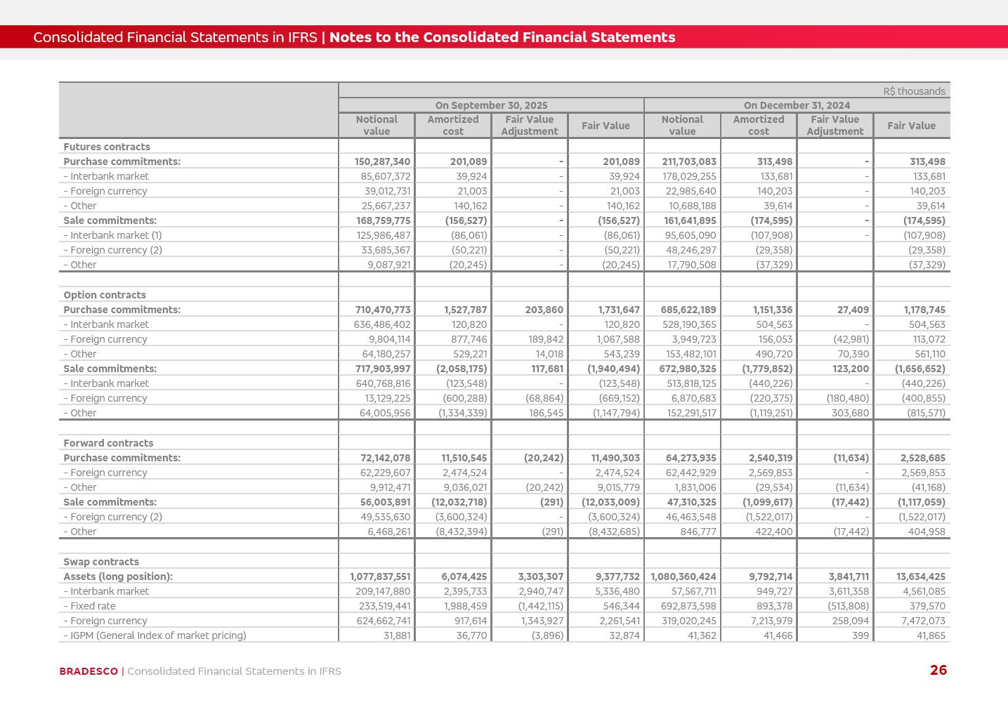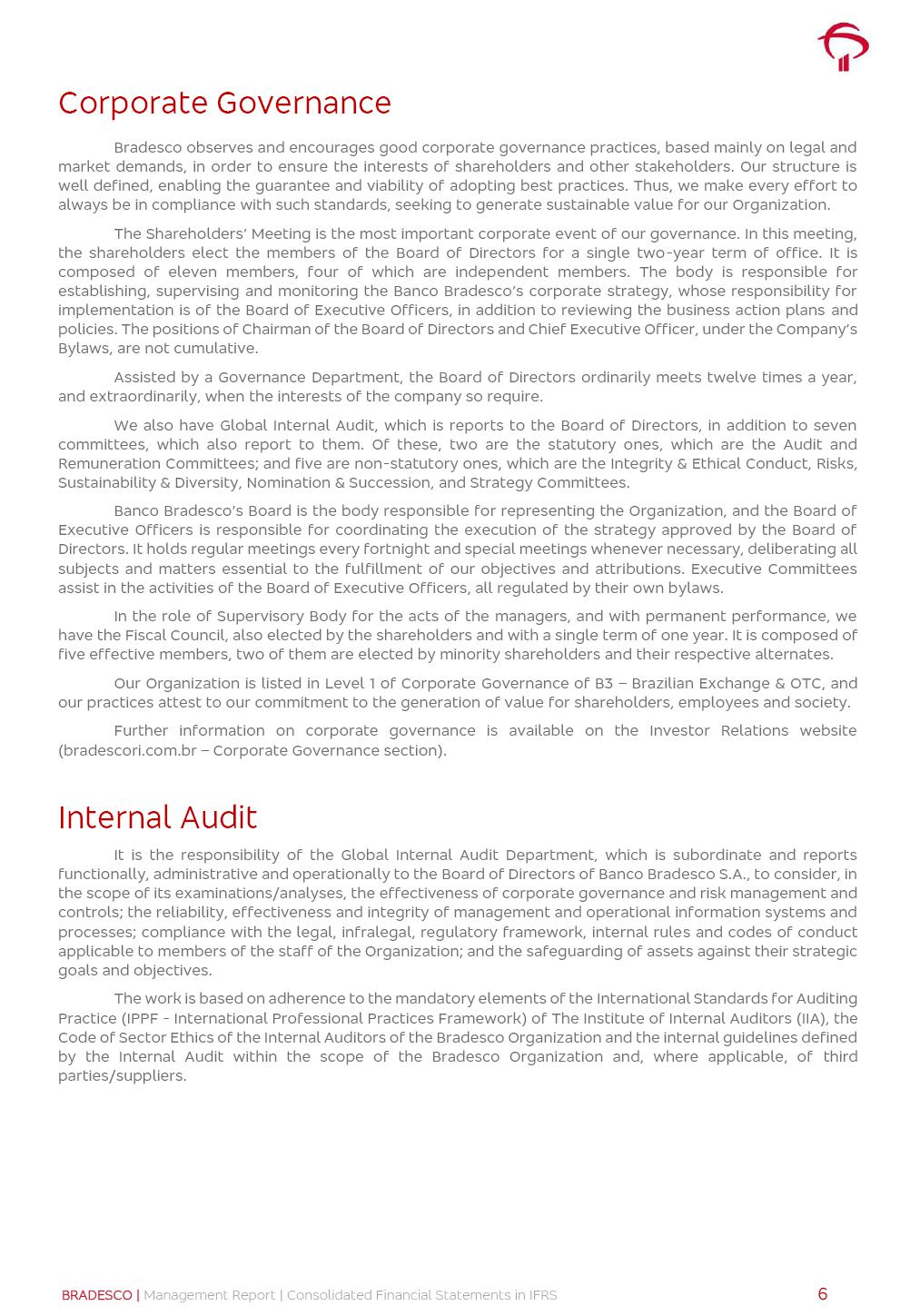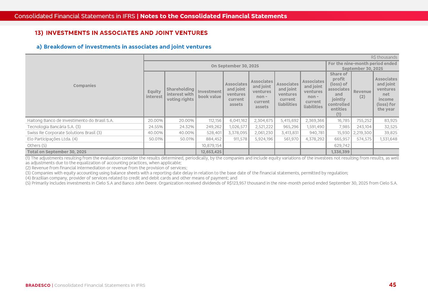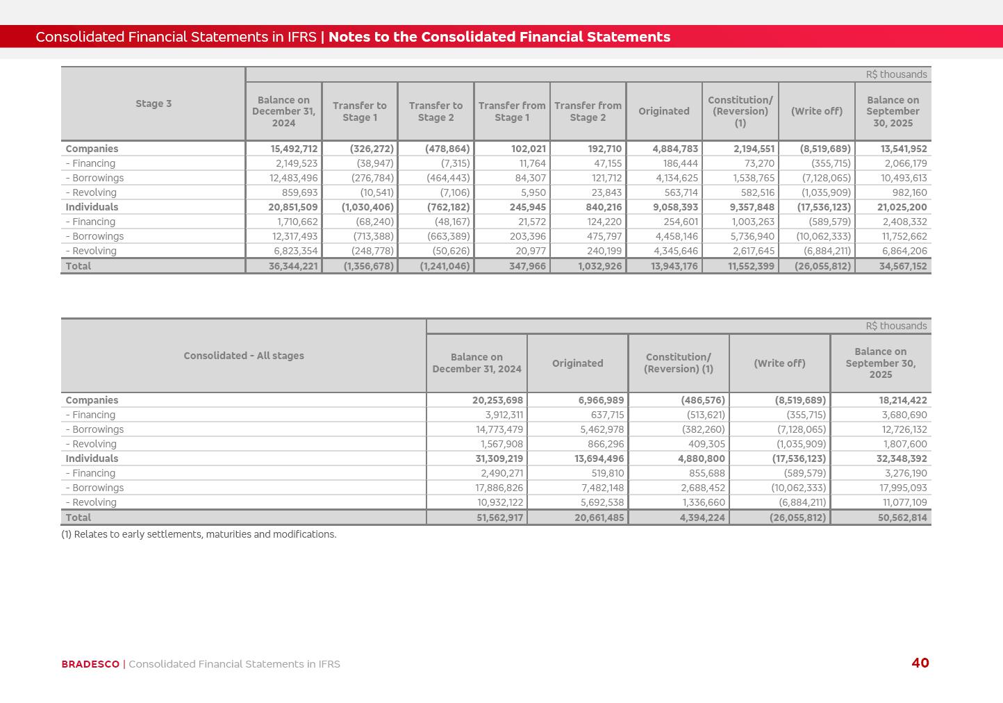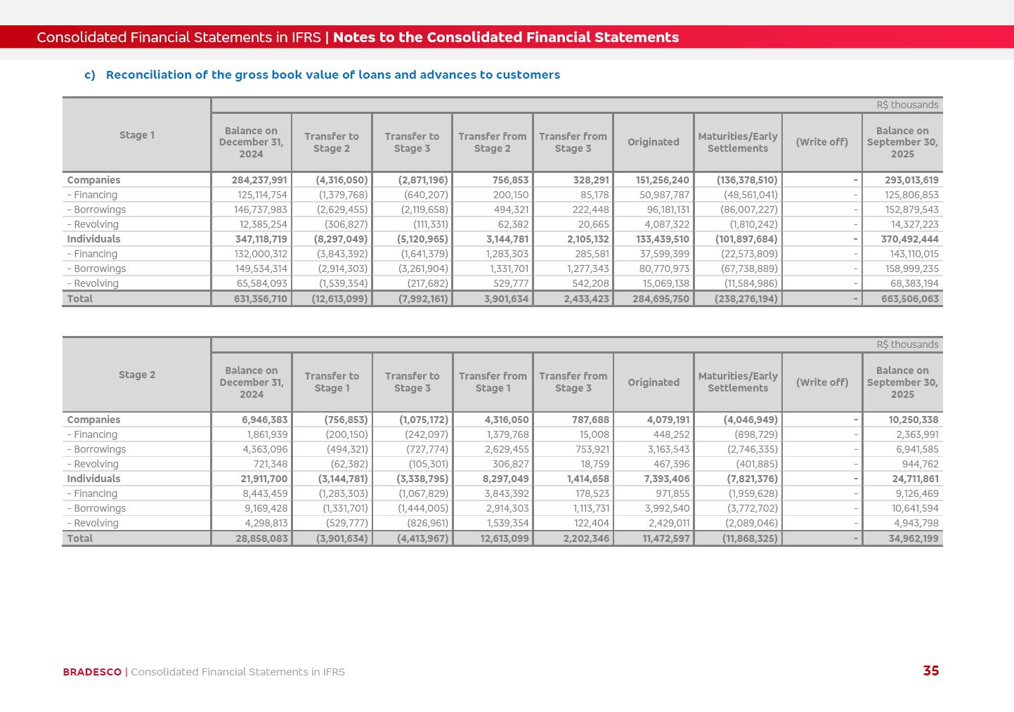 Consolidated Financial Statements 3Q25 in accordance with International Financial Reporting Standards (IFRS) issued by the International Accounting Standards Boards (IASB) Management Report BRADESCO | Management Report | Consolidated Financial Statements in IFRS 2 Dear Shareholders, We hereby present the Consolidated Financial Statements of Banco Bradesco S.A. related to the first nine months of 2025. We follow all International Financial Reporting Standards (IFRS) practices issued by the International Accounting Standards Board (IASB). Economic Comment The Brazilian economy showed mixed signals in the last quarter. On the one hand, there is already a slowdown in some sectors. On the other hand, the labor market remains heated, sustaining the dynamism of consumption. This accommodation is expected to intensify in the coming months, reflecting the Selic rate and the reduction of the fiscal momentum in the year. Our projections indicate that the GDP should grow 2.0% in 2025. The Central Bank of Brazil halted the rate hike cycle, after bringing the Selic rate to 15%. Although inflation expectations and the current inflation are still above expectation, there are signs of price decompression. We believe that inflation will continue to slow down in the coming months, favored by the accommodation of economic activity, the appreciation of the real against the dollar and the fall in cost inflation. This will allow the Central Bank of Brazil to start cutting the basic interest rate at the beginning of 2026. Uncertainties remain high on the international scene. The North-American economic policy represents the main vector of uncertainty for the performance of the global economy, also representing structural pressure on the dollar. This context is aggravated by the intensification of geopolitical disputes around the world. Highlights in the period In July 2025, Banco Bradesco S.A. (“Bradesco”) noticed to its shareholders and to the market in general the relevant fact that revised the Guidance for 2025, in compliance with Paragraph 4 of article 157 of Law No. 6,404/76 and CVM Resolution No. 44/21, increasing the projection of the Fee and Commission Income from “4% to 8%” to “5% to 9%” and the projection of the Income from Insurance, Pension Plans and Capitalization Operations from “6% to 10%” to “9% to 13%”. In September 2025, Bradesco disclosed to its shareholders and to the market in general that Atlântica Hospitais e Participações S.A. (an indirect subsidiary), firmed an Investment Agreement with the Rede D’Or São Luiz S.A. group (“Rede D’Or”) for the inclusion of Hospital Glória D’Or in the Atlântica D’Or hospital network, thus expanding the partnership signed with Rede D’Or, disclosed to the market on May 8 and November 1, 2024, retaining the existing corporate shareholding, with the 50.01% stake for Rede D’Or and 49.99% stake for Atlântica. It also informed that the expansion of the partnership is aligned with the strategy of Atlântica to invest in the health sector value chain through partnerships with players established in the operation of the hospitals. Finally, in September 2025, Bradesco approved, at a meeting of the Board of Directors, the proposal of the Board of Executive Officers to pay interest on intermediate equity, in the total amount of R$3,000,000,000.00, i.e. R$0.270146729 per common share and R$0.297161402 per preferred share, whose payment will be made by April 30, 2026. BRADESCO | Management Report | Consolidated Financial Statements in IFRS 3 . highlighted information 9M25 TOTAL DEPOSITS (Sept25 vs. Sept24) R$667.1 bi (+8.2%) R$17.4 bi R$175.6 bi +5.1% y/y EARNINGS PER SHARE BOOK VALUE PER SHARE BOOK NET INCOME R$1.54 common R$1.70 preferred R$16.61 SHAREHOLDERS’ EQUITY (1) MARKET VALUE TIER I CAPITAL R$174.1 bi 13.4% SECURITIES (Sept25 vs. Sept24) R$832.7 bi (+11.4%) FVPL: R$454.6 bi (+31.4%) FVOCI: R$125.7 bi (-45.4%) Amortized Cost: R$252.4 bi (+47.4%) EXPANDED LOAN PORTFOLIO (Sept25 vs. Sept24) R$1,034.2 bi (+9.6%) INDIVIDUALS: R$451.6 bi (+13.8%) COMPANIES: R$582.7 bi (+6.5%) ALLOWANCE FOR EXPANDED LOANS (Sept25 vs. Sept24) R$55.9 bi (stable) INTEREST ON SHAREHOLDERS’ EQUITY R$10.6 bi (gross) +30.4% y/y (1) Equity attributable to shareholders of the parente. +0.7% y/y BRADESCO | Management Report | Consolidated Financial Statements in IFRS 4 Technology and innovation Bradesco’s digital transformation continues at an accelerated pace, consolidating technology as a strategic pillar to generate value for clients and the business. Guided by the Customer-centricity pillars, AI First, Business Acceleration and Efficiency, we continue to develop customized, secure and efficient digital solutions, anticipating data and behavior-based needs. The Bridge platform, which democratizes the use of generative AI for developers and business areas, continues to expand use cases with simplified integration and scalability, re-leveraging already built services. This evolution allows innovative solutions to reach the market faster, reinforcing our positioning in artificial intelligence. We are going beyond the AI First concept, we want to be technologically AI Ready and advance in the ambition to become an AI Powered bank, with practical applications that increase productivity, hyperpersonalization of experiences, with robust governance, security, risk monitoring and client engagement. Artificial intelligence has also been consolidated as a driver of productivity and experience. BIA Clientes with Generative AI is already available for 100% of the clients, with 87% resolution in the chat and integration in journeys like Pix Inteligente (Smart Pix) on WhatsApp. BIA Corporativa supports 100% of employees, with more than 2 million interactions supporting the search for content and responses. BIA Tech drives the development cycle with 64% more efficiency in writing stories, +80 thousand stories evaluated with GenAI, thousands of automatic code 
