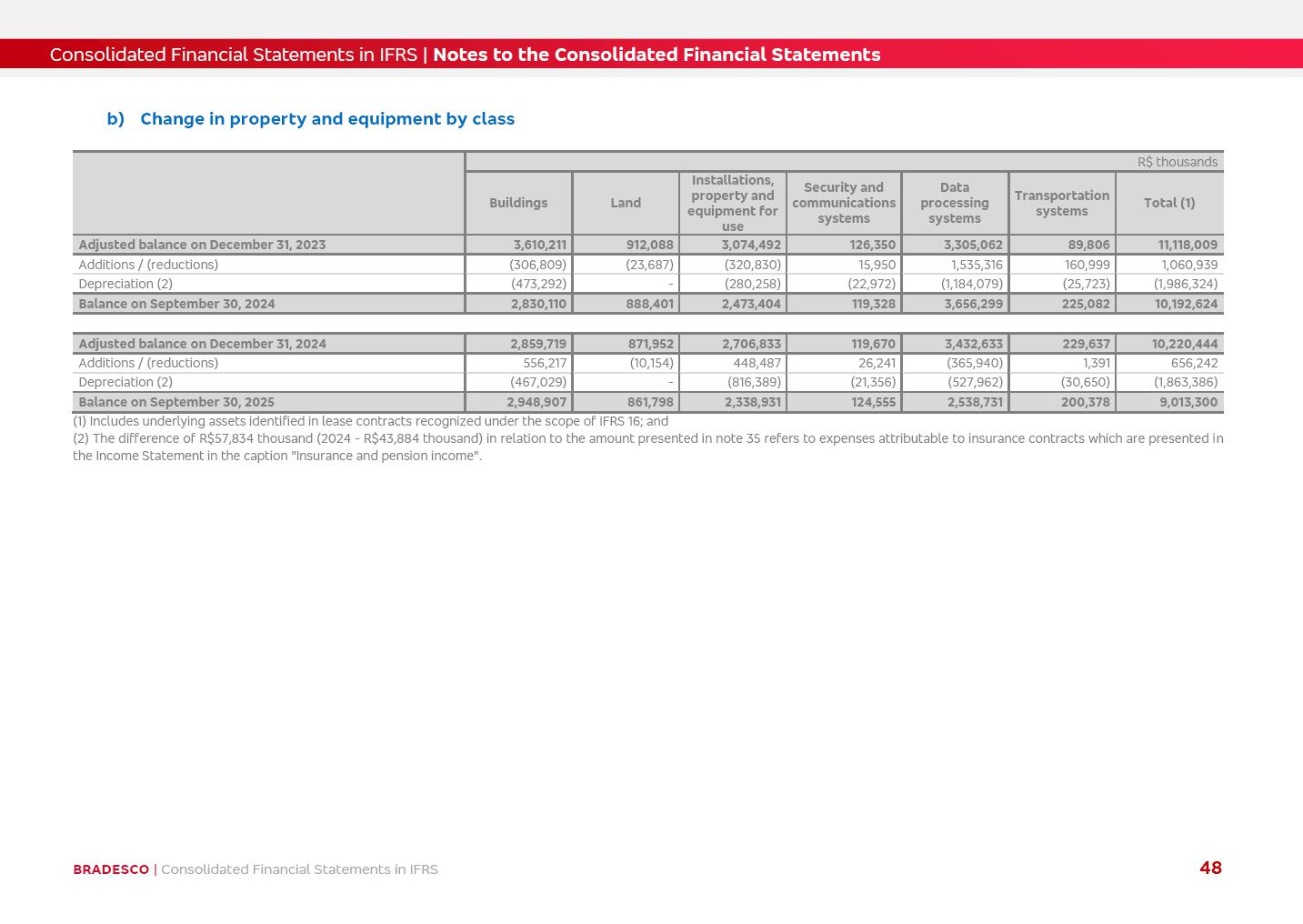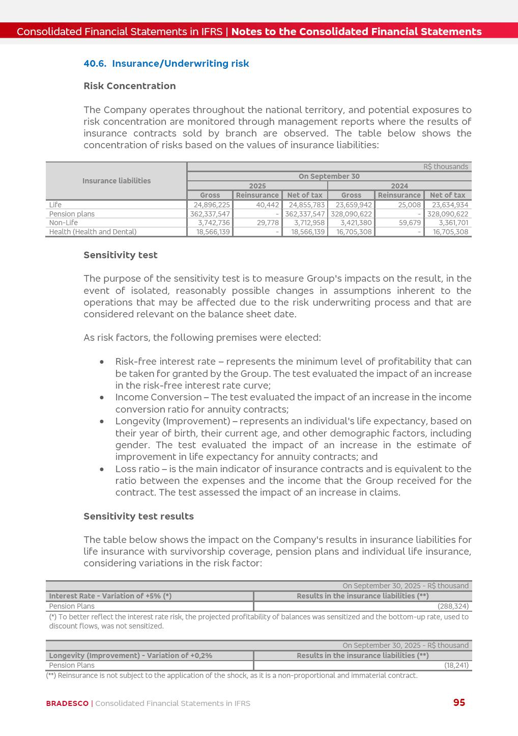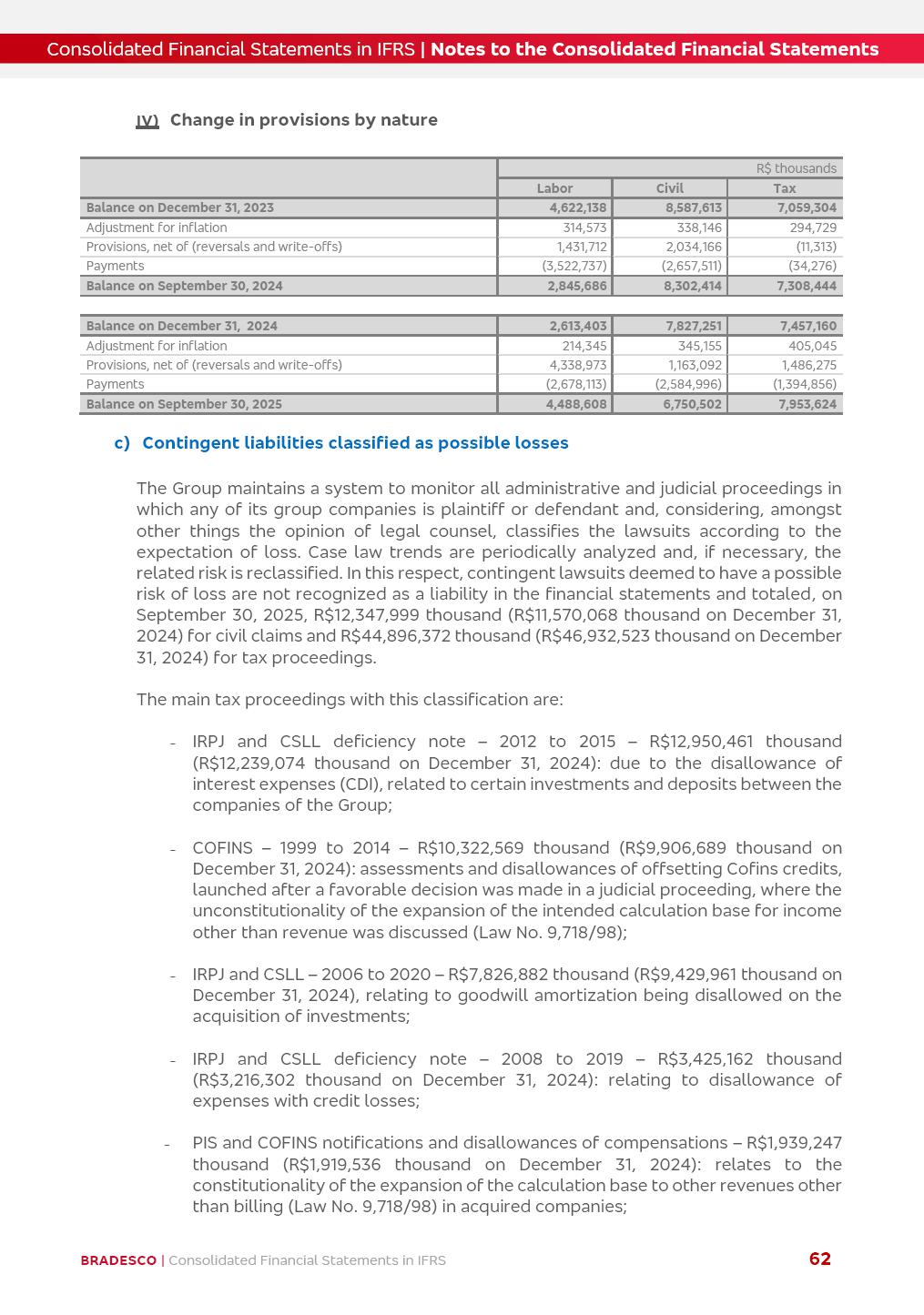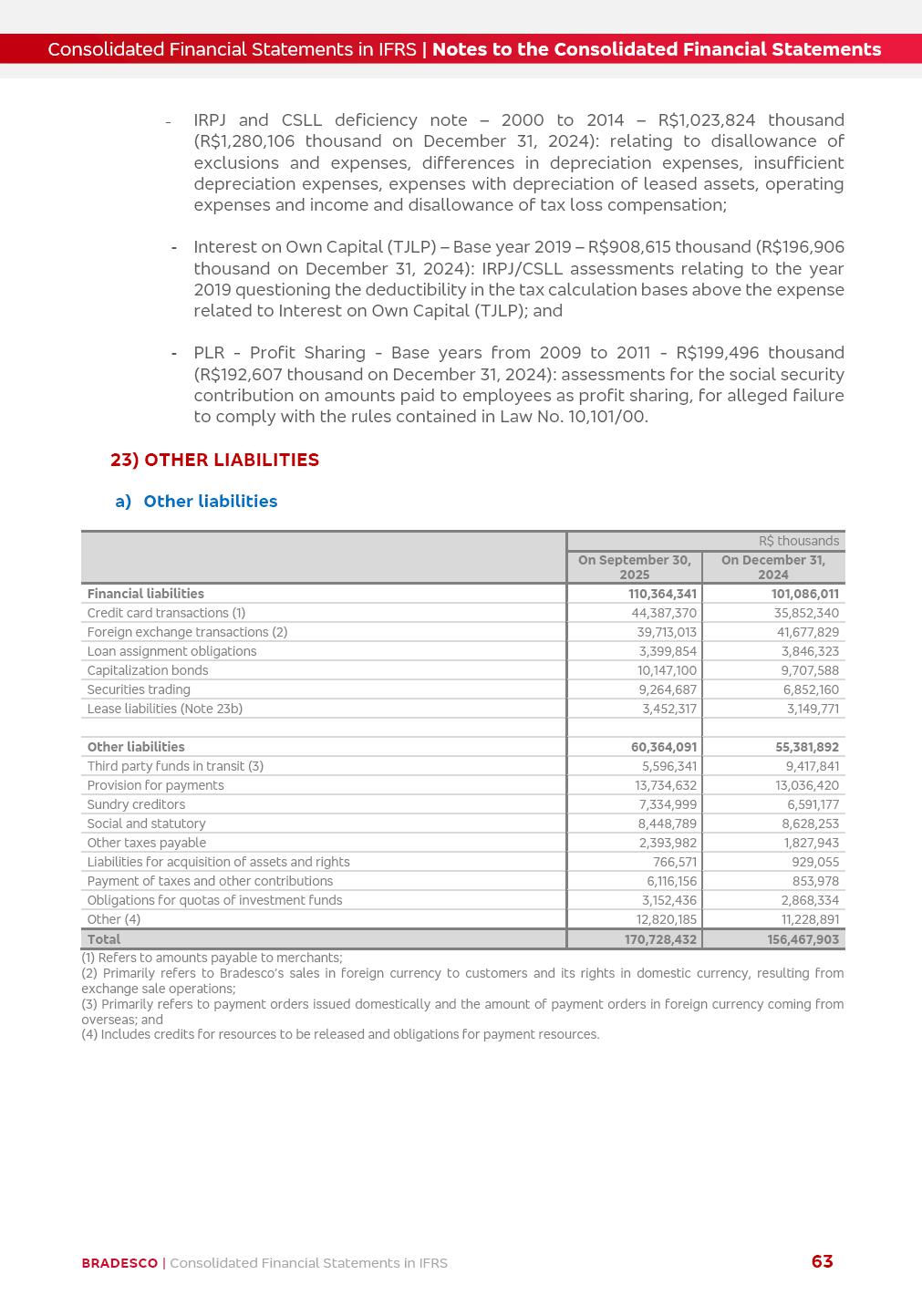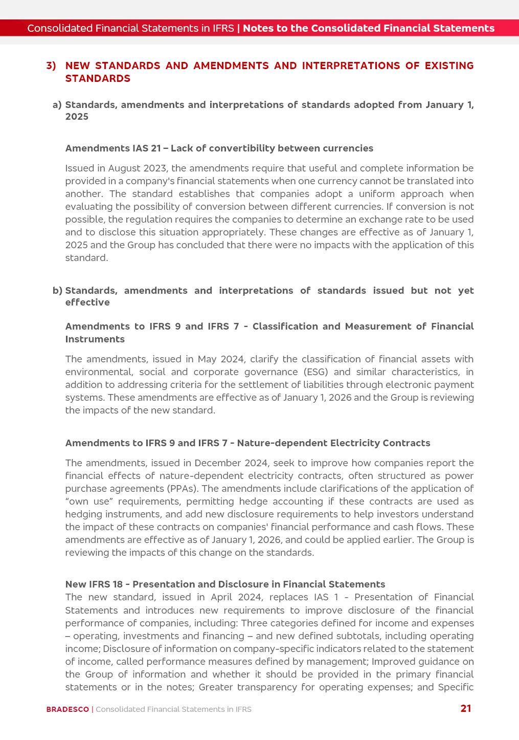 Consolidated Financial Statements 3Q25 in accordance with International Financial Reporting Standards (IFRS) issued by the International Accounting Standards Boards (IASB) Management Report BRADESCO | Management Report | Consolidated Financial Statements in IFRS 2 Dear Shareholders, We hereby present the Consolidated Financial Statements of Banco Bradesco S.A. related to the first nine months of 2025. We follow all International Financial Reporting Standards (IFRS) practices issued by the International Accounting Standards Board (IASB). Economic Comment The Brazilian economy showed mixed signals in the last quarter. On the one hand, there is already a slowdown in some sectors. On the other hand, the labor market remains heated, sustaining the dynamism of consumption. This accommodation is expected to intensify in the coming months, reflecting the Selic rate and the reduction of the fiscal momentum in the year. Our projections indicate that the GDP should grow 2.0% in 2025. The Central Bank of Brazil halted the rate hike cycle, after bringing the Selic rate to 15%. Although inflation expectations and the current inflation are still above expectation, there are signs of price decompression. We believe that inflation will continue to slow down in the coming months, favored by the accommodation of economic activity, the appreciation of the real against the dollar and the fall in cost inflation. This will allow the Central Bank of Brazil to start cutting the basic interest rate at the beginning of 2026. Uncertainties remain high on the international scene. The North-American economic policy represents the main vector of uncertainty for the performance of the global economy, also representing structural pressure on the dollar. This context is aggravated by the intensification of geopolitical disputes around the world. Highlights in the period In July 2025, Banco Bradesco S.A. (“Bradesco”) noticed to its shareholders and to the market in general the relevant fact that revised the Guidance for 2025, in compliance with Paragraph 4 of article 157 of Law No. 6,404/76 and CVM Resolution No. 44/21, increasing the projection of the Fee and Commission Income from “4% to 8%” to “5% to 9%” and the projection of the Income from Insurance, Pension Plans and Capitalization Operations from “6% to 10%” to “9% to 13%”. In September 2025, Bradesco disclosed to its shareholders and to the market in general that Atlântica Hospitais e Participações S.A. (an indirect subsidiary), firmed an Investment Agreement with the Rede D’Or São Luiz S.A. group (“Rede D’Or”) for the inclusion of Hospital Glória D’Or in the Atlântica D’Or hospital network, thus expanding the partnership signed with Rede D’Or, disclosed to the market on May 8 and November 1, 2024, retaining the existing corporate shareholding, with the 50.01% stake for Rede D’Or and 49.99% stake for Atlântica. It also informed that the expansion of the partnership is aligned with the strategy of Atlântica to invest in the health sector value chain through partnerships with players established in the operation of the hospitals. Finally, in September 2025, Bradesco approved, at a meeting of the Board of Directors, the proposal of the Board of Executive Officers to pay interest on intermediate equity, in the total amount of R$3,000,000,000.00, i.e. R$0.270146729 per common share and R$0.297161402 per preferred share, whose payment will be made by April 30, 2026. BRADESCO | Management Report | Consolidated Financial Statements in IFRS 3 . highlighted information 9M25 TOTAL DEPOSITS (Sept25 vs. Sept24) R$667.1 bi (+8.2%) R$17.4 bi R$175.6 bi +5.1% y/y EARNINGS PER SHARE BOOK VALUE PER SHARE BOOK NET INCOME R$1.54 common R$1.70 preferred R$16.61 SHAREHOLDERS’ EQUITY (1) MARKET VALUE TIER I CAPITAL R$174.1 bi 13.4% SECURITIES (Sept25 vs. Sept24) R$832.7 bi (+11.4%) FVPL: R$454.6 bi (+31.4%) FVOCI: R$125.7 bi (-45.4%) Amortized Cost: R$252.4 bi (+47.4%) EXPANDED LOAN PORTFOLIO (Sept25 vs. Sept24) R$1,034.2 bi (+9.6%) INDIVIDUALS: R$451.6 bi (+13.8%) COMPANIES: R$582.7 bi (+6.5%) ALLOWANCE FOR EXPANDED LOANS (Sept25 vs. Sept24) R$55.9 bi (stable) INTEREST ON SHAREHOLDERS’ EQUITY R$10.6 bi (gross) +30.4% y/y (1) Equity attributable to shareholders of the parente. +0.7% y/y BRADESCO | Management Report | Consolidated Financial Statements in IFRS 4 Technology and innovation Bradesco’s digital transformation continues at an accelerated pace, consolidating technology as a strategic pillar to generate value for clients and the business. Guided by the Customer-centricity pillars, AI First, Business Acceleration and Efficiency, we continue to develop customized, secure and efficient digital solutions, anticipating data and behavior-based needs. The Bridge platform, which democratizes the use of generative AI for developers and business areas, continues to expand use cases with simplified integration and scalability, re-leveraging already built services. This evolution allows innovative solutions to reach the market faster, reinforcing our positioning in artificial intelligence. We are going beyond the AI First concept, we want to be technologically AI Ready and advance in the ambition to become an AI Powered bank, with practical applications that increase productivity, hyperpersonalization of experiences, with robust governance, security, risk monitoring and client engagement. Artificial intelligence has also been consolidated as a driver of productivity and experience. BIA Clientes with Generative AI is already available for 100% of the clients, with 87% resolution in the chat and integration in journeys like Pix Inteligente (Smart Pix) on WhatsApp. BIA Corporativa supports 100% of employees, with more than 2 million interactions supporting the search for content and responses. BIA Tech drives the development cycle with 64% more efficiency in writing stories, +80 thousand stories evaluated with GenAI, thousands of automatic code 