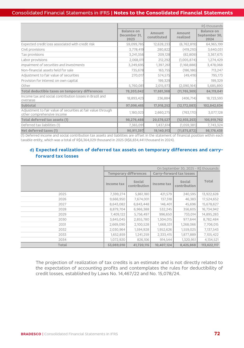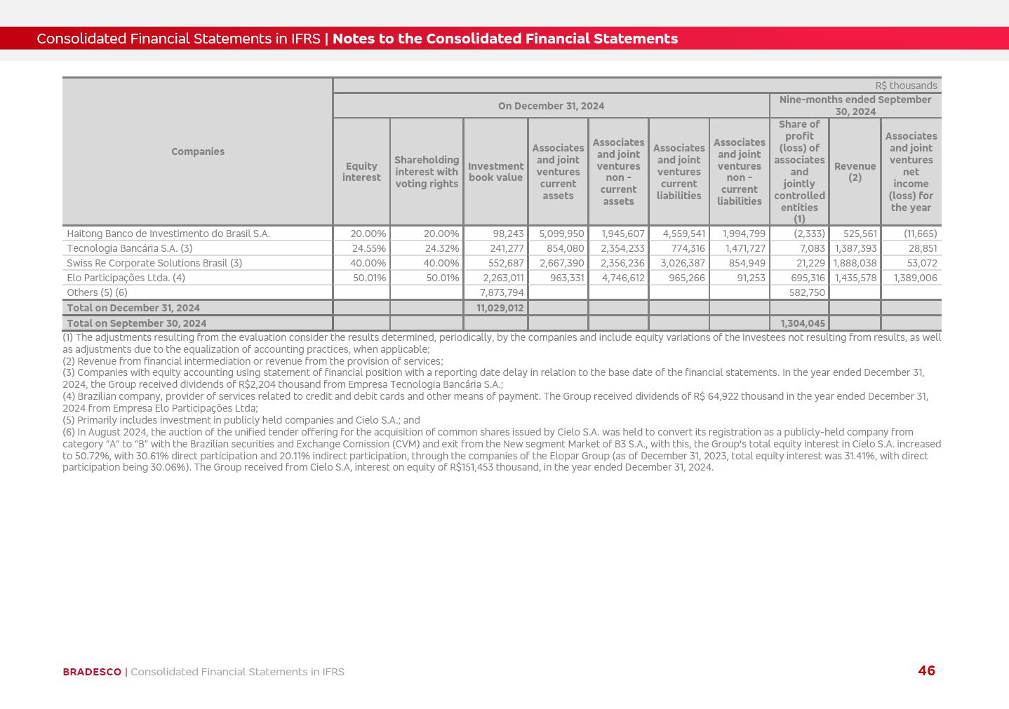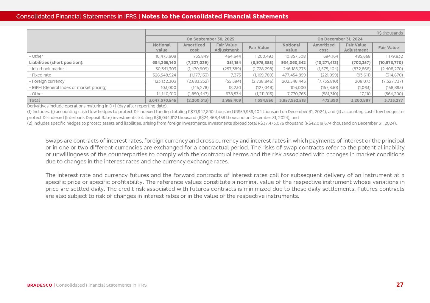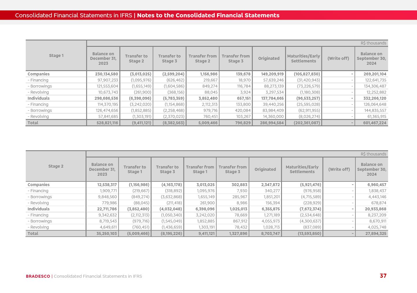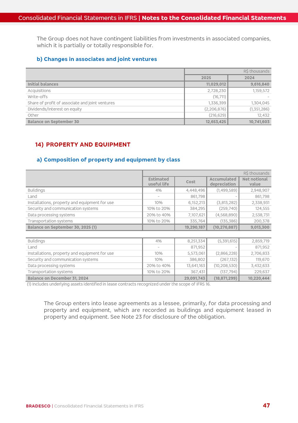 Consolidated Financial Statements 3Q25 in accordance with International Financial Reporting Standards (IFRS) issued by the International Accounting Standards Boards (IASB) Management Report BRADESCO | Management Report | Consolidated Financial Statements in IFRS 2 Dear Shareholders, We hereby present the Consolidated Financial Statements of Banco Bradesco S.A. related to the first nine months of 2025. We follow all International Financial Reporting Standards (IFRS) practices issued by the International Accounting Standards Board (IASB). Economic Comment The Brazilian economy showed mixed signals in the last quarter. On the one hand, there is already a slowdown in some sectors. On the other hand, the labor market remains heated, sustaining the dynamism of consumption. This accommodation is expected to intensify in the coming months, reflecting the Selic rate and the reduction of the fiscal momentum in the year. Our projections indicate that the GDP should grow 2.0% in 2025. The Central Bank of Brazil halted the rate hike cycle, after bringing the Selic rate to 15%. Although inflation expectations and the current inflation are still above expectation, there are signs of price decompression. We believe that inflation will continue to slow down in the coming months, favored by the accommodation of economic activity, the appreciation of the real against the dollar and the fall in cost inflation. This will allow the Central Bank of Brazil to start cutting the basic interest rate at the beginning of 2026. Uncertainties remain high on the international scene. The North-American economic policy represents the main vector of uncertainty for the performance of the global economy, also representing structural pressure on the dollar. This context is aggravated by the intensification of geopolitical disputes around the world. Highlights in the period In July 2025, Banco Bradesco S.A. (“Bradesco”) noticed to its shareholders and to the market in general the relevant fact that revised the Guidance for 2025, in compliance with Paragraph 4 of article 157 of Law No. 6,404/76 and CVM Resolution No. 44/21, increasing the projection of the Fee and Commission Income from “4% to 8%” to “5% to 9%” and the projection of the Income from Insurance, Pension Plans and Capitalization Operations from “6% to 10%” to “9% to 13%”. In September 2025, Bradesco disclosed to its shareholders and to the market in general that Atlântica Hospitais e Participações S.A. (an indirect subsidiary), firmed an Investment Agreement with the Rede D’Or São Luiz S.A. group (“Rede D’Or”) for the inclusion of Hospital Glória D’Or in the Atlântica D’Or hospital network, thus expanding the partnership signed with Rede D’Or, disclosed to the market on May 8 and November 1, 2024, retaining the existing corporate shareholding, with the 50.01% stake for Rede D’Or and 49.99% stake for Atlântica. It also informed that the expansion of the partnership is aligned with the strategy of Atlântica to invest in the health sector value chain through partnerships with players established in the operation of the hospitals. Finally, in September 2025, Bradesco approved, at a meeting of the Board of Directors, the proposal of the Board of Executive Officers to pay interest on intermediate equity, in the total amount of R$3,000,000,000.00, i.e. R$0.270146729 per common share and R$0.297161402 per preferred share, whose payment will be made by April 30, 2026. BRADESCO | Management Report | Consolidated Financial Statements in IFRS 3 . highlighted information 9M25 TOTAL DEPOSITS (Sept25 vs. Sept24) R$667.1 bi (+8.2%) R$17.4 bi R$175.6 bi +5.1% y/y EARNINGS PER SHARE BOOK VALUE PER SHARE BOOK NET INCOME R$1.54 common R$1.70 preferred R$16.61 SHAREHOLDERS’ EQUITY (1) MARKET VALUE TIER I CAPITAL R$174.1 bi 13.4% SECURITIES (Sept25 vs. Sept24) R$832.7 bi (+11.4%) FVPL: R$454.6 bi (+31.4%) FVOCI: R$125.7 bi (-45.4%) Amortized Cost: R$252.4 bi (+47.4%) EXPANDED LOAN PORTFOLIO (Sept25 vs. Sept24) R$1,034.2 bi (+9.6%) INDIVIDUALS: R$451.6 bi (+13.8%) COMPANIES: R$582.7 bi (+6.5%) ALLOWANCE FOR EXPANDED LOANS (Sept25 vs. Sept24) R$55.9 bi (stable) INTEREST ON SHAREHOLDERS’ EQUITY R$10.6 bi (gross) +30.4% y/y (1) Equity attributable to shareholders of the parente. +0.7% y/y BRADESCO | Management Report | Consolidated Financial Statements in IFRS 4 Technology and innovation Bradesco’s digital transformation continues at an accelerated pace, consolidating technology as a strategic pillar to generate value for clients and the business. Guided by the Customer-centricity pillars, AI First, Business Acceleration and Efficiency, we continue to develop customized, secure and efficient digital solutions, anticipating data and behavior-based needs. The Bridge platform, which democratizes the use of generative AI for developers and business areas, continues to expand use cases with simplified integration and scalability, re-leveraging already built services. This evolution allows innovative solutions to reach the market faster, reinforcing our positioning in artificial intelligence. We are going beyond the AI First concept, we want to be technologically AI Ready and advance in the ambition to become an AI Powered bank, with practical applications that increase productivity, hyperpersonalization of experiences, with robust governance, security, risk monitoring and client engagement. Artificial intelligence has also been consolidated as a driver of productivity and experience. BIA Clientes with Generative AI is already available for 100% of the clients, with 87% resolution in the chat and integration in journeys like Pix Inteligente (Smart Pix) on WhatsApp. BIA Corporativa supports 100% of employees, with more than 2 million interactions supporting the search for content and responses. BIA Tech drives the development cycle with 64% more efficiency in writing stories, +80 thousand stories evaluated with GenAI, thousands of automatic code 