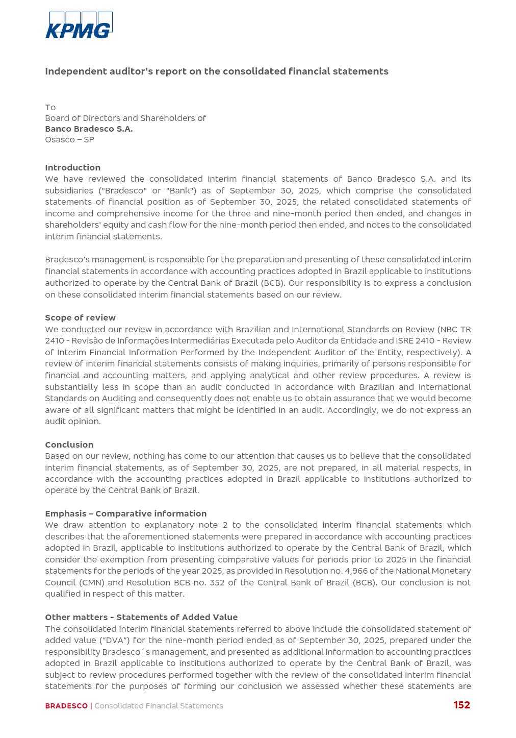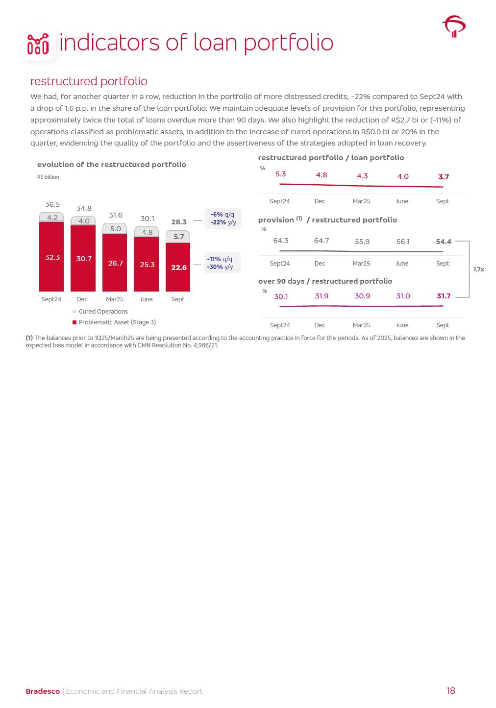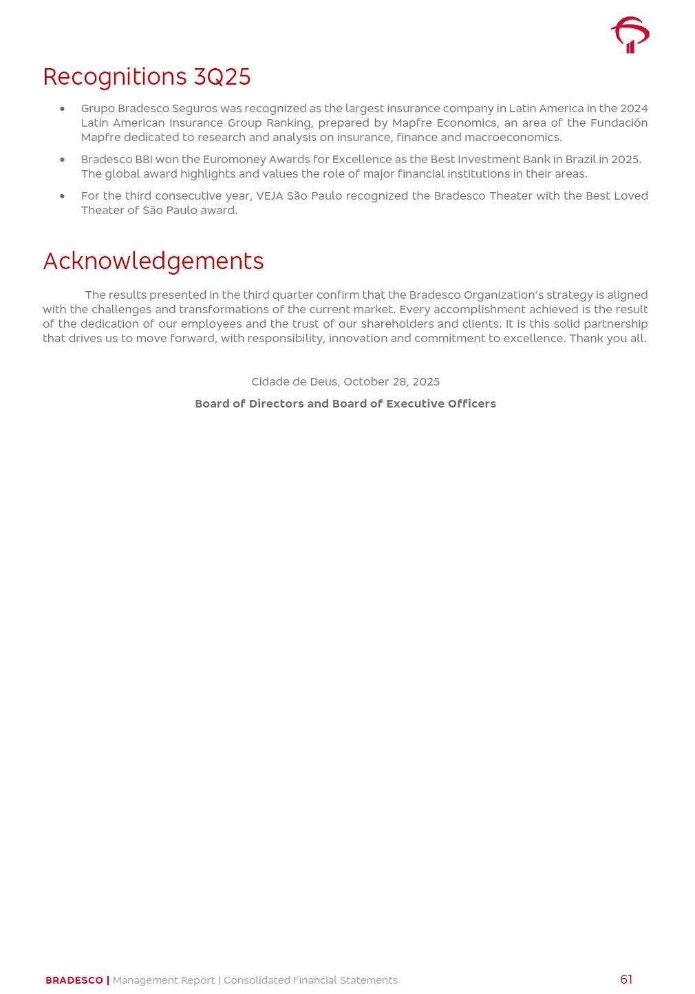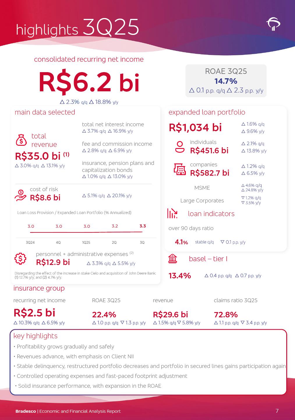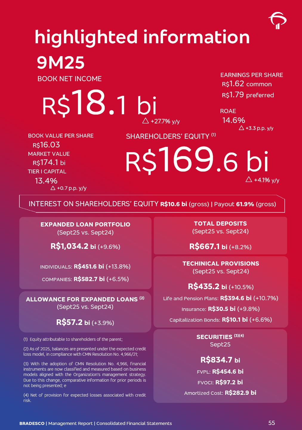 click on the items below to navigate through the document: 3Q25 managerial analysis of results management report consolidated financial statements videoconference commenting on the results October 30th at 9:30 AM (US Eastern Time) economic and financial analysis reportBradesco | Economic and Financial Analysis Report 3 Table of Contents Managerial Analysis of Results 5 press release 6 highlights 3Q25 7 recurring net income statement 8 net interest income 9 funding sources 10 loan portfolio 11 expenses with expanded loan loss provisions 16 loan indicators 17 fee and commission income 19 operating expenses 21 Bradesco Seguros 22 basel 27 guidance, indicators & economic perspectives 28 Additional Information 29 corporate strategy | customer-centric 30 NPS 31 our people 32 sustainability 33 digital in figures | BIA 34 Bradesco Principal 35 Bradesco Expresso 36 international operations | My Account 37 Bradesco Bank 38 Ágora Investimentos 39 Digio | next 40 service points, clients and market share 41 return to shareholders 42 additional information 43 selected information 45 consolidated balance sheet – Bradesco 46 consolidated balance sheet – Insurance 47 statement of income – managerial vs. recurring | BRGAAP vs. IFRS comparative 48 Independent Auditor’s Report 49 Consolidated Financial Statements 53 Bradesco | Economic and Financial Analysis Report 4 Some numbers included in this Report have been subjected to rounding adjustments. As a result, some amounts indicated as total amounts in some charts may not be the arithmetic sum of the preceding numbers. Percentage variations not presented in the framework of this report, are related, in their majority, to the low value balances compared with the other periods presented. As of January 2025, we adopted in our Financial Statements the new accounting practices established by CMN Resolutions No. 4,966 and No. 4,975. For management purposes, we kept the information of the previous periods as already disclosed, which do not present relevant differences in the historical analysis of the results. For some credit indicators, when mentioned, we carry out historical data for comparability purposes on a pro-forma basis. In our financial statements the Organization opted for the exemption provided by the Standard not to resubmit comparative information from previous periods resulting from the changes. Managerial Analysis of Results Bradesco | Economic and Financial Analysis Report 6 press release Bradesco is undergoing a transformation, fueling a continued positive performance. In the third quarter of the year, we took another step in boosting our profitability. We continue with the same commercial traction, while keeping delinquency indicators under control, prioritizing risk-adjusted returns. The transformation is advancing, supporting our evolution and enhancing our long-term competitiveness. Recurring net income was R$6.2 billion in 3Q25, an increase of 2.3% q/q and 18.8% y/y. As a result, ROAE topped 14.7% in the quarter. Total revenue reached R$35.0 billion in the quarter, increasing by 3.0% q/q and 13.1% y/y, driven by an expressive performance across all lines: net interest income, fee and commission income and income from insurance. The NII reached R$18.7 billion in the quarter, up by 3.7% q/q and 16.9% y/y. Client NII totaled R$18.6 billion, up by 4.8% q/q and 19.0% y/y, mainly driven by the increase in the loan portfolio and the average spread, which improved from 8.8% in 2Q25 to 9.0% in 3Q25, benefiting from higher efficiency in funding. Market NII was R$99 million in 3Q25, decreasing from the previous quarter, as expected. The expanded loan portfolio grew by 9.6% y/y and 1.6% q/q in Sept25, driven by the MSME and Individual segments. It is worth highlighting the increase in the share of secured credit lines, which went from 58.5% in Jun25 to 59.5% in Sept25. In terms of MSME, products such as receivables discounting and working capital loans (FGI and FGO - government-backed guarantee funds) stand out, and for Individuals, in payroll-deductible loans, rural loans, and high-income credit card lines. In September 2025, the delinquency ratio (over 90 days NPL) remained stable at 4.1%. Delinquency in MSME posted an improvement of 0.6 p.p. q/q, reflecting the quality of recent vintages, while Individuals loan indicator was impacted by the higher level of delays in John Deere Bank operations, which are collateralized and subject to a distinct recovery timeline. The cost of credit increased slightly, from 3.2% in 2Q25 to 3.3% in 3Q25, reflecting an increase of provisions for specific wholesale cases and John Deere Bank. We highlight the decrease of R$1.8 billion in the restructured portfolio against the previous quarter and of R$8.2 billion in the annual comparison. The quality of our credit portfolio showed improvement, being that stage 1 loan participation rose 30 bps while stage 3 fell 20 bps, resulting from better originations and the sequential cleanup of problematic assets. Fee and commission income increased by 2.8% q/q and 6.9% y/y. The positive standouts over the quarter included fees from consortia, cards, loan operations and asset management. Once again, the operational performance of insurance activities was significant, with income from insurance operations reaching of R$5.7 billion (1.0% q/q and 13.0% y/y) and net income of R$2.5 billion (10.3% q/q and 6.5% y/y). The ROAE of the insurance company was 22.4% in 3Q25. Operating expenses increased by 3.7% q/q and 9.6% y/y, in line with expectations. This growth rate largely reflects the investments being made in the bank and its affiliates. Analyzing only personnel and administrative expenses, there was a 5.5% y/y growth in 3Q25, which shrinks to 2.5% when we exclude the profit-sharing expenses, below inflation of 5.2% for the period, underlining the strong cost-control measures currently in place within the Organization. With that, we maintained our efficiency ratio stable at abou