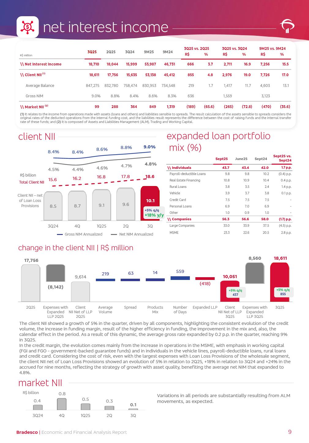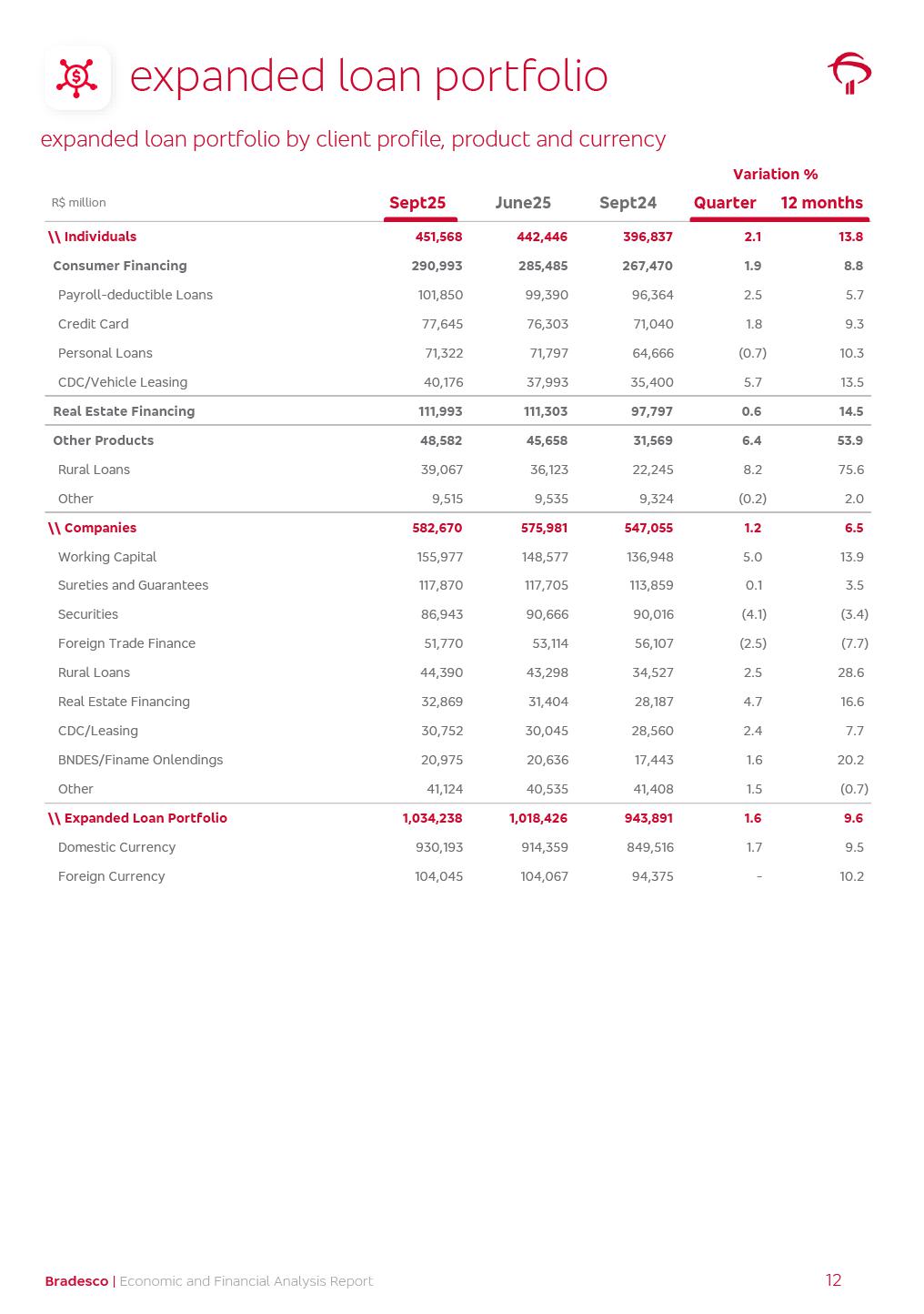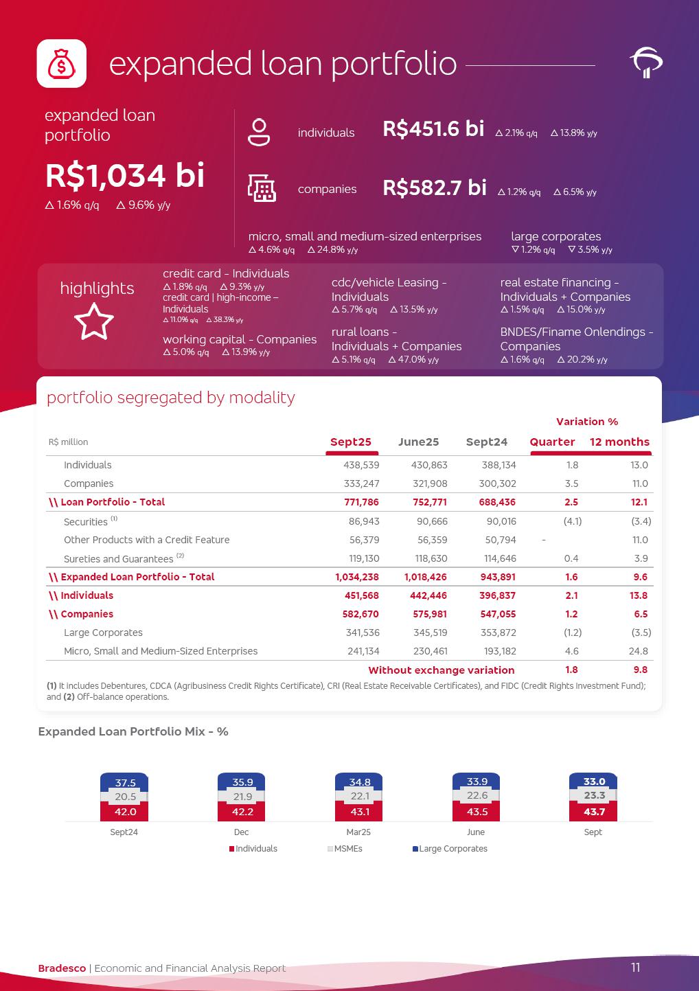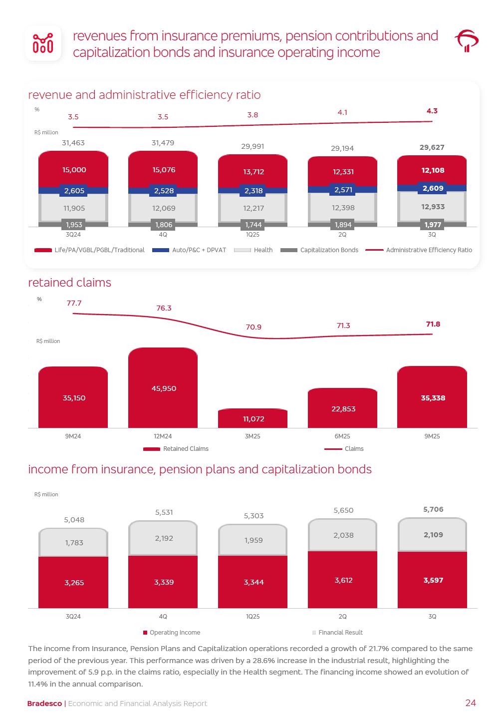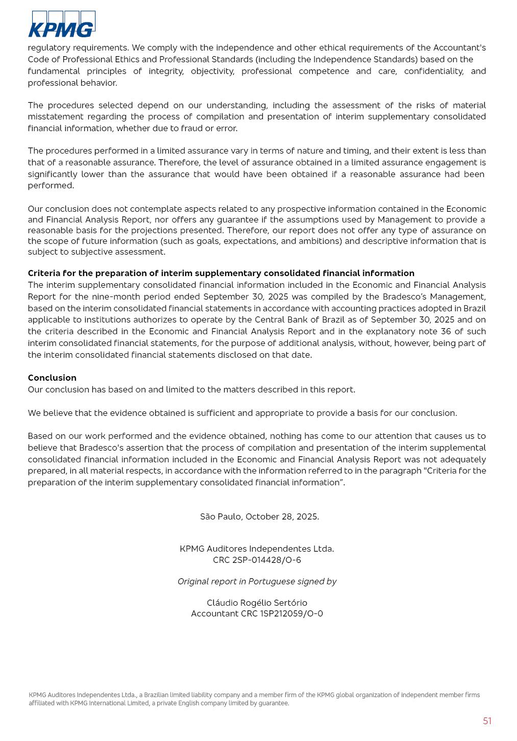 click on the items below to navigate through the document: 3Q25 managerial analysis of results management report consolidated financial statements videoconference commenting on the results October 30th at 9:30 AM (US Eastern Time) economic and financial analysis reportBradesco | Economic and Financial Analysis Report 3 Table of Contents Managerial Analysis of Results 5 press release 6 highlights 3Q25 7 recurring net income statement 8 net interest income 9 funding sources 10 loan portfolio 11 expenses with expanded loan loss provisions 16 loan indicators 17 fee and commission income 19 operating expenses 21 Bradesco Seguros 22 basel 27 guidance, indicators & economic perspectives 28 Additional Information 29 corporate strategy | customer-centric 30 NPS 31 our people 32 sustainability 33 digital in figures | BIA 34 Bradesco Principal 35 Bradesco Expresso 36 international operations | My Account 37 Bradesco Bank 38 Ágora Investimentos 39 Digio | next 40 service points, clients and market share 41 return to shareholders 42 additional information 43 selected information 45 consolidated balance sheet – Bradesco 46 consolidated balance sheet – Insurance 47 statement of income – managerial vs. recurring | BRGAAP vs. IFRS comparative 48 Independent Auditor’s Report 49 Consolidated Financial Statements 53 Bradesco | Economic and Financial Analysis Report 4 Some numbers included in this Report have been subjected to rounding adjustments. As a result, some amounts indicated as total amounts in some charts may not be the arithmetic sum of the preceding numbers. Percentage variations not presented in the framework of this report, are related, in their majority, to the low value balances compared with the other periods presented. As of January 2025, we adopted in our Financial Statements the new accounting practices established by CMN Resolutions No. 4,966 and No. 4,975. For management purposes, we kept the information of the previous periods as already disclosed, which do not present relevant differences in the historical analysis of the results. For some credit indicators, when mentioned, we carry out historical data for comparability purposes on a pro-forma basis. In our financial statements the Organization opted for the exemption provided by the Standard not to resubmit comparative information from previous periods resulting from the changes. Managerial Analysis of Results Bradesco | Economic and Financial Analysis Report 6 press release Bradesco is undergoing a transformation, fueling a continued positive performance. In the third quarter of the year, we took another step in boosting our profitability. We continue with the same commercial traction, while keeping delinquency indicators under control, prioritizing risk-adjusted returns. The transformation is advancing, supporting our evolution and enhancing our long-term competitiveness. Recurring net income was R$6.2 billion in 3Q25, an increase of 2.3% q/q and 18.8% y/y. As a result, ROAE topped 14.7% in the quarter. Total revenue reached R$35.0 billion in the quarter, increasing by 3.0% q/q and 13.1% y/y, driven by an expressive performance across all lines: net interest income, fee and commission income and income from insurance. The NII reached R$18.7 billion in the quarter, up by 3.7% q/q and 16.9% y/y. Client NII totaled R$18.6 billion, up by 4.8% q/q and 19.0% y/y, mainly driven by the increase in the loan portfolio and the average spread, which improved from 8.8% in 2Q25 to 9.0% in 3Q25, benefiting from higher efficiency in funding. Market NII was R$99 million in 3Q25, decreasing from the previous quarter, as expected. The expanded loan portfolio grew by 9.6% y/y and 1.6% q/q in Sept25, driven by the MSME and Individual segments. It is worth highlighting the increase in the share of secured credit lines, which went from 58.5% in Jun25 to 59.5% in Sept25. In terms of MSME, products such as receivables discounting and working capital loans (FGI and FGO - government-backed guarantee funds) stand out, and for Individuals, in payroll-deductible loans, rural loans, and high-income credit card lines. In September 2025, the delinquency ratio (over 90 days NPL) remained stable at 4.1%. Delinquency in MSME posted an improvement of 0.6 p.p. q/q, reflecting the quality of recent vintages, while Individuals loan indicator was impacted by the higher level of delays in John Deere Bank operations, which are collateralized and subject to a distinct recovery timeline. The cost of credit increased slightly, from 3.2% in 2Q25 to 3.3% in 3Q25, reflecting an increase of provisions for specific wholesale cases and John Deere Bank. We highlight the decrease of R$1.8 billion in the restructured portfolio against the previous quarter and of R$8.2 billion in the annual comparison. The quality of our credit portfolio showed improvement, being that stage 1 loan participation rose 30 bps while stage 3 fell 20 bps, resulting from better originations and the sequential cleanup of problematic assets. Fee and commission income increased by 2.8% q/q and 6.9% y/y. The positive standouts over the quarter included fees from consortia, cards, loan operations and asset management. Once again, the operational performance of insurance activities was significant, with income from insurance operations reaching of R$5.7 billion (1.0% q/q and 13.0% y/y) and net income of R$2.5 billion (10.3% q/q and 6.5% y/y). The ROAE of the insurance company was 22.4% in 3Q25. Operating expenses increased by 3.7% q/q and 9.6% y/y, in line with expectations. This growth rate largely reflects the investments being made in the bank and its affiliates. Analyzing only personnel and administrative expenses, there was a 5.5% y/y growth in 3Q25, which shrinks to 2.5% when we exclude the profit-sharing expenses, below inflation of 5.2% for the period, underlining the strong cost-control measures currently in place within the Organization. With that, we maintained our efficiency ratio stable at abou
