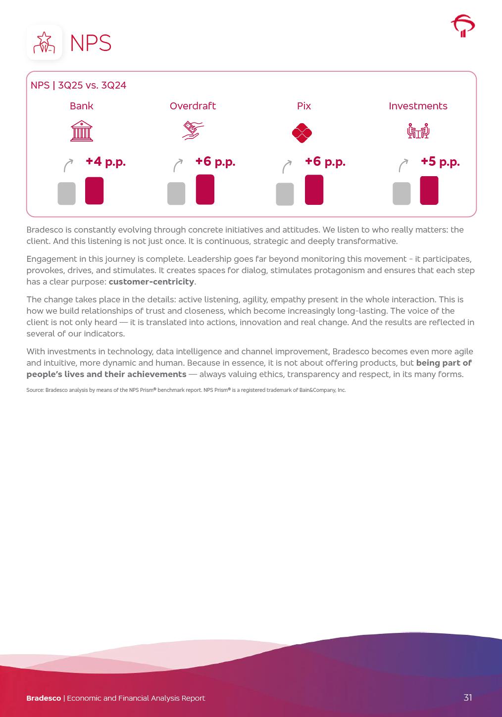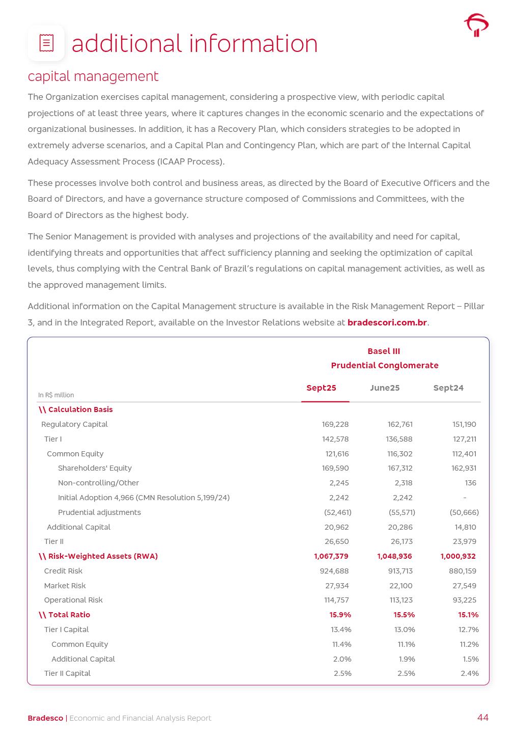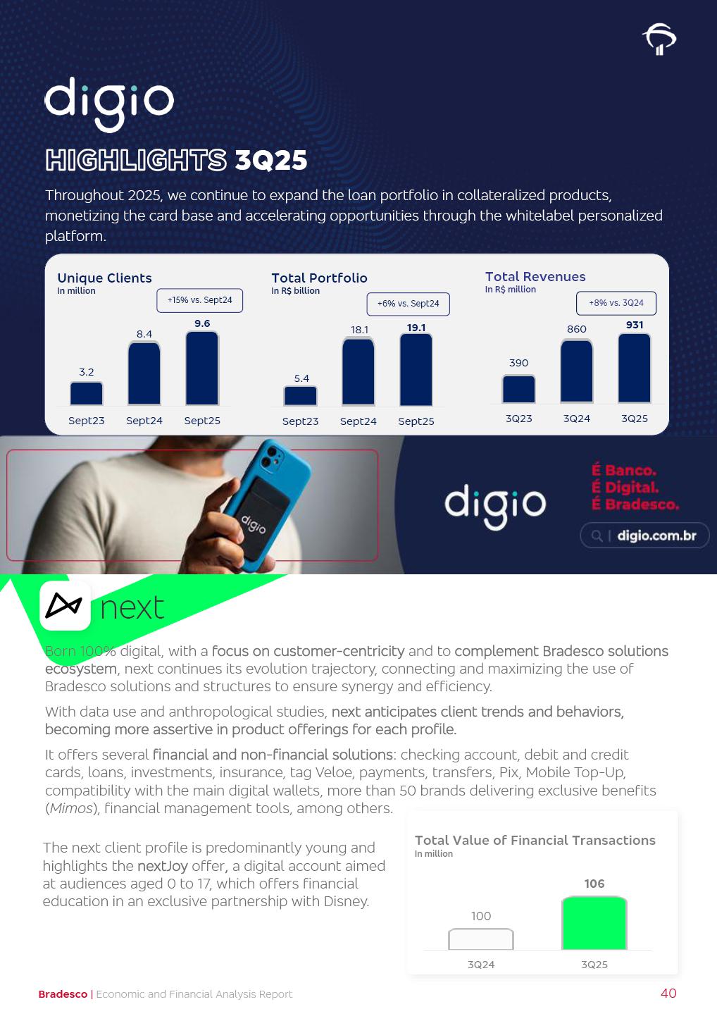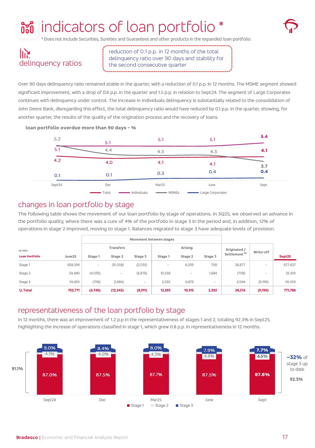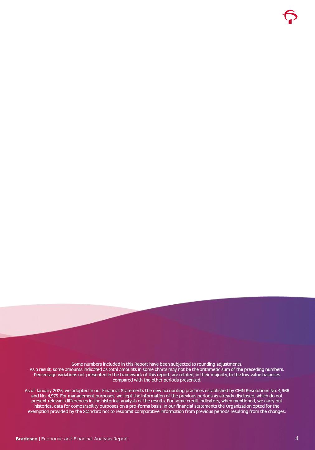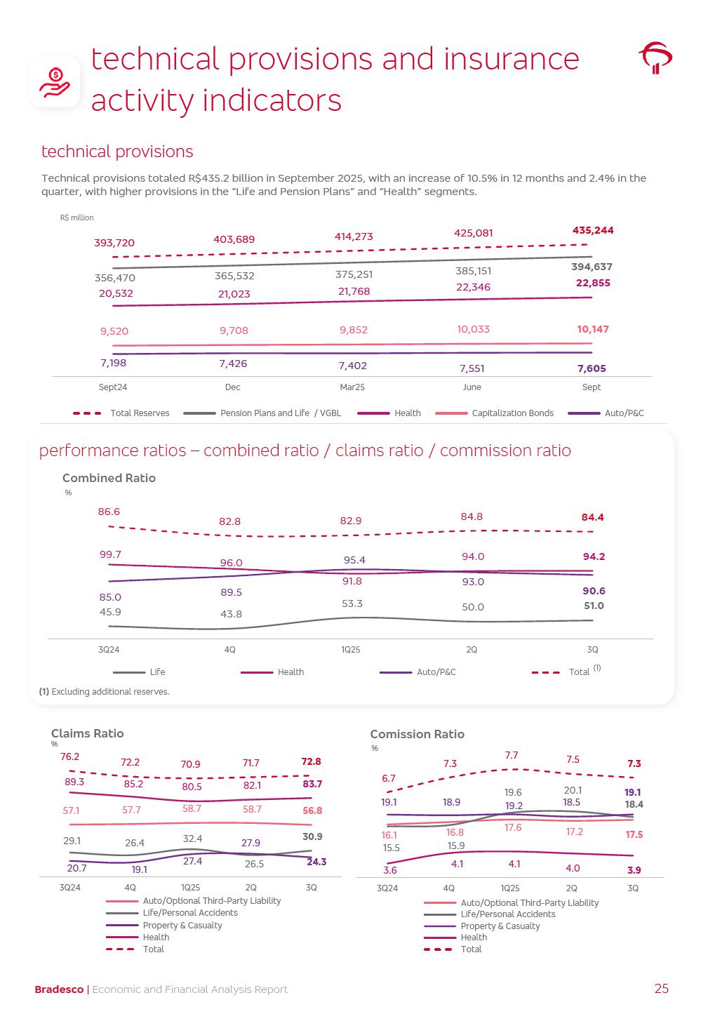 click on the items below to navigate through the document: 3Q25 managerial analysis of results management report consolidated financial statements videoconference commenting on the results October 30th at 9:30 AM (US Eastern Time) economic and financial analysis reportBradesco | Economic and Financial Analysis Report 3 Table of Contents Managerial Analysis of Results 5 press release 6 highlights 3Q25 7 recurring net income statement 8 net interest income 9 funding sources 10 loan portfolio 11 expenses with expanded loan loss provisions 16 loan indicators 17 fee and commission income 19 operating expenses 21 Bradesco Seguros 22 basel 27 guidance, indicators & economic perspectives 28 Additional Information 29 corporate strategy | customer-centric 30 NPS 31 our people 32 sustainability 33 digital in figures | BIA 34 Bradesco Principal 35 Bradesco Expresso 36 international operations | My Account 37 Bradesco Bank 38 Ágora Investimentos 39 Digio | next 40 service points, clients and market share 41 return to shareholders 42 additional information 43 selected information 45 consolidated balance sheet – Bradesco 46 consolidated balance sheet – Insurance 47 statement of income – managerial vs. recurring | BRGAAP vs. IFRS comparative 48 Independent Auditor’s Report 49 Consolidated Financial Statements 53 Bradesco | Economic and Financial Analysis Report 4 Some numbers included in this Report have been subjected to rounding adjustments. As a result, some amounts indicated as total amounts in some charts may not be the arithmetic sum of the preceding numbers. Percentage variations not presented in the framework of this report, are related, in their majority, to the low value balances compared with the other periods presented. As of January 2025, we adopted in our Financial Statements the new accounting practices established by CMN Resolutions No. 4,966 and No. 4,975. For management purposes, we kept the information of the previous periods as already disclosed, which do not present relevant differences in the historical analysis of the results. For some credit indicators, when mentioned, we carry out historical data for comparability purposes on a pro-forma basis. In our financial statements the Organization opted for the exemption provided by the Standard not to resubmit comparative information from previous periods resulting from the changes. Managerial Analysis of Results Bradesco | Economic and Financial Analysis Report 6 press release Bradesco is undergoing a transformation, fueling a continued positive performance. In the third quarter of the year, we took another step in boosting our profitability. We continue with the same commercial traction, while keeping delinquency indicators under control, prioritizing risk-adjusted returns. The transformation is advancing, supporting our evolution and enhancing our long-term competitiveness. Recurring net income was R$6.2 billion in 3Q25, an increase of 2.3% q/q and 18.8% y/y. As a result, ROAE topped 14.7% in the quarter. Total revenue reached R$35.0 billion in the quarter, increasing by 3.0% q/q and 13.1% y/y, driven by an expressive performance across all lines: net interest income, fee and commission income and income from insurance. The NII reached R$18.7 billion in the quarter, up by 3.7% q/q and 16.9% y/y. Client NII totaled R$18.6 billion, up by 4.8% q/q and 19.0% y/y, mainly driven by the increase in the loan portfolio and the average spread, which improved from 8.8% in 2Q25 to 9.0% in 3Q25, benefiting from higher efficiency in funding. Market NII was R$99 million in 3Q25, decreasing from the previous quarter, as expected. The expanded loan portfolio grew by 9.6% y/y and 1.6% q/q in Sept25, driven by the MSME and Individual segments. It is worth highlighting the increase in the share of secured credit lines, which went from 58.5% in Jun25 to 59.5% in Sept25. In terms of MSME, products such as receivables discounting and working capital loans (FGI and FGO - government-backed guarantee funds) stand out, and for Individuals, in payroll-deductible loans, rural loans, and high-income credit card lines. In September 2025, the delinquency ratio (over 90 days NPL) remained stable at 4.1%. Delinquency in MSME posted an improvement of 0.6 p.p. q/q, reflecting the quality of recent vintages, while Individuals loan indicator was impacted by the higher level of delays in John Deere Bank operations, which are collateralized and subject to a distinct recovery timeline. The cost of credit increased slightly, from 3.2% in 2Q25 to 3.3% in 3Q25, reflecting an increase of provisions for specific wholesale cases and John Deere Bank. We highlight the decrease of R$1.8 billion in the restructured portfolio against the previous quarter and of R$8.2 billion in the annual comparison. The quality of our credit portfolio showed improvement, being that stage 1 loan participation rose 30 bps while stage 3 fell 20 bps, resulting from better originations and the sequential cleanup of problematic assets. Fee and commission income increased by 2.8% q/q and 6.9% y/y. The positive standouts over the quarter included fees from consortia, cards, loan operations and asset management. Once again, the operational performance of insurance activities was significant, with income from insurance operations reaching of R$5.7 billion (1.0% q/q and 13.0% y/y) and net income of R$2.5 billion (10.3% q/q and 6.5% y/y). The ROAE of the insurance company was 22.4% in 3Q25. Operating expenses increased by 3.7% q/q and 9.6% y/y, in line with expectations. This growth rate largely reflects the investments being made in the bank and its affiliates. Analyzing only personnel and administrative expenses, there was a 5.5% y/y growth in 3Q25, which shrinks to 2.5% when we exclude the profit-sharing expenses, below inflation of 5.2% for the period, underlining the strong cost-control measures currently in place within the Organization. With that, we maintained our efficiency ratio stable at abou