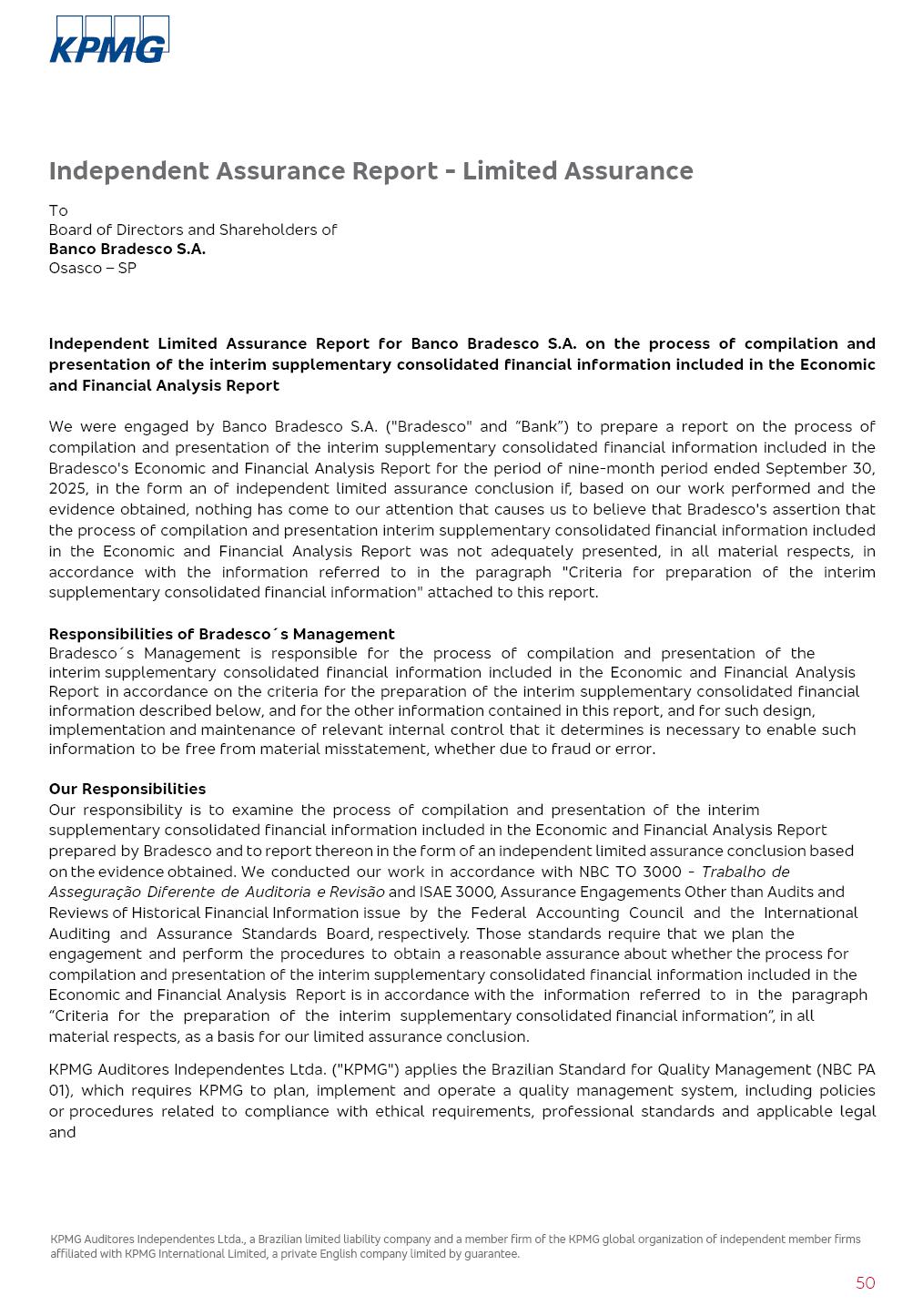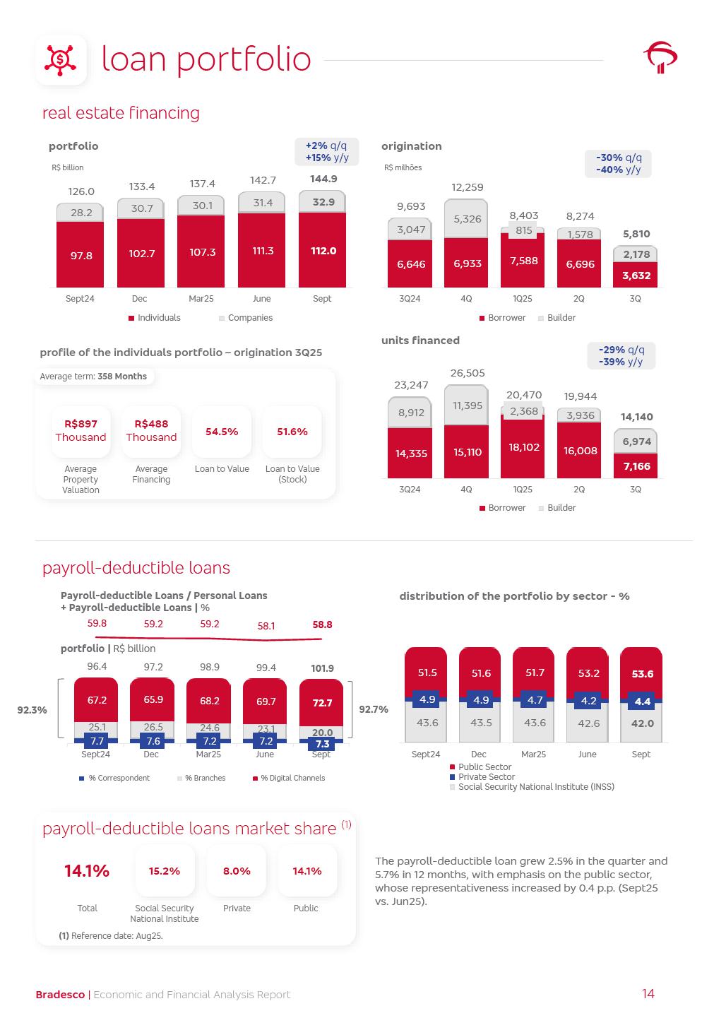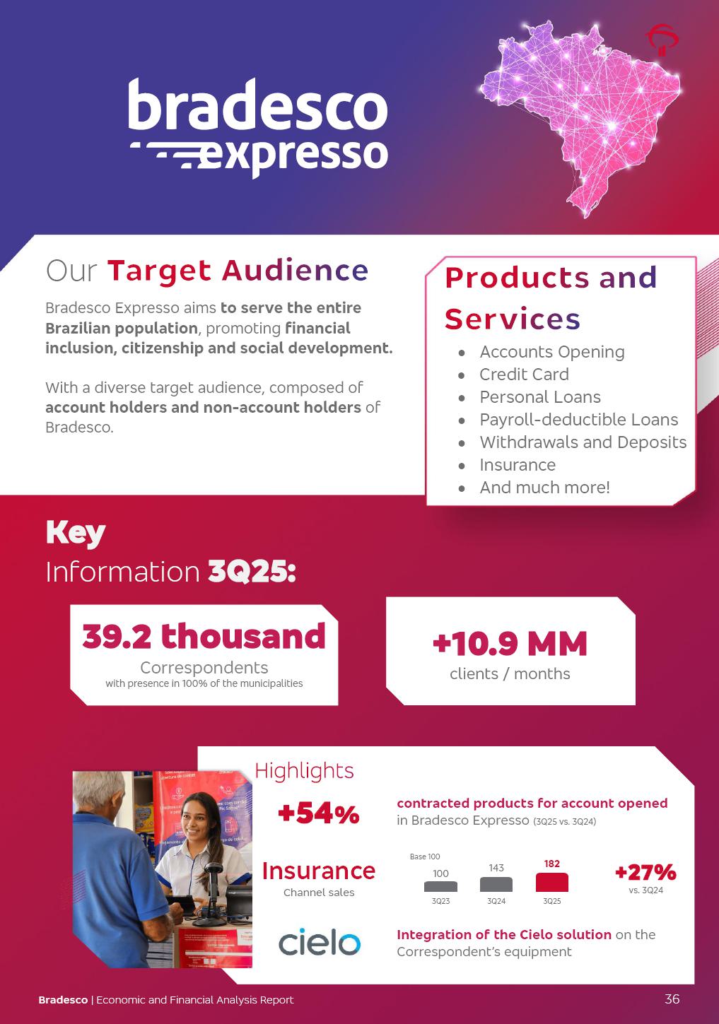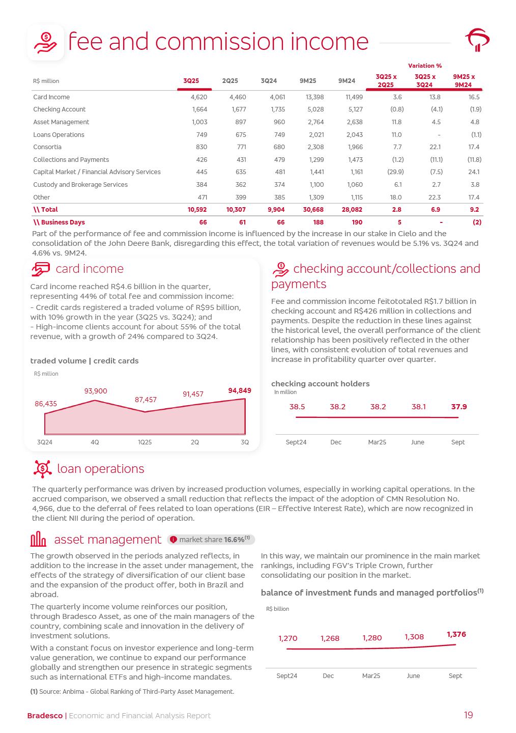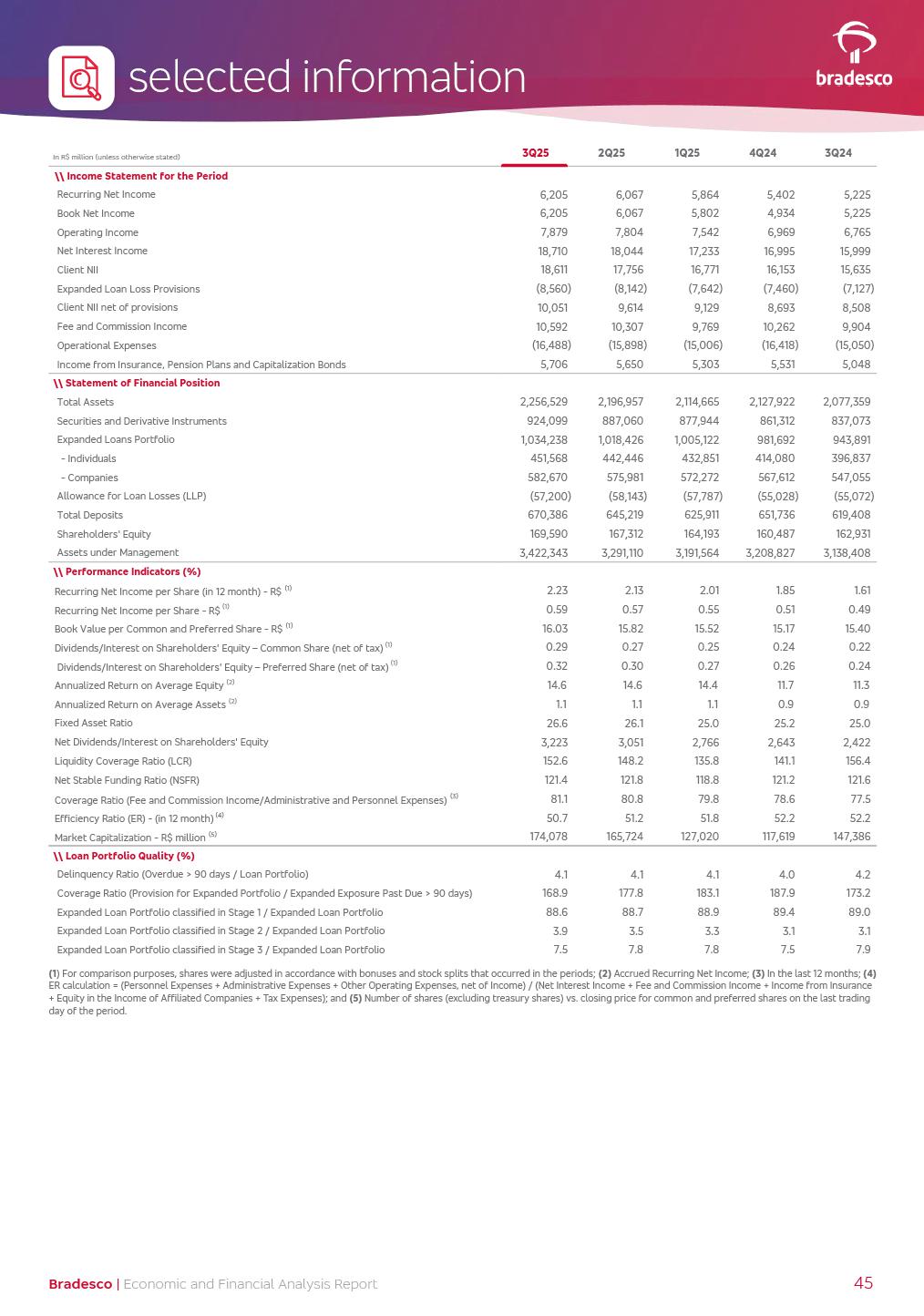 click on the items below to navigate through the document: 3Q25 managerial analysis of results management report consolidated financial statements videoconference commenting on the results October 30th at 9:30 AM (US Eastern Time) economic and financial analysis reportBradesco | Economic and Financial Analysis Report 3 Table of Contents Managerial Analysis of Results 5 press release 6 highlights 3Q25 7 recurring net income statement 8 net interest income 9 funding sources 10 loan portfolio 11 expenses with expanded loan loss provisions 16 loan indicators 17 fee and commission income 19 operating expenses 21 Bradesco Seguros 22 basel 27 guidance, indicators & economic perspectives 28 Additional Information 29 corporate strategy | customer-centric 30 NPS 31 our people 32 sustainability 33 digital in figures | BIA 34 Bradesco Principal 35 Bradesco Expresso 36 international operations | My Account 37 Bradesco Bank 38 Ágora Investimentos 39 Digio | next 40 service points, clients and market share 41 return to shareholders 42 additional information 43 selected information 45 consolidated balance sheet – Bradesco 46 consolidated balance sheet – Insurance 47 statement of income – managerial vs. recurring | BRGAAP vs. IFRS comparative 48 Independent Auditor’s Report 49 Consolidated Financial Statements 53 Bradesco | Economic and Financial Analysis Report 4 Some numbers included in this Report have been subjected to rounding adjustments. As a result, some amounts indicated as total amounts in some charts may not be the arithmetic sum of the preceding numbers. Percentage variations not presented in the framework of this report, are related, in their majority, to the low value balances compared with the other periods presented. As of January 2025, we adopted in our Financial Statements the new accounting practices established by CMN Resolutions No. 4,966 and No. 4,975. For management purposes, we kept the information of the previous periods as already disclosed, which do not present relevant differences in the historical analysis of the results. For some credit indicators, when mentioned, we carry out historical data for comparability purposes on a pro-forma basis. In our financial statements the Organization opted for the exemption provided by the Standard not to resubmit comparative information from previous periods resulting from the changes. Managerial Analysis of Results Bradesco | Economic and Financial Analysis Report 6 press release Bradesco is undergoing a transformation, fueling a continued positive performance. In the third quarter of the year, we took another step in boosting our profitability. We continue with the same commercial traction, while keeping delinquency indicators under control, prioritizing risk-adjusted returns. The transformation is advancing, supporting our evolution and enhancing our long-term competitiveness. Recurring net income was R$6.2 billion in 3Q25, an increase of 2.3% q/q and 18.8% y/y. As a result, ROAE topped 14.7% in the quarter. Total revenue reached R$35.0 billion in the quarter, increasing by 3.0% q/q and 13.1% y/y, driven by an expressive performance across all lines: net interest income, fee and commission income and income from insurance. The NII reached R$18.7 billion in the quarter, up by 3.7% q/q and 16.9% y/y. Client NII totaled R$18.6 billion, up by 4.8% q/q and 19.0% y/y, mainly driven by the increase in the loan portfolio and the average spread, which improved from 8.8% in 2Q25 to 9.0% in 3Q25, benefiting from higher efficiency in funding. Market NII was R$99 million in 3Q25, decreasing from the previous quarter, as expected. The expanded loan portfolio grew by 9.6% y/y and 1.6% q/q in Sept25, driven by the MSME and Individual segments. It is worth highlighting the increase in the share of secured credit lines, which went from 58.5% in Jun25 to 59.5% in Sept25. In terms of MSME, products such as receivables discounting and working capital loans (FGI and FGO - government-backed guarantee funds) stand out, and for Individuals, in payroll-deductible loans, rural loans, and high-income credit card lines. In September 2025, the delinquency ratio (over 90 days NPL) remained stable at 4.1%. Delinquency in MSME posted an improvement of 0.6 p.p. q/q, reflecting the quality of recent vintages, while Individuals loan indicator was impacted by the higher level of delays in John Deere Bank operations, which are collateralized and subject to a distinct recovery timeline. The cost of credit increased slightly, from 3.2% in 2Q25 to 3.3% in 3Q25, reflecting an increase of provisions for specific wholesale cases and John Deere Bank. We highlight the decrease of R$1.8 billion in the restructured portfolio against the previous quarter and of R$8.2 billion in the annual comparison. The quality of our credit portfolio showed improvement, being that stage 1 loan participation rose 30 bps while stage 3 fell 20 bps, resulting from better originations and the sequential cleanup of problematic assets. Fee and commission income increased by 2.8% q/q and 6.9% y/y. The positive standouts over the quarter included fees from consortia, cards, loan operations and asset management. Once again, the operational performance of insurance activities was significant, with income from insurance operations reaching of R$5.7 billion (1.0% q/q and 13.0% y/y) and net income of R$2.5 billion (10.3% q/q and 6.5% y/y). The ROAE of the insurance company was 22.4% in 3Q25. Operating expenses increased by 3.7% q/q and 9.6% y/y, in line with expectations. This growth rate largely reflects the investments being made in the bank and its affiliates. Analyzing only personnel and administrative expenses, there was a 5.5% y/y growth in 3Q25, which shrinks to 2.5% when we exclude the profit-sharing expenses, below inflation of 5.2% for the period, underlining the strong cost-control measures currently in place within the Organization. With that, we maintained our efficiency ratio stable at abou