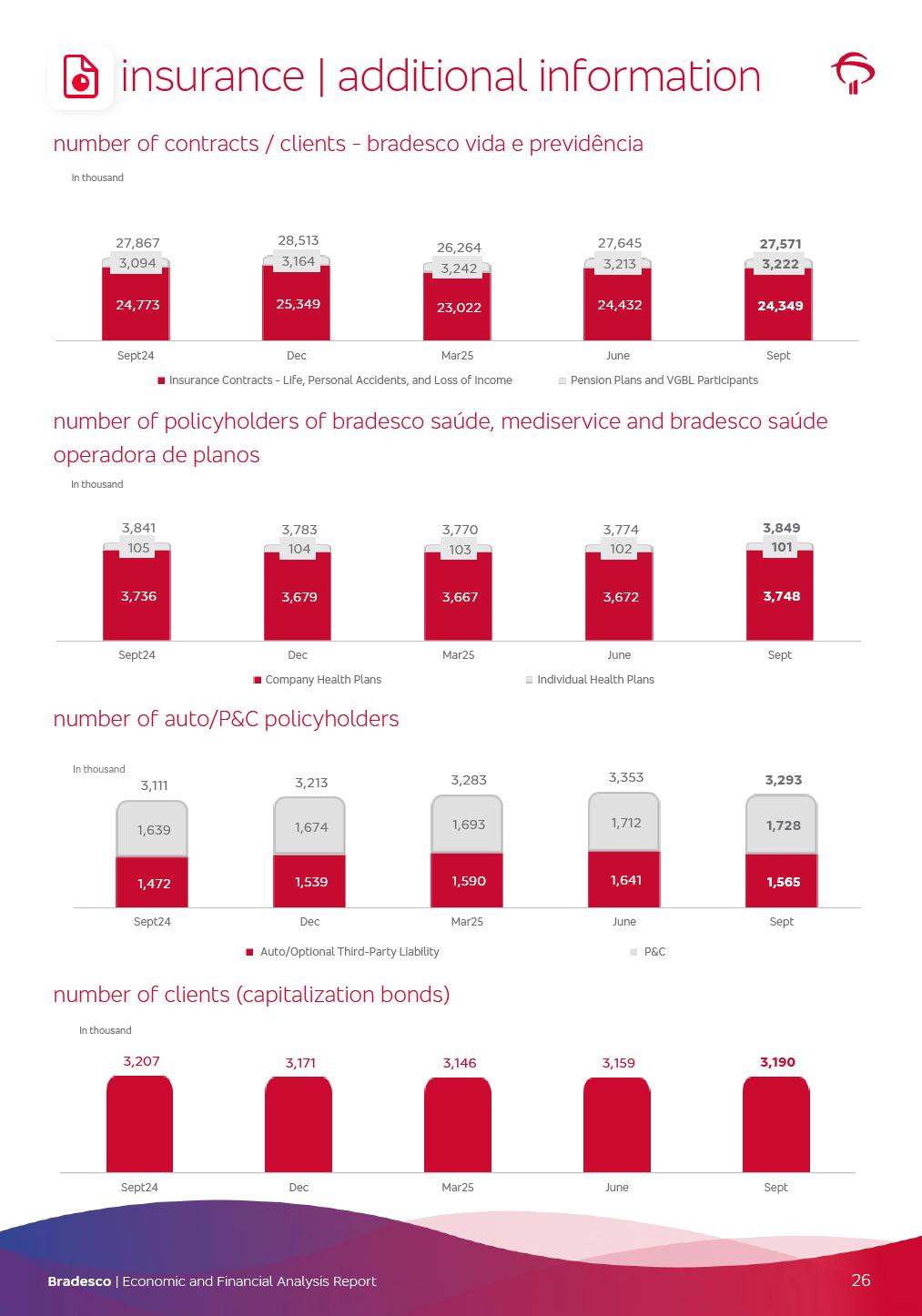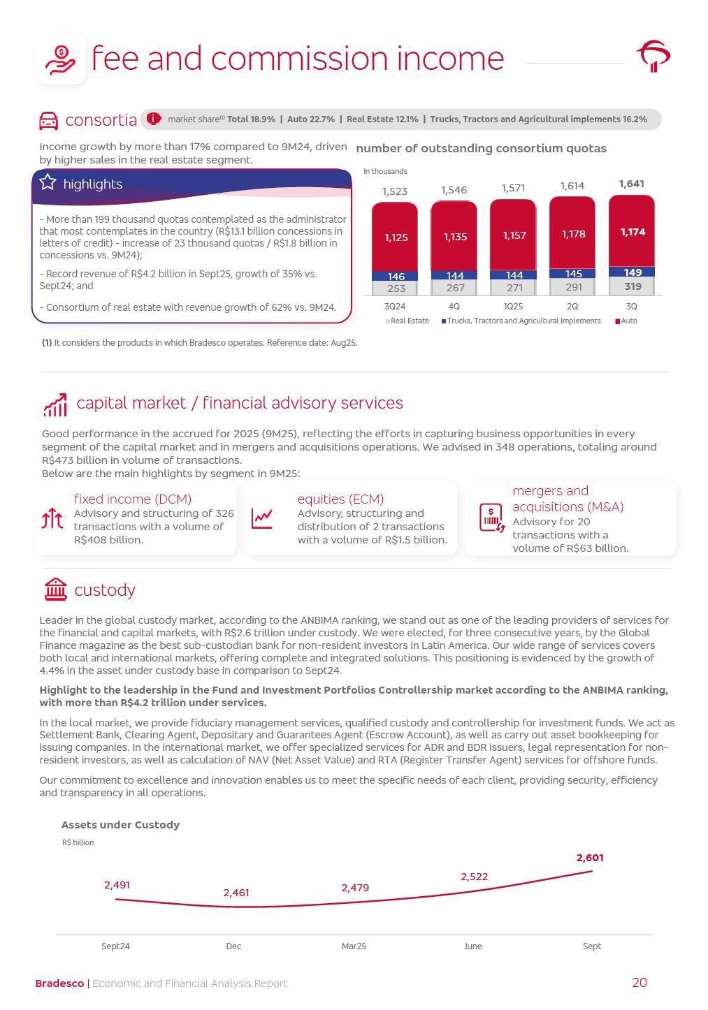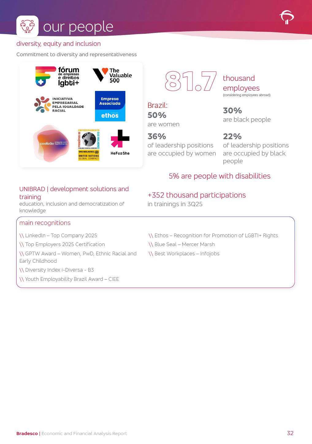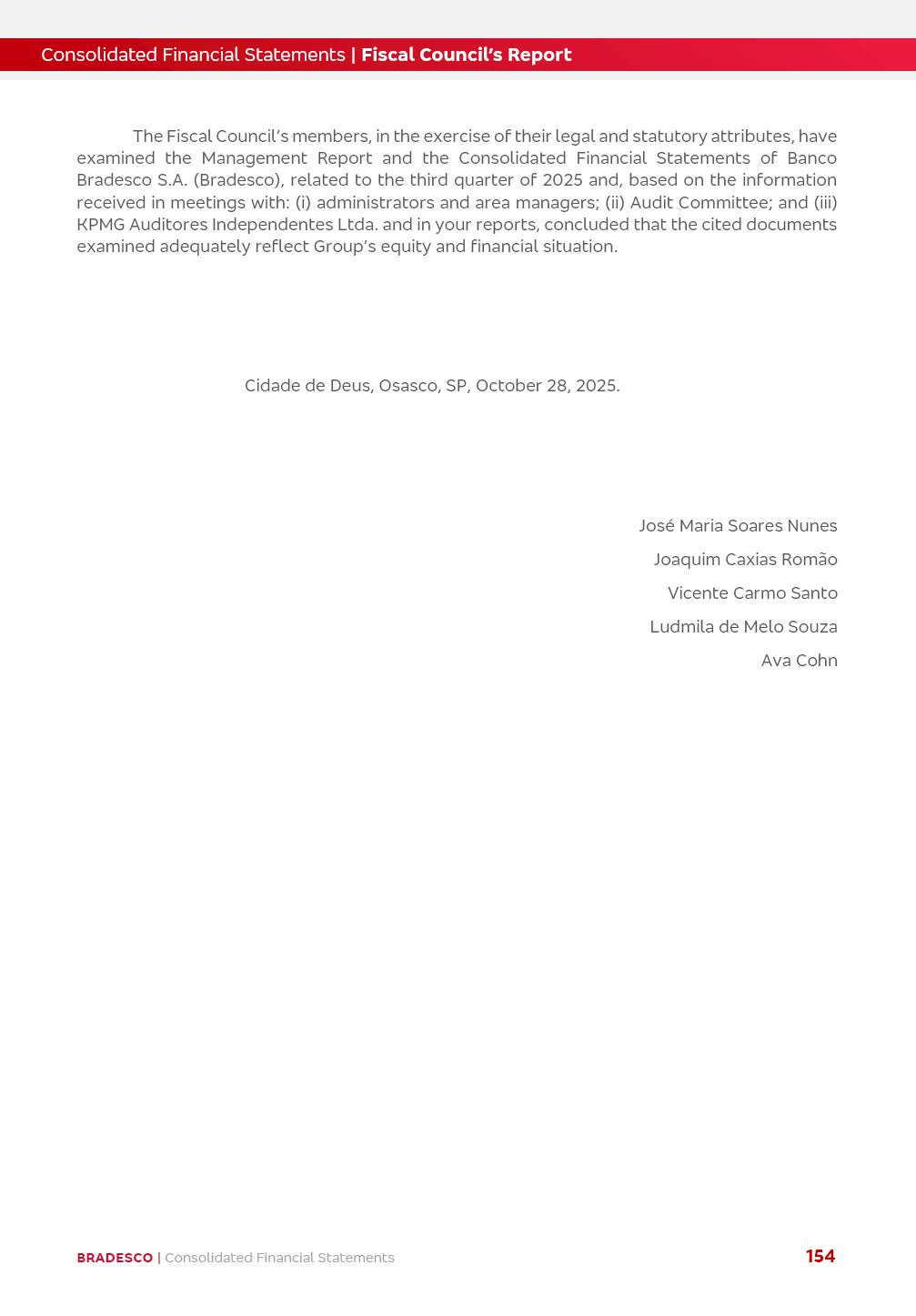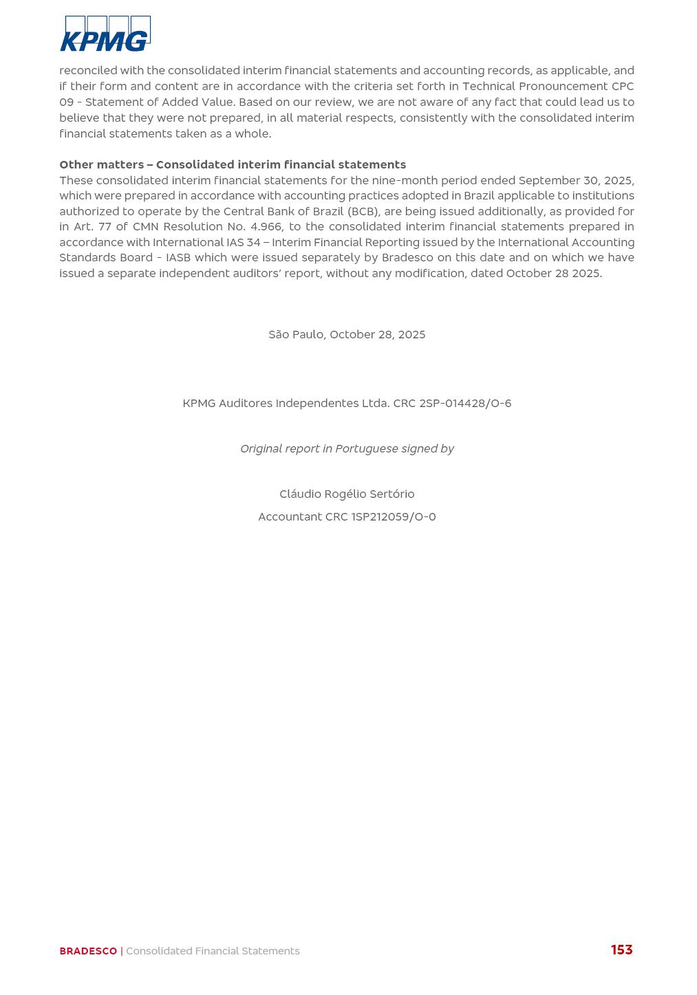 click on the items below to navigate through the document: 3Q25 managerial analysis of results management report consolidated financial statements videoconference commenting on the results October 30th at 9:30 AM (US Eastern Time) economic and financial analysis reportBradesco | Economic and Financial Analysis Report 3 Table of Contents Managerial Analysis of Results 5 press release 6 highlights 3Q25 7 recurring net income statement 8 net interest income 9 funding sources 10 loan portfolio 11 expenses with expanded loan loss provisions 16 loan indicators 17 fee and commission income 19 operating expenses 21 Bradesco Seguros 22 basel 27 guidance, indicators & economic perspectives 28 Additional Information 29 corporate strategy | customer-centric 30 NPS 31 our people 32 sustainability 33 digital in figures | BIA 34 Bradesco Principal 35 Bradesco Expresso 36 international operations | My Account 37 Bradesco Bank 38 Ágora Investimentos 39 Digio | next 40 service points, clients and market share 41 return to shareholders 42 additional information 43 selected information 45 consolidated balance sheet – Bradesco 46 consolidated balance sheet – Insurance 47 statement of income – managerial vs. recurring | BRGAAP vs. IFRS comparative 48 Independent Auditor’s Report 49 Consolidated Financial Statements 53 Bradesco | Economic and Financial Analysis Report 4 Some numbers included in this Report have been subjected to rounding adjustments. As a result, some amounts indicated as total amounts in some charts may not be the arithmetic sum of the preceding numbers. Percentage variations not presented in the framework of this report, are related, in their majority, to the low value balances compared with the other periods presented. As of January 2025, we adopted in our Financial Statements the new accounting practices established by CMN Resolutions No. 4,966 and No. 4,975. For management purposes, we kept the information of the previous periods as already disclosed, which do not present relevant differences in the historical analysis of the results. For some credit indicators, when mentioned, we carry out historical data for comparability purposes on a pro-forma basis. In our financial statements the Organization opted for the exemption provided by the Standard not to resubmit comparative information from previous periods resulting from the changes. Managerial Analysis of Results Bradesco | Economic and Financial Analysis Report 6 press release Bradesco is undergoing a transformation, fueling a continued positive performance. In the third quarter of the year, we took another step in boosting our profitability. We continue with the same commercial traction, while keeping delinquency indicators under control, prioritizing risk-adjusted returns. The transformation is advancing, supporting our evolution and enhancing our long-term competitiveness. Recurring net income was R$6.2 billion in 3Q25, an increase of 2.3% q/q and 18.8% y/y. As a result, ROAE topped 14.7% in the quarter. Total revenue reached R$35.0 billion in the quarter, increasing by 3.0% q/q and 13.1% y/y, driven by an expressive performance across all lines: net interest income, fee and commission income and income from insurance. The NII reached R$18.7 billion in the quarter, up by 3.7% q/q and 16.9% y/y. Client NII totaled R$18.6 billion, up by 4.8% q/q and 19.0% y/y, mainly driven by the increase in the loan portfolio and the average spread, which improved from 8.8% in 2Q25 to 9.0% in 3Q25, benefiting from higher efficiency in funding. Market NII was R$99 million in 3Q25, decreasing from the previous quarter, as expected. The expanded loan portfolio grew by 9.6% y/y and 1.6% q/q in Sept25, driven by the MSME and Individual segments. It is worth highlighting the increase in the share of secured credit lines, which went from 58.5% in Jun25 to 59.5% in Sept25. In terms of MSME, products such as receivables discounting and working capital loans (FGI and FGO - government-backed guarantee funds) stand out, and for Individuals, in payroll-deductible loans, rural loans, and high-income credit card lines. In September 2025, the delinquency ratio (over 90 days NPL) remained stable at 4.1%. Delinquency in MSME posted an improvement of 0.6 p.p. q/q, reflecting the quality of recent vintages, while Individuals loan indicator was impacted by the higher level of delays in John Deere Bank operations, which are collateralized and subject to a distinct recovery timeline. The cost of credit increased slightly, from 3.2% in 2Q25 to 3.3% in 3Q25, reflecting an increase of provisions for specific wholesale cases and John Deere Bank. We highlight the decrease of R$1.8 billion in the restructured portfolio against the previous quarter and of R$8.2 billion in the annual comparison. The quality of our credit portfolio showed improvement, being that stage 1 loan participation rose 30 bps while stage 3 fell 20 bps, resulting from better originations and the sequential cleanup of problematic assets. Fee and commission income increased by 2.8% q/q and 6.9% y/y. The positive standouts over the quarter included fees from consortia, cards, loan operations and asset management. Once again, the operational performance of insurance activities was significant, with income from insurance operations reaching of R$5.7 billion (1.0% q/q and 13.0% y/y) and net income of R$2.5 billion (10.3% q/q and 6.5% y/y). The ROAE of the insurance company was 22.4% in 3Q25. Operating expenses increased by 3.7% q/q and 9.6% y/y, in line with expectations. This growth rate largely reflects the investments being made in the bank and its affiliates. Analyzing only personnel and administrative expenses, there was a 5.5% y/y growth in 3Q25, which shrinks to 2.5% when we exclude the profit-sharing expenses, below inflation of 5.2% for the period, underlining the strong cost-control measures currently in place within the Organization. With that, we maintained our efficiency ratio stable at abou