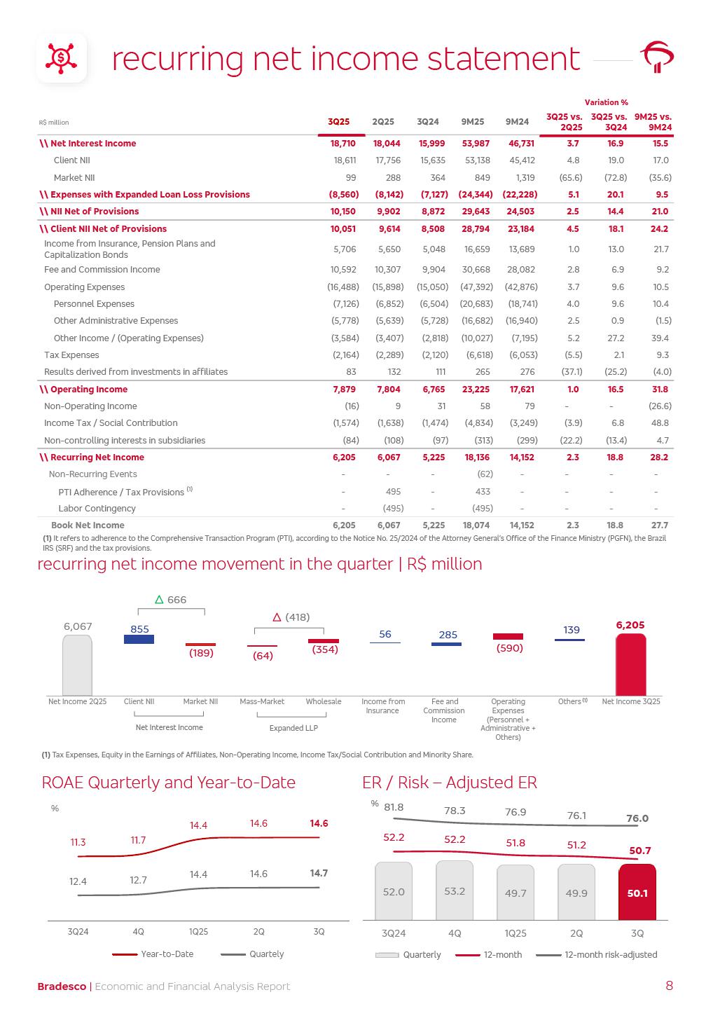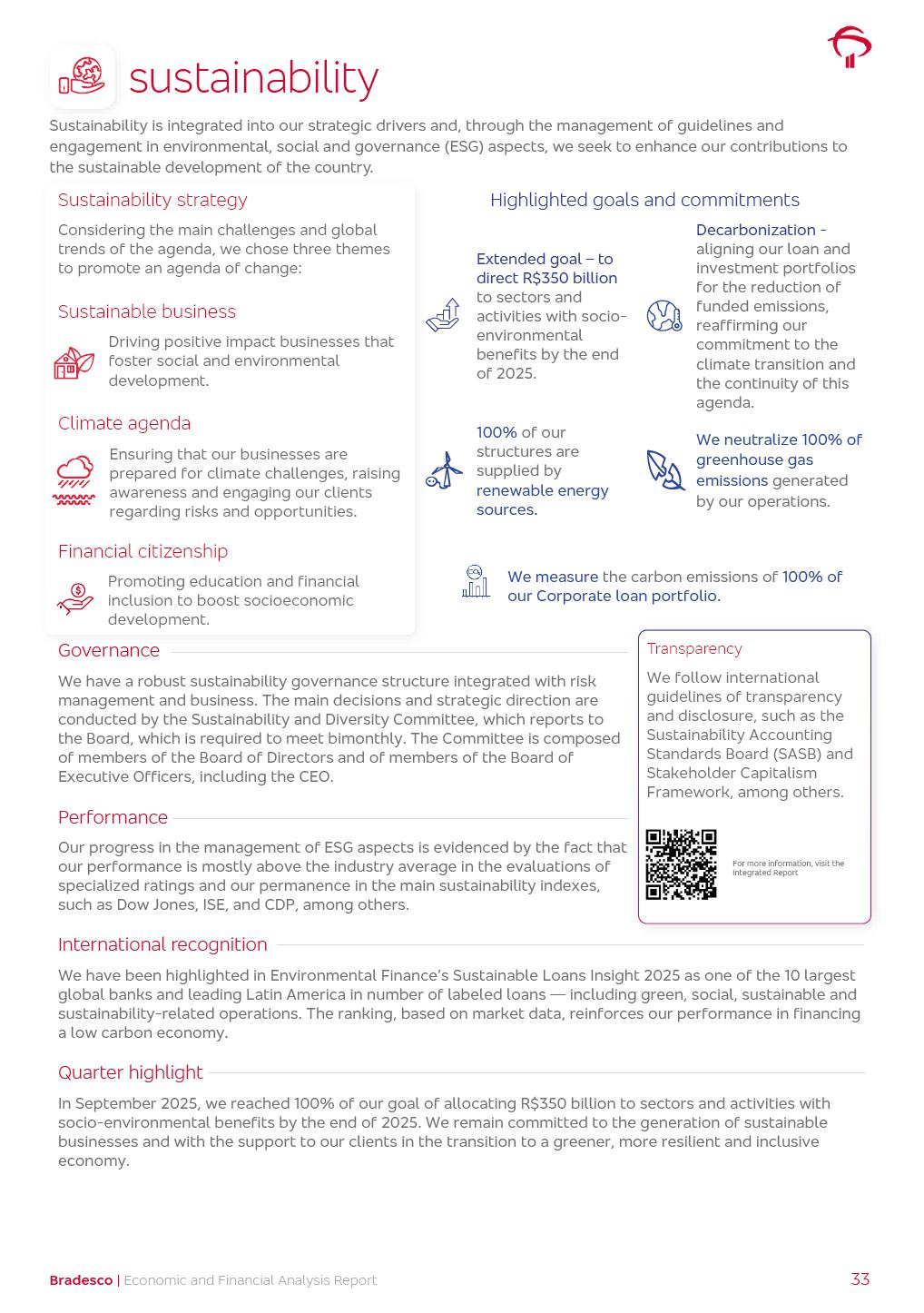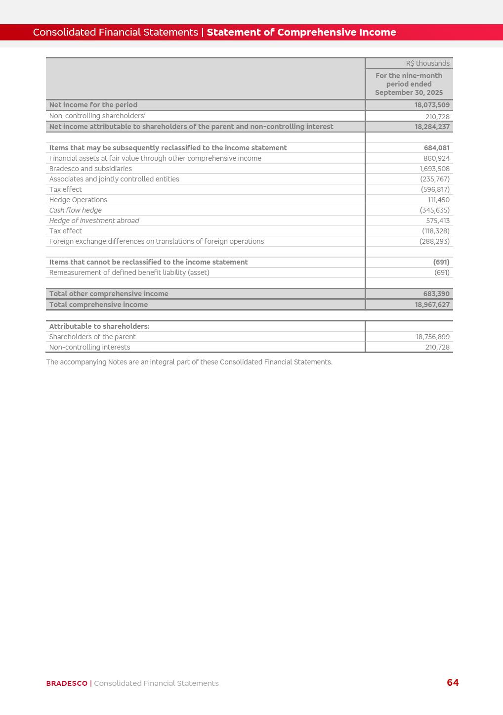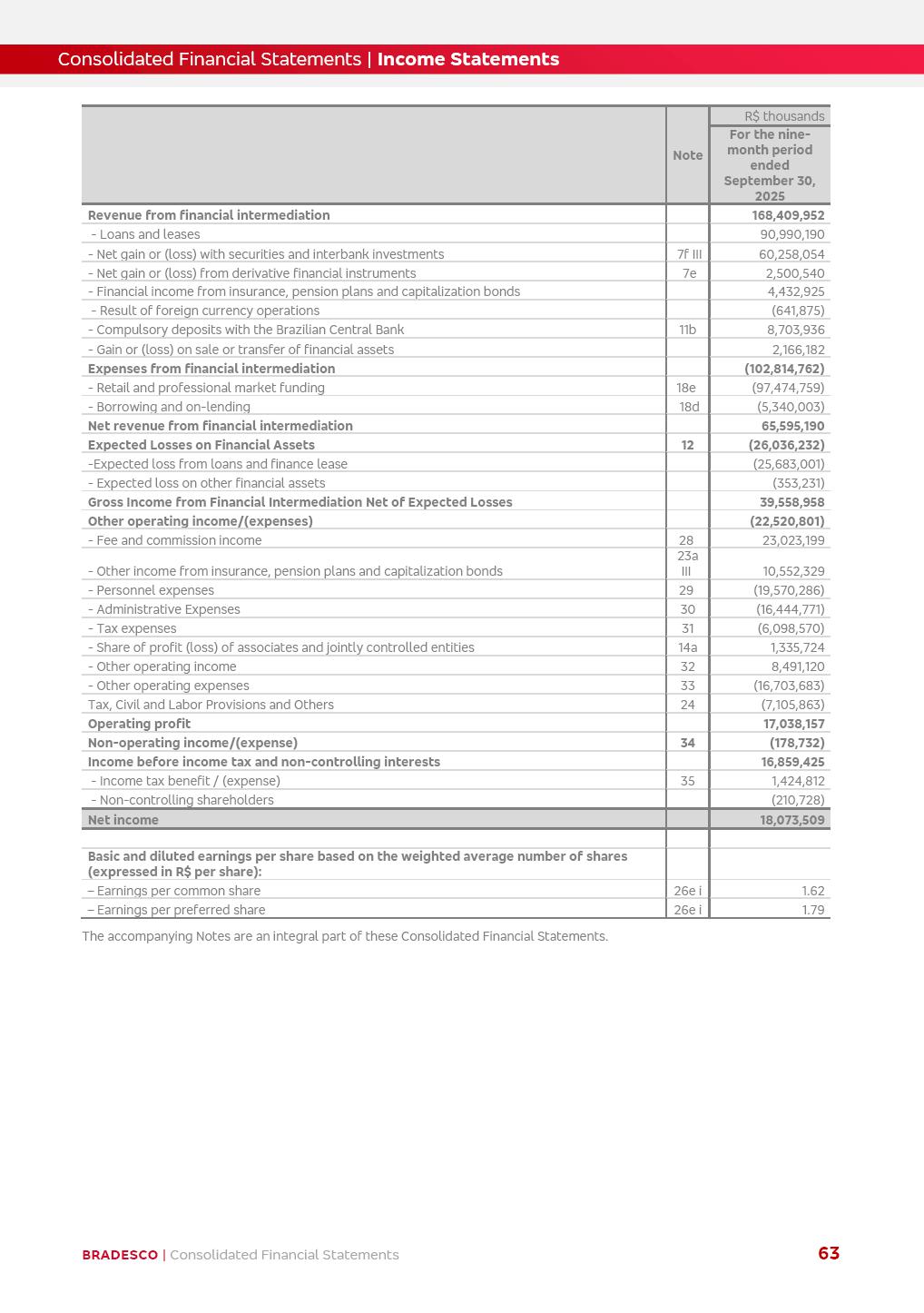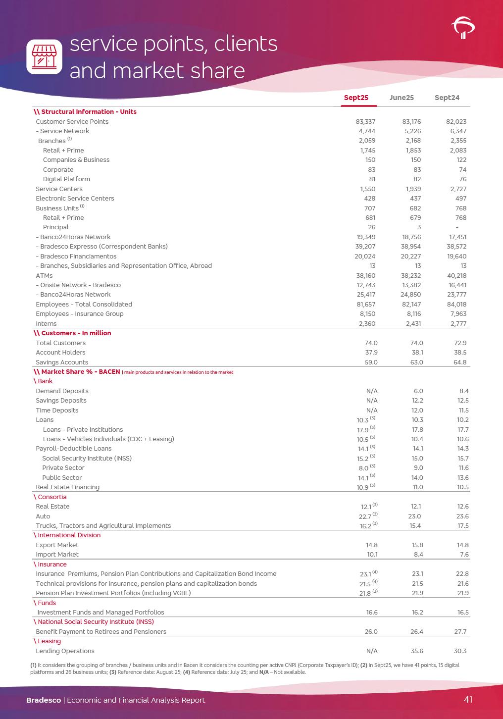 click on the items below to navigate through the document: 3Q25 managerial analysis of results management report consolidated financial statements videoconference commenting on the results October 30th at 9:30 AM (US Eastern Time) economic and financial analysis reportBradesco | Economic and Financial Analysis Report 3 Table of Contents Managerial Analysis of Results 5 press release 6 highlights 3Q25 7 recurring net income statement 8 net interest income 9 funding sources 10 loan portfolio 11 expenses with expanded loan loss provisions 16 loan indicators 17 fee and commission income 19 operating expenses 21 Bradesco Seguros 22 basel 27 guidance, indicators & economic perspectives 28 Additional Information 29 corporate strategy | customer-centric 30 NPS 31 our people 32 sustainability 33 digital in figures | BIA 34 Bradesco Principal 35 Bradesco Expresso 36 international operations | My Account 37 Bradesco Bank 38 Ágora Investimentos 39 Digio | next 40 service points, clients and market share 41 return to shareholders 42 additional information 43 selected information 45 consolidated balance sheet – Bradesco 46 consolidated balance sheet – Insurance 47 statement of income – managerial vs. recurring | BRGAAP vs. IFRS comparative 48 Independent Auditor’s Report 49 Consolidated Financial Statements 53 Bradesco | Economic and Financial Analysis Report 4 Some numbers included in this Report have been subjected to rounding adjustments. As a result, some amounts indicated as total amounts in some charts may not be the arithmetic sum of the preceding numbers. Percentage variations not presented in the framework of this report, are related, in their majority, to the low value balances compared with the other periods presented. As of January 2025, we adopted in our Financial Statements the new accounting practices established by CMN Resolutions No. 4,966 and No. 4,975. For management purposes, we kept the information of the previous periods as already disclosed, which do not present relevant differences in the historical analysis of the results. For some credit indicators, when mentioned, we carry out historical data for comparability purposes on a pro-forma basis. In our financial statements the Organization opted for the exemption provided by the Standard not to resubmit comparative information from previous periods resulting from the changes. Managerial Analysis of Results Bradesco | Economic and Financial Analysis Report 6 press release Bradesco is undergoing a transformation, fueling a continued positive performance. In the third quarter of the year, we took another step in boosting our profitability. We continue with the same commercial traction, while keeping delinquency indicators under control, prioritizing risk-adjusted returns. The transformation is advancing, supporting our evolution and enhancing our long-term competitiveness. Recurring net income was R$6.2 billion in 3Q25, an increase of 2.3% q/q and 18.8% y/y. As a result, ROAE topped 14.7% in the quarter. Total revenue reached R$35.0 billion in the quarter, increasing by 3.0% q/q and 13.1% y/y, driven by an expressive performance across all lines: net interest income, fee and commission income and income from insurance. The NII reached R$18.7 billion in the quarter, up by 3.7% q/q and 16.9% y/y. Client NII totaled R$18.6 billion, up by 4.8% q/q and 19.0% y/y, mainly driven by the increase in the loan portfolio and the average spread, which improved from 8.8% in 2Q25 to 9.0% in 3Q25, benefiting from higher efficiency in funding. Market NII was R$99 million in 3Q25, decreasing from the previous quarter, as expected. The expanded loan portfolio grew by 9.6% y/y and 1.6% q/q in Sept25, driven by the MSME and Individual segments. It is worth highlighting the increase in the share of secured credit lines, which went from 58.5% in Jun25 to 59.5% in Sept25. In terms of MSME, products such as receivables discounting and working capital loans (FGI and FGO - government-backed guarantee funds) stand out, and for Individuals, in payroll-deductible loans, rural loans, and high-income credit card lines. In September 2025, the delinquency ratio (over 90 days NPL) remained stable at 4.1%. Delinquency in MSME posted an improvement of 0.6 p.p. q/q, reflecting the quality of recent vintages, while Individuals loan indicator was impacted by the higher level of delays in John Deere Bank operations, which are collateralized and subject to a distinct recovery timeline. The cost of credit increased slightly, from 3.2% in 2Q25 to 3.3% in 3Q25, reflecting an increase of provisions for specific wholesale cases and John Deere Bank. We highlight the decrease of R$1.8 billion in the restructured portfolio against the previous quarter and of R$8.2 billion in the annual comparison. The quality of our credit portfolio showed improvement, being that stage 1 loan participation rose 30 bps while stage 3 fell 20 bps, resulting from better originations and the sequential cleanup of problematic assets. Fee and commission income increased by 2.8% q/q and 6.9% y/y. The positive standouts over the quarter included fees from consortia, cards, loan operations and asset management. Once again, the operational performance of insurance activities was significant, with income from insurance operations reaching of R$5.7 billion (1.0% q/q and 13.0% y/y) and net income of R$2.5 billion (10.3% q/q and 6.5% y/y). The ROAE of the insurance company was 22.4% in 3Q25. Operating expenses increased by 3.7% q/q and 9.6% y/y, in line with expectations. This growth rate largely reflects the investments being made in the bank and its affiliates. Analyzing only personnel and administrative expenses, there was a 5.5% y/y growth in 3Q25, which shrinks to 2.5% when we exclude the profit-sharing expenses, below inflation of 5.2% for the period, underlining the strong cost-control measures currently in place within the Organization. With that, we maintained our efficiency ratio stable at abou