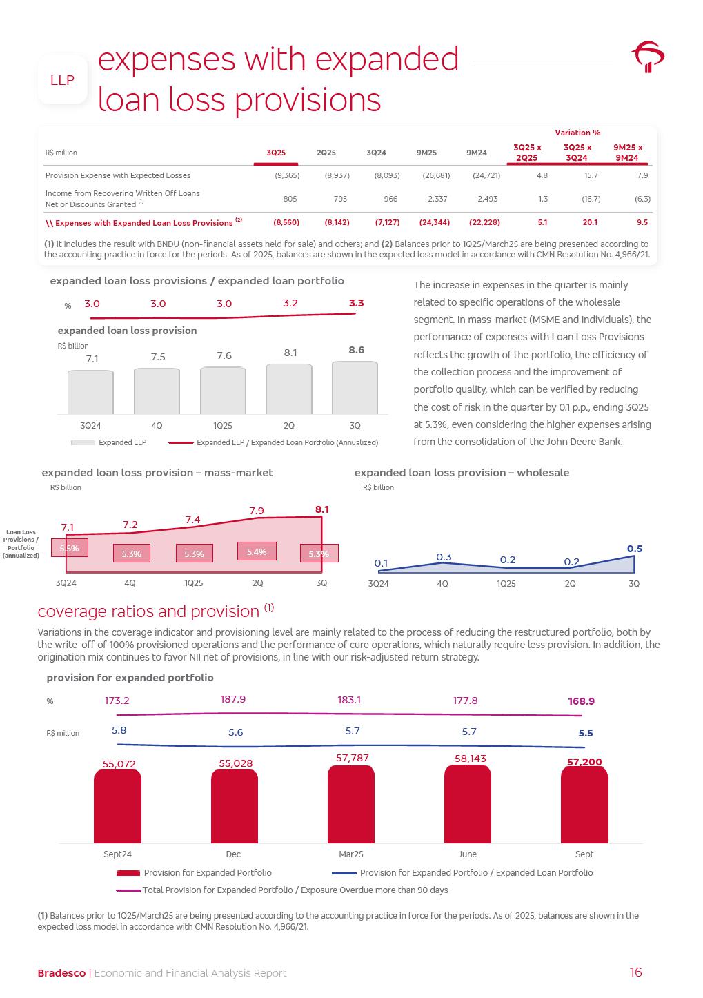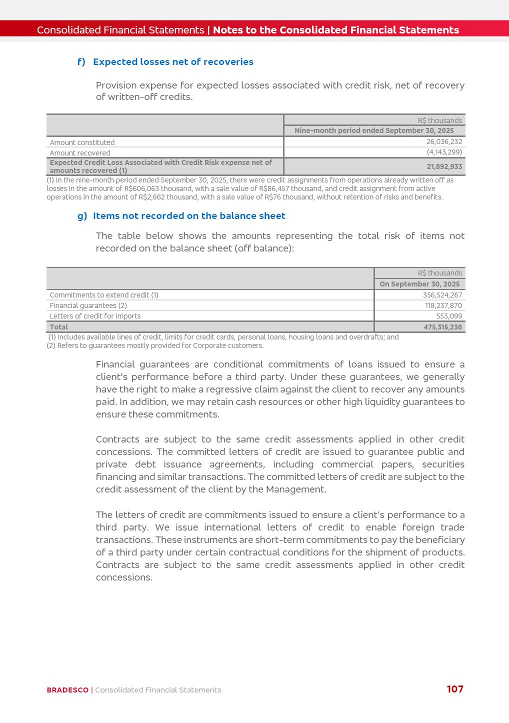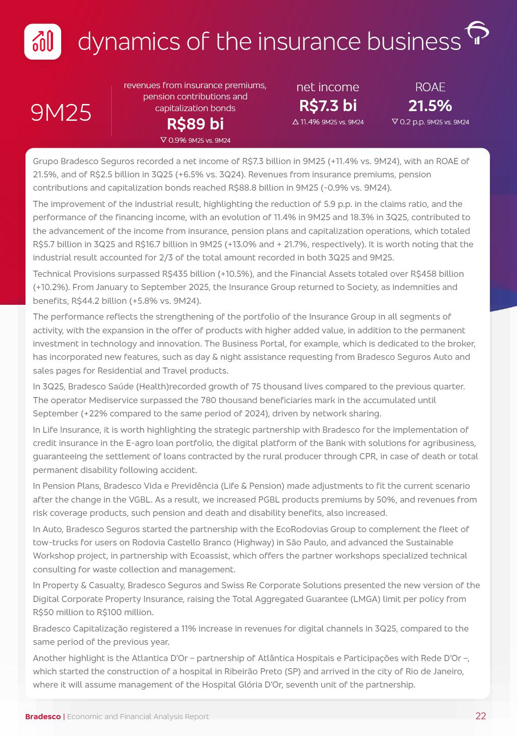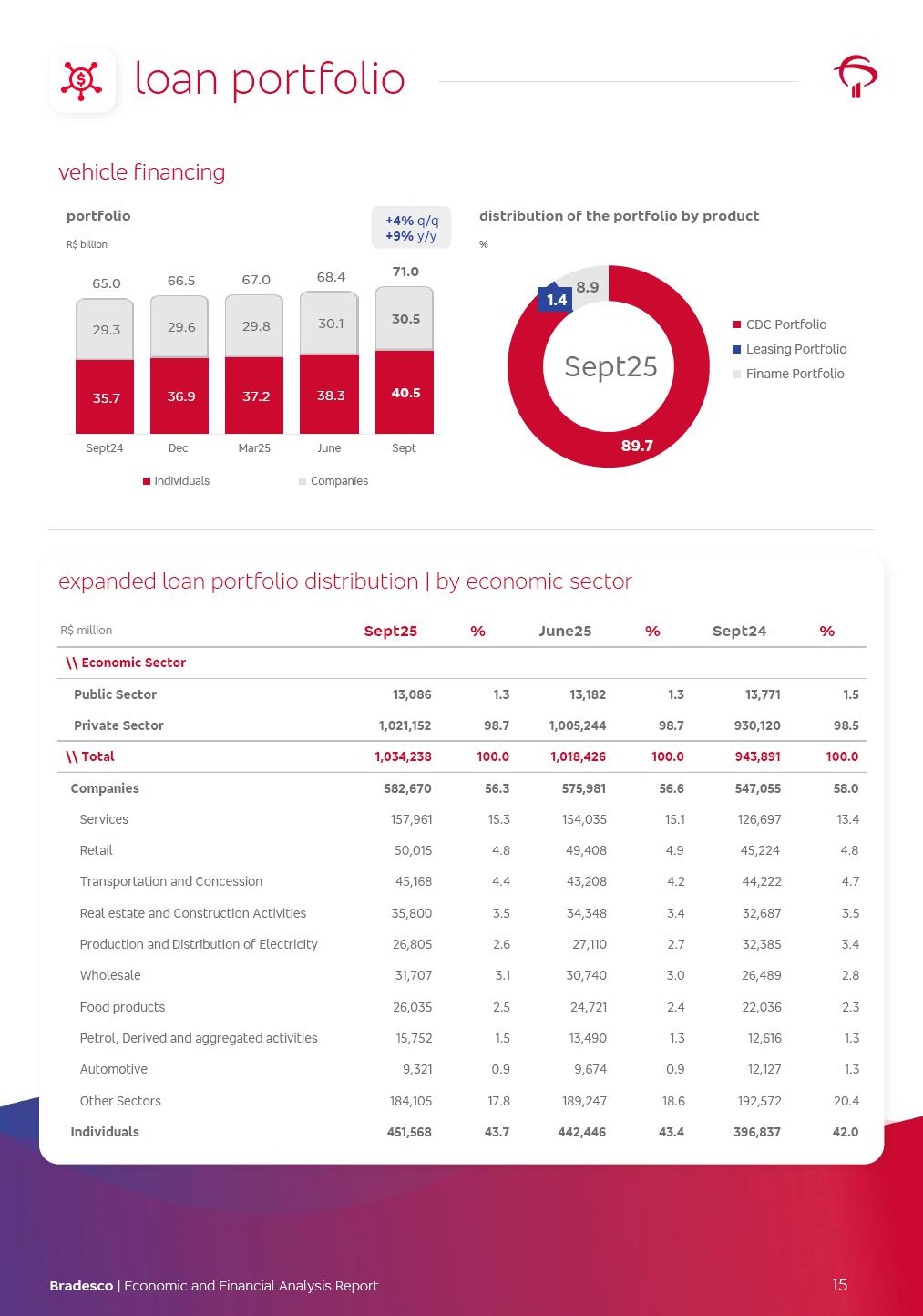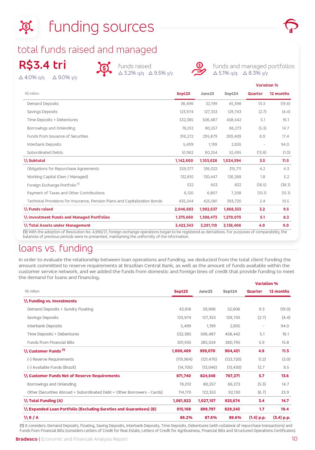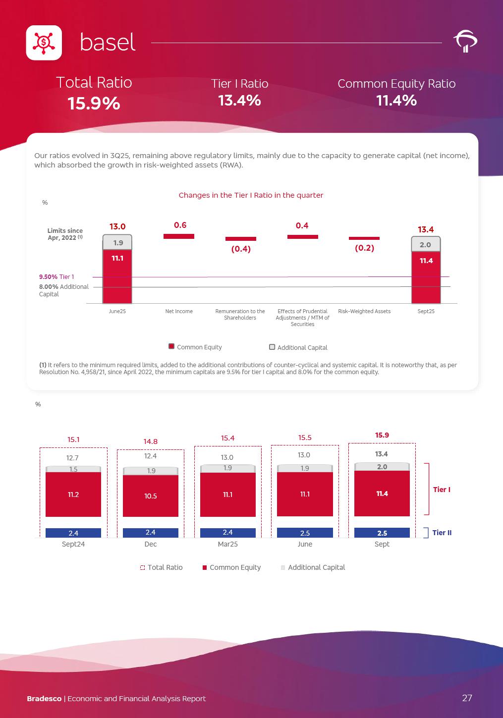 click on the items below to navigate through the document: 3Q25 managerial analysis of results management report consolidated financial statements videoconference commenting on the results October 30th at 9:30 AM (US Eastern Time) economic and financial analysis reportBradesco | Economic and Financial Analysis Report 3 Table of Contents Managerial Analysis of Results 5 press release 6 highlights 3Q25 7 recurring net income statement 8 net interest income 9 funding sources 10 loan portfolio 11 expenses with expanded loan loss provisions 16 loan indicators 17 fee and commission income 19 operating expenses 21 Bradesco Seguros 22 basel 27 guidance, indicators & economic perspectives 28 Additional Information 29 corporate strategy | customer-centric 30 NPS 31 our people 32 sustainability 33 digital in figures | BIA 34 Bradesco Principal 35 Bradesco Expresso 36 international operations | My Account 37 Bradesco Bank 38 Ágora Investimentos 39 Digio | next 40 service points, clients and market share 41 return to shareholders 42 additional information 43 selected information 45 consolidated balance sheet – Bradesco 46 consolidated balance sheet – Insurance 47 statement of income – managerial vs. recurring | BRGAAP vs. IFRS comparative 48 Independent Auditor’s Report 49 Consolidated Financial Statements 53 Bradesco | Economic and Financial Analysis Report 4 Some numbers included in this Report have been subjected to rounding adjustments. As a result, some amounts indicated as total amounts in some charts may not be the arithmetic sum of the preceding numbers. Percentage variations not presented in the framework of this report, are related, in their majority, to the low value balances compared with the other periods presented. As of January 2025, we adopted in our Financial Statements the new accounting practices established by CMN Resolutions No. 4,966 and No. 4,975. For management purposes, we kept the information of the previous periods as already disclosed, which do not present relevant differences in the historical analysis of the results. For some credit indicators, when mentioned, we carry out historical data for comparability purposes on a pro-forma basis. In our financial statements the Organization opted for the exemption provided by the Standard not to resubmit comparative information from previous periods resulting from the changes. Managerial Analysis of Results Bradesco | Economic and Financial Analysis Report 6 press release Bradesco is undergoing a transformation, fueling a continued positive performance. In the third quarter of the year, we took another step in boosting our profitability. We continue with the same commercial traction, while keeping delinquency indicators under control, prioritizing risk-adjusted returns. The transformation is advancing, supporting our evolution and enhancing our long-term competitiveness. Recurring net income was R$6.2 billion in 3Q25, an increase of 2.3% q/q and 18.8% y/y. As a result, ROAE topped 14.7% in the quarter. Total revenue reached R$35.0 billion in the quarter, increasing by 3.0% q/q and 13.1% y/y, driven by an expressive performance across all lines: net interest income, fee and commission income and income from insurance. The NII reached R$18.7 billion in the quarter, up by 3.7% q/q and 16.9% y/y. Client NII totaled R$18.6 billion, up by 4.8% q/q and 19.0% y/y, mainly driven by the increase in the loan portfolio and the average spread, which improved from 8.8% in 2Q25 to 9.0% in 3Q25, benefiting from higher efficiency in funding. Market NII was R$99 million in 3Q25, decreasing from the previous quarter, as expected. The expanded loan portfolio grew by 9.6% y/y and 1.6% q/q in Sept25, driven by the MSME and Individual segments. It is worth highlighting the increase in the share of secured credit lines, which went from 58.5% in Jun25 to 59.5% in Sept25. In terms of MSME, products such as receivables discounting and working capital loans (FGI and FGO - government-backed guarantee funds) stand out, and for Individuals, in payroll-deductible loans, rural loans, and high-income credit card lines. In September 2025, the delinquency ratio (over 90 days NPL) remained stable at 4.1%. Delinquency in MSME posted an improvement of 0.6 p.p. q/q, reflecting the quality of recent vintages, while Individuals loan indicator was impacted by the higher level of delays in John Deere Bank operations, which are collateralized and subject to a distinct recovery timeline. The cost of credit increased slightly, from 3.2% in 2Q25 to 3.3% in 3Q25, reflecting an increase of provisions for specific wholesale cases and John Deere Bank. We highlight the decrease of R$1.8 billion in the restructured portfolio against the previous quarter and of R$8.2 billion in the annual comparison. The quality of our credit portfolio showed improvement, being that stage 1 loan participation rose 30 bps while stage 3 fell 20 bps, resulting from better originations and the sequential cleanup of problematic assets. Fee and commission income increased by 2.8% q/q and 6.9% y/y. The positive standouts over the quarter included fees from consortia, cards, loan operations and asset management. Once again, the operational performance of insurance activities was significant, with income from insurance operations reaching of R$5.7 billion (1.0% q/q and 13.0% y/y) and net income of R$2.5 billion (10.3% q/q and 6.5% y/y). The ROAE of the insurance company was 22.4% in 3Q25. Operating expenses increased by 3.7% q/q and 9.6% y/y, in line with expectations. This growth rate largely reflects the investments being made in the bank and its affiliates. Analyzing only personnel and administrative expenses, there was a 5.5% y/y growth in 3Q25, which shrinks to 2.5% when we exclude the profit-sharing expenses, below inflation of 5.2% for the period, underlining the strong cost-control measures currently in place within the Organization. With that, we maintained our efficiency ratio stable at abou
