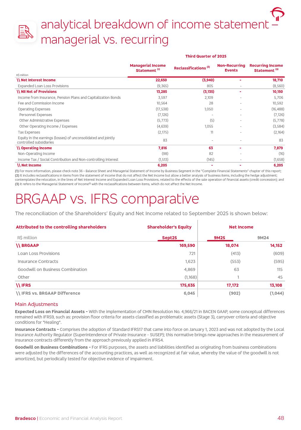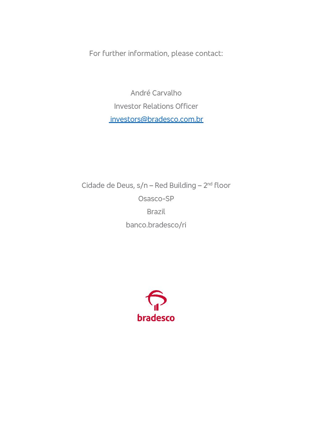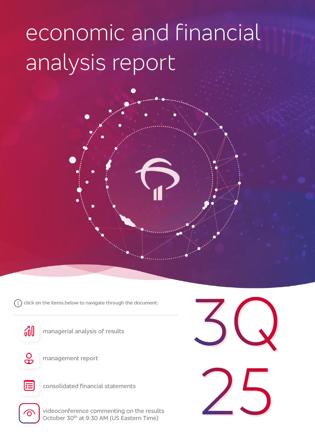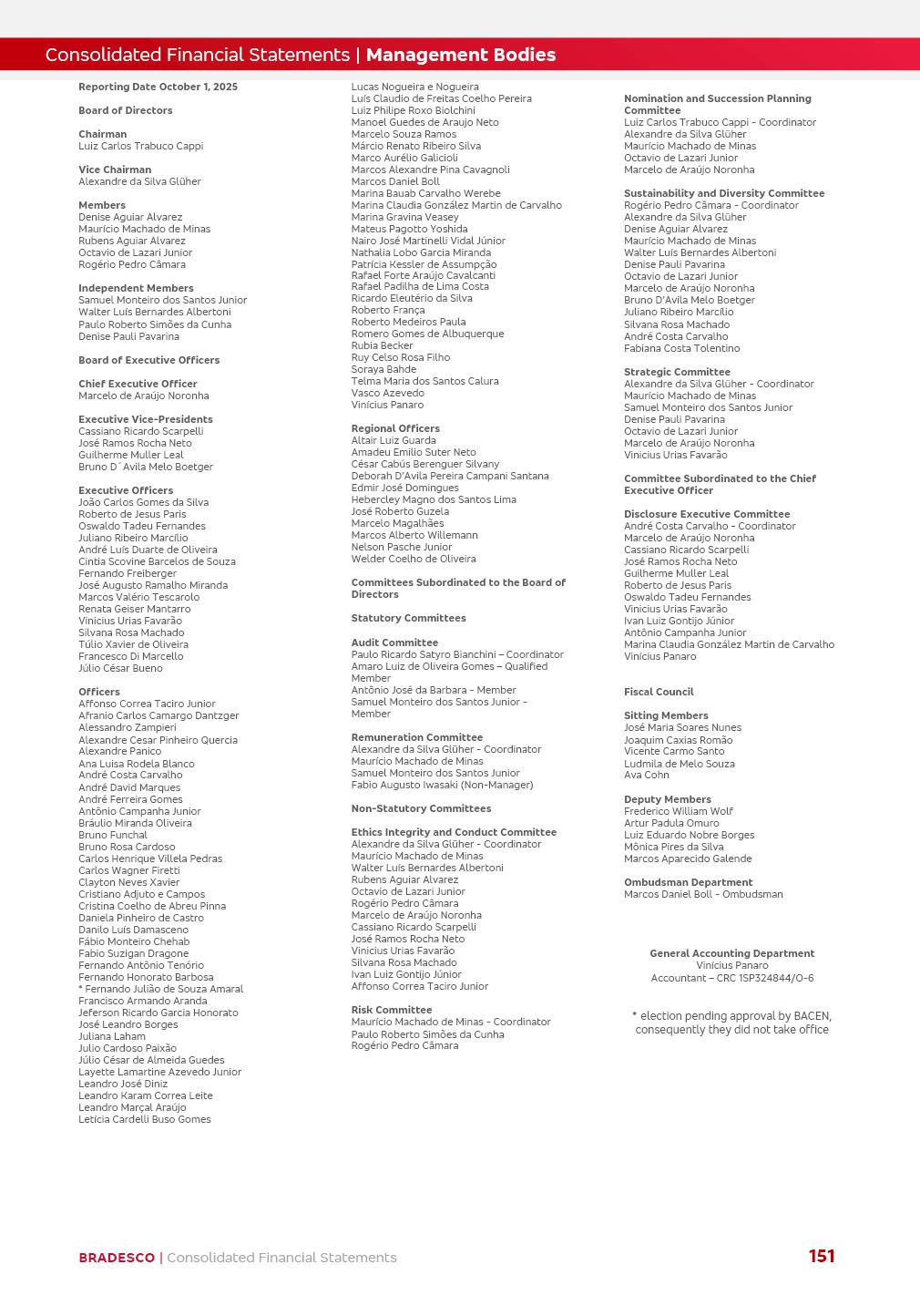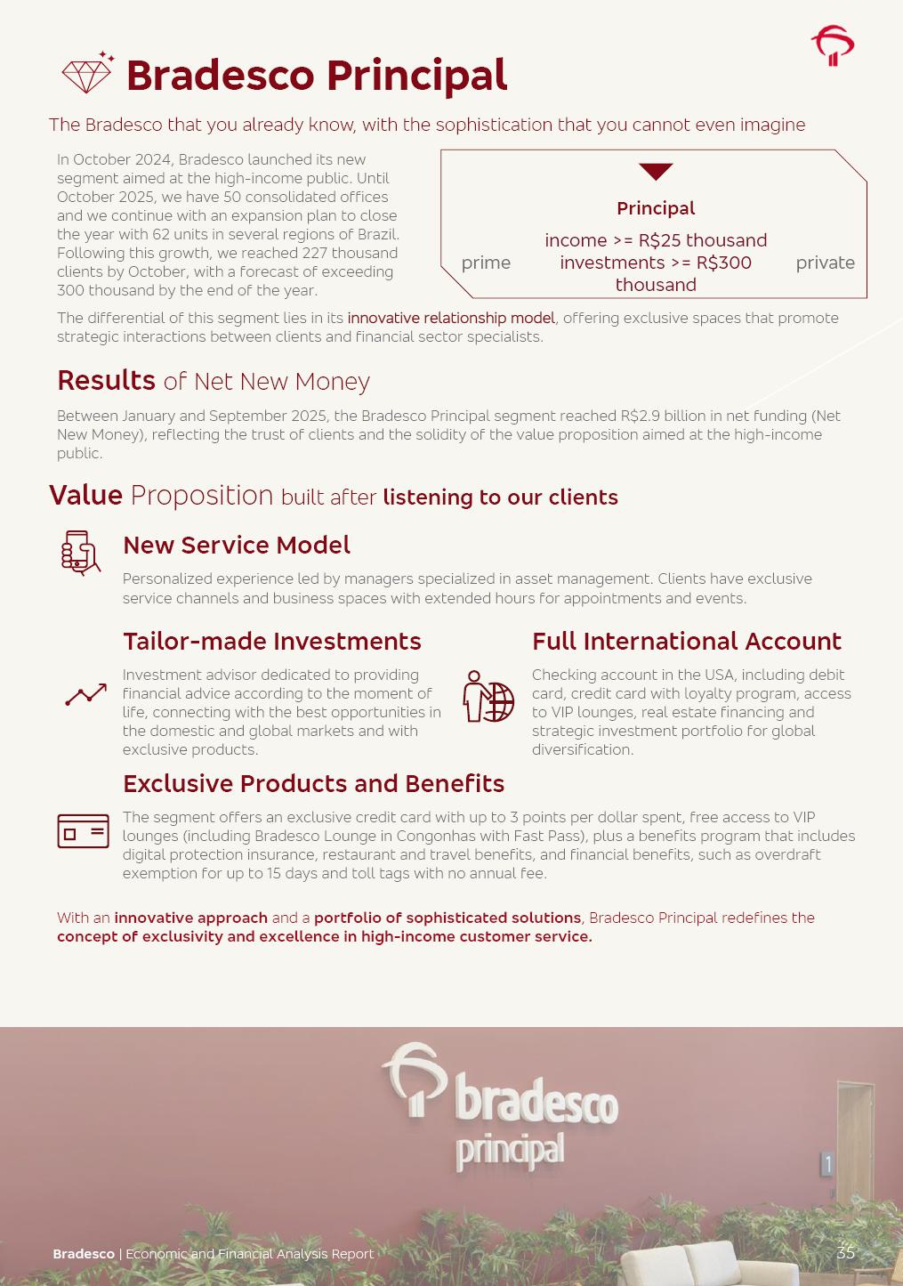 click on the items below to navigate through the document: 3Q25 managerial analysis of results management report consolidated financial statements videoconference commenting on the results October 30th at 9:30 AM (US Eastern Time) economic and financial analysis reportBradesco | Economic and Financial Analysis Report 3 Table of Contents Managerial Analysis of Results 5 press release 6 highlights 3Q25 7 recurring net income statement 8 net interest income 9 funding sources 10 loan portfolio 11 expenses with expanded loan loss provisions 16 loan indicators 17 fee and commission income 19 operating expenses 21 Bradesco Seguros 22 basel 27 guidance, indicators & economic perspectives 28 Additional Information 29 corporate strategy | customer-centric 30 NPS 31 our people 32 sustainability 33 digital in figures | BIA 34 Bradesco Principal 35 Bradesco Expresso 36 international operations | My Account 37 Bradesco Bank 38 Ágora Investimentos 39 Digio | next 40 service points, clients and market share 41 return to shareholders 42 additional information 43 selected information 45 consolidated balance sheet – Bradesco 46 consolidated balance sheet – Insurance 47 statement of income – managerial vs. recurring | BRGAAP vs. IFRS comparative 48 Independent Auditor’s Report 49 Consolidated Financial Statements 53 Bradesco | Economic and Financial Analysis Report 4 Some numbers included in this Report have been subjected to rounding adjustments. As a result, some amounts indicated as total amounts in some charts may not be the arithmetic sum of the preceding numbers. Percentage variations not presented in the framework of this report, are related, in their majority, to the low value balances compared with the other periods presented. As of January 2025, we adopted in our Financial Statements the new accounting practices established by CMN Resolutions No. 4,966 and No. 4,975. For management purposes, we kept the information of the previous periods as already disclosed, which do not present relevant differences in the historical analysis of the results. For some credit indicators, when mentioned, we carry out historical data for comparability purposes on a pro-forma basis. In our financial statements the Organization opted for the exemption provided by the Standard not to resubmit comparative information from previous periods resulting from the changes. Managerial Analysis of Results Bradesco | Economic and Financial Analysis Report 6 press release Bradesco is undergoing a transformation, fueling a continued positive performance. In the third quarter of the year, we took another step in boosting our profitability. We continue with the same commercial traction, while keeping delinquency indicators under control, prioritizing risk-adjusted returns. The transformation is advancing, supporting our evolution and enhancing our long-term competitiveness. Recurring net income was R$6.2 billion in 3Q25, an increase of 2.3% q/q and 18.8% y/y. As a result, ROAE topped 14.7% in the quarter. Total revenue reached R$35.0 billion in the quarter, increasing by 3.0% q/q and 13.1% y/y, driven by an expressive performance across all lines: net interest income, fee and commission income and income from insurance. The NII reached R$18.7 billion in the quarter, up by 3.7% q/q and 16.9% y/y. Client NII totaled R$18.6 billion, up by 4.8% q/q and 19.0% y/y, mainly driven by the increase in the loan portfolio and the average spread, which improved from 8.8% in 2Q25 to 9.0% in 3Q25, benefiting from higher efficiency in funding. Market NII was R$99 million in 3Q25, decreasing from the previous quarter, as expected. The expanded loan portfolio grew by 9.6% y/y and 1.6% q/q in Sept25, driven by the MSME and Individual segments. It is worth highlighting the increase in the share of secured credit lines, which went from 58.5% in Jun25 to 59.5% in Sept25. In terms of MSME, products such as receivables discounting and working capital loans (FGI and FGO - government-backed guarantee funds) stand out, and for Individuals, in payroll-deductible loans, rural loans, and high-income credit card lines. In September 2025, the delinquency ratio (over 90 days NPL) remained stable at 4.1%. Delinquency in MSME posted an improvement of 0.6 p.p. q/q, reflecting the quality of recent vintages, while Individuals loan indicator was impacted by the higher level of delays in John Deere Bank operations, which are collateralized and subject to a distinct recovery timeline. The cost of credit increased slightly, from 3.2% in 2Q25 to 3.3% in 3Q25, reflecting an increase of provisions for specific wholesale cases and John Deere Bank. We highlight the decrease of R$1.8 billion in the restructured portfolio against the previous quarter and of R$8.2 billion in the annual comparison. The quality of our credit portfolio showed improvement, being that stage 1 loan participation rose 30 bps while stage 3 fell 20 bps, resulting from better originations and the sequential cleanup of problematic assets. Fee and commission income increased by 2.8% q/q and 6.9% y/y. The positive standouts over the quarter included fees from consortia, cards, loan operations and asset management. Once again, the operational performance of insurance activities was significant, with income from insurance operations reaching of R$5.7 billion (1.0% q/q and 13.0% y/y) and net income of R$2.5 billion (10.3% q/q and 6.5% y/y). The ROAE of the insurance company was 22.4% in 3Q25. Operating expenses increased by 3.7% q/q and 9.6% y/y, in line with expectations. This growth rate largely reflects the investments being made in the bank and its affiliates. Analyzing only personnel and administrative expenses, there was a 5.5% y/y growth in 3Q25, which shrinks to 2.5% when we exclude the profit-sharing expenses, below inflation of 5.2% for the period, underlining the strong cost-control measures currently in place within the Organization. With that, we maintained our efficiency ratio stable at abou