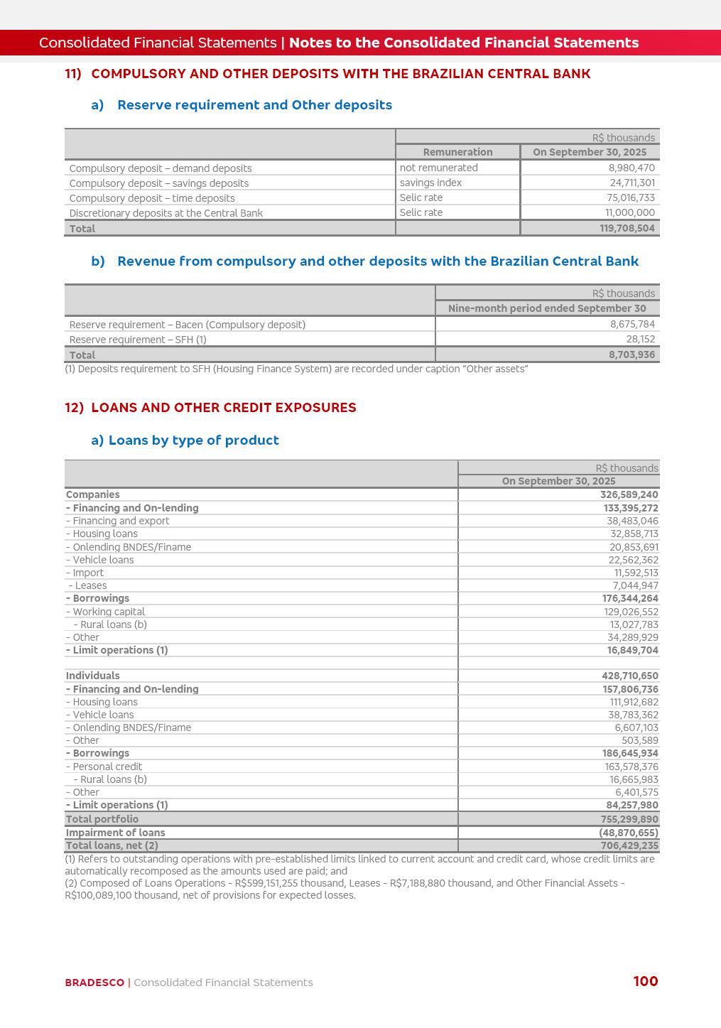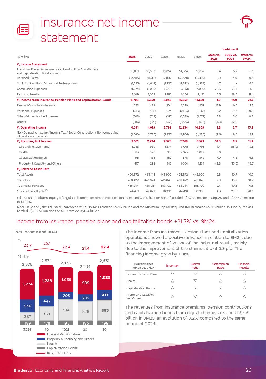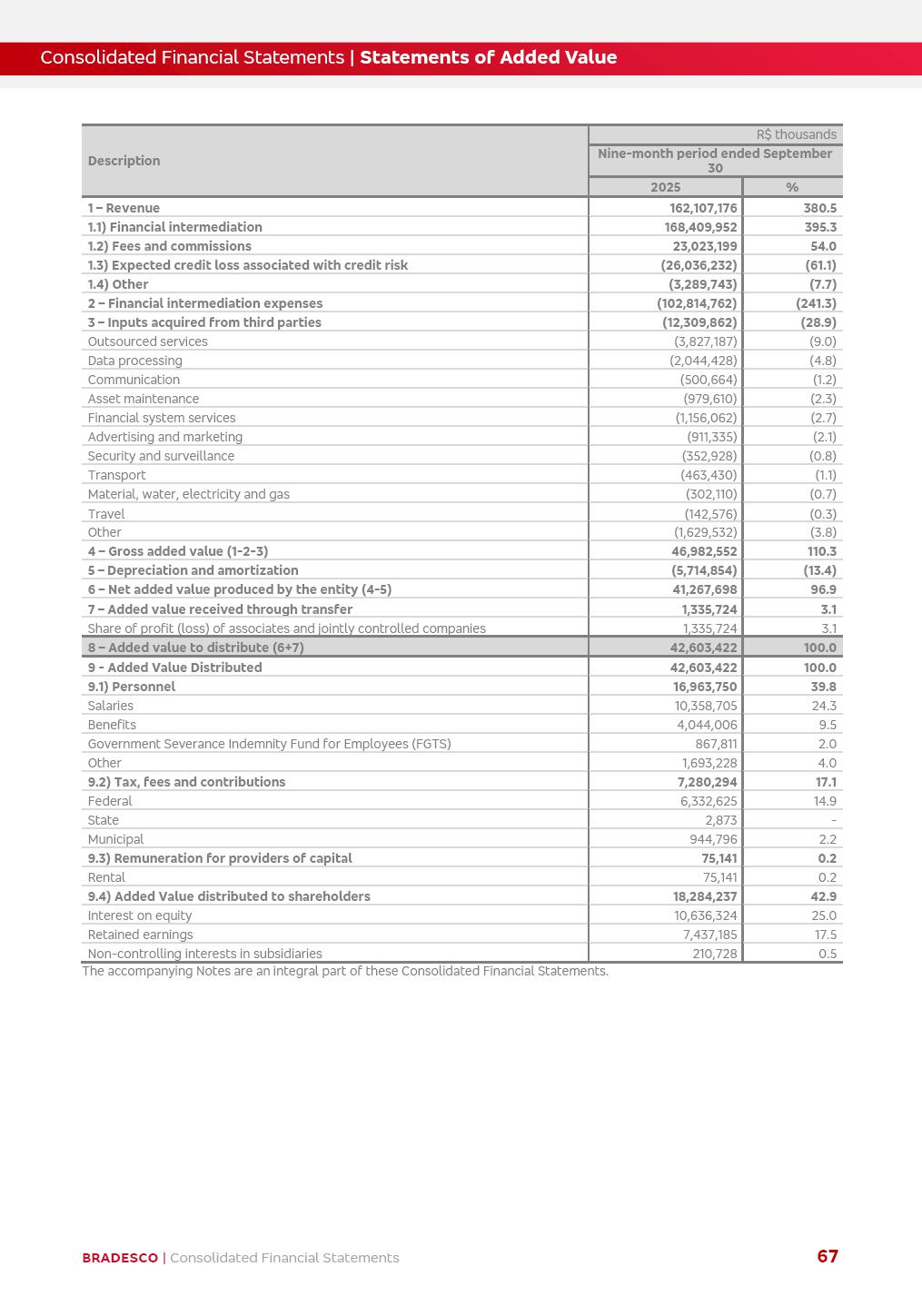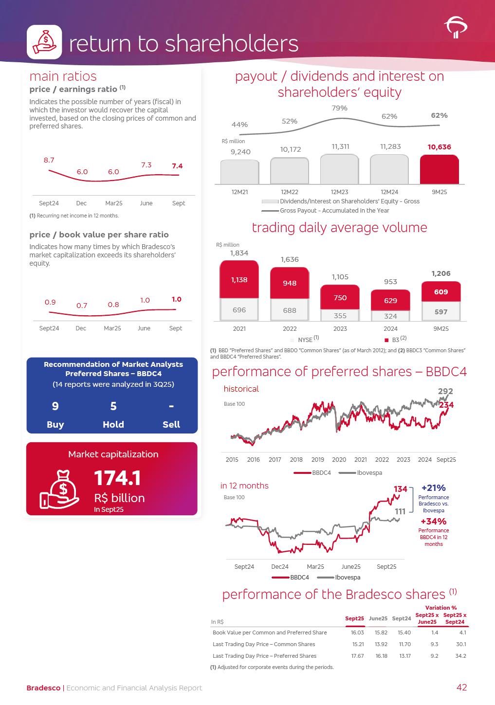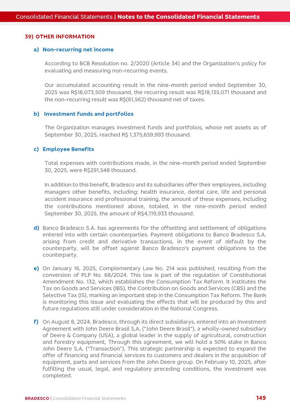 click on the items below to navigate through the document: 3Q25 managerial analysis of results management report consolidated financial statements videoconference commenting on the results October 30th at 9:30 AM (US Eastern Time) economic and financial analysis reportBradesco | Economic and Financial Analysis Report 3 Table of Contents Managerial Analysis of Results 5 press release 6 highlights 3Q25 7 recurring net income statement 8 net interest income 9 funding sources 10 loan portfolio 11 expenses with expanded loan loss provisions 16 loan indicators 17 fee and commission income 19 operating expenses 21 Bradesco Seguros 22 basel 27 guidance, indicators & economic perspectives 28 Additional Information 29 corporate strategy | customer-centric 30 NPS 31 our people 32 sustainability 33 digital in figures | BIA 34 Bradesco Principal 35 Bradesco Expresso 36 international operations | My Account 37 Bradesco Bank 38 Ágora Investimentos 39 Digio | next 40 service points, clients and market share 41 return to shareholders 42 additional information 43 selected information 45 consolidated balance sheet – Bradesco 46 consolidated balance sheet – Insurance 47 statement of income – managerial vs. recurring | BRGAAP vs. IFRS comparative 48 Independent Auditor’s Report 49 Consolidated Financial Statements 53 Bradesco | Economic and Financial Analysis Report 4 Some numbers included in this Report have been subjected to rounding adjustments. As a result, some amounts indicated as total amounts in some charts may not be the arithmetic sum of the preceding numbers. Percentage variations not presented in the framework of this report, are related, in their majority, to the low value balances compared with the other periods presented. As of January 2025, we adopted in our Financial Statements the new accounting practices established by CMN Resolutions No. 4,966 and No. 4,975. For management purposes, we kept the information of the previous periods as already disclosed, which do not present relevant differences in the historical analysis of the results. For some credit indicators, when mentioned, we carry out historical data for comparability purposes on a pro-forma basis. In our financial statements the Organization opted for the exemption provided by the Standard not to resubmit comparative information from previous periods resulting from the changes. Managerial Analysis of Results Bradesco | Economic and Financial Analysis Report 6 press release Bradesco is undergoing a transformation, fueling a continued positive performance. In the third quarter of the year, we took another step in boosting our profitability. We continue with the same commercial traction, while keeping delinquency indicators under control, prioritizing risk-adjusted returns. The transformation is advancing, supporting our evolution and enhancing our long-term competitiveness. Recurring net income was R$6.2 billion in 3Q25, an increase of 2.3% q/q and 18.8% y/y. As a result, ROAE topped 14.7% in the quarter. Total revenue reached R$35.0 billion in the quarter, increasing by 3.0% q/q and 13.1% y/y, driven by an expressive performance across all lines: net interest income, fee and commission income and income from insurance. The NII reached R$18.7 billion in the quarter, up by 3.7% q/q and 16.9% y/y. Client NII totaled R$18.6 billion, up by 4.8% q/q and 19.0% y/y, mainly driven by the increase in the loan portfolio and the average spread, which improved from 8.8% in 2Q25 to 9.0% in 3Q25, benefiting from higher efficiency in funding. Market NII was R$99 million in 3Q25, decreasing from the previous quarter, as expected. The expanded loan portfolio grew by 9.6% y/y and 1.6% q/q in Sept25, driven by the MSME and Individual segments. It is worth highlighting the increase in the share of secured credit lines, which went from 58.5% in Jun25 to 59.5% in Sept25. In terms of MSME, products such as receivables discounting and working capital loans (FGI and FGO - government-backed guarantee funds) stand out, and for Individuals, in payroll-deductible loans, rural loans, and high-income credit card lines. In September 2025, the delinquency ratio (over 90 days NPL) remained stable at 4.1%. Delinquency in MSME posted an improvement of 0.6 p.p. q/q, reflecting the quality of recent vintages, while Individuals loan indicator was impacted by the higher level of delays in John Deere Bank operations, which are collateralized and subject to a distinct recovery timeline. The cost of credit increased slightly, from 3.2% in 2Q25 to 3.3% in 3Q25, reflecting an increase of provisions for specific wholesale cases and John Deere Bank. We highlight the decrease of R$1.8 billion in the restructured portfolio against the previous quarter and of R$8.2 billion in the annual comparison. The quality of our credit portfolio showed improvement, being that stage 1 loan participation rose 30 bps while stage 3 fell 20 bps, resulting from better originations and the sequential cleanup of problematic assets. Fee and commission income increased by 2.8% q/q and 6.9% y/y. The positive standouts over the quarter included fees from consortia, cards, loan operations and asset management. Once again, the operational performance of insurance activities was significant, with income from insurance operations reaching of R$5.7 billion (1.0% q/q and 13.0% y/y) and net income of R$2.5 billion (10.3% q/q and 6.5% y/y). The ROAE of the insurance company was 22.4% in 3Q25. Operating expenses increased by 3.7% q/q and 9.6% y/y, in line with expectations. This growth rate largely reflects the investments being made in the bank and its affiliates. Analyzing only personnel and administrative expenses, there was a 5.5% y/y growth in 3Q25, which shrinks to 2.5% when we exclude the profit-sharing expenses, below inflation of 5.2% for the period, underlining the strong cost-control measures currently in place within the Organization. With that, we maintained our efficiency ratio stable at abou