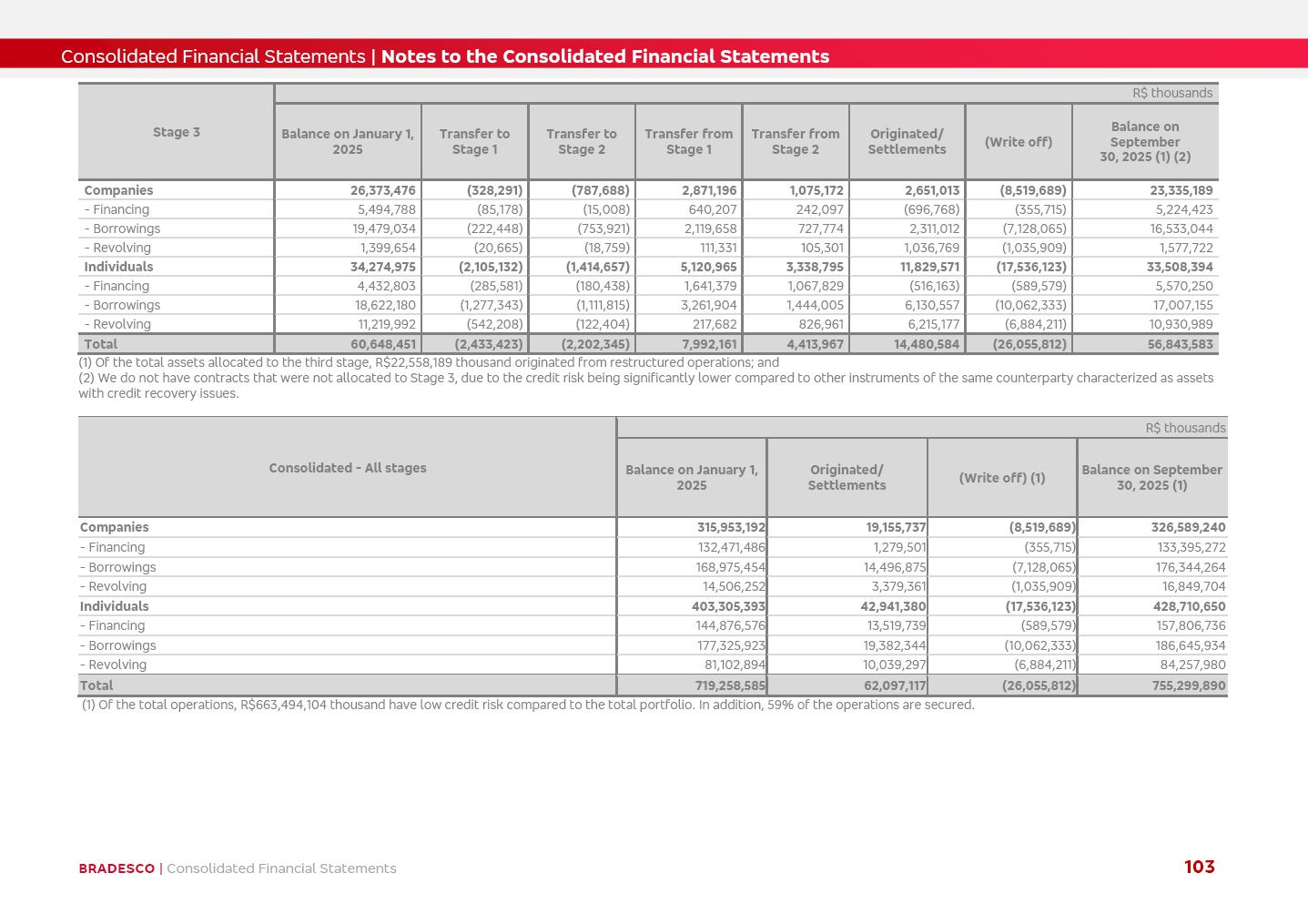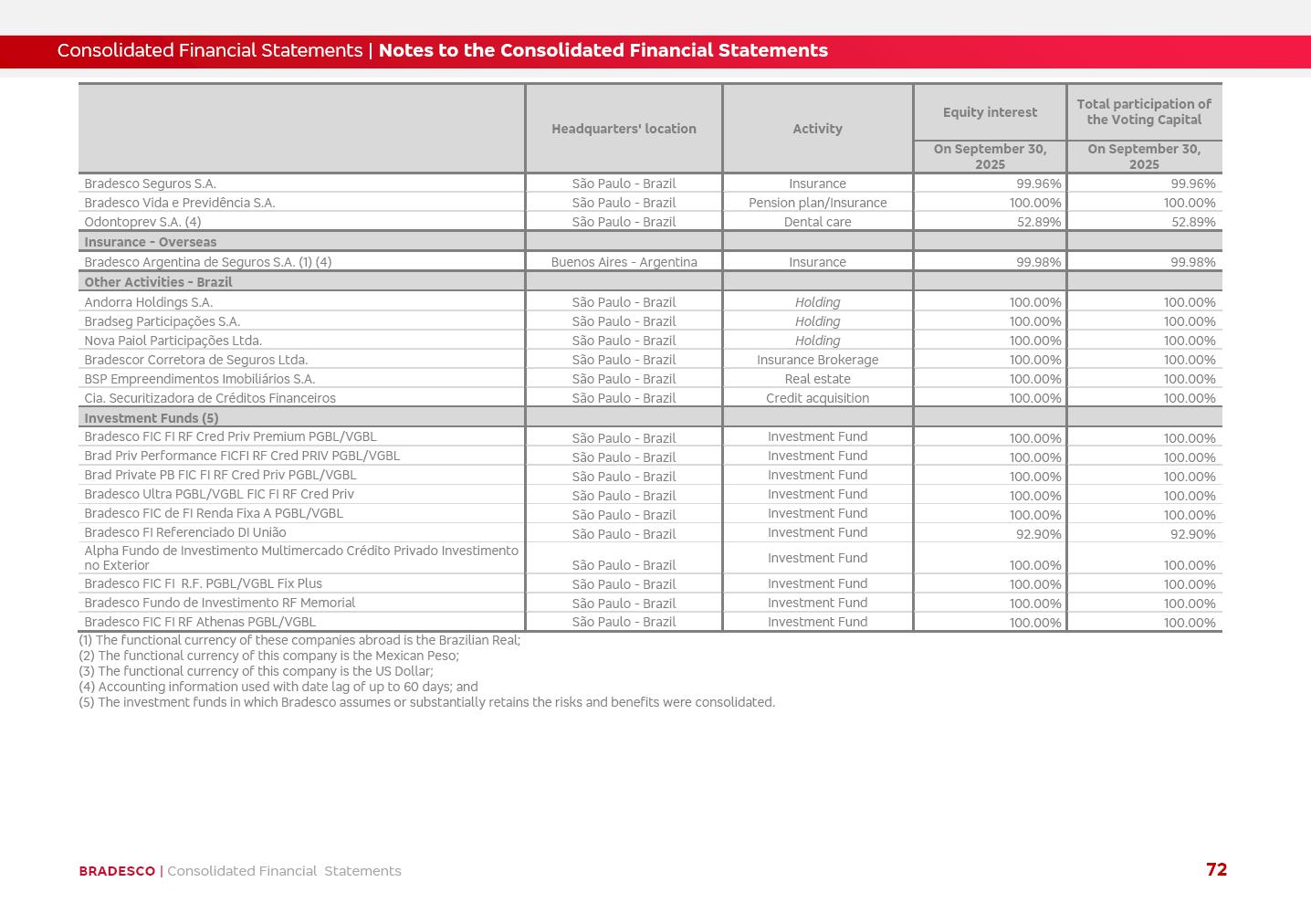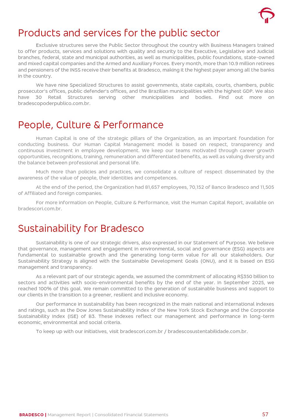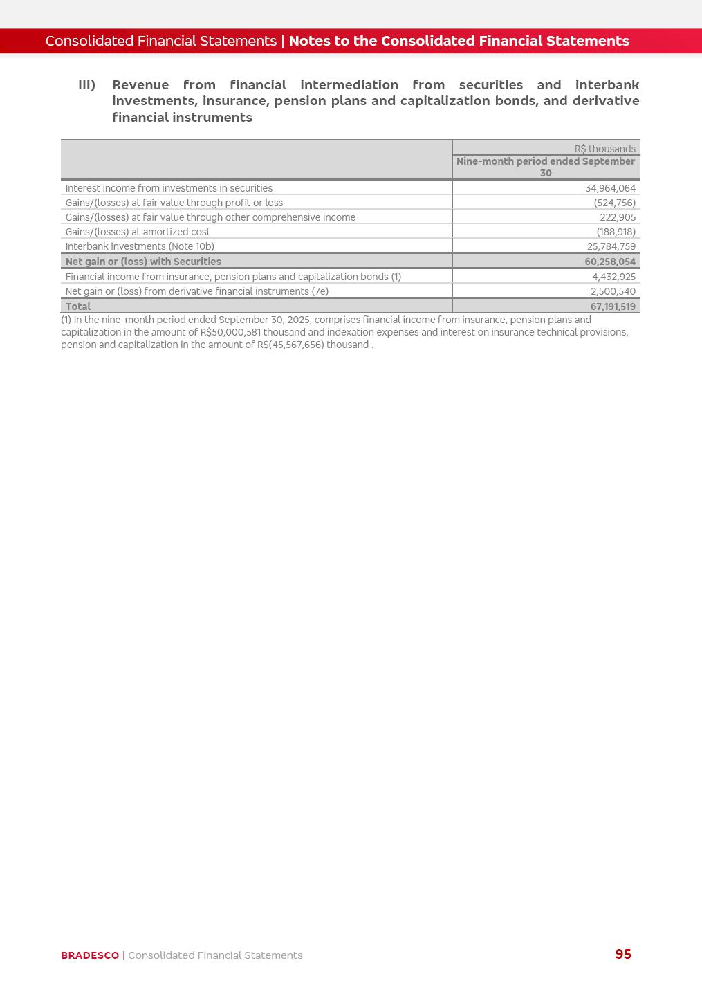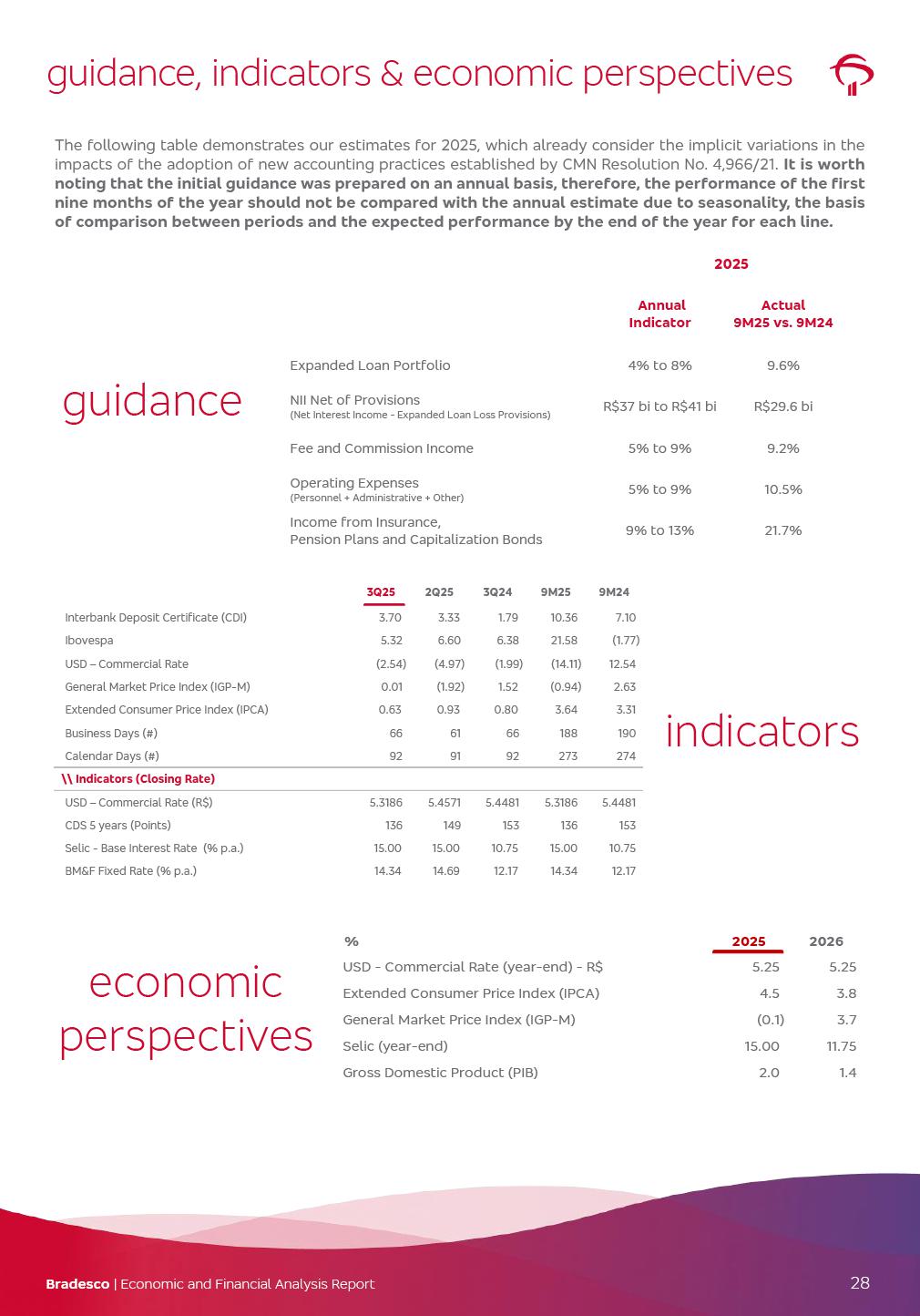 click on the items below to navigate through the document: 3Q25 managerial analysis of results management report consolidated financial statements videoconference commenting on the results October 30th at 9:30 AM (US Eastern Time) economic and financial analysis reportBradesco | Economic and Financial Analysis Report 3 Table of Contents Managerial Analysis of Results 5 press release 6 highlights 3Q25 7 recurring net income statement 8 net interest income 9 funding sources 10 loan portfolio 11 expenses with expanded loan loss provisions 16 loan indicators 17 fee and commission income 19 operating expenses 21 Bradesco Seguros 22 basel 27 guidance, indicators & economic perspectives 28 Additional Information 29 corporate strategy | customer-centric 30 NPS 31 our people 32 sustainability 33 digital in figures | BIA 34 Bradesco Principal 35 Bradesco Expresso 36 international operations | My Account 37 Bradesco Bank 38 Ágora Investimentos 39 Digio | next 40 service points, clients and market share 41 return to shareholders 42 additional information 43 selected information 45 consolidated balance sheet – Bradesco 46 consolidated balance sheet – Insurance 47 statement of income – managerial vs. recurring | BRGAAP vs. IFRS comparative 48 Independent Auditor’s Report 49 Consolidated Financial Statements 53 Bradesco | Economic and Financial Analysis Report 4 Some numbers included in this Report have been subjected to rounding adjustments. As a result, some amounts indicated as total amounts in some charts may not be the arithmetic sum of the preceding numbers. Percentage variations not presented in the framework of this report, are related, in their majority, to the low value balances compared with the other periods presented. As of January 2025, we adopted in our Financial Statements the new accounting practices established by CMN Resolutions No. 4,966 and No. 4,975. For management purposes, we kept the information of the previous periods as already disclosed, which do not present relevant differences in the historical analysis of the results. For some credit indicators, when mentioned, we carry out historical data for comparability purposes on a pro-forma basis. In our financial statements the Organization opted for the exemption provided by the Standard not to resubmit comparative information from previous periods resulting from the changes. Managerial Analysis of Results Bradesco | Economic and Financial Analysis Report 6 press release Bradesco is undergoing a transformation, fueling a continued positive performance. In the third quarter of the year, we took another step in boosting our profitability. We continue with the same commercial traction, while keeping delinquency indicators under control, prioritizing risk-adjusted returns. The transformation is advancing, supporting our evolution and enhancing our long-term competitiveness. Recurring net income was R$6.2 billion in 3Q25, an increase of 2.3% q/q and 18.8% y/y. As a result, ROAE topped 14.7% in the quarter. Total revenue reached R$35.0 billion in the quarter, increasing by 3.0% q/q and 13.1% y/y, driven by an expressive performance across all lines: net interest income, fee and commission income and income from insurance. The NII reached R$18.7 billion in the quarter, up by 3.7% q/q and 16.9% y/y. Client NII totaled R$18.6 billion, up by 4.8% q/q and 19.0% y/y, mainly driven by the increase in the loan portfolio and the average spread, which improved from 8.8% in 2Q25 to 9.0% in 3Q25, benefiting from higher efficiency in funding. Market NII was R$99 million in 3Q25, decreasing from the previous quarter, as expected. The expanded loan portfolio grew by 9.6% y/y and 1.6% q/q in Sept25, driven by the MSME and Individual segments. It is worth highlighting the increase in the share of secured credit lines, which went from 58.5% in Jun25 to 59.5% in Sept25. In terms of MSME, products such as receivables discounting and working capital loans (FGI and FGO - government-backed guarantee funds) stand out, and for Individuals, in payroll-deductible loans, rural loans, and high-income credit card lines. In September 2025, the delinquency ratio (over 90 days NPL) remained stable at 4.1%. Delinquency in MSME posted an improvement of 0.6 p.p. q/q, reflecting the quality of recent vintages, while Individuals loan indicator was impacted by the higher level of delays in John Deere Bank operations, which are collateralized and subject to a distinct recovery timeline. The cost of credit increased slightly, from 3.2% in 2Q25 to 3.3% in 3Q25, reflecting an increase of provisions for specific wholesale cases and John Deere Bank. We highlight the decrease of R$1.8 billion in the restructured portfolio against the previous quarter and of R$8.2 billion in the annual comparison. The quality of our credit portfolio showed improvement, being that stage 1 loan participation rose 30 bps while stage 3 fell 20 bps, resulting from better originations and the sequential cleanup of problematic assets. Fee and commission income increased by 2.8% q/q and 6.9% y/y. The positive standouts over the quarter included fees from consortia, cards, loan operations and asset management. Once again, the operational performance of insurance activities was significant, with income from insurance operations reaching of R$5.7 billion (1.0% q/q and 13.0% y/y) and net income of R$2.5 billion (10.3% q/q and 6.5% y/y). The ROAE of the insurance company was 22.4% in 3Q25. Operating expenses increased by 3.7% q/q and 9.6% y/y, in line with expectations. This growth rate largely reflects the investments being made in the bank and its affiliates. Analyzing only personnel and administrative expenses, there was a 5.5% y/y growth in 3Q25, which shrinks to 2.5% when we exclude the profit-sharing expenses, below inflation of 5.2% for the period, underlining the strong cost-control measures currently in place within the Organization. With that, we maintained our efficiency ratio stable at abou