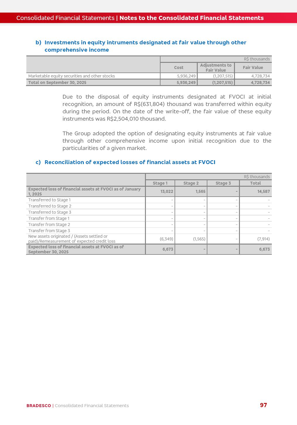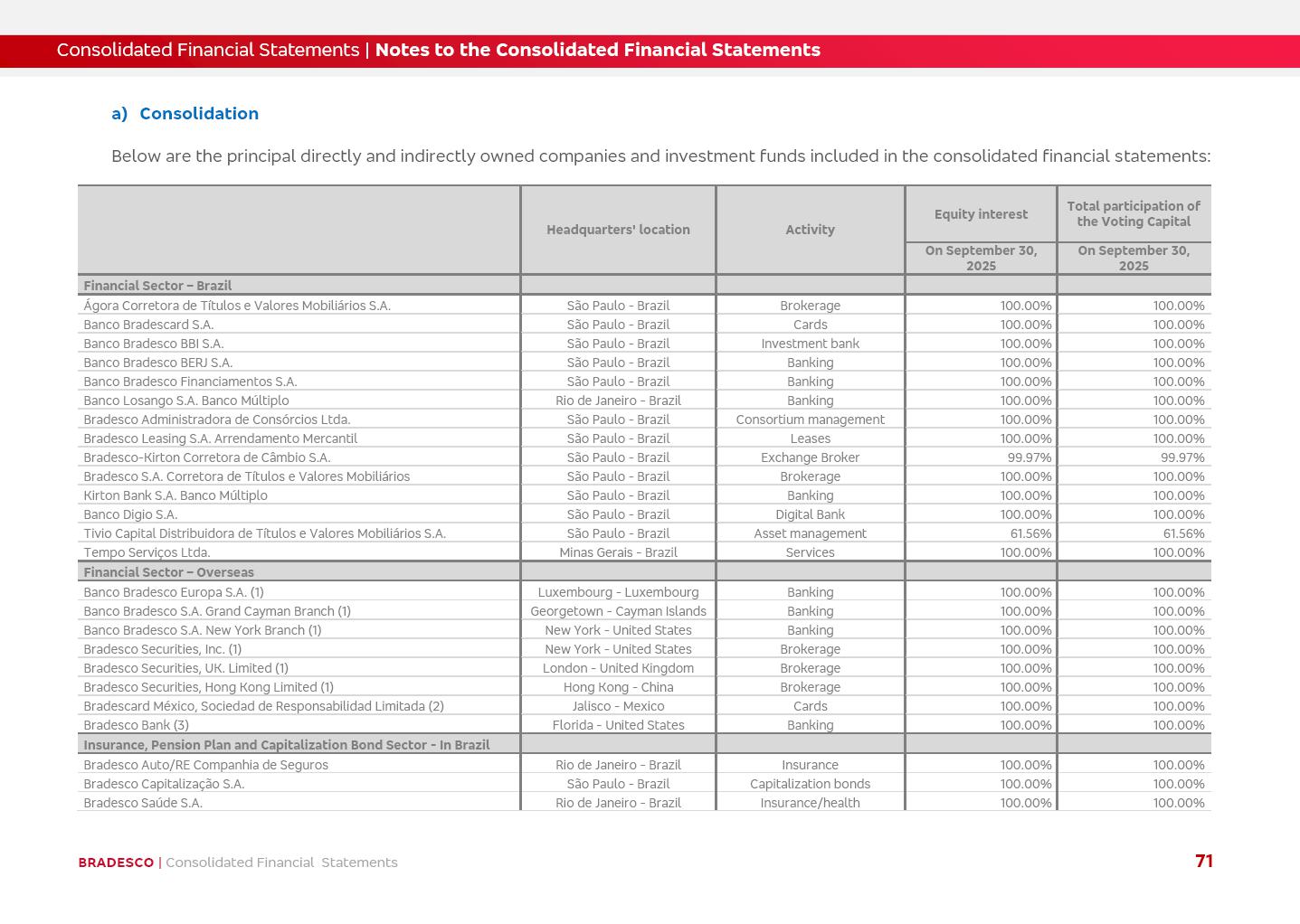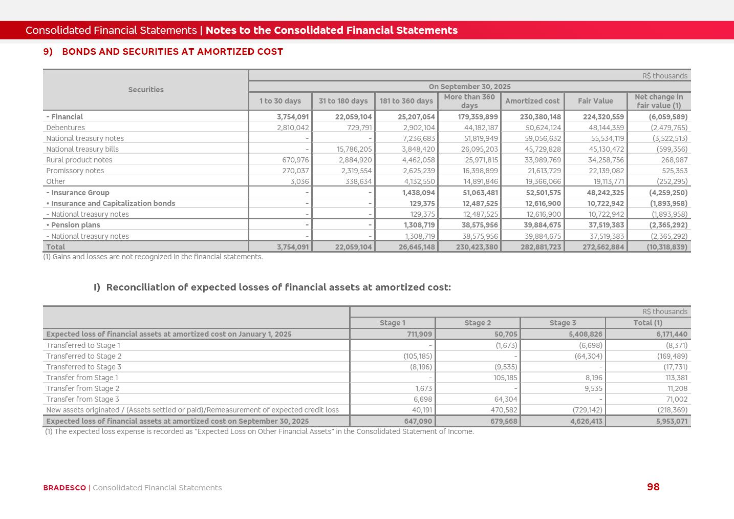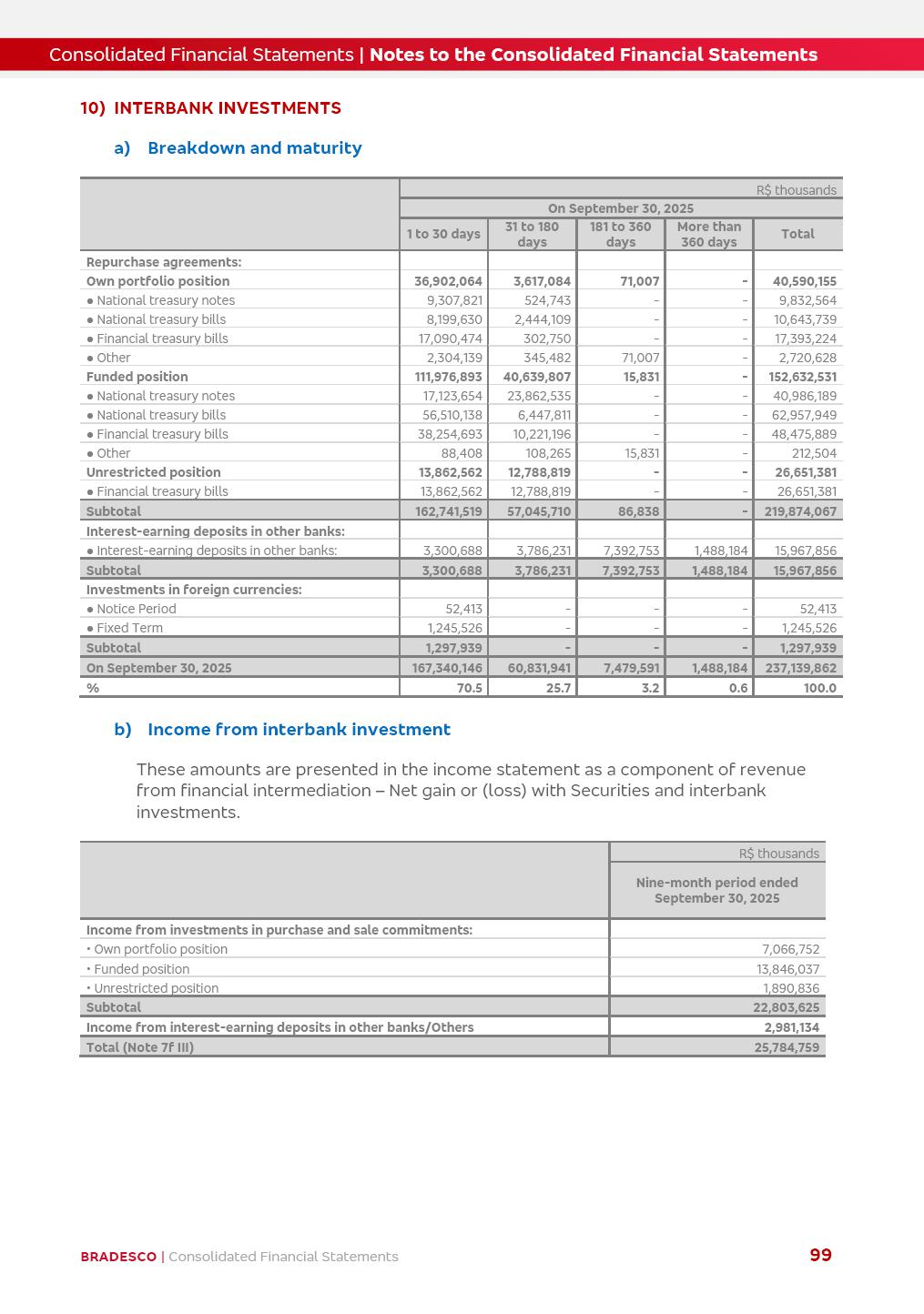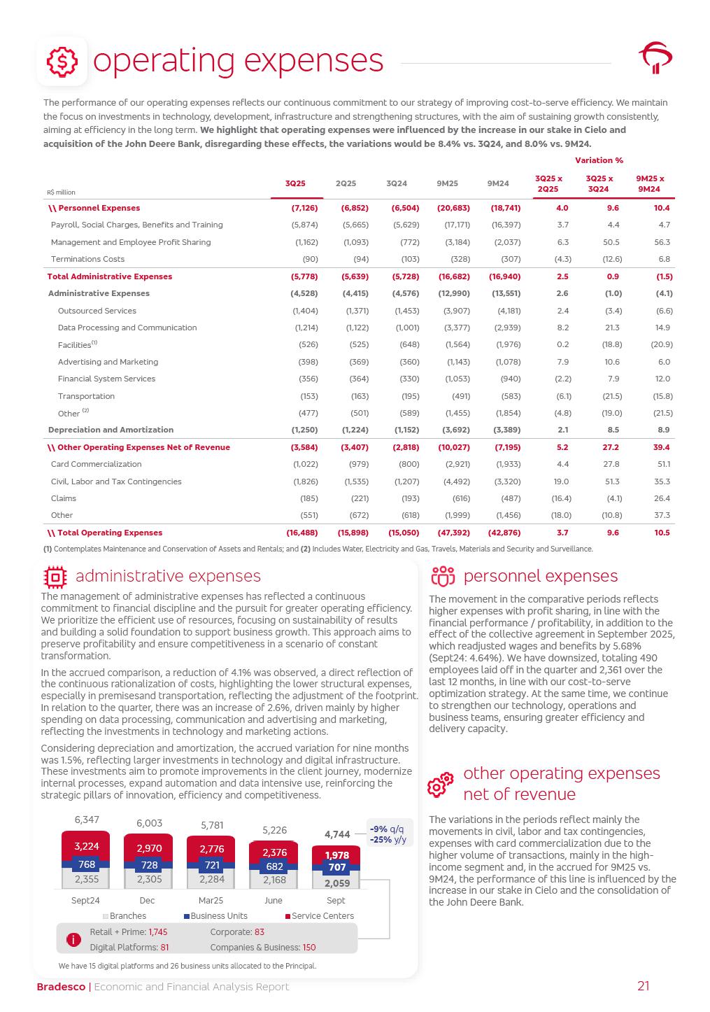 click on the items below to navigate through the document: 3Q25 managerial analysis of results management report consolidated financial statements videoconference commenting on the results October 30th at 9:30 AM (US Eastern Time) economic and financial analysis reportBradesco | Economic and Financial Analysis Report 3 Table of Contents Managerial Analysis of Results 5 press release 6 highlights 3Q25 7 recurring net income statement 8 net interest income 9 funding sources 10 loan portfolio 11 expenses with expanded loan loss provisions 16 loan indicators 17 fee and commission income 19 operating expenses 21 Bradesco Seguros 22 basel 27 guidance, indicators & economic perspectives 28 Additional Information 29 corporate strategy | customer-centric 30 NPS 31 our people 32 sustainability 33 digital in figures | BIA 34 Bradesco Principal 35 Bradesco Expresso 36 international operations | My Account 37 Bradesco Bank 38 Ágora Investimentos 39 Digio | next 40 service points, clients and market share 41 return to shareholders 42 additional information 43 selected information 45 consolidated balance sheet – Bradesco 46 consolidated balance sheet – Insurance 47 statement of income – managerial vs. recurring | BRGAAP vs. IFRS comparative 48 Independent Auditor’s Report 49 Consolidated Financial Statements 53 Bradesco | Economic and Financial Analysis Report 4 Some numbers included in this Report have been subjected to rounding adjustments. As a result, some amounts indicated as total amounts in some charts may not be the arithmetic sum of the preceding numbers. Percentage variations not presented in the framework of this report, are related, in their majority, to the low value balances compared with the other periods presented. As of January 2025, we adopted in our Financial Statements the new accounting practices established by CMN Resolutions No. 4,966 and No. 4,975. For management purposes, we kept the information of the previous periods as already disclosed, which do not present relevant differences in the historical analysis of the results. For some credit indicators, when mentioned, we carry out historical data for comparability purposes on a pro-forma basis. In our financial statements the Organization opted for the exemption provided by the Standard not to resubmit comparative information from previous periods resulting from the changes. Managerial Analysis of Results Bradesco | Economic and Financial Analysis Report 6 press release Bradesco is undergoing a transformation, fueling a continued positive performance. In the third quarter of the year, we took another step in boosting our profitability. We continue with the same commercial traction, while keeping delinquency indicators under control, prioritizing risk-adjusted returns. The transformation is advancing, supporting our evolution and enhancing our long-term competitiveness. Recurring net income was R$6.2 billion in 3Q25, an increase of 2.3% q/q and 18.8% y/y. As a result, ROAE topped 14.7% in the quarter. Total revenue reached R$35.0 billion in the quarter, increasing by 3.0% q/q and 13.1% y/y, driven by an expressive performance across all lines: net interest income, fee and commission income and income from insurance. The NII reached R$18.7 billion in the quarter, up by 3.7% q/q and 16.9% y/y. Client NII totaled R$18.6 billion, up by 4.8% q/q and 19.0% y/y, mainly driven by the increase in the loan portfolio and the average spread, which improved from 8.8% in 2Q25 to 9.0% in 3Q25, benefiting from higher efficiency in funding. Market NII was R$99 million in 3Q25, decreasing from the previous quarter, as expected. The expanded loan portfolio grew by 9.6% y/y and 1.6% q/q in Sept25, driven by the MSME and Individual segments. It is worth highlighting the increase in the share of secured credit lines, which went from 58.5% in Jun25 to 59.5% in Sept25. In terms of MSME, products such as receivables discounting and working capital loans (FGI and FGO - government-backed guarantee funds) stand out, and for Individuals, in payroll-deductible loans, rural loans, and high-income credit card lines. In September 2025, the delinquency ratio (over 90 days NPL) remained stable at 4.1%. Delinquency in MSME posted an improvement of 0.6 p.p. q/q, reflecting the quality of recent vintages, while Individuals loan indicator was impacted by the higher level of delays in John Deere Bank operations, which are collateralized and subject to a distinct recovery timeline. The cost of credit increased slightly, from 3.2% in 2Q25 to 3.3% in 3Q25, reflecting an increase of provisions for specific wholesale cases and John Deere Bank. We highlight the decrease of R$1.8 billion in the restructured portfolio against the previous quarter and of R$8.2 billion in the annual comparison. The quality of our credit portfolio showed improvement, being that stage 1 loan participation rose 30 bps while stage 3 fell 20 bps, resulting from better originations and the sequential cleanup of problematic assets. Fee and commission income increased by 2.8% q/q and 6.9% y/y. The positive standouts over the quarter included fees from consortia, cards, loan operations and asset management. Once again, the operational performance of insurance activities was significant, with income from insurance operations reaching of R$5.7 billion (1.0% q/q and 13.0% y/y) and net income of R$2.5 billion (10.3% q/q and 6.5% y/y). The ROAE of the insurance company was 22.4% in 3Q25. Operating expenses increased by 3.7% q/q and 9.6% y/y, in line with expectations. This growth rate largely reflects the investments being made in the bank and its affiliates. Analyzing only personnel and administrative expenses, there was a 5.5% y/y growth in 3Q25, which shrinks to 2.5% when we exclude the profit-sharing expenses, below inflation of 5.2% for the period, underlining the strong cost-control measures currently in place within the Organization. With that, we maintained our efficiency ratio stable at abou