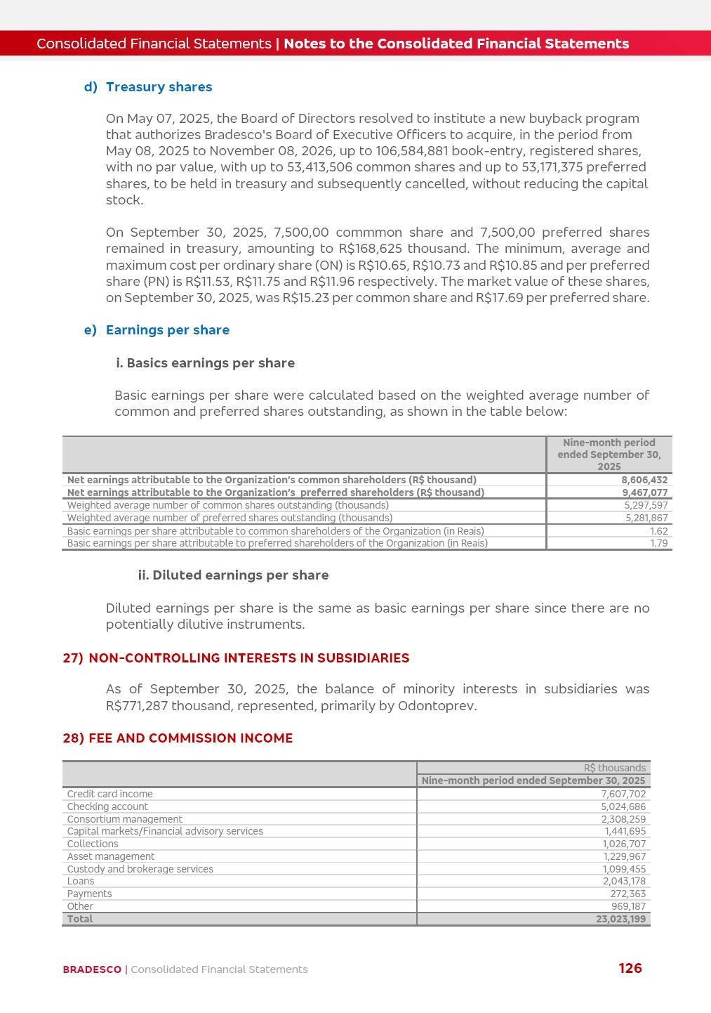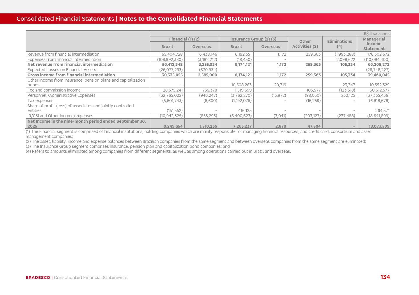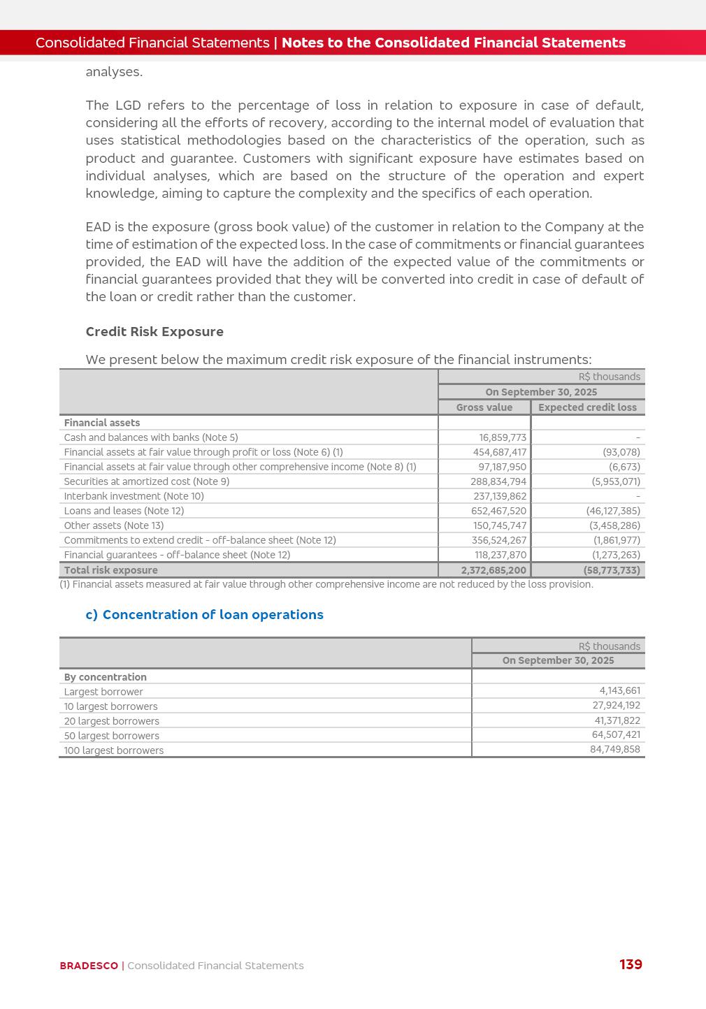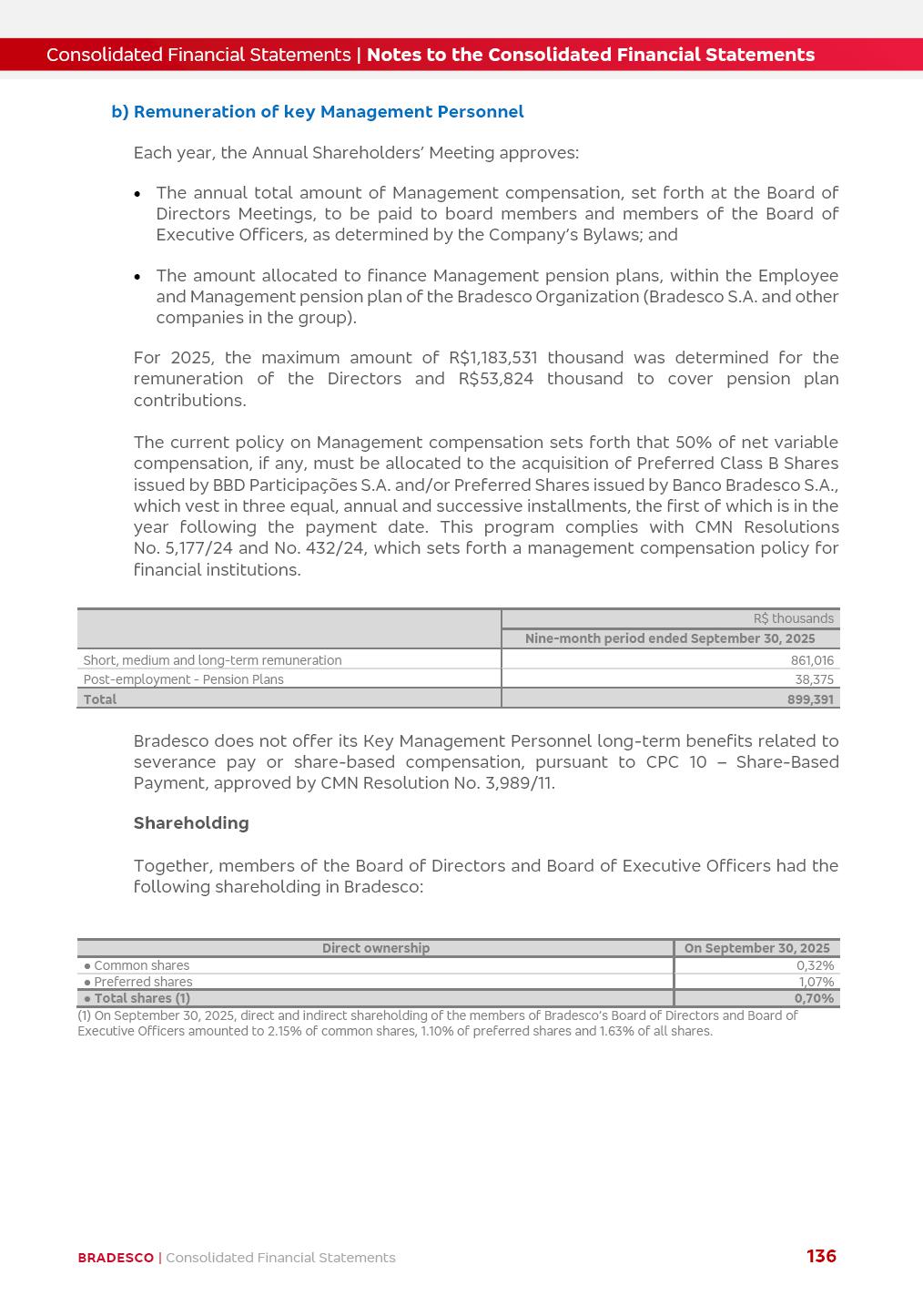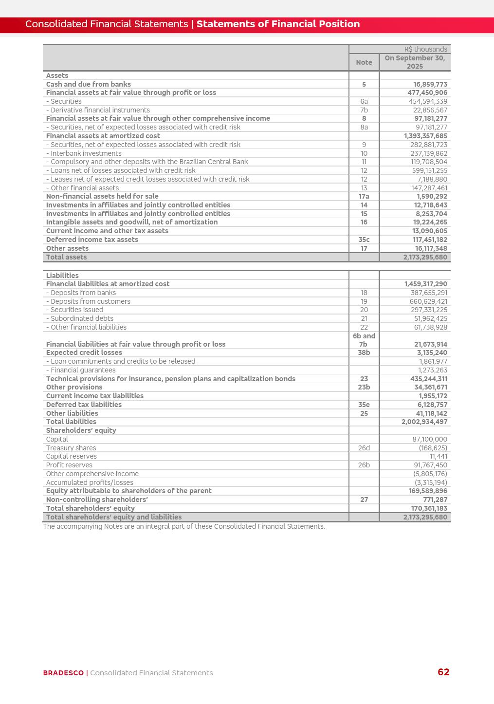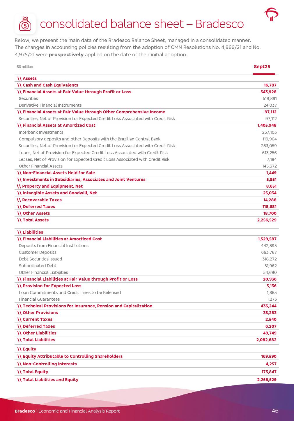 click on the items below to navigate through the document: 3Q25 managerial analysis of results management report consolidated financial statements videoconference commenting on the results October 30th at 9:30 AM (US Eastern Time) economic and financial analysis reportBradesco | Economic and Financial Analysis Report 3 Table of Contents Managerial Analysis of Results 5 press release 6 highlights 3Q25 7 recurring net income statement 8 net interest income 9 funding sources 10 loan portfolio 11 expenses with expanded loan loss provisions 16 loan indicators 17 fee and commission income 19 operating expenses 21 Bradesco Seguros 22 basel 27 guidance, indicators & economic perspectives 28 Additional Information 29 corporate strategy | customer-centric 30 NPS 31 our people 32 sustainability 33 digital in figures | BIA 34 Bradesco Principal 35 Bradesco Expresso 36 international operations | My Account 37 Bradesco Bank 38 Ágora Investimentos 39 Digio | next 40 service points, clients and market share 41 return to shareholders 42 additional information 43 selected information 45 consolidated balance sheet – Bradesco 46 consolidated balance sheet – Insurance 47 statement of income – managerial vs. recurring | BRGAAP vs. IFRS comparative 48 Independent Auditor’s Report 49 Consolidated Financial Statements 53 Bradesco | Economic and Financial Analysis Report 4 Some numbers included in this Report have been subjected to rounding adjustments. As a result, some amounts indicated as total amounts in some charts may not be the arithmetic sum of the preceding numbers. Percentage variations not presented in the framework of this report, are related, in their majority, to the low value balances compared with the other periods presented. As of January 2025, we adopted in our Financial Statements the new accounting practices established by CMN Resolutions No. 4,966 and No. 4,975. For management purposes, we kept the information of the previous periods as already disclosed, which do not present relevant differences in the historical analysis of the results. For some credit indicators, when mentioned, we carry out historical data for comparability purposes on a pro-forma basis. In our financial statements the Organization opted for the exemption provided by the Standard not to resubmit comparative information from previous periods resulting from the changes. Managerial Analysis of Results Bradesco | Economic and Financial Analysis Report 6 press release Bradesco is undergoing a transformation, fueling a continued positive performance. In the third quarter of the year, we took another step in boosting our profitability. We continue with the same commercial traction, while keeping delinquency indicators under control, prioritizing risk-adjusted returns. The transformation is advancing, supporting our evolution and enhancing our long-term competitiveness. Recurring net income was R$6.2 billion in 3Q25, an increase of 2.3% q/q and 18.8% y/y. As a result, ROAE topped 14.7% in the quarter. Total revenue reached R$35.0 billion in the quarter, increasing by 3.0% q/q and 13.1% y/y, driven by an expressive performance across all lines: net interest income, fee and commission income and income from insurance. The NII reached R$18.7 billion in the quarter, up by 3.7% q/q and 16.9% y/y. Client NII totaled R$18.6 billion, up by 4.8% q/q and 19.0% y/y, mainly driven by the increase in the loan portfolio and the average spread, which improved from 8.8% in 2Q25 to 9.0% in 3Q25, benefiting from higher efficiency in funding. Market NII was R$99 million in 3Q25, decreasing from the previous quarter, as expected. The expanded loan portfolio grew by 9.6% y/y and 1.6% q/q in Sept25, driven by the MSME and Individual segments. It is worth highlighting the increase in the share of secured credit lines, which went from 58.5% in Jun25 to 59.5% in Sept25. In terms of MSME, products such as receivables discounting and working capital loans (FGI and FGO - government-backed guarantee funds) stand out, and for Individuals, in payroll-deductible loans, rural loans, and high-income credit card lines. In September 2025, the delinquency ratio (over 90 days NPL) remained stable at 4.1%. Delinquency in MSME posted an improvement of 0.6 p.p. q/q, reflecting the quality of recent vintages, while Individuals loan indicator was impacted by the higher level of delays in John Deere Bank operations, which are collateralized and subject to a distinct recovery timeline. The cost of credit increased slightly, from 3.2% in 2Q25 to 3.3% in 3Q25, reflecting an increase of provisions for specific wholesale cases and John Deere Bank. We highlight the decrease of R$1.8 billion in the restructured portfolio against the previous quarter and of R$8.2 billion in the annual comparison. The quality of our credit portfolio showed improvement, being that stage 1 loan participation rose 30 bps while stage 3 fell 20 bps, resulting from better originations and the sequential cleanup of problematic assets. Fee and commission income increased by 2.8% q/q and 6.9% y/y. The positive standouts over the quarter included fees from consortia, cards, loan operations and asset management. Once again, the operational performance of insurance activities was significant, with income from insurance operations reaching of R$5.7 billion (1.0% q/q and 13.0% y/y) and net income of R$2.5 billion (10.3% q/q and 6.5% y/y). The ROAE of the insurance company was 22.4% in 3Q25. Operating expenses increased by 3.7% q/q and 9.6% y/y, in line with expectations. This growth rate largely reflects the investments being made in the bank and its affiliates. Analyzing only personnel and administrative expenses, there was a 5.5% y/y growth in 3Q25, which shrinks to 2.5% when we exclude the profit-sharing expenses, below inflation of 5.2% for the period, underlining the strong cost-control measures currently in place within the Organization. With that, we maintained our efficiency ratio stable at abou
