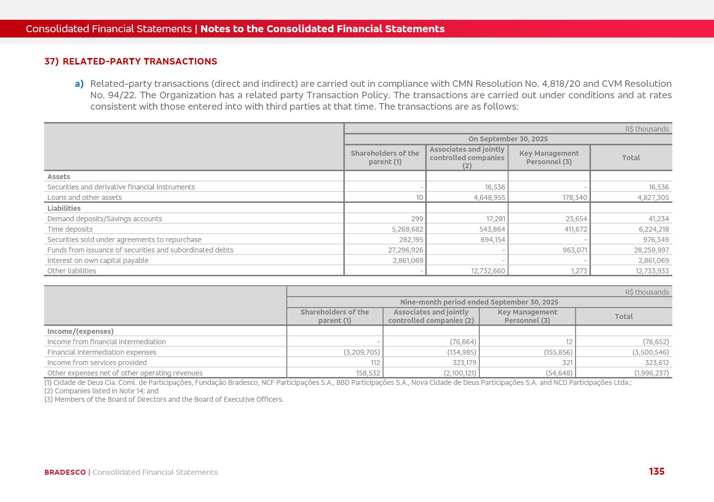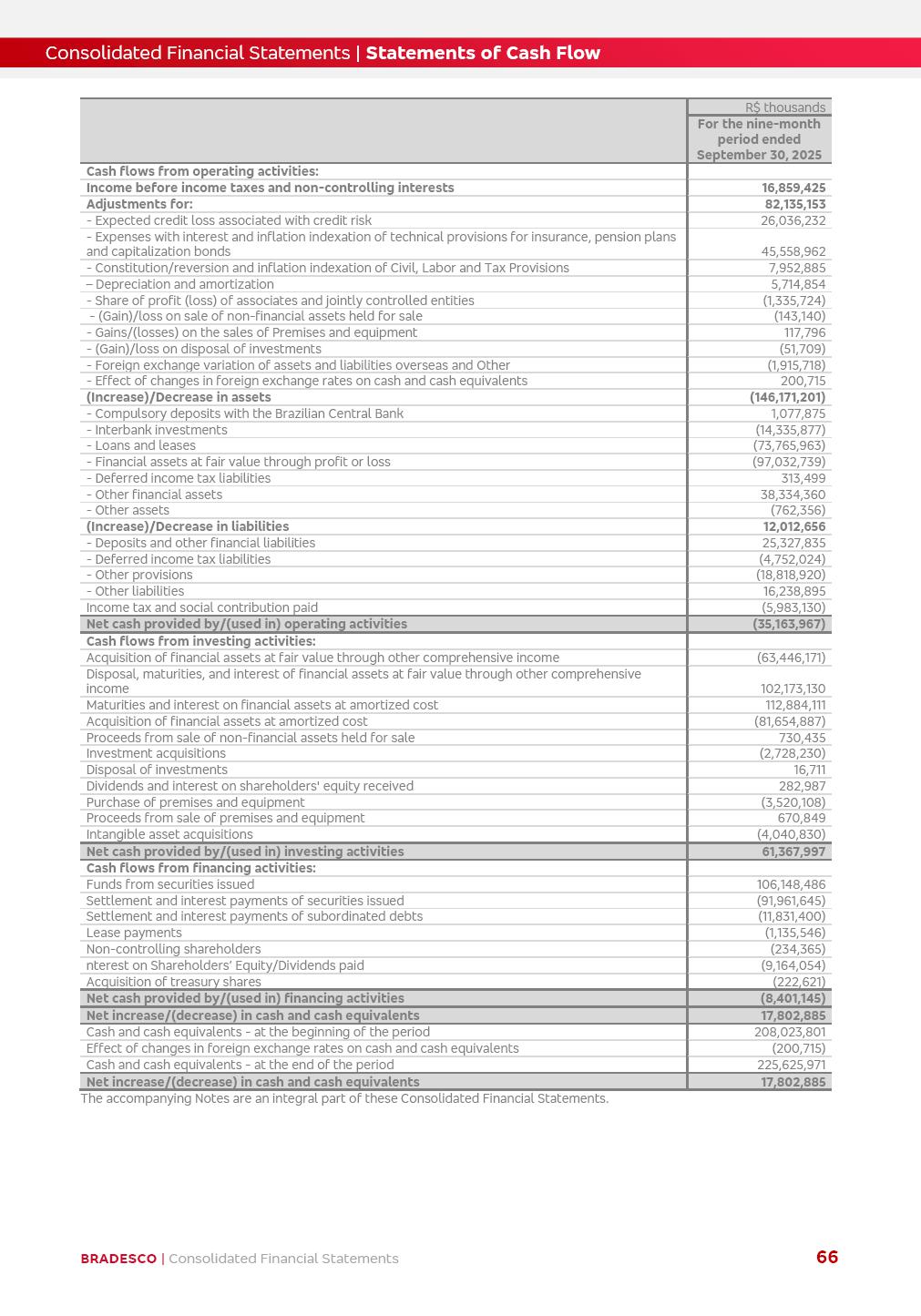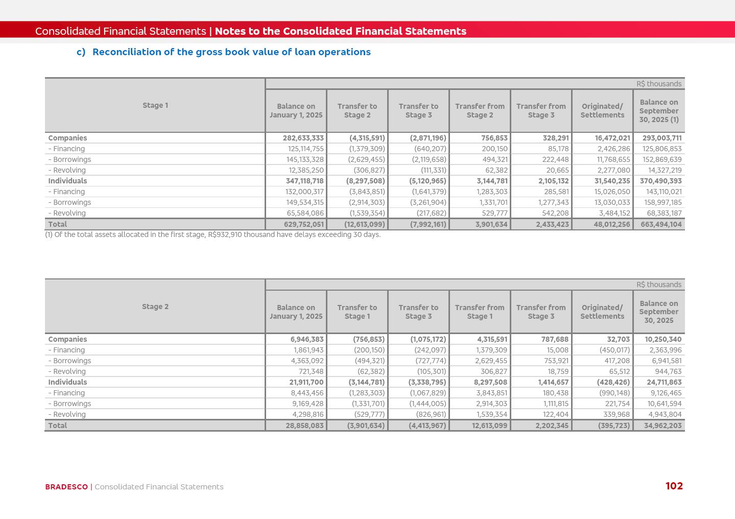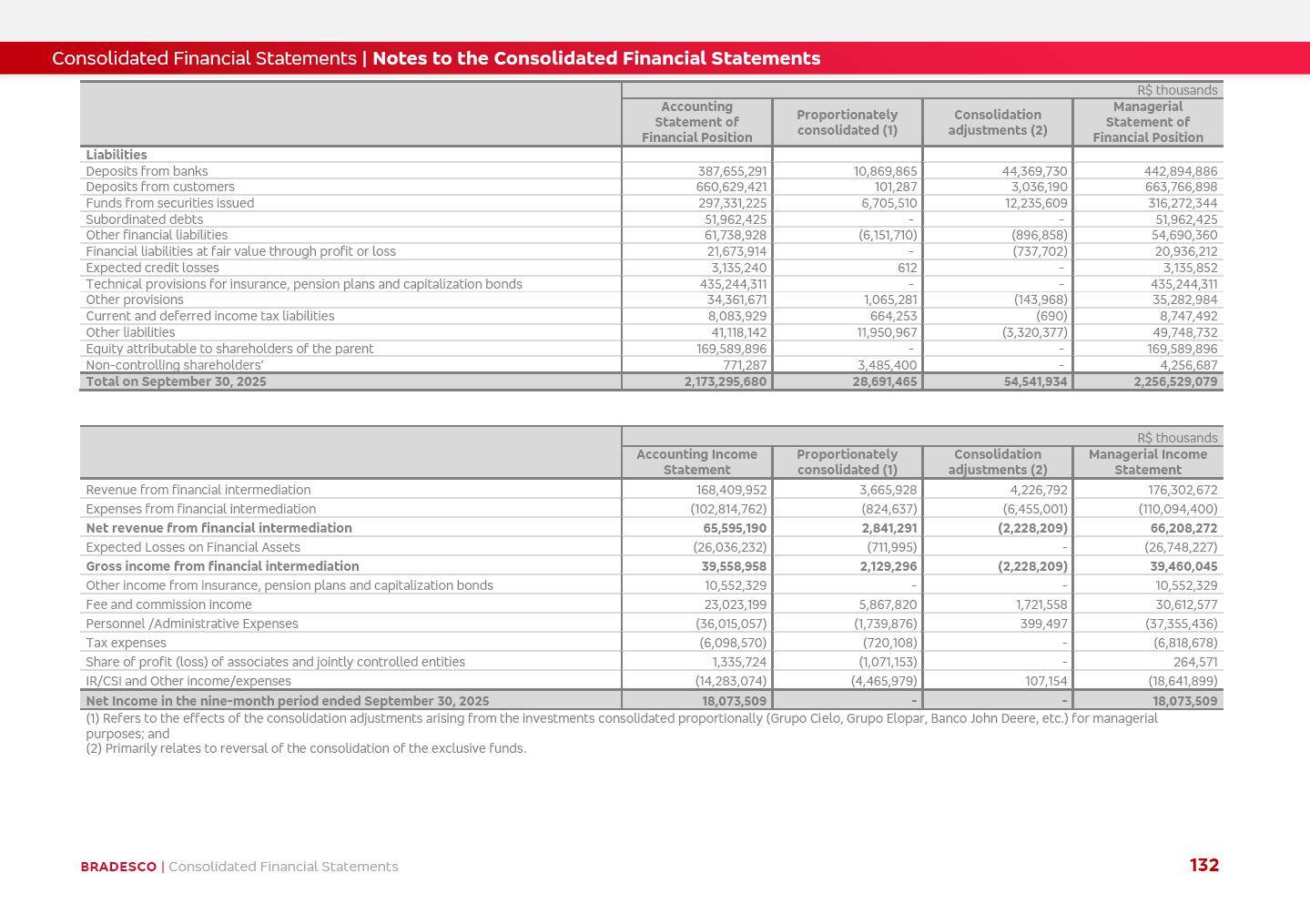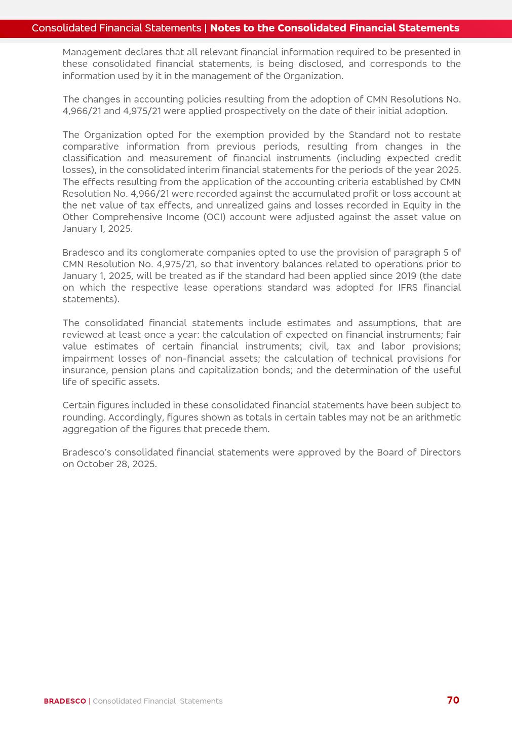 click on the items below to navigate through the document: 3Q25 managerial analysis of results management report consolidated financial statements videoconference commenting on the results October 30th at 9:30 AM (US Eastern Time) economic and financial analysis reportBradesco | Economic and Financial Analysis Report 3 Table of Contents Managerial Analysis of Results 5 press release 6 highlights 3Q25 7 recurring net income statement 8 net interest income 9 funding sources 10 loan portfolio 11 expenses with expanded loan loss provisions 16 loan indicators 17 fee and commission income 19 operating expenses 21 Bradesco Seguros 22 basel 27 guidance, indicators & economic perspectives 28 Additional Information 29 corporate strategy | customer-centric 30 NPS 31 our people 32 sustainability 33 digital in figures | BIA 34 Bradesco Principal 35 Bradesco Expresso 36 international operations | My Account 37 Bradesco Bank 38 Ágora Investimentos 39 Digio | next 40 service points, clients and market share 41 return to shareholders 42 additional information 43 selected information 45 consolidated balance sheet – Bradesco 46 consolidated balance sheet – Insurance 47 statement of income – managerial vs. recurring | BRGAAP vs. IFRS comparative 48 Independent Auditor’s Report 49 Consolidated Financial Statements 53 Bradesco | Economic and Financial Analysis Report 4 Some numbers included in this Report have been subjected to rounding adjustments. As a result, some amounts indicated as total amounts in some charts may not be the arithmetic sum of the preceding numbers. Percentage variations not presented in the framework of this report, are related, in their majority, to the low value balances compared with the other periods presented. As of January 2025, we adopted in our Financial Statements the new accounting practices established by CMN Resolutions No. 4,966 and No. 4,975. For management purposes, we kept the information of the previous periods as already disclosed, which do not present relevant differences in the historical analysis of the results. For some credit indicators, when mentioned, we carry out historical data for comparability purposes on a pro-forma basis. In our financial statements the Organization opted for the exemption provided by the Standard not to resubmit comparative information from previous periods resulting from the changes. Managerial Analysis of Results Bradesco | Economic and Financial Analysis Report 6 press release Bradesco is undergoing a transformation, fueling a continued positive performance. In the third quarter of the year, we took another step in boosting our profitability. We continue with the same commercial traction, while keeping delinquency indicators under control, prioritizing risk-adjusted returns. The transformation is advancing, supporting our evolution and enhancing our long-term competitiveness. Recurring net income was R$6.2 billion in 3Q25, an increase of 2.3% q/q and 18.8% y/y. As a result, ROAE topped 14.7% in the quarter. Total revenue reached R$35.0 billion in the quarter, increasing by 3.0% q/q and 13.1% y/y, driven by an expressive performance across all lines: net interest income, fee and commission income and income from insurance. The NII reached R$18.7 billion in the quarter, up by 3.7% q/q and 16.9% y/y. Client NII totaled R$18.6 billion, up by 4.8% q/q and 19.0% y/y, mainly driven by the increase in the loan portfolio and the average spread, which improved from 8.8% in 2Q25 to 9.0% in 3Q25, benefiting from higher efficiency in funding. Market NII was R$99 million in 3Q25, decreasing from the previous quarter, as expected. The expanded loan portfolio grew by 9.6% y/y and 1.6% q/q in Sept25, driven by the MSME and Individual segments. It is worth highlighting the increase in the share of secured credit lines, which went from 58.5% in Jun25 to 59.5% in Sept25. In terms of MSME, products such as receivables discounting and working capital loans (FGI and FGO - government-backed guarantee funds) stand out, and for Individuals, in payroll-deductible loans, rural loans, and high-income credit card lines. In September 2025, the delinquency ratio (over 90 days NPL) remained stable at 4.1%. Delinquency in MSME posted an improvement of 0.6 p.p. q/q, reflecting the quality of recent vintages, while Individuals loan indicator was impacted by the higher level of delays in John Deere Bank operations, which are collateralized and subject to a distinct recovery timeline. The cost of credit increased slightly, from 3.2% in 2Q25 to 3.3% in 3Q25, reflecting an increase of provisions for specific wholesale cases and John Deere Bank. We highlight the decrease of R$1.8 billion in the restructured portfolio against the previous quarter and of R$8.2 billion in the annual comparison. The quality of our credit portfolio showed improvement, being that stage 1 loan participation rose 30 bps while stage 3 fell 20 bps, resulting from better originations and the sequential cleanup of problematic assets. Fee and commission income increased by 2.8% q/q and 6.9% y/y. The positive standouts over the quarter included fees from consortia, cards, loan operations and asset management. Once again, the operational performance of insurance activities was significant, with income from insurance operations reaching of R$5.7 billion (1.0% q/q and 13.0% y/y) and net income of R$2.5 billion (10.3% q/q and 6.5% y/y). The ROAE of the insurance company was 22.4% in 3Q25. Operating expenses increased by 3.7% q/q and 9.6% y/y, in line with expectations. This growth rate largely reflects the investments being made in the bank and its affiliates. Analyzing only personnel and administrative expenses, there was a 5.5% y/y growth in 3Q25, which shrinks to 2.5% when we exclude the profit-sharing expenses, below inflation of 5.2% for the period, underlining the strong cost-control measures currently in place within the Organization. With that, we maintained our efficiency ratio stable at abou