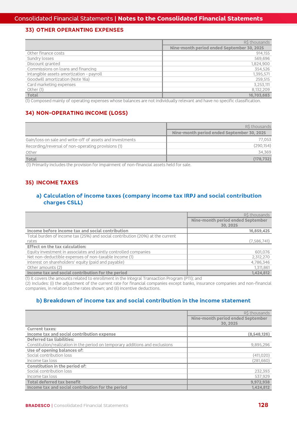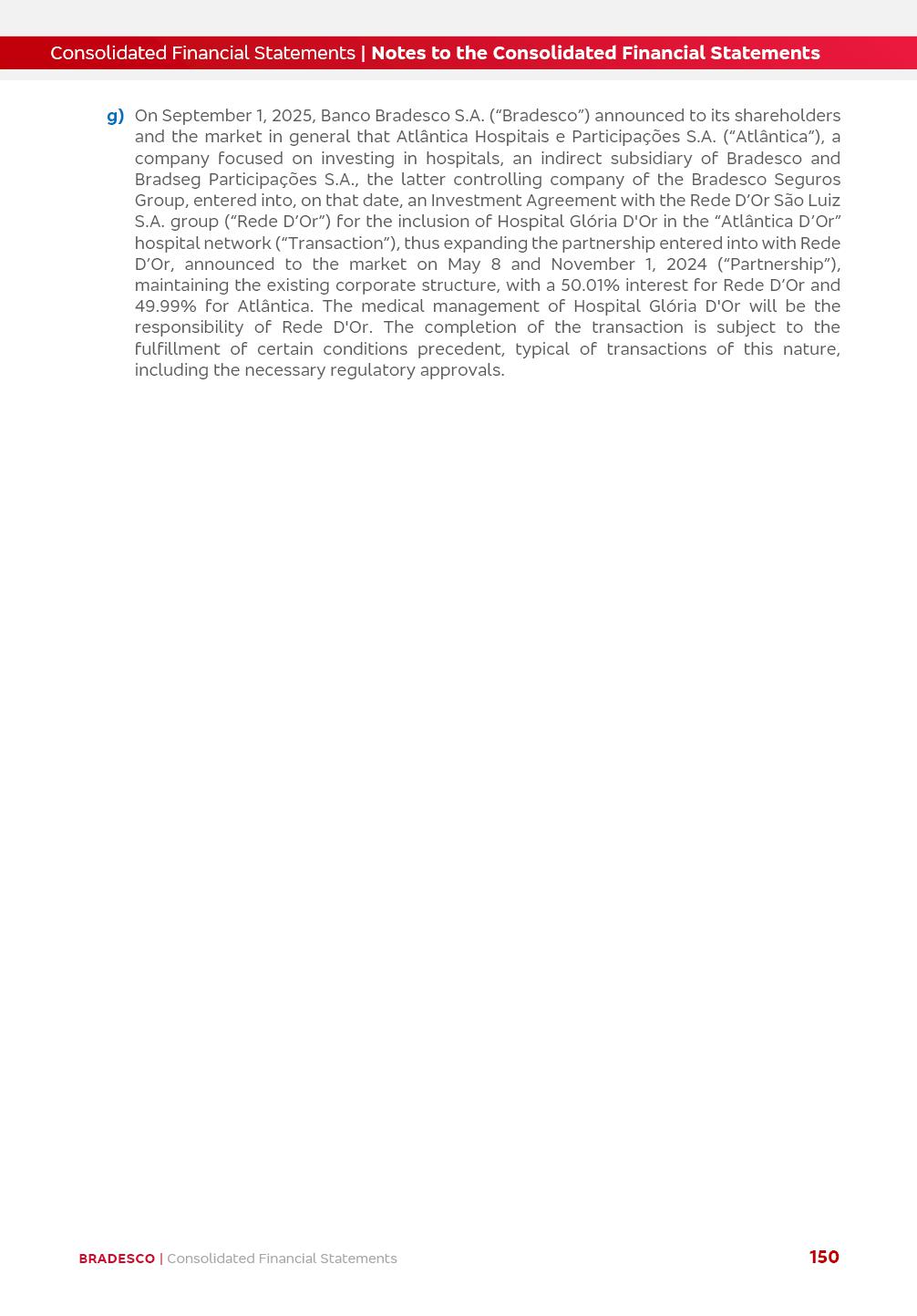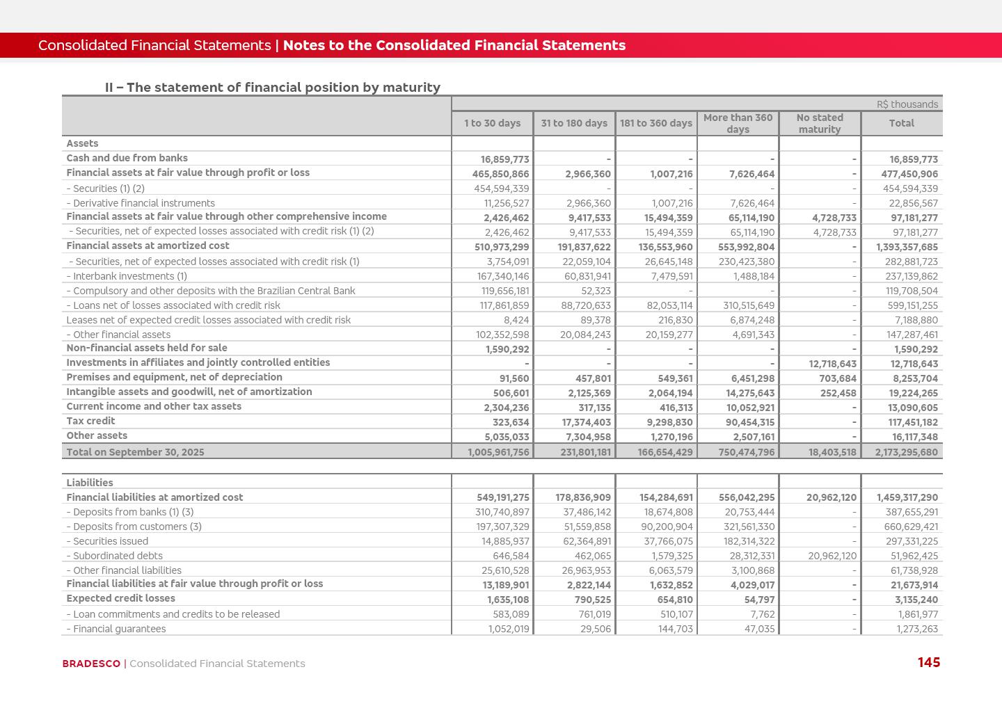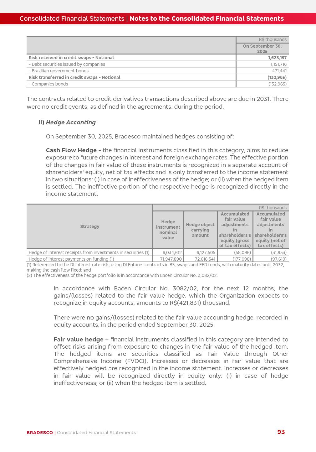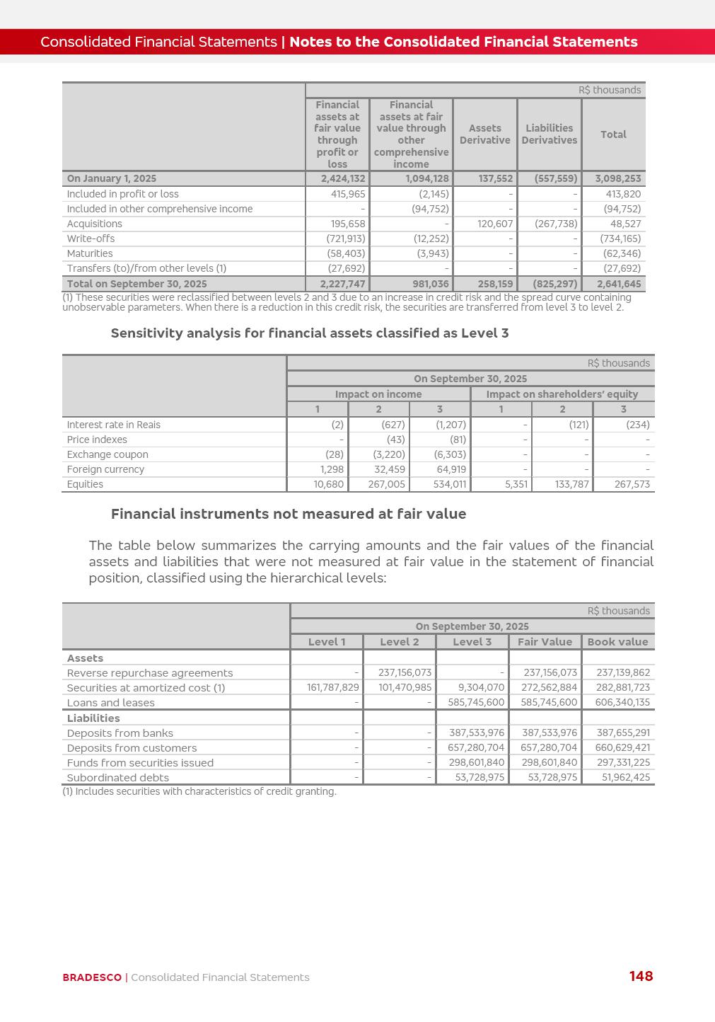 click on the items below to navigate through the document: 3Q25 managerial analysis of results management report consolidated financial statements videoconference commenting on the results October 30th at 9:30 AM (US Eastern Time) economic and financial analysis reportBradesco | Economic and Financial Analysis Report 3 Table of Contents Managerial Analysis of Results 5 press release 6 highlights 3Q25 7 recurring net income statement 8 net interest income 9 funding sources 10 loan portfolio 11 expenses with expanded loan loss provisions 16 loan indicators 17 fee and commission income 19 operating expenses 21 Bradesco Seguros 22 basel 27 guidance, indicators & economic perspectives 28 Additional Information 29 corporate strategy | customer-centric 30 NPS 31 our people 32 sustainability 33 digital in figures | BIA 34 Bradesco Principal 35 Bradesco Expresso 36 international operations | My Account 37 Bradesco Bank 38 Ágora Investimentos 39 Digio | next 40 service points, clients and market share 41 return to shareholders 42 additional information 43 selected information 45 consolidated balance sheet – Bradesco 46 consolidated balance sheet – Insurance 47 statement of income – managerial vs. recurring | BRGAAP vs. IFRS comparative 48 Independent Auditor’s Report 49 Consolidated Financial Statements 53 Bradesco | Economic and Financial Analysis Report 4 Some numbers included in this Report have been subjected to rounding adjustments. As a result, some amounts indicated as total amounts in some charts may not be the arithmetic sum of the preceding numbers. Percentage variations not presented in the framework of this report, are related, in their majority, to the low value balances compared with the other periods presented. As of January 2025, we adopted in our Financial Statements the new accounting practices established by CMN Resolutions No. 4,966 and No. 4,975. For management purposes, we kept the information of the previous periods as already disclosed, which do not present relevant differences in the historical analysis of the results. For some credit indicators, when mentioned, we carry out historical data for comparability purposes on a pro-forma basis. In our financial statements the Organization opted for the exemption provided by the Standard not to resubmit comparative information from previous periods resulting from the changes. Managerial Analysis of Results Bradesco | Economic and Financial Analysis Report 6 press release Bradesco is undergoing a transformation, fueling a continued positive performance. In the third quarter of the year, we took another step in boosting our profitability. We continue with the same commercial traction, while keeping delinquency indicators under control, prioritizing risk-adjusted returns. The transformation is advancing, supporting our evolution and enhancing our long-term competitiveness. Recurring net income was R$6.2 billion in 3Q25, an increase of 2.3% q/q and 18.8% y/y. As a result, ROAE topped 14.7% in the quarter. Total revenue reached R$35.0 billion in the quarter, increasing by 3.0% q/q and 13.1% y/y, driven by an expressive performance across all lines: net interest income, fee and commission income and income from insurance. The NII reached R$18.7 billion in the quarter, up by 3.7% q/q and 16.9% y/y. Client NII totaled R$18.6 billion, up by 4.8% q/q and 19.0% y/y, mainly driven by the increase in the loan portfolio and the average spread, which improved from 8.8% in 2Q25 to 9.0% in 3Q25, benefiting from higher efficiency in funding. Market NII was R$99 million in 3Q25, decreasing from the previous quarter, as expected. The expanded loan portfolio grew by 9.6% y/y and 1.6% q/q in Sept25, driven by the MSME and Individual segments. It is worth highlighting the increase in the share of secured credit lines, which went from 58.5% in Jun25 to 59.5% in Sept25. In terms of MSME, products such as receivables discounting and working capital loans (FGI and FGO - government-backed guarantee funds) stand out, and for Individuals, in payroll-deductible loans, rural loans, and high-income credit card lines. In September 2025, the delinquency ratio (over 90 days NPL) remained stable at 4.1%. Delinquency in MSME posted an improvement of 0.6 p.p. q/q, reflecting the quality of recent vintages, while Individuals loan indicator was impacted by the higher level of delays in John Deere Bank operations, which are collateralized and subject to a distinct recovery timeline. The cost of credit increased slightly, from 3.2% in 2Q25 to 3.3% in 3Q25, reflecting an increase of provisions for specific wholesale cases and John Deere Bank. We highlight the decrease of R$1.8 billion in the restructured portfolio against the previous quarter and of R$8.2 billion in the annual comparison. The quality of our credit portfolio showed improvement, being that stage 1 loan participation rose 30 bps while stage 3 fell 20 bps, resulting from better originations and the sequential cleanup of problematic assets. Fee and commission income increased by 2.8% q/q and 6.9% y/y. The positive standouts over the quarter included fees from consortia, cards, loan operations and asset management. Once again, the operational performance of insurance activities was significant, with income from insurance operations reaching of R$5.7 billion (1.0% q/q and 13.0% y/y) and net income of R$2.5 billion (10.3% q/q and 6.5% y/y). The ROAE of the insurance company was 22.4% in 3Q25. Operating expenses increased by 3.7% q/q and 9.6% y/y, in line with expectations. This growth rate largely reflects the investments being made in the bank and its affiliates. Analyzing only personnel and administrative expenses, there was a 5.5% y/y growth in 3Q25, which shrinks to 2.5% when we exclude the profit-sharing expenses, below inflation of 5.2% for the period, underlining the strong cost-control measures currently in place within the Organization. With that, we maintained our efficiency ratio stable at abou