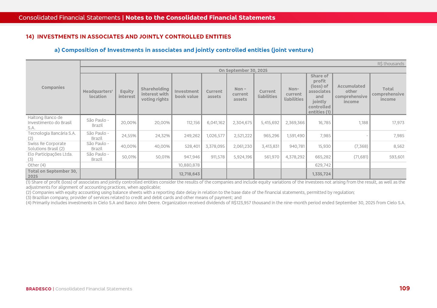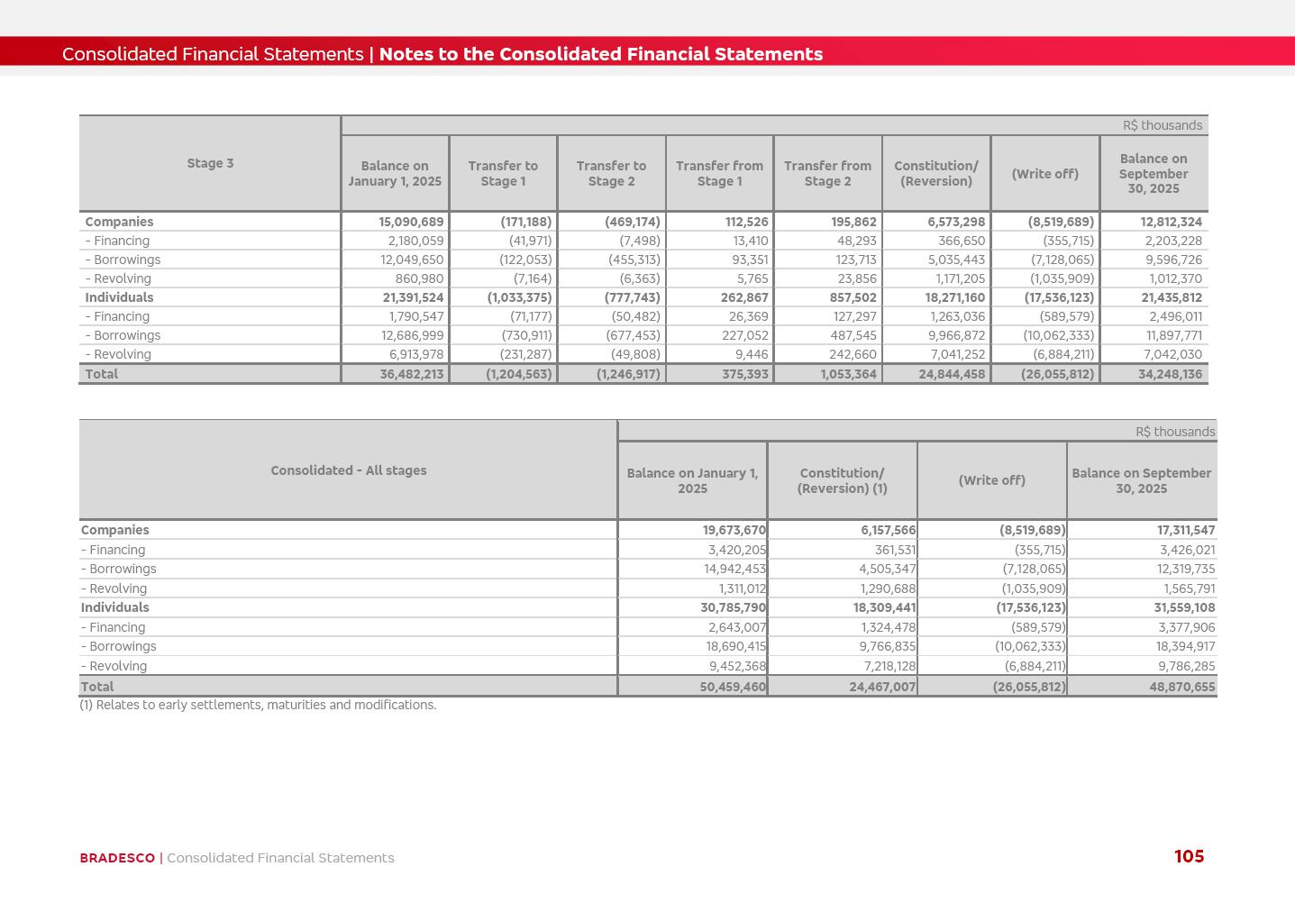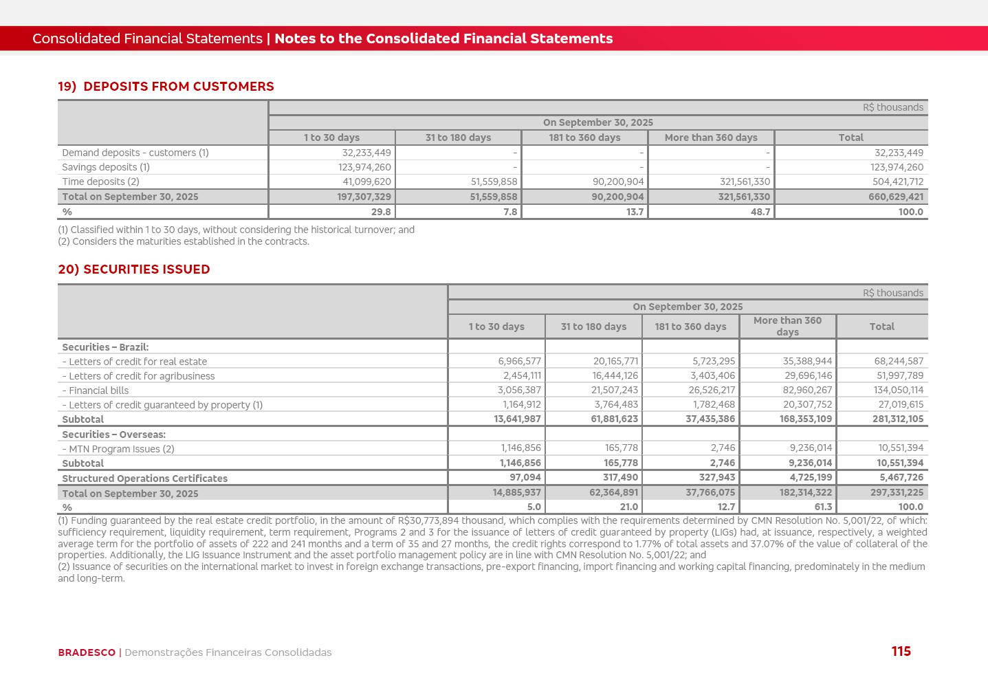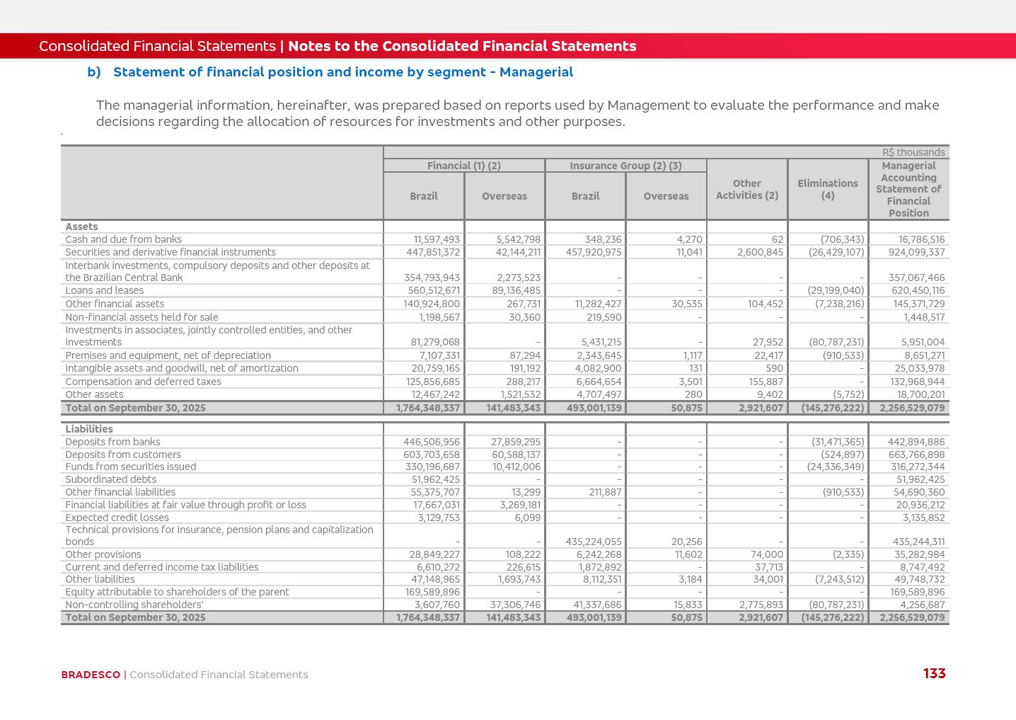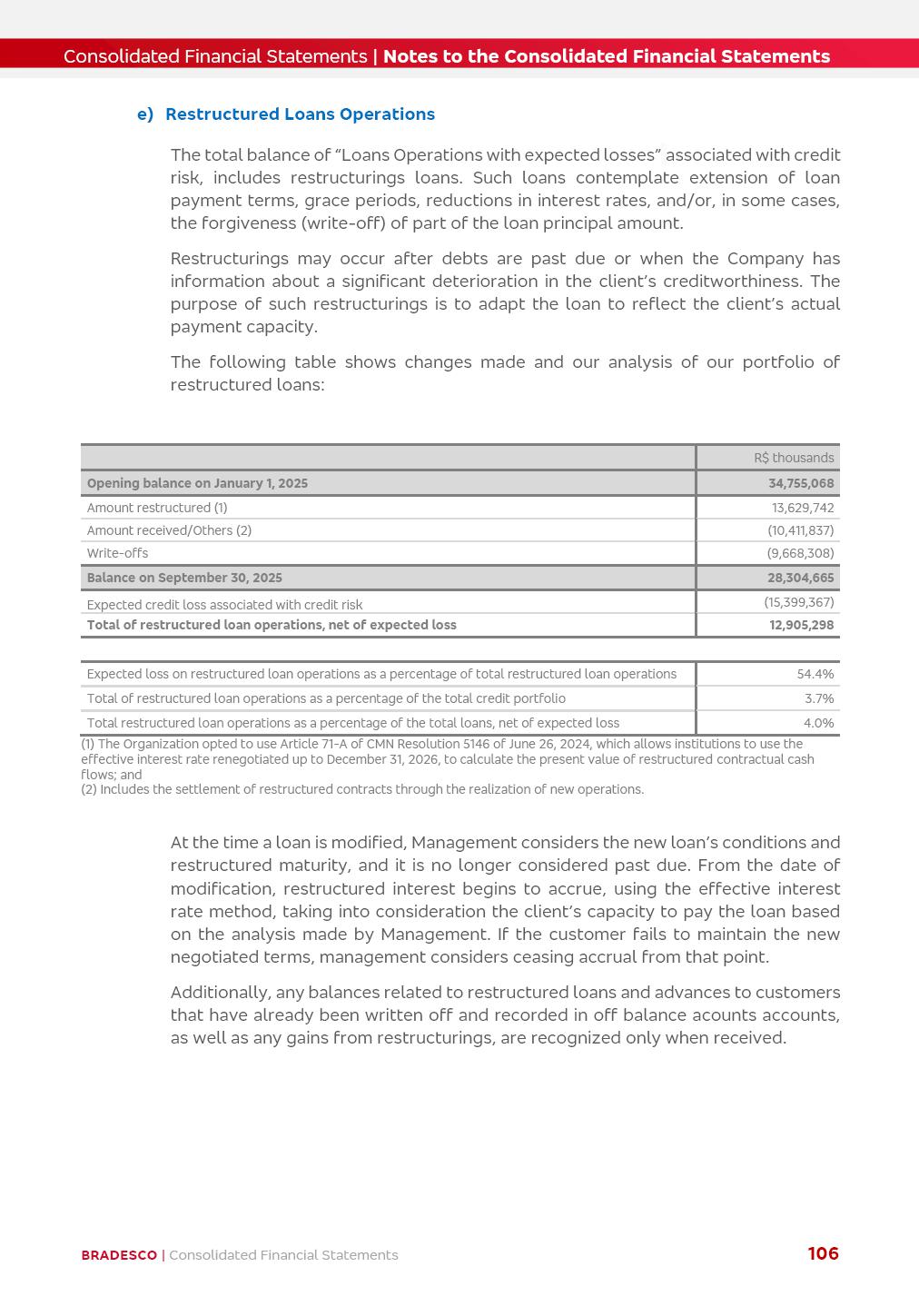 click on the items below to navigate through the document: 3Q25 managerial analysis of results management report consolidated financial statements videoconference commenting on the results October 30th at 9:30 AM (US Eastern Time) economic and financial analysis reportBradesco | Economic and Financial Analysis Report 3 Table of Contents Managerial Analysis of Results 5 press release 6 highlights 3Q25 7 recurring net income statement 8 net interest income 9 funding sources 10 loan portfolio 11 expenses with expanded loan loss provisions 16 loan indicators 17 fee and commission income 19 operating expenses 21 Bradesco Seguros 22 basel 27 guidance, indicators & economic perspectives 28 Additional Information 29 corporate strategy | customer-centric 30 NPS 31 our people 32 sustainability 33 digital in figures | BIA 34 Bradesco Principal 35 Bradesco Expresso 36 international operations | My Account 37 Bradesco Bank 38 Ágora Investimentos 39 Digio | next 40 service points, clients and market share 41 return to shareholders 42 additional information 43 selected information 45 consolidated balance sheet – Bradesco 46 consolidated balance sheet – Insurance 47 statement of income – managerial vs. recurring | BRGAAP vs. IFRS comparative 48 Independent Auditor’s Report 49 Consolidated Financial Statements 53 Bradesco | Economic and Financial Analysis Report 4 Some numbers included in this Report have been subjected to rounding adjustments. As a result, some amounts indicated as total amounts in some charts may not be the arithmetic sum of the preceding numbers. Percentage variations not presented in the framework of this report, are related, in their majority, to the low value balances compared with the other periods presented. As of January 2025, we adopted in our Financial Statements the new accounting practices established by CMN Resolutions No. 4,966 and No. 4,975. For management purposes, we kept the information of the previous periods as already disclosed, which do not present relevant differences in the historical analysis of the results. For some credit indicators, when mentioned, we carry out historical data for comparability purposes on a pro-forma basis. In our financial statements the Organization opted for the exemption provided by the Standard not to resubmit comparative information from previous periods resulting from the changes. Managerial Analysis of Results Bradesco | Economic and Financial Analysis Report 6 press release Bradesco is undergoing a transformation, fueling a continued positive performance. In the third quarter of the year, we took another step in boosting our profitability. We continue with the same commercial traction, while keeping delinquency indicators under control, prioritizing risk-adjusted returns. The transformation is advancing, supporting our evolution and enhancing our long-term competitiveness. Recurring net income was R$6.2 billion in 3Q25, an increase of 2.3% q/q and 18.8% y/y. As a result, ROAE topped 14.7% in the quarter. Total revenue reached R$35.0 billion in the quarter, increasing by 3.0% q/q and 13.1% y/y, driven by an expressive performance across all lines: net interest income, fee and commission income and income from insurance. The NII reached R$18.7 billion in the quarter, up by 3.7% q/q and 16.9% y/y. Client NII totaled R$18.6 billion, up by 4.8% q/q and 19.0% y/y, mainly driven by the increase in the loan portfolio and the average spread, which improved from 8.8% in 2Q25 to 9.0% in 3Q25, benefiting from higher efficiency in funding. Market NII was R$99 million in 3Q25, decreasing from the previous quarter, as expected. The expanded loan portfolio grew by 9.6% y/y and 1.6% q/q in Sept25, driven by the MSME and Individual segments. It is worth highlighting the increase in the share of secured credit lines, which went from 58.5% in Jun25 to 59.5% in Sept25. In terms of MSME, products such as receivables discounting and working capital loans (FGI and FGO - government-backed guarantee funds) stand out, and for Individuals, in payroll-deductible loans, rural loans, and high-income credit card lines. In September 2025, the delinquency ratio (over 90 days NPL) remained stable at 4.1%. Delinquency in MSME posted an improvement of 0.6 p.p. q/q, reflecting the quality of recent vintages, while Individuals loan indicator was impacted by the higher level of delays in John Deere Bank operations, which are collateralized and subject to a distinct recovery timeline. The cost of credit increased slightly, from 3.2% in 2Q25 to 3.3% in 3Q25, reflecting an increase of provisions for specific wholesale cases and John Deere Bank. We highlight the decrease of R$1.8 billion in the restructured portfolio against the previous quarter and of R$8.2 billion in the annual comparison. The quality of our credit portfolio showed improvement, being that stage 1 loan participation rose 30 bps while stage 3 fell 20 bps, resulting from better originations and the sequential cleanup of problematic assets. Fee and commission income increased by 2.8% q/q and 6.9% y/y. The positive standouts over the quarter included fees from consortia, cards, loan operations and asset management. Once again, the operational performance of insurance activities was significant, with income from insurance operations reaching of R$5.7 billion (1.0% q/q and 13.0% y/y) and net income of R$2.5 billion (10.3% q/q and 6.5% y/y). The ROAE of the insurance company was 22.4% in 3Q25. Operating expenses increased by 3.7% q/q and 9.6% y/y, in line with expectations. This growth rate largely reflects the investments being made in the bank and its affiliates. Analyzing only personnel and administrative expenses, there was a 5.5% y/y growth in 3Q25, which shrinks to 2.5% when we exclude the profit-sharing expenses, below inflation of 5.2% for the period, underlining the strong cost-control measures currently in place within the Organization. With that, we maintained our efficiency ratio stable at abou