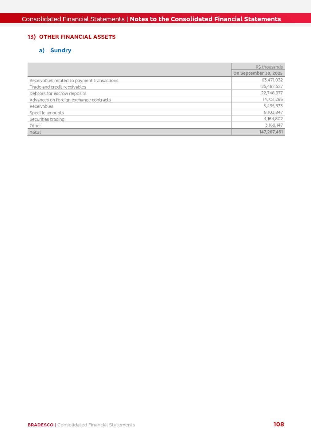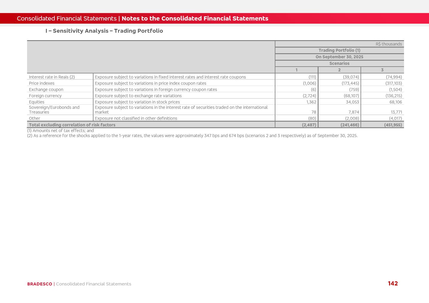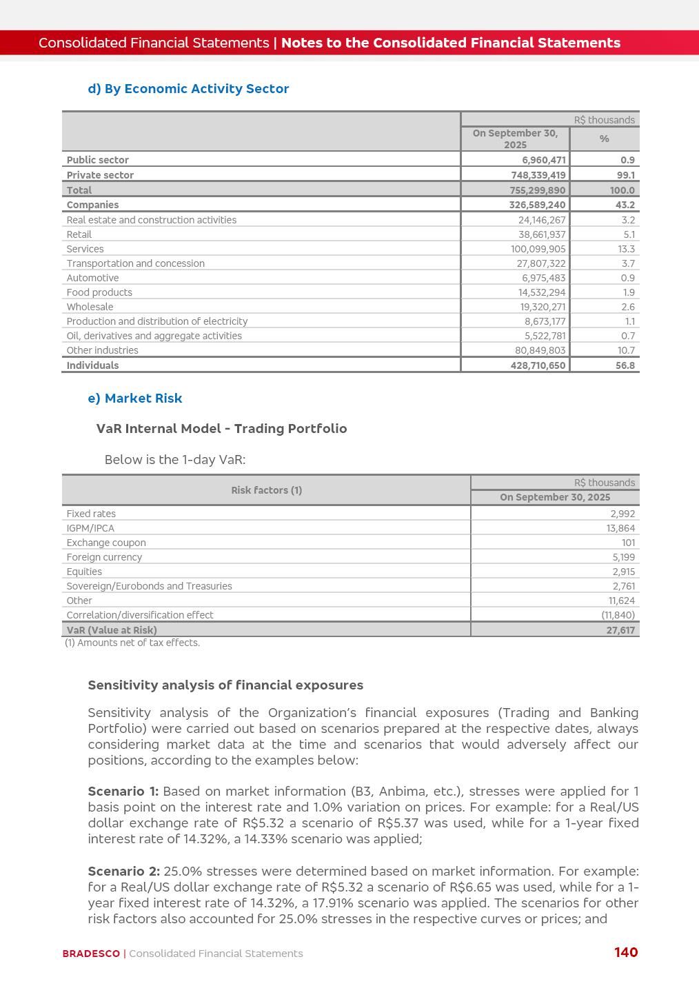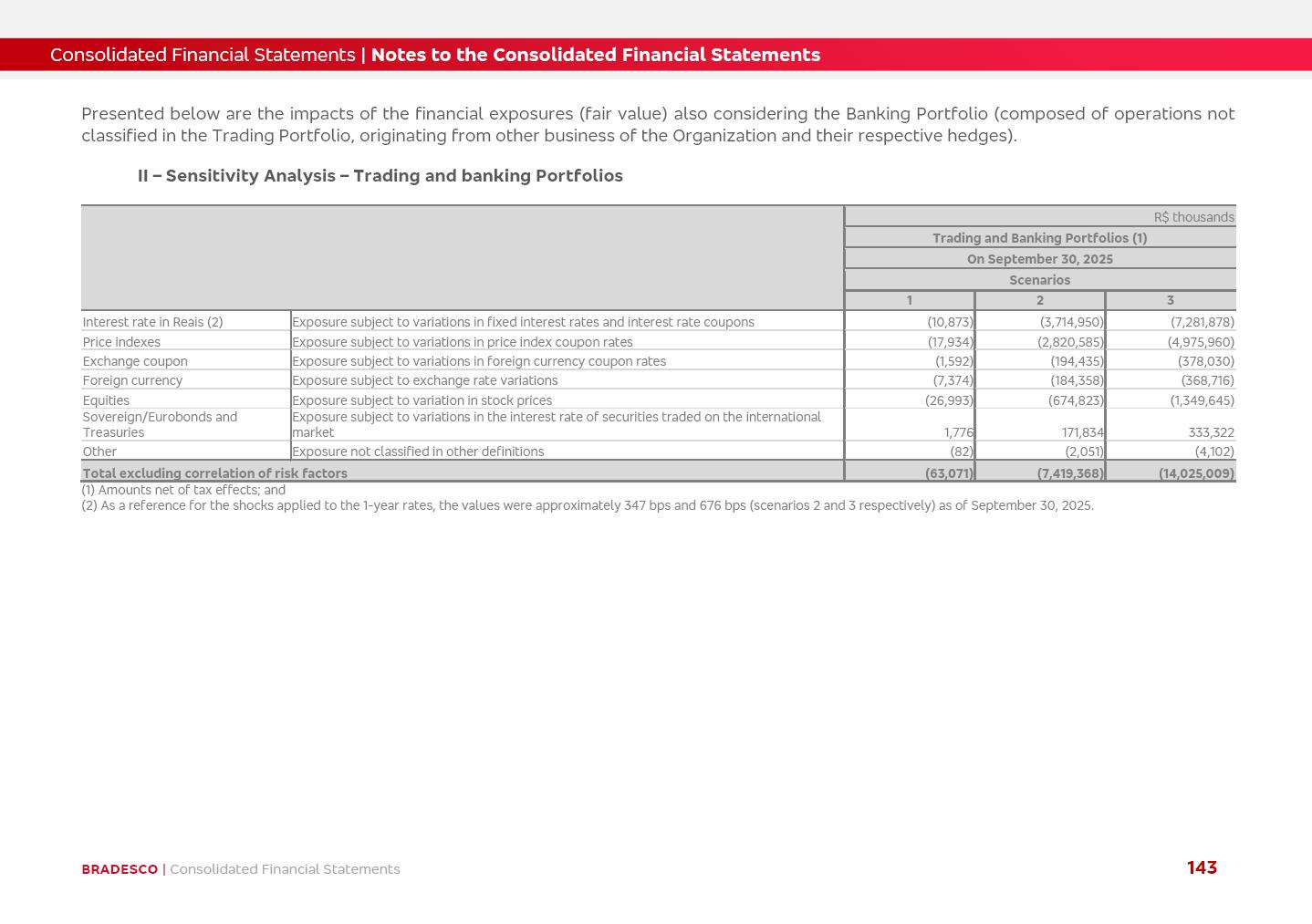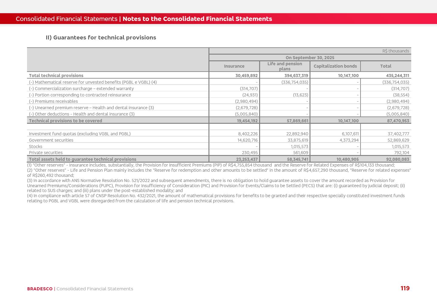 click on the items below to navigate through the document: 3Q25 managerial analysis of results management report consolidated financial statements videoconference commenting on the results October 30th at 9:30 AM (US Eastern Time) economic and financial analysis reportBradesco | Economic and Financial Analysis Report 3 Table of Contents Managerial Analysis of Results 5 press release 6 highlights 3Q25 7 recurring net income statement 8 net interest income 9 funding sources 10 loan portfolio 11 expenses with expanded loan loss provisions 16 loan indicators 17 fee and commission income 19 operating expenses 21 Bradesco Seguros 22 basel 27 guidance, indicators & economic perspectives 28 Additional Information 29 corporate strategy | customer-centric 30 NPS 31 our people 32 sustainability 33 digital in figures | BIA 34 Bradesco Principal 35 Bradesco Expresso 36 international operations | My Account 37 Bradesco Bank 38 Ágora Investimentos 39 Digio | next 40 service points, clients and market share 41 return to shareholders 42 additional information 43 selected information 45 consolidated balance sheet – Bradesco 46 consolidated balance sheet – Insurance 47 statement of income – managerial vs. recurring | BRGAAP vs. IFRS comparative 48 Independent Auditor’s Report 49 Consolidated Financial Statements 53 Bradesco | Economic and Financial Analysis Report 4 Some numbers included in this Report have been subjected to rounding adjustments. As a result, some amounts indicated as total amounts in some charts may not be the arithmetic sum of the preceding numbers. Percentage variations not presented in the framework of this report, are related, in their majority, to the low value balances compared with the other periods presented. As of January 2025, we adopted in our Financial Statements the new accounting practices established by CMN Resolutions No. 4,966 and No. 4,975. For management purposes, we kept the information of the previous periods as already disclosed, which do not present relevant differences in the historical analysis of the results. For some credit indicators, when mentioned, we carry out historical data for comparability purposes on a pro-forma basis. In our financial statements the Organization opted for the exemption provided by the Standard not to resubmit comparative information from previous periods resulting from the changes. Managerial Analysis of Results Bradesco | Economic and Financial Analysis Report 6 press release Bradesco is undergoing a transformation, fueling a continued positive performance. In the third quarter of the year, we took another step in boosting our profitability. We continue with the same commercial traction, while keeping delinquency indicators under control, prioritizing risk-adjusted returns. The transformation is advancing, supporting our evolution and enhancing our long-term competitiveness. Recurring net income was R$6.2 billion in 3Q25, an increase of 2.3% q/q and 18.8% y/y. As a result, ROAE topped 14.7% in the quarter. Total revenue reached R$35.0 billion in the quarter, increasing by 3.0% q/q and 13.1% y/y, driven by an expressive performance across all lines: net interest income, fee and commission income and income from insurance. The NII reached R$18.7 billion in the quarter, up by 3.7% q/q and 16.9% y/y. Client NII totaled R$18.6 billion, up by 4.8% q/q and 19.0% y/y, mainly driven by the increase in the loan portfolio and the average spread, which improved from 8.8% in 2Q25 to 9.0% in 3Q25, benefiting from higher efficiency in funding. Market NII was R$99 million in 3Q25, decreasing from the previous quarter, as expected. The expanded loan portfolio grew by 9.6% y/y and 1.6% q/q in Sept25, driven by the MSME and Individual segments. It is worth highlighting the increase in the share of secured credit lines, which went from 58.5% in Jun25 to 59.5% in Sept25. In terms of MSME, products such as receivables discounting and working capital loans (FGI and FGO - government-backed guarantee funds) stand out, and for Individuals, in payroll-deductible loans, rural loans, and high-income credit card lines. In September 2025, the delinquency ratio (over 90 days NPL) remained stable at 4.1%. Delinquency in MSME posted an improvement of 0.6 p.p. q/q, reflecting the quality of recent vintages, while Individuals loan indicator was impacted by the higher level of delays in John Deere Bank operations, which are collateralized and subject to a distinct recovery timeline. The cost of credit increased slightly, from 3.2% in 2Q25 to 3.3% in 3Q25, reflecting an increase of provisions for specific wholesale cases and John Deere Bank. We highlight the decrease of R$1.8 billion in the restructured portfolio against the previous quarter and of R$8.2 billion in the annual comparison. The quality of our credit portfolio showed improvement, being that stage 1 loan participation rose 30 bps while stage 3 fell 20 bps, resulting from better originations and the sequential cleanup of problematic assets. Fee and commission income increased by 2.8% q/q and 6.9% y/y. The positive standouts over the quarter included fees from consortia, cards, loan operations and asset management. Once again, the operational performance of insurance activities was significant, with income from insurance operations reaching of R$5.7 billion (1.0% q/q and 13.0% y/y) and net income of R$2.5 billion (10.3% q/q and 6.5% y/y). The ROAE of the insurance company was 22.4% in 3Q25. Operating expenses increased by 3.7% q/q and 9.6% y/y, in line with expectations. This growth rate largely reflects the investments being made in the bank and its affiliates. Analyzing only personnel and administrative expenses, there was a 5.5% y/y growth in 3Q25, which shrinks to 2.5% when we exclude the profit-sharing expenses, below inflation of 5.2% for the period, underlining the strong cost-control measures currently in place within the Organization. With that, we maintained our efficiency ratio stable at abou