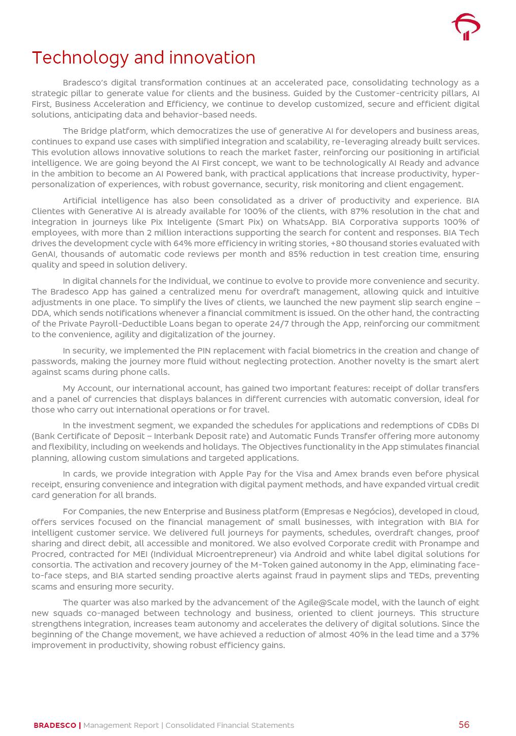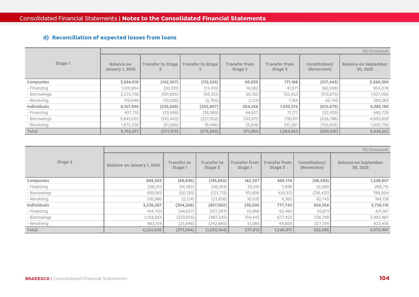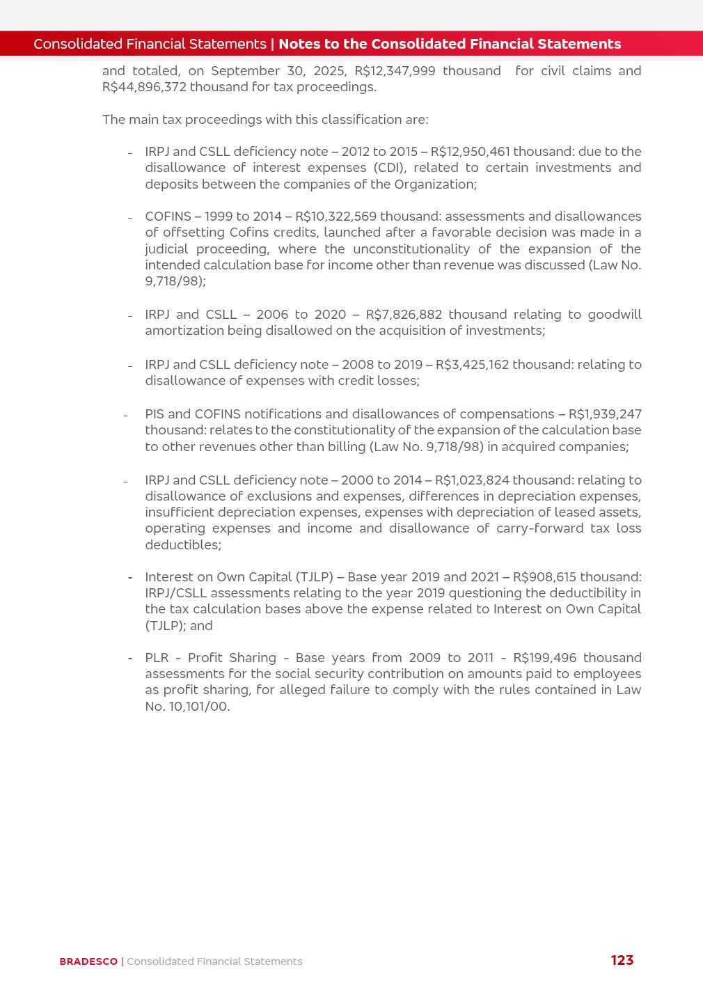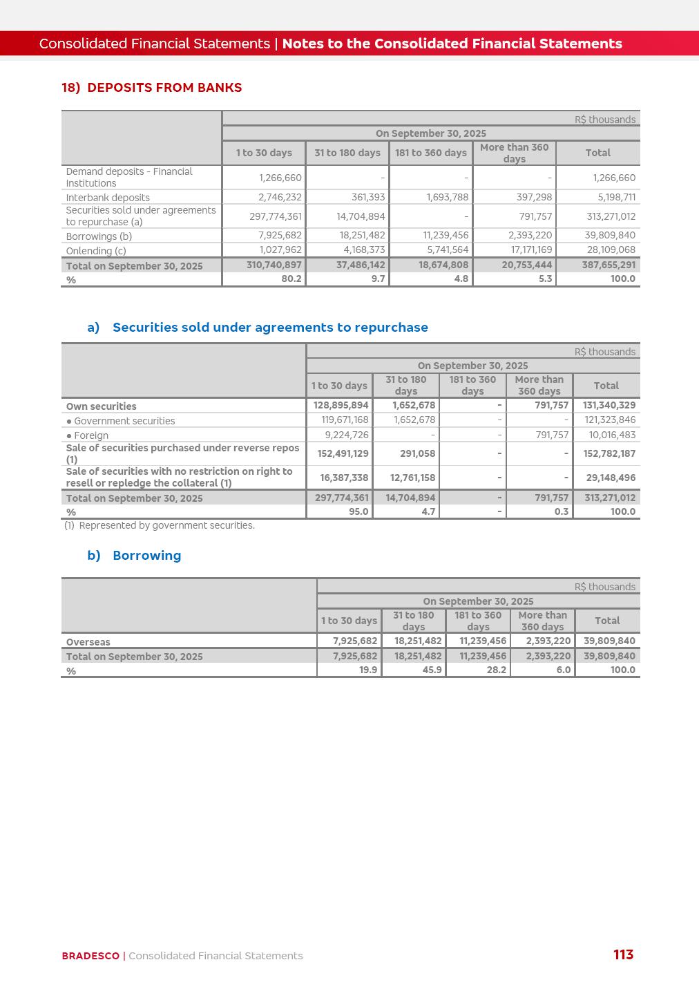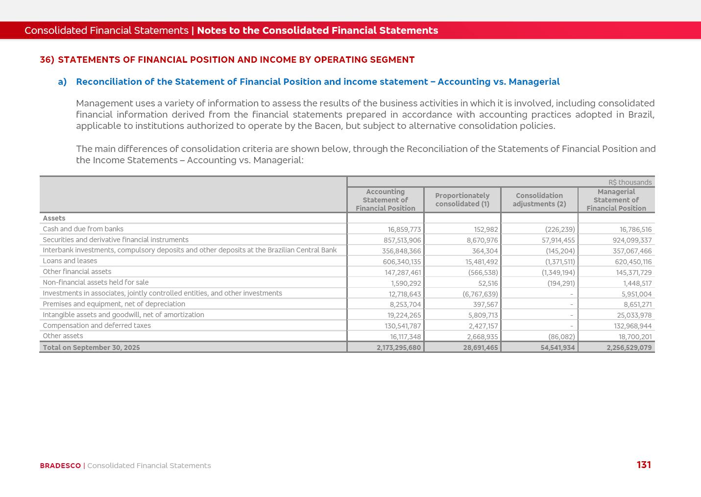 click on the items below to navigate through the document: 3Q25 managerial analysis of results management report consolidated financial statements videoconference commenting on the results October 30th at 9:30 AM (US Eastern Time) economic and financial analysis reportBradesco | Economic and Financial Analysis Report 3 Table of Contents Managerial Analysis of Results 5 press release 6 highlights 3Q25 7 recurring net income statement 8 net interest income 9 funding sources 10 loan portfolio 11 expenses with expanded loan loss provisions 16 loan indicators 17 fee and commission income 19 operating expenses 21 Bradesco Seguros 22 basel 27 guidance, indicators & economic perspectives 28 Additional Information 29 corporate strategy | customer-centric 30 NPS 31 our people 32 sustainability 33 digital in figures | BIA 34 Bradesco Principal 35 Bradesco Expresso 36 international operations | My Account 37 Bradesco Bank 38 Ágora Investimentos 39 Digio | next 40 service points, clients and market share 41 return to shareholders 42 additional information 43 selected information 45 consolidated balance sheet – Bradesco 46 consolidated balance sheet – Insurance 47 statement of income – managerial vs. recurring | BRGAAP vs. IFRS comparative 48 Independent Auditor’s Report 49 Consolidated Financial Statements 53 Bradesco | Economic and Financial Analysis Report 4 Some numbers included in this Report have been subjected to rounding adjustments. As a result, some amounts indicated as total amounts in some charts may not be the arithmetic sum of the preceding numbers. Percentage variations not presented in the framework of this report, are related, in their majority, to the low value balances compared with the other periods presented. As of January 2025, we adopted in our Financial Statements the new accounting practices established by CMN Resolutions No. 4,966 and No. 4,975. For management purposes, we kept the information of the previous periods as already disclosed, which do not present relevant differences in the historical analysis of the results. For some credit indicators, when mentioned, we carry out historical data for comparability purposes on a pro-forma basis. In our financial statements the Organization opted for the exemption provided by the Standard not to resubmit comparative information from previous periods resulting from the changes. Managerial Analysis of Results Bradesco | Economic and Financial Analysis Report 6 press release Bradesco is undergoing a transformation, fueling a continued positive performance. In the third quarter of the year, we took another step in boosting our profitability. We continue with the same commercial traction, while keeping delinquency indicators under control, prioritizing risk-adjusted returns. The transformation is advancing, supporting our evolution and enhancing our long-term competitiveness. Recurring net income was R$6.2 billion in 3Q25, an increase of 2.3% q/q and 18.8% y/y. As a result, ROAE topped 14.7% in the quarter. Total revenue reached R$35.0 billion in the quarter, increasing by 3.0% q/q and 13.1% y/y, driven by an expressive performance across all lines: net interest income, fee and commission income and income from insurance. The NII reached R$18.7 billion in the quarter, up by 3.7% q/q and 16.9% y/y. Client NII totaled R$18.6 billion, up by 4.8% q/q and 19.0% y/y, mainly driven by the increase in the loan portfolio and the average spread, which improved from 8.8% in 2Q25 to 9.0% in 3Q25, benefiting from higher efficiency in funding. Market NII was R$99 million in 3Q25, decreasing from the previous quarter, as expected. The expanded loan portfolio grew by 9.6% y/y and 1.6% q/q in Sept25, driven by the MSME and Individual segments. It is worth highlighting the increase in the share of secured credit lines, which went from 58.5% in Jun25 to 59.5% in Sept25. In terms of MSME, products such as receivables discounting and working capital loans (FGI and FGO - government-backed guarantee funds) stand out, and for Individuals, in payroll-deductible loans, rural loans, and high-income credit card lines. In September 2025, the delinquency ratio (over 90 days NPL) remained stable at 4.1%. Delinquency in MSME posted an improvement of 0.6 p.p. q/q, reflecting the quality of recent vintages, while Individuals loan indicator was impacted by the higher level of delays in John Deere Bank operations, which are collateralized and subject to a distinct recovery timeline. The cost of credit increased slightly, from 3.2% in 2Q25 to 3.3% in 3Q25, reflecting an increase of provisions for specific wholesale cases and John Deere Bank. We highlight the decrease of R$1.8 billion in the restructured portfolio against the previous quarter and of R$8.2 billion in the annual comparison. The quality of our credit portfolio showed improvement, being that stage 1 loan participation rose 30 bps while stage 3 fell 20 bps, resulting from better originations and the sequential cleanup of problematic assets. Fee and commission income increased by 2.8% q/q and 6.9% y/y. The positive standouts over the quarter included fees from consortia, cards, loan operations and asset management. Once again, the operational performance of insurance activities was significant, with income from insurance operations reaching of R$5.7 billion (1.0% q/q and 13.0% y/y) and net income of R$2.5 billion (10.3% q/q and 6.5% y/y). The ROAE of the insurance company was 22.4% in 3Q25. Operating expenses increased by 3.7% q/q and 9.6% y/y, in line with expectations. This growth rate largely reflects the investments being made in the bank and its affiliates. Analyzing only personnel and administrative expenses, there was a 5.5% y/y growth in 3Q25, which shrinks to 2.5% when we exclude the profit-sharing expenses, below inflation of 5.2% for the period, underlining the strong cost-control measures currently in place within the Organization. With that, we maintained our efficiency ratio stable at abou