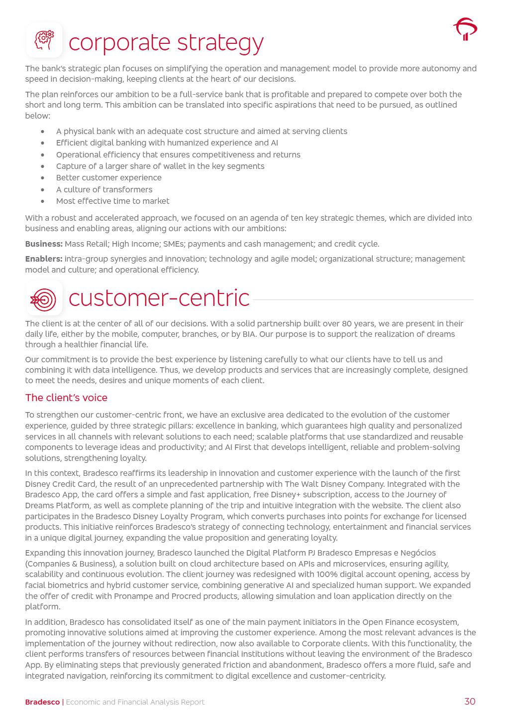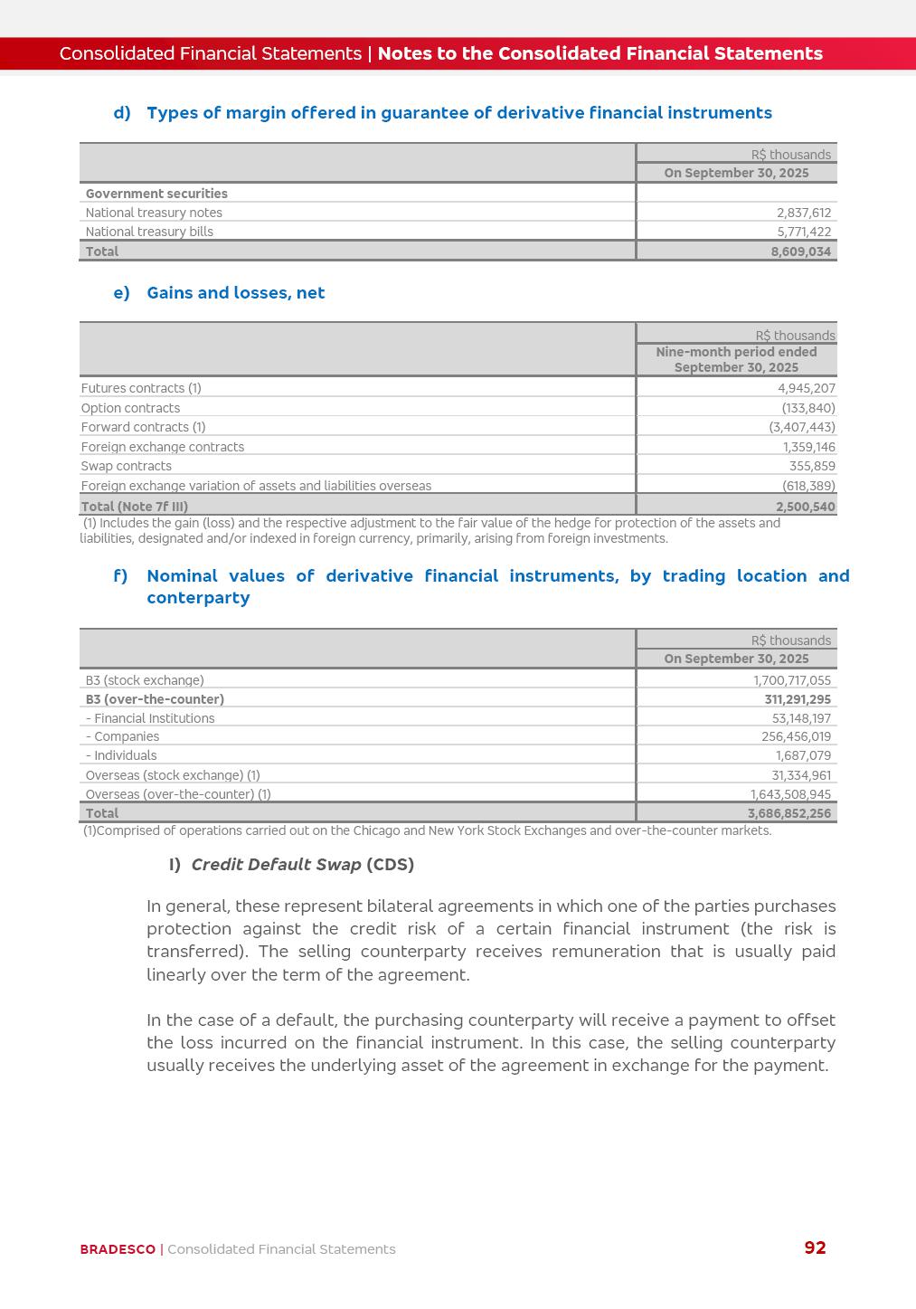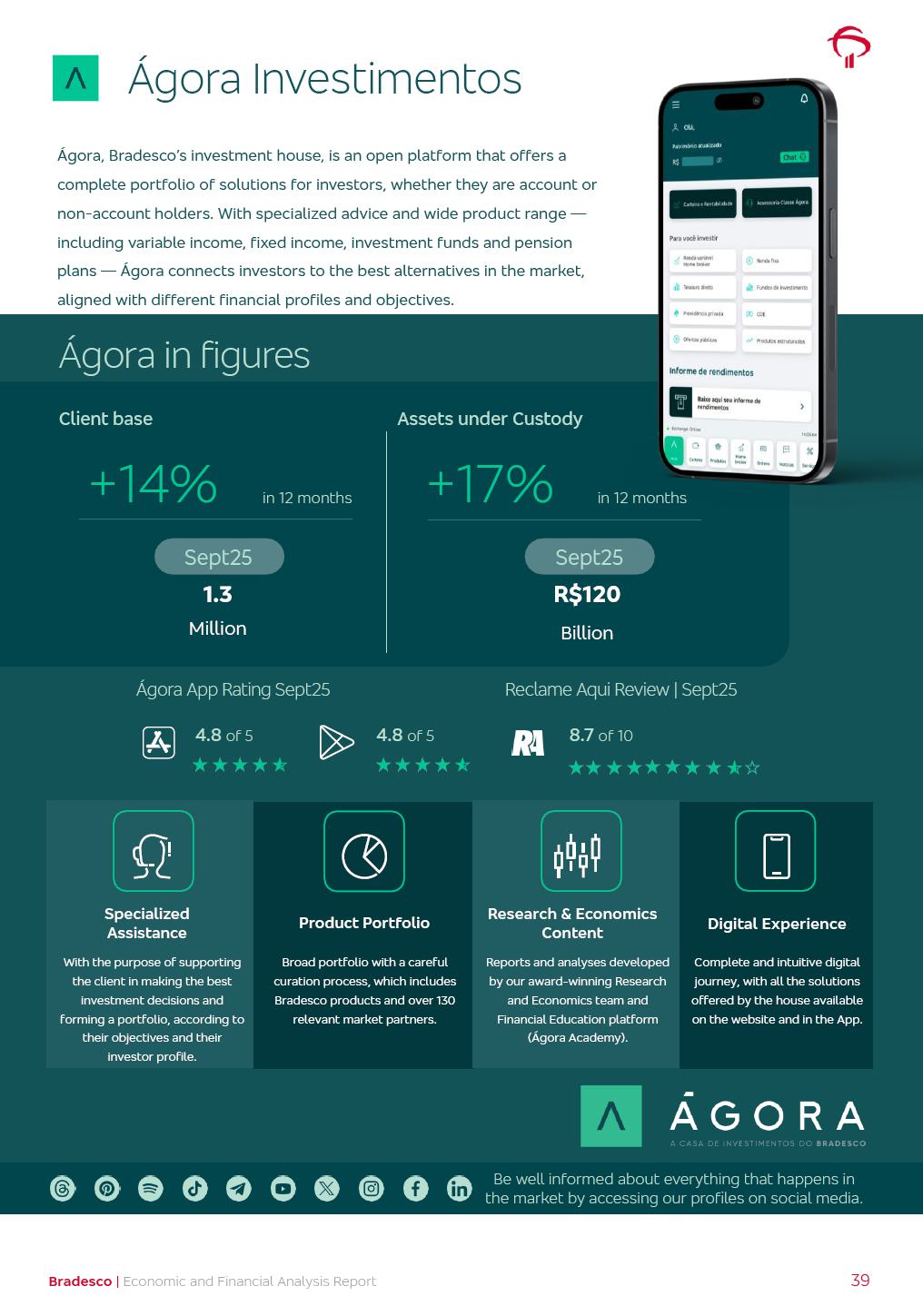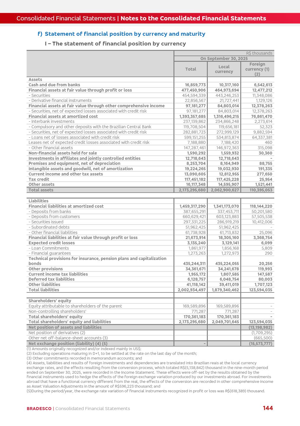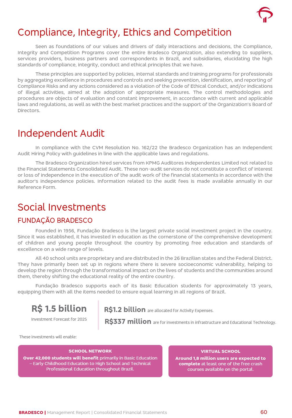 click on the items below to navigate through the document: 3Q25 managerial analysis of results management report consolidated financial statements videoconference commenting on the results October 30th at 9:30 AM (US Eastern Time) economic and financial analysis reportBradesco | Economic and Financial Analysis Report 3 Table of Contents Managerial Analysis of Results 5 press release 6 highlights 3Q25 7 recurring net income statement 8 net interest income 9 funding sources 10 loan portfolio 11 expenses with expanded loan loss provisions 16 loan indicators 17 fee and commission income 19 operating expenses 21 Bradesco Seguros 22 basel 27 guidance, indicators & economic perspectives 28 Additional Information 29 corporate strategy | customer-centric 30 NPS 31 our people 32 sustainability 33 digital in figures | BIA 34 Bradesco Principal 35 Bradesco Expresso 36 international operations | My Account 37 Bradesco Bank 38 Ágora Investimentos 39 Digio | next 40 service points, clients and market share 41 return to shareholders 42 additional information 43 selected information 45 consolidated balance sheet – Bradesco 46 consolidated balance sheet – Insurance 47 statement of income – managerial vs. recurring | BRGAAP vs. IFRS comparative 48 Independent Auditor’s Report 49 Consolidated Financial Statements 53 Bradesco | Economic and Financial Analysis Report 4 Some numbers included in this Report have been subjected to rounding adjustments. As a result, some amounts indicated as total amounts in some charts may not be the arithmetic sum of the preceding numbers. Percentage variations not presented in the framework of this report, are related, in their majority, to the low value balances compared with the other periods presented. As of January 2025, we adopted in our Financial Statements the new accounting practices established by CMN Resolutions No. 4,966 and No. 4,975. For management purposes, we kept the information of the previous periods as already disclosed, which do not present relevant differences in the historical analysis of the results. For some credit indicators, when mentioned, we carry out historical data for comparability purposes on a pro-forma basis. In our financial statements the Organization opted for the exemption provided by the Standard not to resubmit comparative information from previous periods resulting from the changes. Managerial Analysis of Results Bradesco | Economic and Financial Analysis Report 6 press release Bradesco is undergoing a transformation, fueling a continued positive performance. In the third quarter of the year, we took another step in boosting our profitability. We continue with the same commercial traction, while keeping delinquency indicators under control, prioritizing risk-adjusted returns. The transformation is advancing, supporting our evolution and enhancing our long-term competitiveness. Recurring net income was R$6.2 billion in 3Q25, an increase of 2.3% q/q and 18.8% y/y. As a result, ROAE topped 14.7% in the quarter. Total revenue reached R$35.0 billion in the quarter, increasing by 3.0% q/q and 13.1% y/y, driven by an expressive performance across all lines: net interest income, fee and commission income and income from insurance. The NII reached R$18.7 billion in the quarter, up by 3.7% q/q and 16.9% y/y. Client NII totaled R$18.6 billion, up by 4.8% q/q and 19.0% y/y, mainly driven by the increase in the loan portfolio and the average spread, which improved from 8.8% in 2Q25 to 9.0% in 3Q25, benefiting from higher efficiency in funding. Market NII was R$99 million in 3Q25, decreasing from the previous quarter, as expected. The expanded loan portfolio grew by 9.6% y/y and 1.6% q/q in Sept25, driven by the MSME and Individual segments. It is worth highlighting the increase in the share of secured credit lines, which went from 58.5% in Jun25 to 59.5% in Sept25. In terms of MSME, products such as receivables discounting and working capital loans (FGI and FGO - government-backed guarantee funds) stand out, and for Individuals, in payroll-deductible loans, rural loans, and high-income credit card lines. In September 2025, the delinquency ratio (over 90 days NPL) remained stable at 4.1%. Delinquency in MSME posted an improvement of 0.6 p.p. q/q, reflecting the quality of recent vintages, while Individuals loan indicator was impacted by the higher level of delays in John Deere Bank operations, which are collateralized and subject to a distinct recovery timeline. The cost of credit increased slightly, from 3.2% in 2Q25 to 3.3% in 3Q25, reflecting an increase of provisions for specific wholesale cases and John Deere Bank. We highlight the decrease of R$1.8 billion in the restructured portfolio against the previous quarter and of R$8.2 billion in the annual comparison. The quality of our credit portfolio showed improvement, being that stage 1 loan participation rose 30 bps while stage 3 fell 20 bps, resulting from better originations and the sequential cleanup of problematic assets. Fee and commission income increased by 2.8% q/q and 6.9% y/y. The positive standouts over the quarter included fees from consortia, cards, loan operations and asset management. Once again, the operational performance of insurance activities was significant, with income from insurance operations reaching of R$5.7 billion (1.0% q/q and 13.0% y/y) and net income of R$2.5 billion (10.3% q/q and 6.5% y/y). The ROAE of the insurance company was 22.4% in 3Q25. Operating expenses increased by 3.7% q/q and 9.6% y/y, in line with expectations. This growth rate largely reflects the investments being made in the bank and its affiliates. Analyzing only personnel and administrative expenses, there was a 5.5% y/y growth in 3Q25, which shrinks to 2.5% when we exclude the profit-sharing expenses, below inflation of 5.2% for the period, underlining the strong cost-control measures currently in place within the Organization. With that, we maintained our efficiency ratio stable at abou