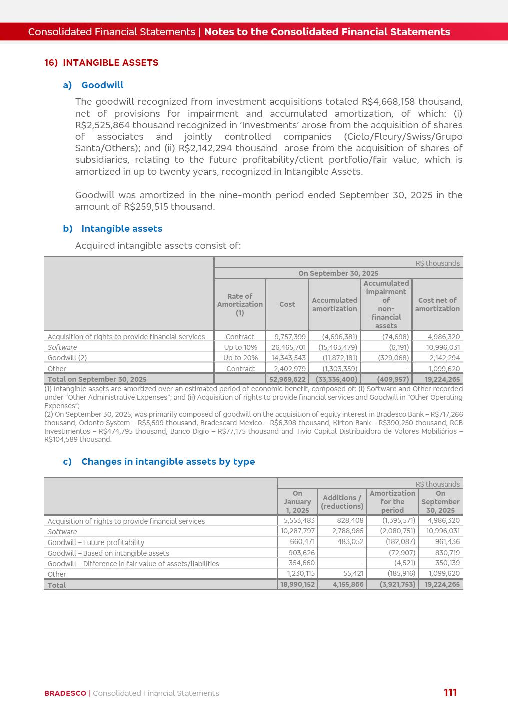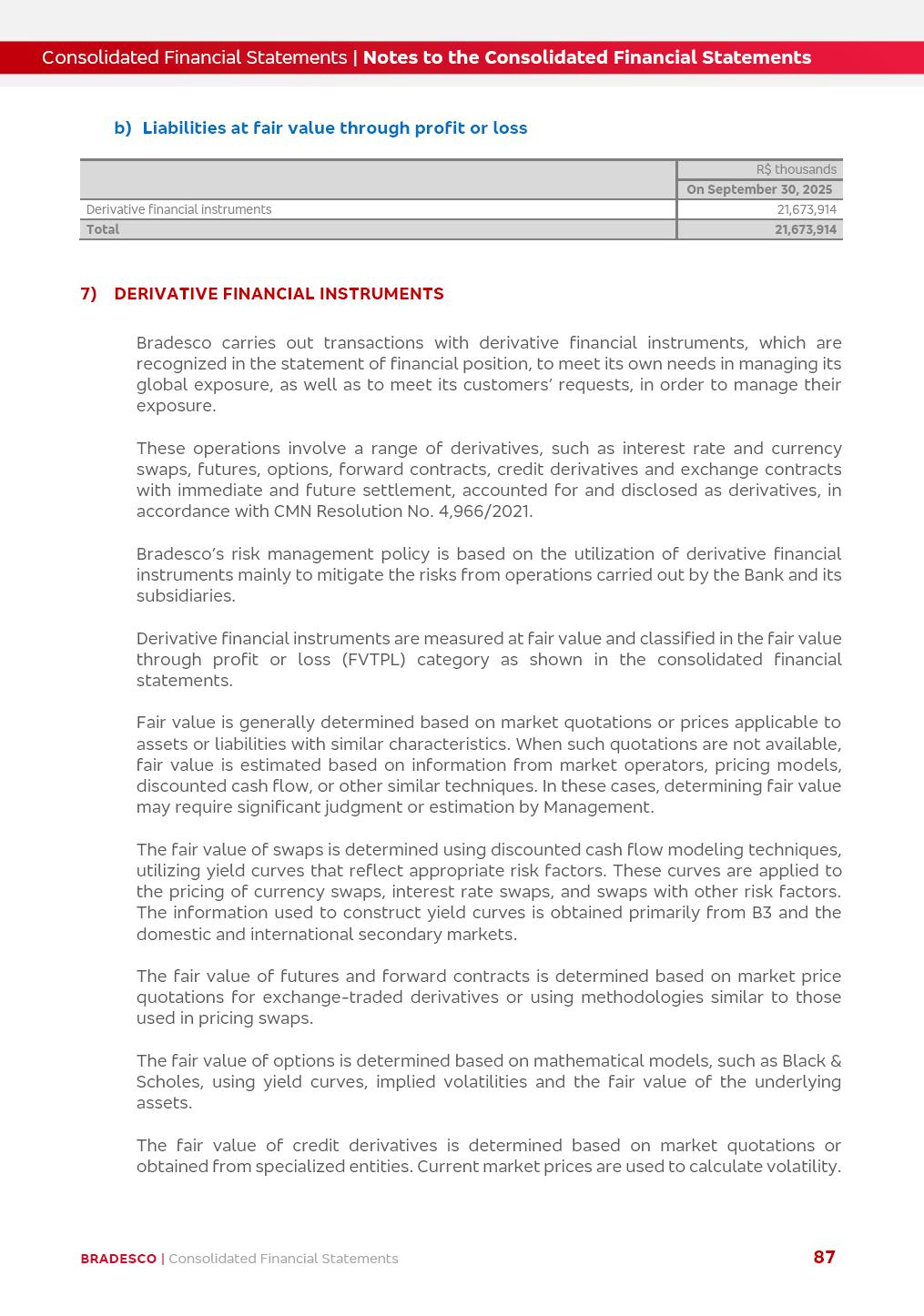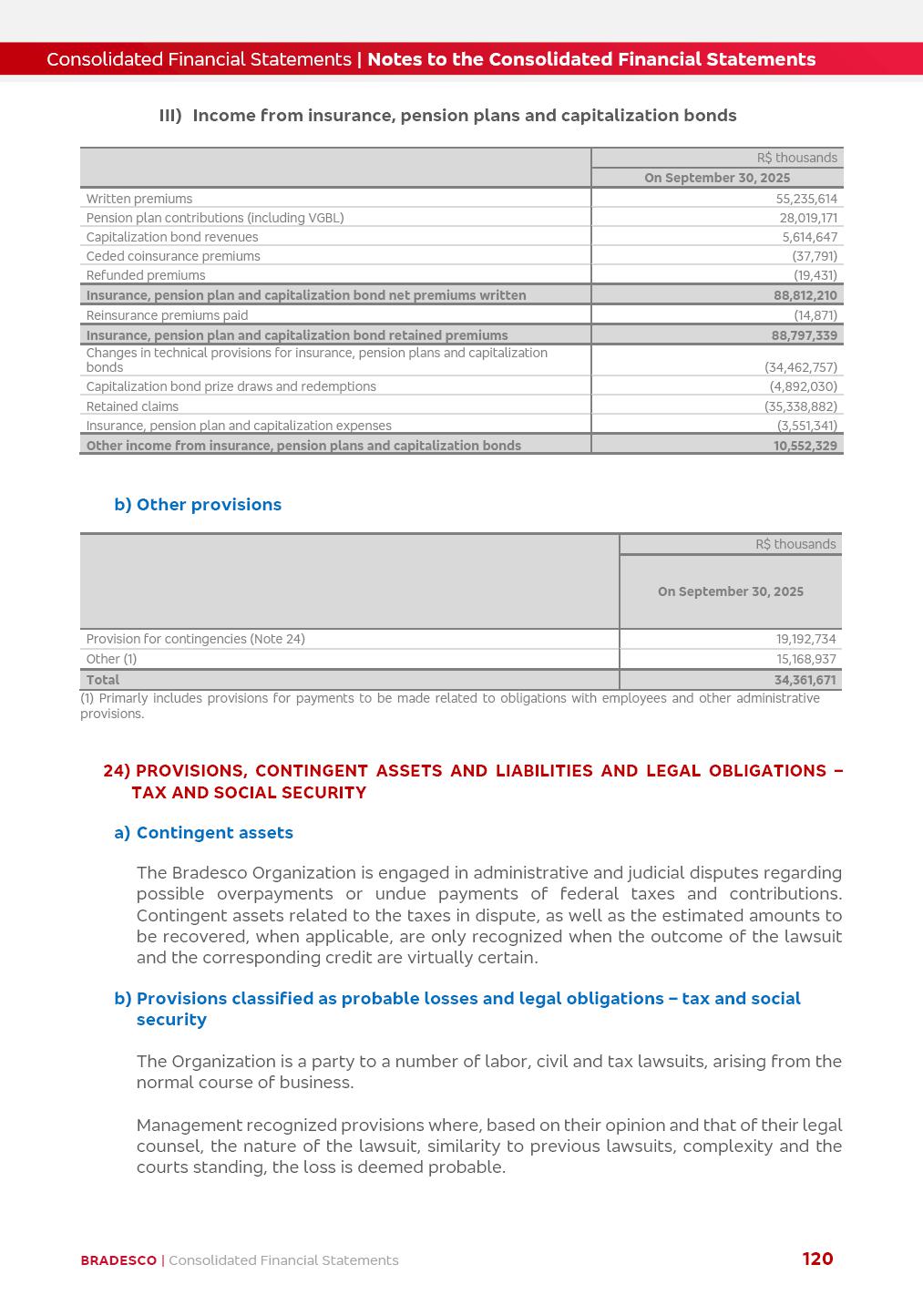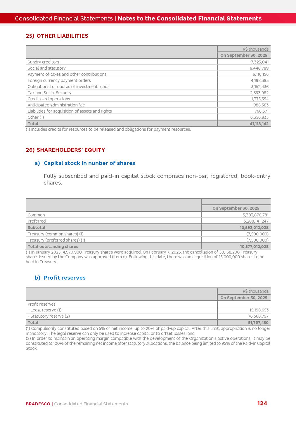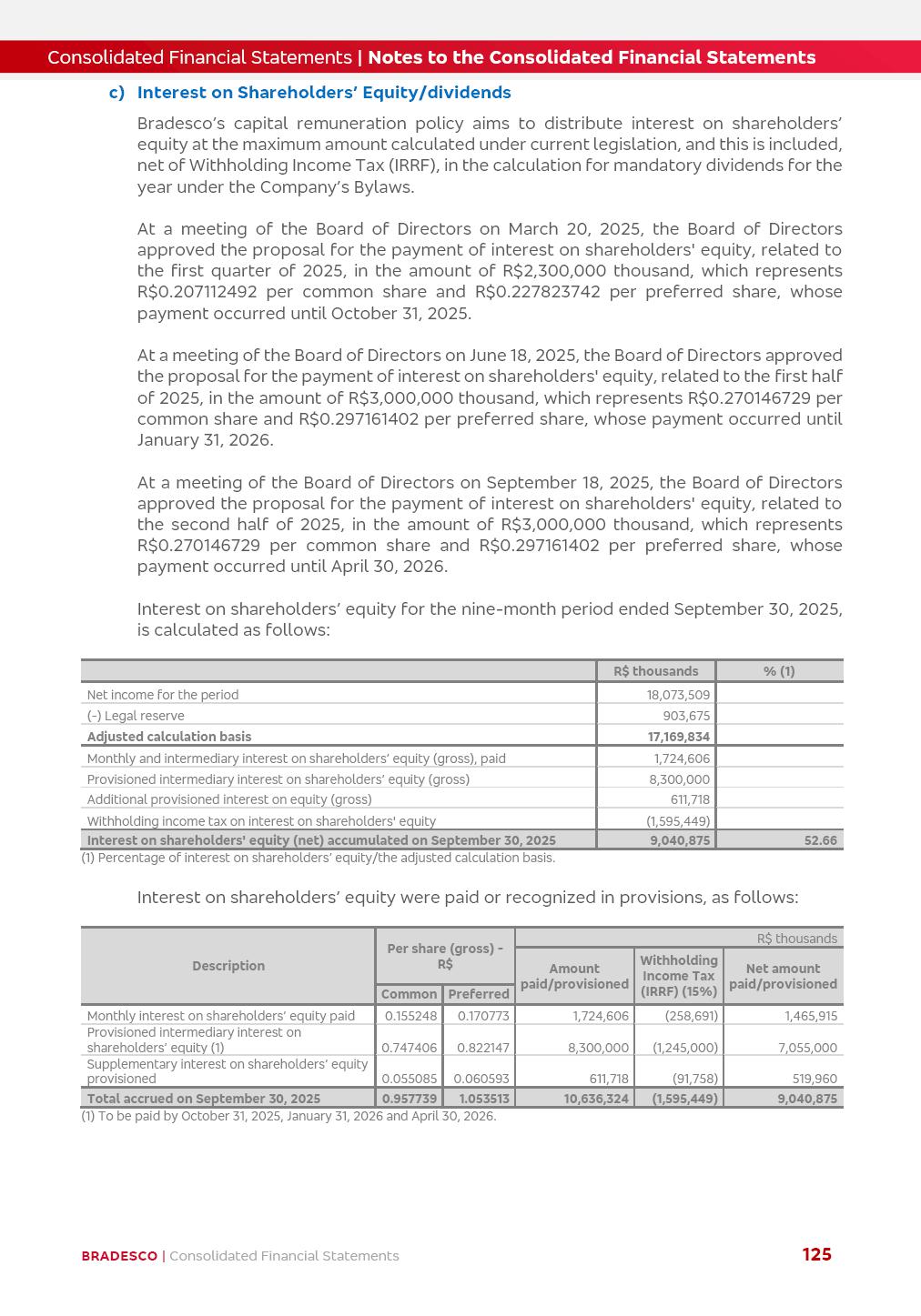 click on the items below to navigate through the document: 3Q25 managerial analysis of results management report consolidated financial statements videoconference commenting on the results October 30th at 9:30 AM (US Eastern Time) economic and financial analysis reportBradesco | Economic and Financial Analysis Report 3 Table of Contents Managerial Analysis of Results 5 press release 6 highlights 3Q25 7 recurring net income statement 8 net interest income 9 funding sources 10 loan portfolio 11 expenses with expanded loan loss provisions 16 loan indicators 17 fee and commission income 19 operating expenses 21 Bradesco Seguros 22 basel 27 guidance, indicators & economic perspectives 28 Additional Information 29 corporate strategy | customer-centric 30 NPS 31 our people 32 sustainability 33 digital in figures | BIA 34 Bradesco Principal 35 Bradesco Expresso 36 international operations | My Account 37 Bradesco Bank 38 Ágora Investimentos 39 Digio | next 40 service points, clients and market share 41 return to shareholders 42 additional information 43 selected information 45 consolidated balance sheet – Bradesco 46 consolidated balance sheet – Insurance 47 statement of income – managerial vs. recurring | BRGAAP vs. IFRS comparative 48 Independent Auditor’s Report 49 Consolidated Financial Statements 53 Bradesco | Economic and Financial Analysis Report 4 Some numbers included in this Report have been subjected to rounding adjustments. As a result, some amounts indicated as total amounts in some charts may not be the arithmetic sum of the preceding numbers. Percentage variations not presented in the framework of this report, are related, in their majority, to the low value balances compared with the other periods presented. As of January 2025, we adopted in our Financial Statements the new accounting practices established by CMN Resolutions No. 4,966 and No. 4,975. For management purposes, we kept the information of the previous periods as already disclosed, which do not present relevant differences in the historical analysis of the results. For some credit indicators, when mentioned, we carry out historical data for comparability purposes on a pro-forma basis. In our financial statements the Organization opted for the exemption provided by the Standard not to resubmit comparative information from previous periods resulting from the changes. Managerial Analysis of Results Bradesco | Economic and Financial Analysis Report 6 press release Bradesco is undergoing a transformation, fueling a continued positive performance. In the third quarter of the year, we took another step in boosting our profitability. We continue with the same commercial traction, while keeping delinquency indicators under control, prioritizing risk-adjusted returns. The transformation is advancing, supporting our evolution and enhancing our long-term competitiveness. Recurring net income was R$6.2 billion in 3Q25, an increase of 2.3% q/q and 18.8% y/y. As a result, ROAE topped 14.7% in the quarter. Total revenue reached R$35.0 billion in the quarter, increasing by 3.0% q/q and 13.1% y/y, driven by an expressive performance across all lines: net interest income, fee and commission income and income from insurance. The NII reached R$18.7 billion in the quarter, up by 3.7% q/q and 16.9% y/y. Client NII totaled R$18.6 billion, up by 4.8% q/q and 19.0% y/y, mainly driven by the increase in the loan portfolio and the average spread, which improved from 8.8% in 2Q25 to 9.0% in 3Q25, benefiting from higher efficiency in funding. Market NII was R$99 million in 3Q25, decreasing from the previous quarter, as expected. The expanded loan portfolio grew by 9.6% y/y and 1.6% q/q in Sept25, driven by the MSME and Individual segments. It is worth highlighting the increase in the share of secured credit lines, which went from 58.5% in Jun25 to 59.5% in Sept25. In terms of MSME, products such as receivables discounting and working capital loans (FGI and FGO - government-backed guarantee funds) stand out, and for Individuals, in payroll-deductible loans, rural loans, and high-income credit card lines. In September 2025, the delinquency ratio (over 90 days NPL) remained stable at 4.1%. Delinquency in MSME posted an improvement of 0.6 p.p. q/q, reflecting the quality of recent vintages, while Individuals loan indicator was impacted by the higher level of delays in John Deere Bank operations, which are collateralized and subject to a distinct recovery timeline. The cost of credit increased slightly, from 3.2% in 2Q25 to 3.3% in 3Q25, reflecting an increase of provisions for specific wholesale cases and John Deere Bank. We highlight the decrease of R$1.8 billion in the restructured portfolio against the previous quarter and of R$8.2 billion in the annual comparison. The quality of our credit portfolio showed improvement, being that stage 1 loan participation rose 30 bps while stage 3 fell 20 bps, resulting from better originations and the sequential cleanup of problematic assets. Fee and commission income increased by 2.8% q/q and 6.9% y/y. The positive standouts over the quarter included fees from consortia, cards, loan operations and asset management. Once again, the operational performance of insurance activities was significant, with income from insurance operations reaching of R$5.7 billion (1.0% q/q and 13.0% y/y) and net income of R$2.5 billion (10.3% q/q and 6.5% y/y). The ROAE of the insurance company was 22.4% in 3Q25. Operating expenses increased by 3.7% q/q and 9.6% y/y, in line with expectations. This growth rate largely reflects the investments being made in the bank and its affiliates. Analyzing only personnel and administrative expenses, there was a 5.5% y/y growth in 3Q25, which shrinks to 2.5% when we exclude the profit-sharing expenses, below inflation of 5.2% for the period, underlining the strong cost-control measures currently in place within the Organization. With that, we maintained our efficiency ratio stable at abou