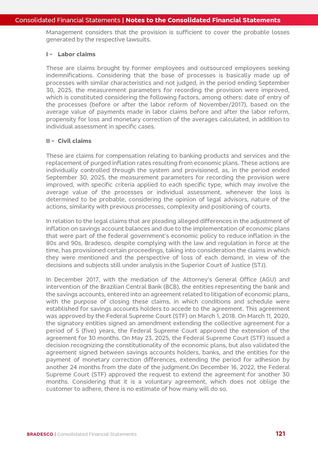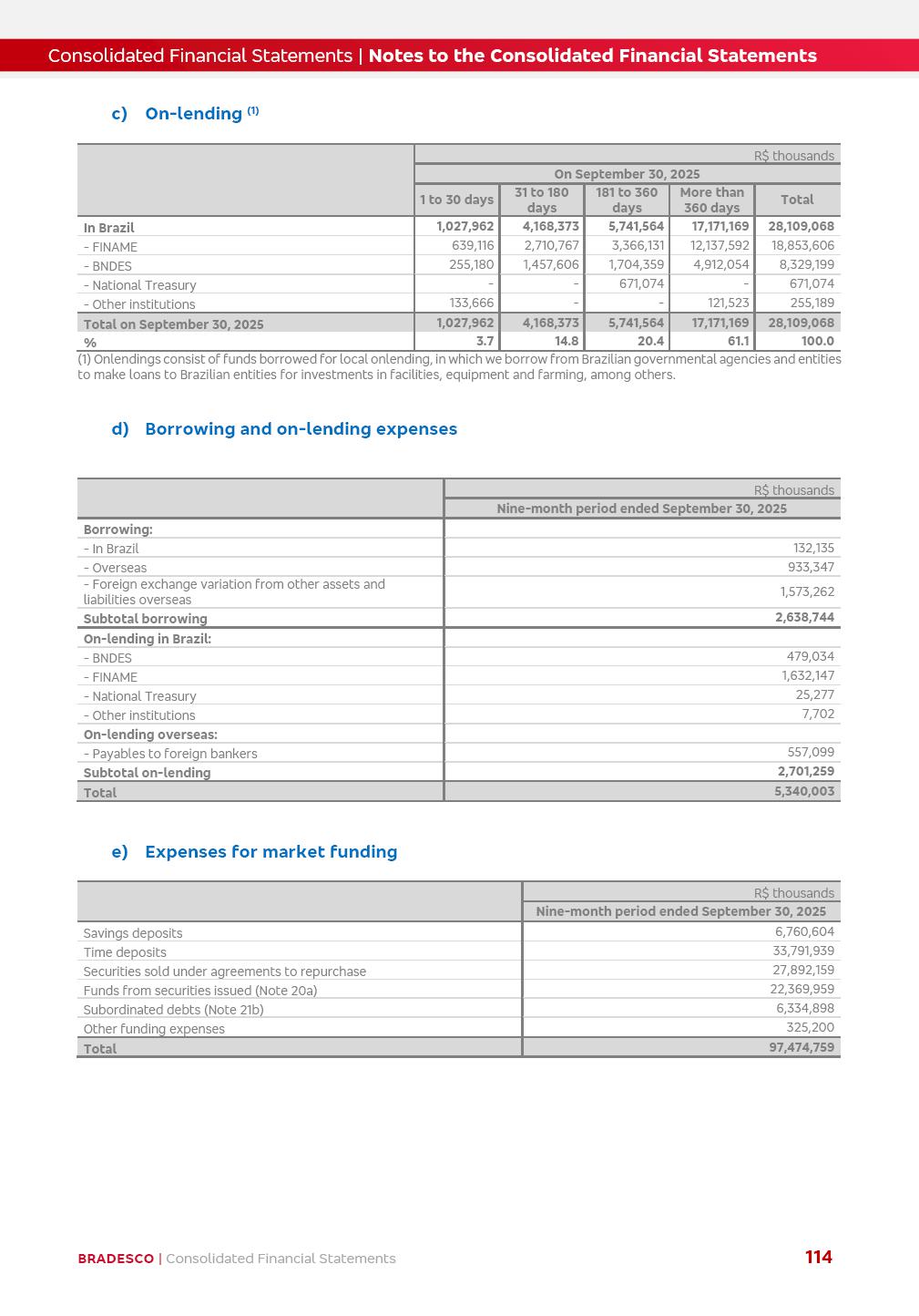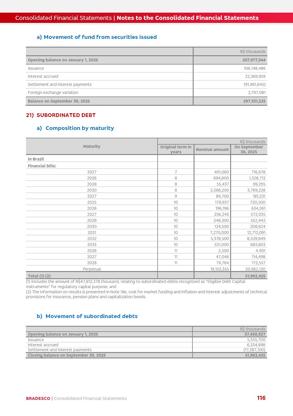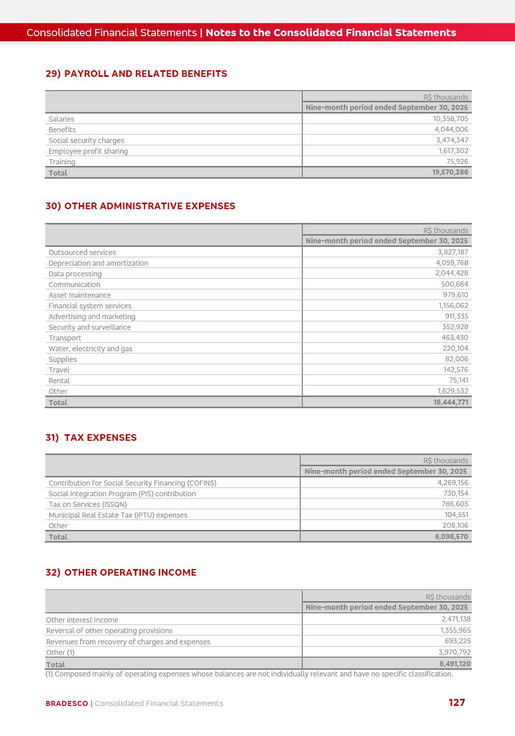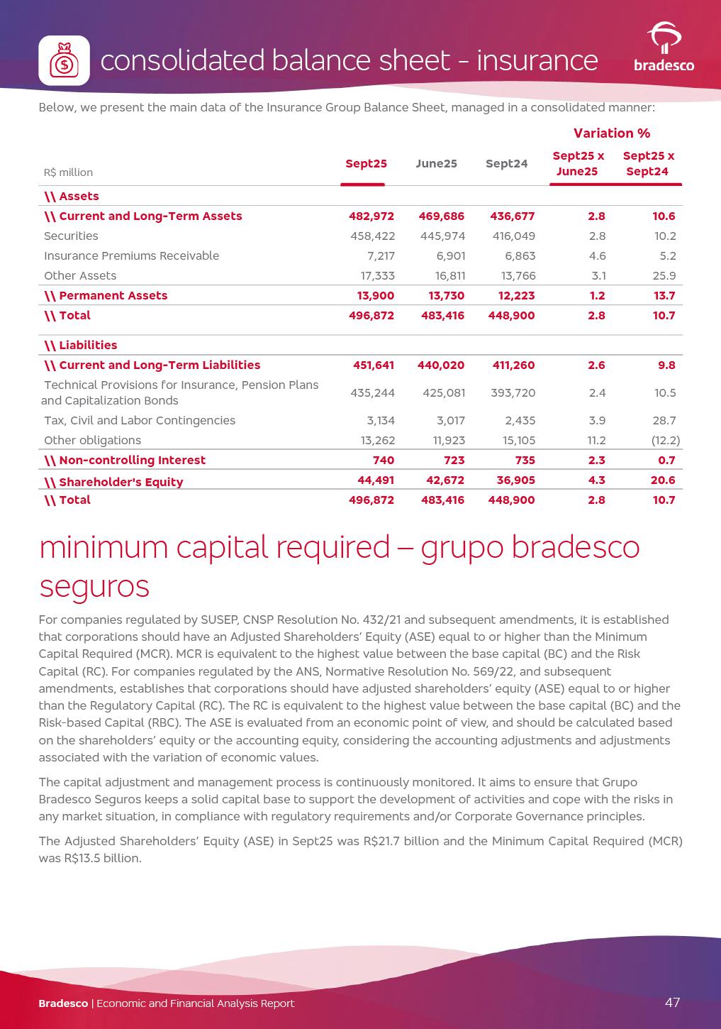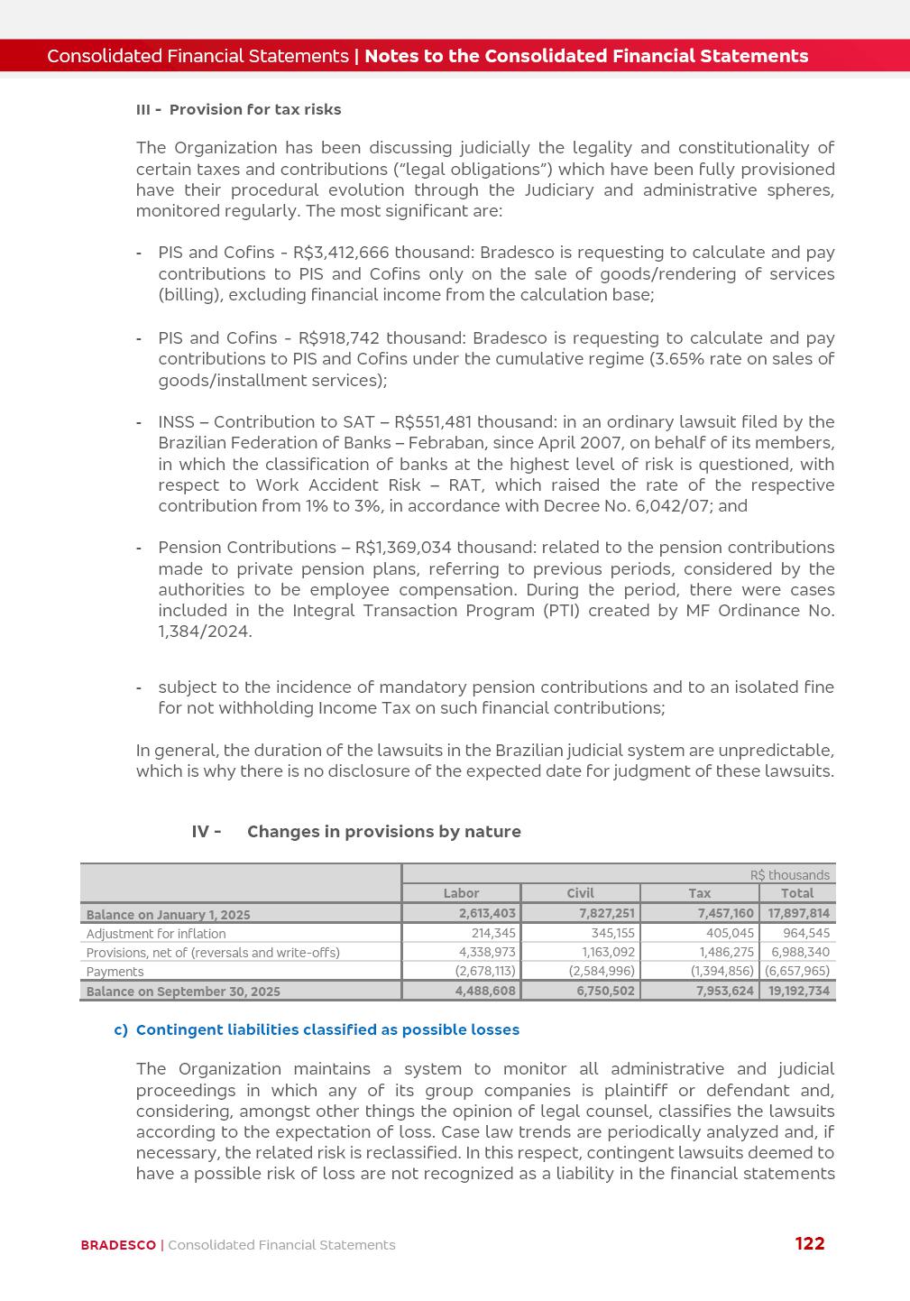 click on the items below to navigate through the document: 3Q25 managerial analysis of results management report consolidated financial statements videoconference commenting on the results October 30th at 9:30 AM (US Eastern Time) economic and financial analysis reportBradesco | Economic and Financial Analysis Report 3 Table of Contents Managerial Analysis of Results 5 press release 6 highlights 3Q25 7 recurring net income statement 8 net interest income 9 funding sources 10 loan portfolio 11 expenses with expanded loan loss provisions 16 loan indicators 17 fee and commission income 19 operating expenses 21 Bradesco Seguros 22 basel 27 guidance, indicators & economic perspectives 28 Additional Information 29 corporate strategy | customer-centric 30 NPS 31 our people 32 sustainability 33 digital in figures | BIA 34 Bradesco Principal 35 Bradesco Expresso 36 international operations | My Account 37 Bradesco Bank 38 Ágora Investimentos 39 Digio | next 40 service points, clients and market share 41 return to shareholders 42 additional information 43 selected information 45 consolidated balance sheet – Bradesco 46 consolidated balance sheet – Insurance 47 statement of income – managerial vs. recurring | BRGAAP vs. IFRS comparative 48 Independent Auditor’s Report 49 Consolidated Financial Statements 53 Bradesco | Economic and Financial Analysis Report 4 Some numbers included in this Report have been subjected to rounding adjustments. As a result, some amounts indicated as total amounts in some charts may not be the arithmetic sum of the preceding numbers. Percentage variations not presented in the framework of this report, are related, in their majority, to the low value balances compared with the other periods presented. As of January 2025, we adopted in our Financial Statements the new accounting practices established by CMN Resolutions No. 4,966 and No. 4,975. For management purposes, we kept the information of the previous periods as already disclosed, which do not present relevant differences in the historical analysis of the results. For some credit indicators, when mentioned, we carry out historical data for comparability purposes on a pro-forma basis. In our financial statements the Organization opted for the exemption provided by the Standard not to resubmit comparative information from previous periods resulting from the changes. Managerial Analysis of Results Bradesco | Economic and Financial Analysis Report 6 press release Bradesco is undergoing a transformation, fueling a continued positive performance. In the third quarter of the year, we took another step in boosting our profitability. We continue with the same commercial traction, while keeping delinquency indicators under control, prioritizing risk-adjusted returns. The transformation is advancing, supporting our evolution and enhancing our long-term competitiveness. Recurring net income was R$6.2 billion in 3Q25, an increase of 2.3% q/q and 18.8% y/y. As a result, ROAE topped 14.7% in the quarter. Total revenue reached R$35.0 billion in the quarter, increasing by 3.0% q/q and 13.1% y/y, driven by an expressive performance across all lines: net interest income, fee and commission income and income from insurance. The NII reached R$18.7 billion in the quarter, up by 3.7% q/q and 16.9% y/y. Client NII totaled R$18.6 billion, up by 4.8% q/q and 19.0% y/y, mainly driven by the increase in the loan portfolio and the average spread, which improved from 8.8% in 2Q25 to 9.0% in 3Q25, benefiting from higher efficiency in funding. Market NII was R$99 million in 3Q25, decreasing from the previous quarter, as expected. The expanded loan portfolio grew by 9.6% y/y and 1.6% q/q in Sept25, driven by the MSME and Individual segments. It is worth highlighting the increase in the share of secured credit lines, which went from 58.5% in Jun25 to 59.5% in Sept25. In terms of MSME, products such as receivables discounting and working capital loans (FGI and FGO - government-backed guarantee funds) stand out, and for Individuals, in payroll-deductible loans, rural loans, and high-income credit card lines. In September 2025, the delinquency ratio (over 90 days NPL) remained stable at 4.1%. Delinquency in MSME posted an improvement of 0.6 p.p. q/q, reflecting the quality of recent vintages, while Individuals loan indicator was impacted by the higher level of delays in John Deere Bank operations, which are collateralized and subject to a distinct recovery timeline. The cost of credit increased slightly, from 3.2% in 2Q25 to 3.3% in 3Q25, reflecting an increase of provisions for specific wholesale cases and John Deere Bank. We highlight the decrease of R$1.8 billion in the restructured portfolio against the previous quarter and of R$8.2 billion in the annual comparison. The quality of our credit portfolio showed improvement, being that stage 1 loan participation rose 30 bps while stage 3 fell 20 bps, resulting from better originations and the sequential cleanup of problematic assets. Fee and commission income increased by 2.8% q/q and 6.9% y/y. The positive standouts over the quarter included fees from consortia, cards, loan operations and asset management. Once again, the operational performance of insurance activities was significant, with income from insurance operations reaching of R$5.7 billion (1.0% q/q and 13.0% y/y) and net income of R$2.5 billion (10.3% q/q and 6.5% y/y). The ROAE of the insurance company was 22.4% in 3Q25. Operating expenses increased by 3.7% q/q and 9.6% y/y, in line with expectations. This growth rate largely reflects the investments being made in the bank and its affiliates. Analyzing only personnel and administrative expenses, there was a 5.5% y/y growth in 3Q25, which shrinks to 2.5% when we exclude the profit-sharing expenses, below inflation of 5.2% for the period, underlining the strong cost-control measures currently in place within the Organization. With that, we maintained our efficiency ratio stable at abou