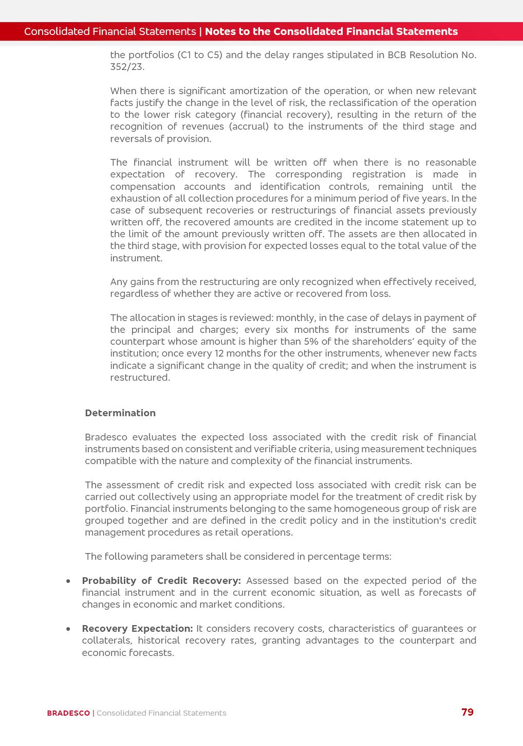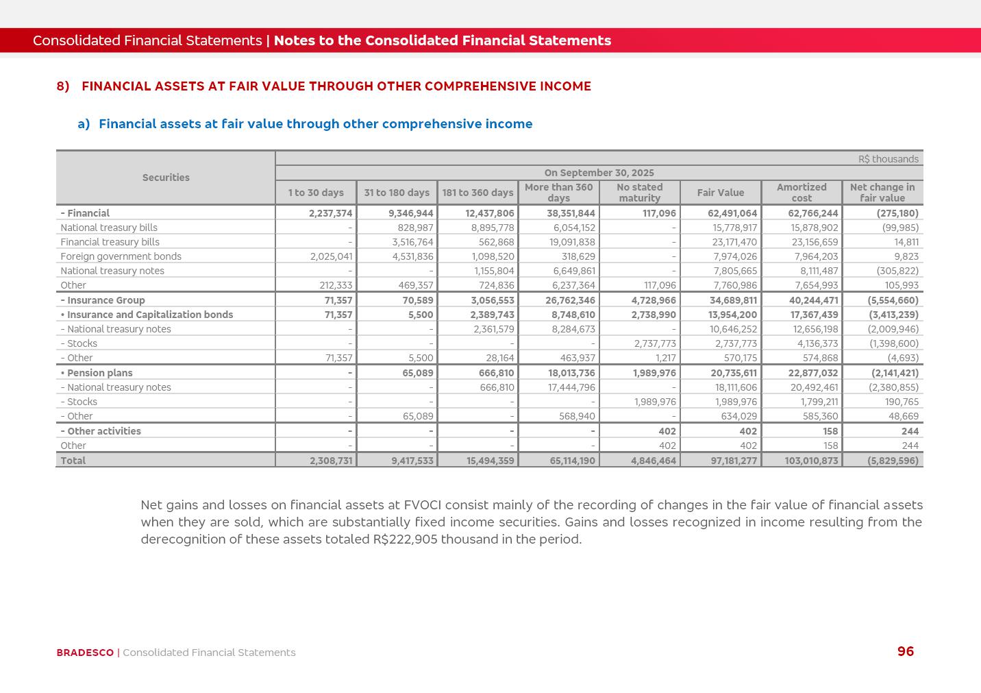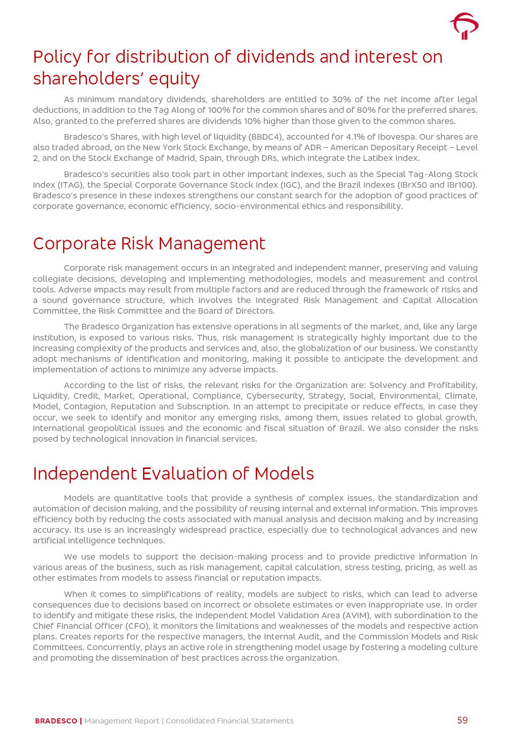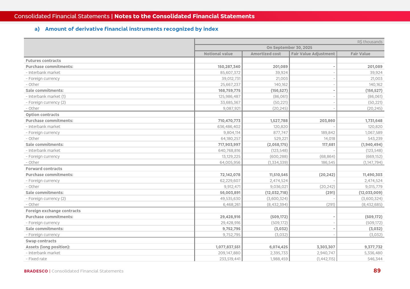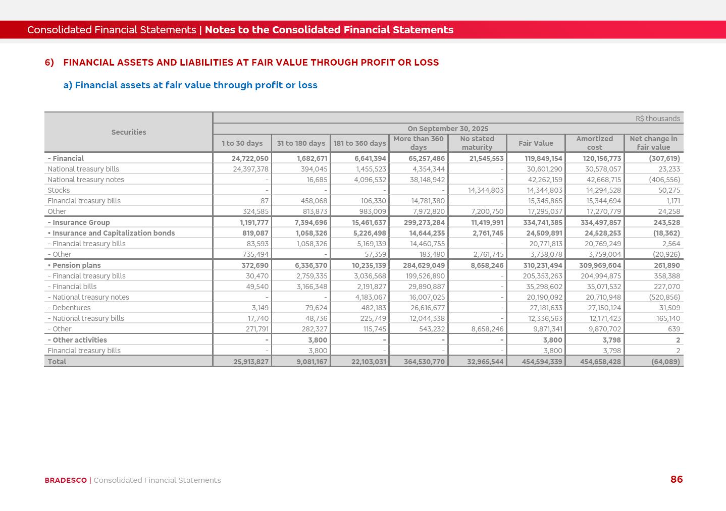click on the items below to navigate through the document: 3Q25 managerial analysis of results management report consolidated financial statements videoconference commenting on the results October 30th at 9:30 AM (US Eastern Time) economic and financial analysis reportBradesco | Economic and Financial Analysis Report 3 Table of Contents Managerial Analysis of Results 5 press release 6 highlights 3Q25 7 recurring net income statement 8 net interest income 9 funding sources 10 loan portfolio 11 expenses with expanded loan loss provisions 16 loan indicators 17 fee and commission income 19 operating expenses 21 Bradesco Seguros 22 basel 27 guidance, indicators & economic perspectives 28 Additional Information 29 corporate strategy | customer-centric 30 NPS 31 our people 32 sustainability 33 digital in figures | BIA 34 Bradesco Principal 35 Bradesco Expresso 36 international operations | My Account 37 Bradesco Bank 38 Ágora Investimentos 39 Digio | next 40 service points, clients and market share 41 return to shareholders 42 additional information 43 selected information 45 consolidated balance sheet – Bradesco 46 consolidated balance sheet – Insurance 47 statement of income – managerial vs. recurring | BRGAAP vs. IFRS comparative 48 Independent Auditor’s Report 49 Consolidated Financial Statements 53 Bradesco | Economic and Financial Analysis Report 4 Some numbers included in this Report have been subjected to rounding adjustments. As a result, some amounts indicated as total amounts in some charts may not be the arithmetic sum of the preceding numbers. Percentage variations not presented in the framework of this report, are related, in their majority, to the low value balances compared with the other periods presented. As of January 2025, we adopted in our Financial Statements the new accounting practices established by CMN Resolutions No. 4,966 and No. 4,975. For management purposes, we kept the information of the previous periods as already disclosed, which do not present relevant differences in the historical analysis of the results. For some credit indicators, when mentioned, we carry out historical data for comparability purposes on a pro-forma basis. In our financial statements the Organization opted for the exemption provided by the Standard not to resubmit comparative information from previous periods resulting from the changes. Managerial Analysis of Results Bradesco | Economic and Financial Analysis Report 6 press release Bradesco is undergoing a transformation, fueling a continued positive performance. In the third quarter of the year, we took another step in boosting our profitability. We continue with the same commercial traction, while keeping delinquency indicators under control, prioritizing risk-adjusted returns. The transformation is advancing, supporting our evolution and enhancing our long-term competitiveness. Recurring net income was R$6.2 billion in 3Q25, an increase of 2.3% q/q and 18.8% y/y. As a result, ROAE topped 14.7% in the quarter. Total revenue reached R$35.0 billion in the quarter, increasing by 3.0% q/q and 13.1% y/y, driven by an expressive performance across all lines: net interest income, fee and commission income and income from insurance. The NII reached R$18.7 billion in the quarter, up by 3.7% q/q and 16.9% y/y. Client NII totaled R$18.6 billion, up by 4.8% q/q and 19.0% y/y, mainly driven by the increase in the loan portfolio and the average spread, which improved from 8.8% in 2Q25 to 9.0% in 3Q25, benefiting from higher efficiency in funding. Market NII was R$99 million in 3Q25, decreasing from the previous quarter, as expected. The expanded loan portfolio grew by 9.6% y/y and 1.6% q/q in Sept25, driven by the MSME and Individual segments. It is worth highlighting the increase in the share of secured credit lines, which went from 58.5% in Jun25 to 59.5% in Sept25. In terms of MSME, products such as receivables discounting and working capital loans (FGI and FGO - government-backed guarantee funds) stand out, and for Individuals, in payroll-deductible loans, rural loans, and high-income credit card lines. In September 2025, the delinquency ratio (over 90 days NPL) remained stable at 4.1%. Delinquency in MSME posted an improvement of 0.6 p.p. q/q, reflecting the quality of recent vintages, while Individuals loan indicator was impacted by the higher level of delays in John Deere Bank operations, which are collateralized and subject to a distinct recovery timeline. The cost of credit increased slightly, from 3.2% in 2Q25 to 3.3% in 3Q25, reflecting an increase of provisions for specific wholesale cases and John Deere Bank. We highlight the decrease of R$1.8 billion in the restructured portfolio against the previous quarter and of R$8.2 billion in the annual comparison. The quality of our credit portfolio showed improvement, being that stage 1 loan participation rose 30 bps while stage 3 fell 20 bps, resulting from better originations and the sequential cleanup of problematic assets. Fee and commission income increased by 2.8% q/q and 6.9% y/y. The positive standouts over the quarter included fees from consortia, cards, loan operations and asset management. Once again, the operational performance of insurance activities was significant, with income from insurance operations reaching of R$5.7 billion (1.0% q/q and 13.0% y/y) and net income of R$2.5 billion (10.3% q/q and 6.5% y/y). The ROAE of the insurance company was 22.4% in 3Q25. Operating expenses increased by 3.7% q/q and 9.6% y/y, in line with expectations. This growth rate largely reflects the investments being made in the bank and its affiliates. Analyzing only personnel and administrative expenses, there was a 5.5% y/y growth in 3Q25, which shrinks to 2.5% when we exclude the profit-sharing expenses, below inflation of 5.2% for the period, underlining the strong cost-control measures currently in place within the Organization. With that, we maintained our efficiency ratio stable at abou