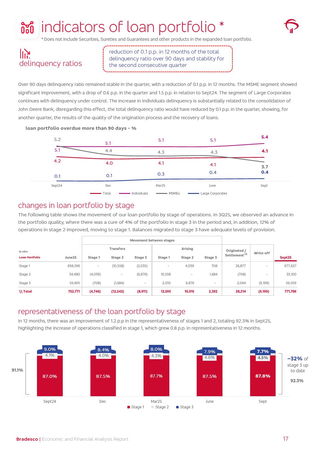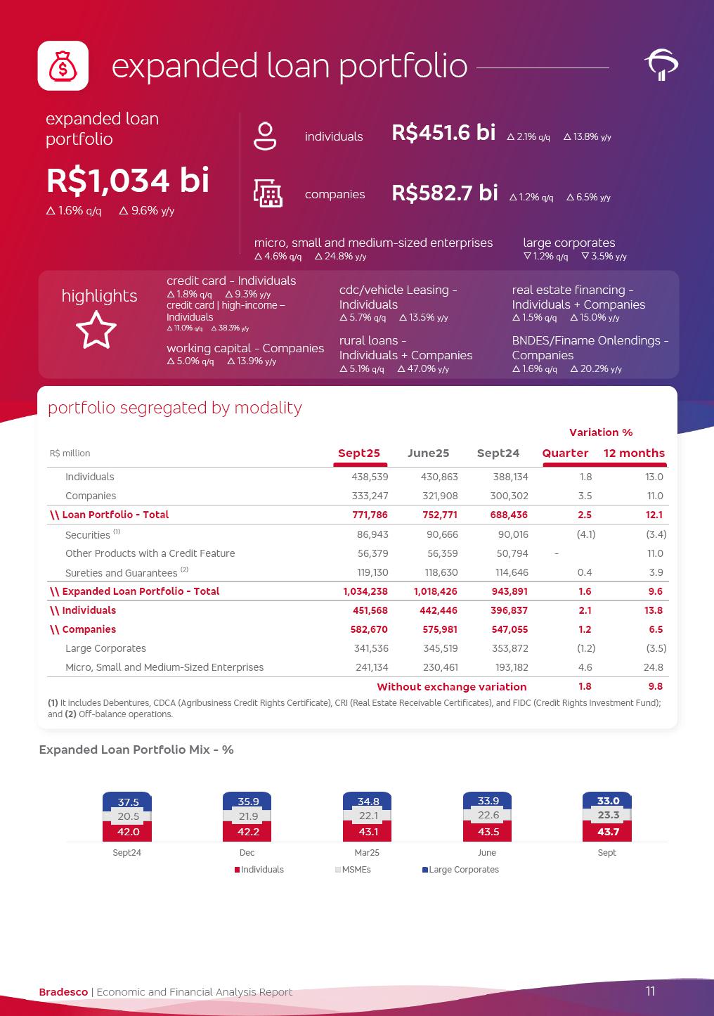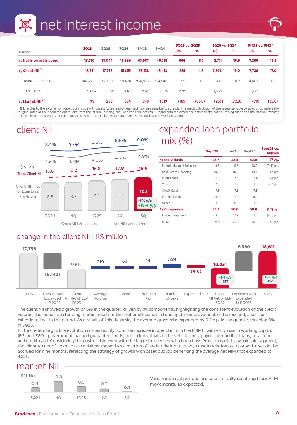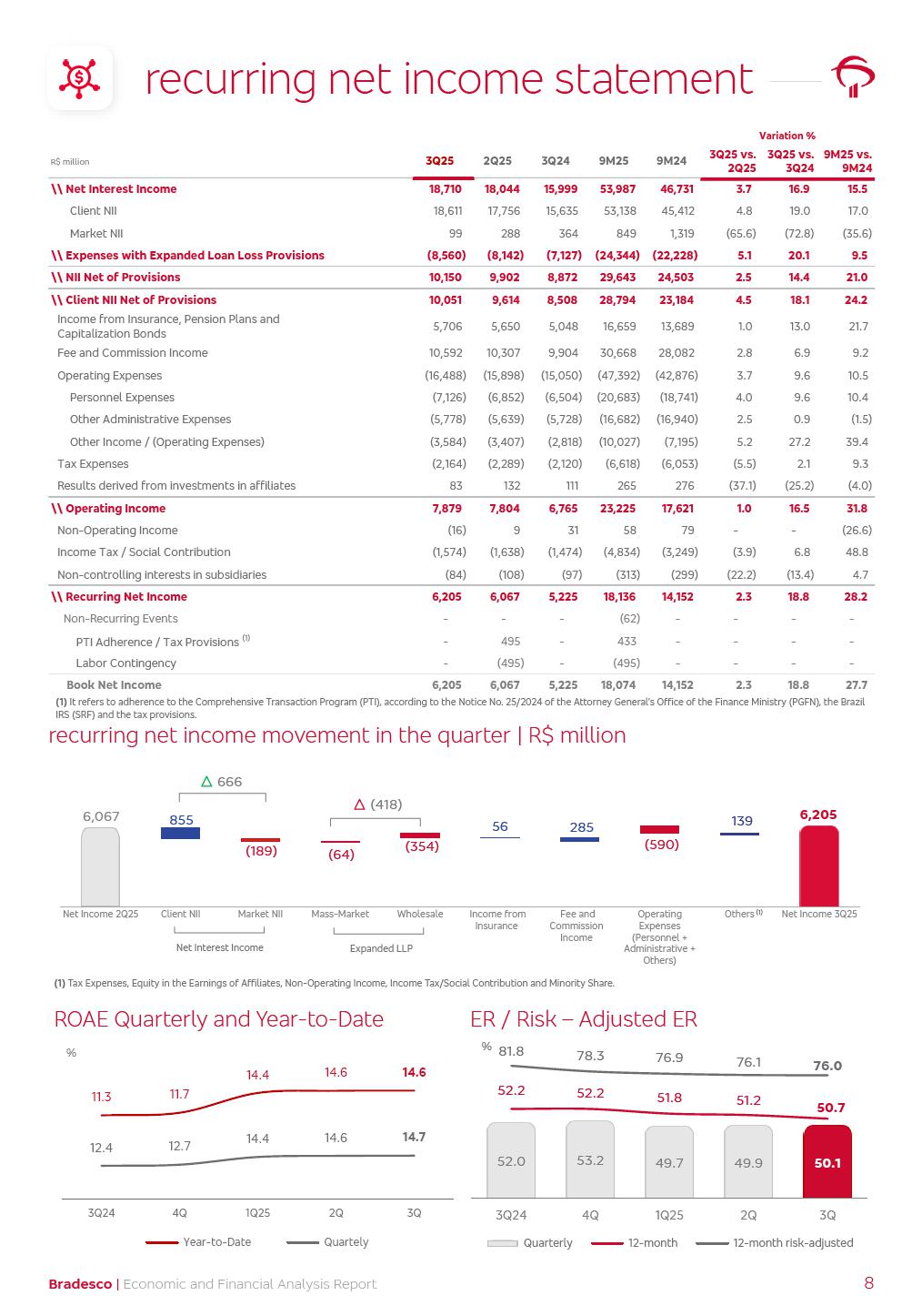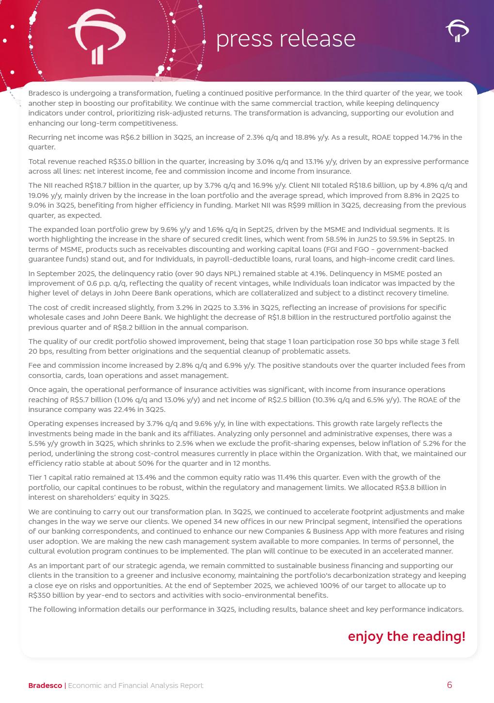 Managerial Analysis of Results Bradesco | Economic and Financial Analysis Report 6 press release Bradesco is undergoing a transformation, fueling a continued positive performance. In the third quarter of the year, we took another step in boosting our profitability. We continue with the same commercial traction, while keeping delinquency indicators under control, prioritizing risk-adjusted returns. The transformation is advancing, supporting our evolution and enhancing our long-term competitiveness. Recurring net income was R$6.2 billion in 3Q25, an increase of 2.3% q/q and 18.8% y/y. As a result, ROAE topped 14.7% in the quarter. Total revenue reached R$35.0 billion in the quarter, increasing by 3.0% q/q and 13.1% y/y, driven by an expressive performance across all lines: net interest income, fee and commission income and income from insurance. The NII reached R$18.7 billion in the quarter, up by 3.7% q/q and 16.9% y/y. Client NII totaled R$18.6 billion, up by 4.8% q/q and 19.0% y/y, mainly driven by the increase in the loan portfolio and the average spread, which improved from 8.8% in 2Q25 to 9.0% in 3Q25, benefiting from higher efficiency in funding. Market NII was R$99 million in 3Q25, decreasing from the previous quarter, as expected. The expanded loan portfolio grew by 9.6% y/y and 1.6% q/q in Sept25, driven by the MSME and Individual segments. It is worth highlighting the increase in the share of secured credit lines, which went from 58.5% in Jun25 to 59.5% in Sept25. In terms of MSME, products such as receivables discounting and working capital loans (FGI and FGO - government-backed guarantee funds) stand out, and for Individuals, in payroll-deductible loans, rural loans, and high-income credit card lines. In September 2025, the delinquency ratio (over 90 days NPL) remained stable at 4.1%. Delinquency in MSME posted an improvement of 0.6 p.p. q/q, reflecting the quality of recent vintages, while Individuals loan indicator was impacted by the higher level of delays in John Deere Bank operations, which are collateralized and subject to a distinct recovery timeline. The cost of credit increased slightly, from 3.2% in 2Q25 to 3.3% in 3Q25, reflecting an increase of provisions for specific wholesale cases and John Deere Bank. We highlight the decrease of R$1.8 billion in the restructured portfolio against the previous quarter and of R$8.2 billion in the annual comparison. The quality of our credit portfolio showed improvement, being that stage 1 loan participation rose 30 bps while stage 3 fell 20 bps, resulting from better originations and the sequential cleanup of problematic assets. Fee and commission income increased by 2.8% q/q and 6.9% y/y. The positive standouts over the quarter included fees from consortia, cards, loan operations and asset management. Once again, the operational performance of insurance activities was significant, with income from insurance operations reaching of R$5.7 billion (1.0% q/q and 13.0% y/y) and net income of R$2.5 billion (10.3% q/q and 6.5% y/y). The ROAE of the insurance company was 22.4% in 3Q25. Operating expenses increased by 3.7% q/q and 9.6% y/y, in line with expectations. This growth rate largely reflects the investments being made in the bank and its affiliates. Analyzing only personnel and administrative expenses, there was a 5.5% y/y growth in 3Q25, which shrinks to 2.5% when we exclude the profit-sharing expenses, below inflation of 5.2% for the period, underlining the strong cost-control measures currently in place within the Organization. With that, we maintained our efficiency ratio stable at about 50% for the quarter and in 12 months. Tier 1 capital ratio remained at 13.4% and the common equity ratio was 11.4% this quarter. Even with the growth of the portfolio, our capital continues to be robust, within the regulatory and management limits. We allocated R$3.8 billion in interest on shareholders’ equity in 3Q25. We are continuing to carry out our transformation plan. In 3Q25, we continued to accelerate footprint adjustments and make changes in the way we serve our clients. We opened 34 new offices in our new Principal segment, intensified the operations of our banking correspondents, and continued to enhance our new Companies & Business App with more features and rising user adoption. We are making the new cash management system available to more companies. In terms of personnel, the cultural evolution program continues to be implemented. The plan will continue to be executed in an accelerated manner. As an important part of our strategic agenda, we remain committed to sustainable business financing and supporting our clients in the transition to a greener and inclusive economy, maintaining the portfolio's decarbonization strategy and keeping a close eye on risks and opportunities. At the end of September 2025, we achieved 100% of our target to allocate up to R$350 billion by year-end to sectors and activities with socio-environmental benefits. The following information details our performance in 3Q25, including results, balance sheet and key performance indicators. enjoy the reading! Bradesco | Economic and Financial Analysis Report 7 highlights 3Q25 consolidated recurring net income R$6.2 bi △ 2.3% q/q △ 18.8% y/y ROAE 3Q25 14.7% △ 0.1 p.p. q/q △ 2.3 p.p. y/y main data selected expanded loan portfolio total revenue R$35.0 bi (1) △ 3.0% q/q △ 13.1% y/y total net interest income △ 3.7% q/q △ 16.9% y/y R$1,034 bi △ 1.6% q/q △ 9.6% y/y fee and commission income △ 2.8% q/q △ 6.9% y/y individuals R$451.6 bi △ 2.1% q/q △ 13.8% y/y insurance, pension plans and capitalization bonds △ 1.0% q/q △ 13.0% y/y companies R$582.7 bi △ 1.2% q/q △ 6.5% y/y cost of risk R$8.6 bi △ 5.1% q/q △ 20.1% y/y MSME △ 4.6% q/q △ 24.8% y/y Large Corporates ▽ 1.2% q/q ▽ 3.5% y/y loan indicators over 90 days ratio 4.1% stable q/q ▽ 0.1 p.p. y/y personnel + administrative expenses (2) R$12.9 bi △ 3.3% q/q △ 5.5